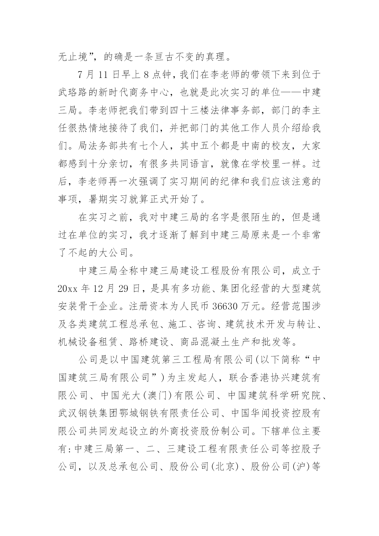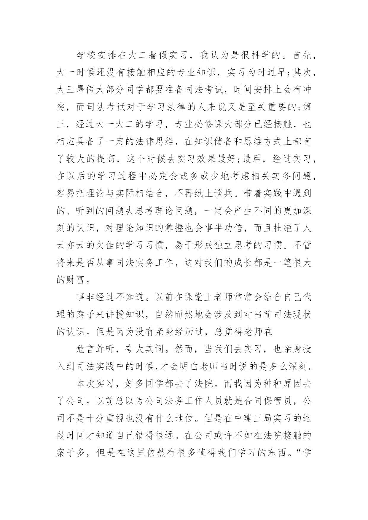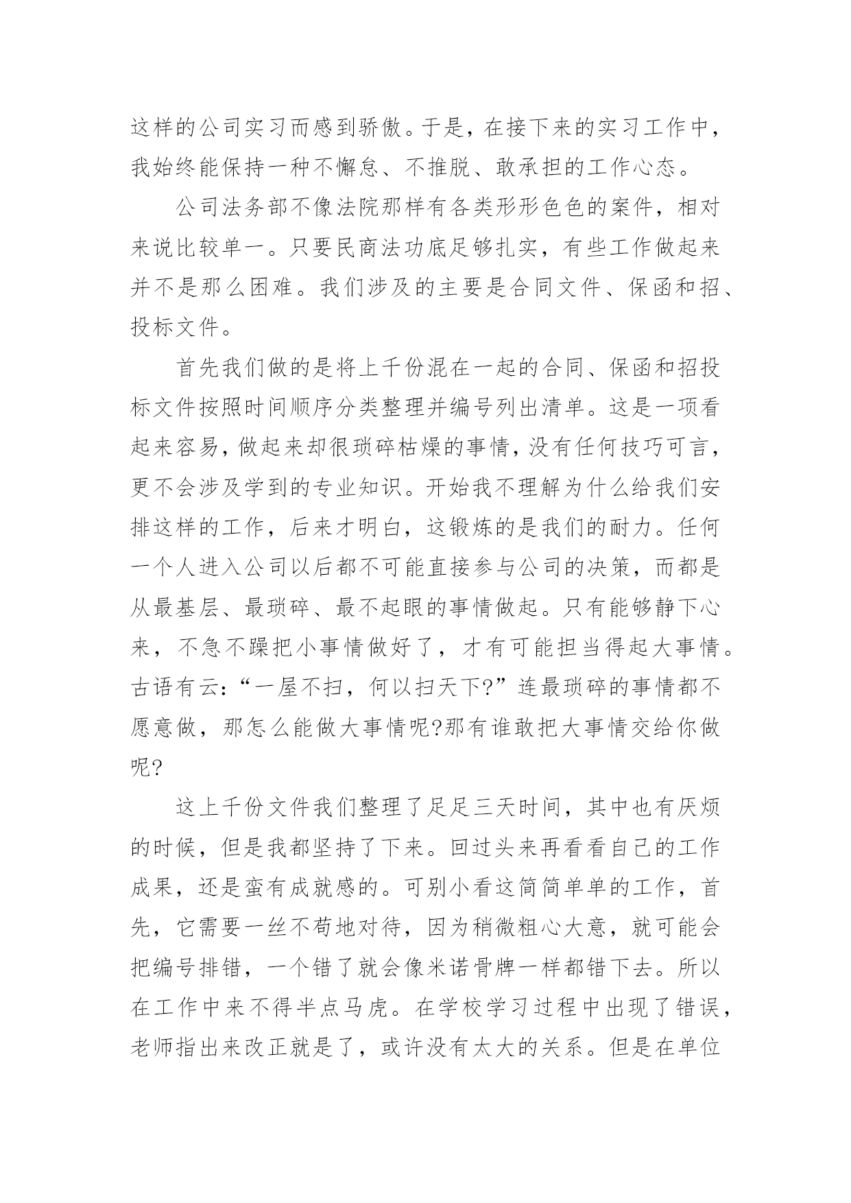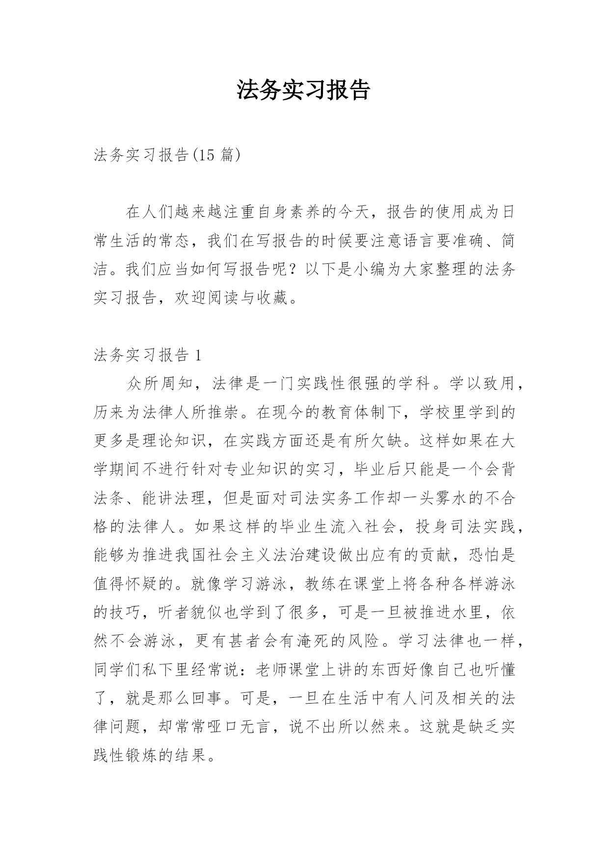 法务实习报告法务实习报告(15篇)在人们越来越注重自身素养的今天,报告的使用成为日常生活的常态,我们在写报告的时候要注意语言要准确、简洁。我们应当如何写报告呢?以下是小编为大家整理的法务实习报告,欢迎阅读与收藏。法务实习报告1众所周知,法律是一门实践性很强的学科。学以致用,历来为法律人所推崇。在现今的教育体制下,学校里学到的更多是理论知识,在实践方面还是有所欠缺。这样如果在大学期间不进行针对专业知识的实习,毕业后只能是一个会背法条、能讲法理,但是面对司法实务工作却一头雾水的不合格的法律人。如果这样的毕业生流入社会,投身司法实践,能够为推进我国社会主义法治建设做出应有的贡献,恐怕是值得怀疑的。就像学习游泳,教练在课堂上将各种各样游泳的技巧,听者貌似也学到了很多,可是一旦被推进水里,依然不会游泳,更有甚者会有淹死的风险。学习法律也一样,同学们私下里经常说:老师课堂上讲的东西好像自己也听懂了,就是那么回事。可是,一旦在生活中有人问及相关的法律问题,却常常哑口无言,说不出所以然来。这就是缺乏实践性锻炼的结果。学校安排在大二暑假实习,我认为是很科学的。首先,大一时候还没有接触相应的专业知识,实习为时过早;其次,大三暑假大部分同学都要准备司法考试,时间安排上会有冲突,而司法考试对于学习法律的人来说又是至关重要的;第三,经过大一大二的学习,专业必修课大部分已经接触,也相应具备了一定的法律思维,在知识储备和思维方式上都有了较大的提高,这个时候去实习效果最好;最后,经过实习,在以后的学习过程中必定会或多或少地考虑相关实务问题,容易把理论与实际相结合,不再纸上谈兵。带着实践中遇到的、听到的问题去思考理论问题,一定会产生不同的更加深刻的认识,对理论知识的掌握也会事半功倍,而且杜绝了人云亦云的欠佳的学习习惯,易于形成独立思考的习惯。不管将来是否从事司法实务工作,这对我们的成长都是一笔很大的财富。事非经过不知道。以前在课堂上老师常常会结合自己代理的案子来讲授知识,自然而然地会涉及到对当前司法现状的认识。但是因为没有亲身经历过,总觉得老师在危言耸听,夸大其词。然而,当我们去实习,也亲身投入到司法实践中的时候,才会明白老师当时说的是多么深刻。本次实习,好多同学都去了法院。而我因为种种原因去了公司。以前总以为公司法务工作人员就是合同保管员,公司不是十分重视也没有什么地位。但是在中建三局实习的这段时间才知道自己错得很远。在公司或许不如在法院接触的案子多,但是在这里依然有很多值得我们学习的东西。“学无止境”,的确是一条亘古不变的真理。7月11日早上8点钟,我们在李老师的带领下来到位于武珞路的新时代商务中心,也就是此次实习的单位——中建三局。李老师把我们带到四十三楼法律事务部,部门的李主任很热情地接待了我们,并把部门的其他工作人员介绍给我们。局法务部共有七个人,其中五个都是中南的校友,大家都感到十分亲切,有很多共同语言,就像在学校里一样。过后,李老师再一次强调了实习期间的纪律和我们应该注意的事项,暑期实习就算正式开始了。在实习之前,我对中建三局的名字是很陌生的,但是通过在单位的实习,我才逐渐了解到中建三局原来是一个非常了不起的大公司。中建三局全称中建三局建设工程股份有限公司,成立于20xx年12月29日,是具有多功能、集团化经营的大型建筑安装骨干企业。注册资本为人民币36630万元。经营范围涉及各类建筑工程总承包、施工、咨询、建筑技术开发与转让、机械设备租赁、路桥建设、商品混凝土生产和批发等。公司是以中国建筑第三工程局有限公司(以下简称“中国建筑三局有限公司”)为主发起人,联合香港协兴建筑有限公司、中国光大(澳门)有限公司、中国建筑科学研究院、武汉钢铁集团鄂城钢铁有限责任公司、中国华闻投资控股有限公司共同发起设立的外商投资股份制公司。下辖单位主要有:中建三局第一、二、三建设工程有限责任公司等控股子公司,以及总承包公司、股份公司(北京)、股份公司(沪)等非法人实体。公司全面继承了中国建筑三局有限公司成立以来取得的工程业绩:截至目前,共有湖北省电力调度楼、厦门嵩屿电厂、三峡工程开发总公司总部综合大楼、上海国际网球中心、天津泰达司法服务中心、河南省职工之家、武汉协和医院外科病房大楼等63项工程荣获中国建筑工程质量最高荣誉——鲁班奖(国家优质工程奖);深圳金福大厦、河南报业大厦、中铁十一局办公科研综合楼、清华大学美术学院教学楼、广西玉林体育馆等541项工程被评为省部级以上优质工程和样板工程;武汉世界贸易大厦、深圳鸿昌广场、南宁市建设大厦技术业务综合楼及地王国际商会中心等5项工程获得“全国建筑业新技术应用金牌示范工程”荣誉称号;辽宁广播电视发射塔主体工程成套施工技术、武汉国贸大厦综合施工技术、复杂空间钢结构施工技术的研究与应用等369项科技成果获得各级科学技术进步奖,其