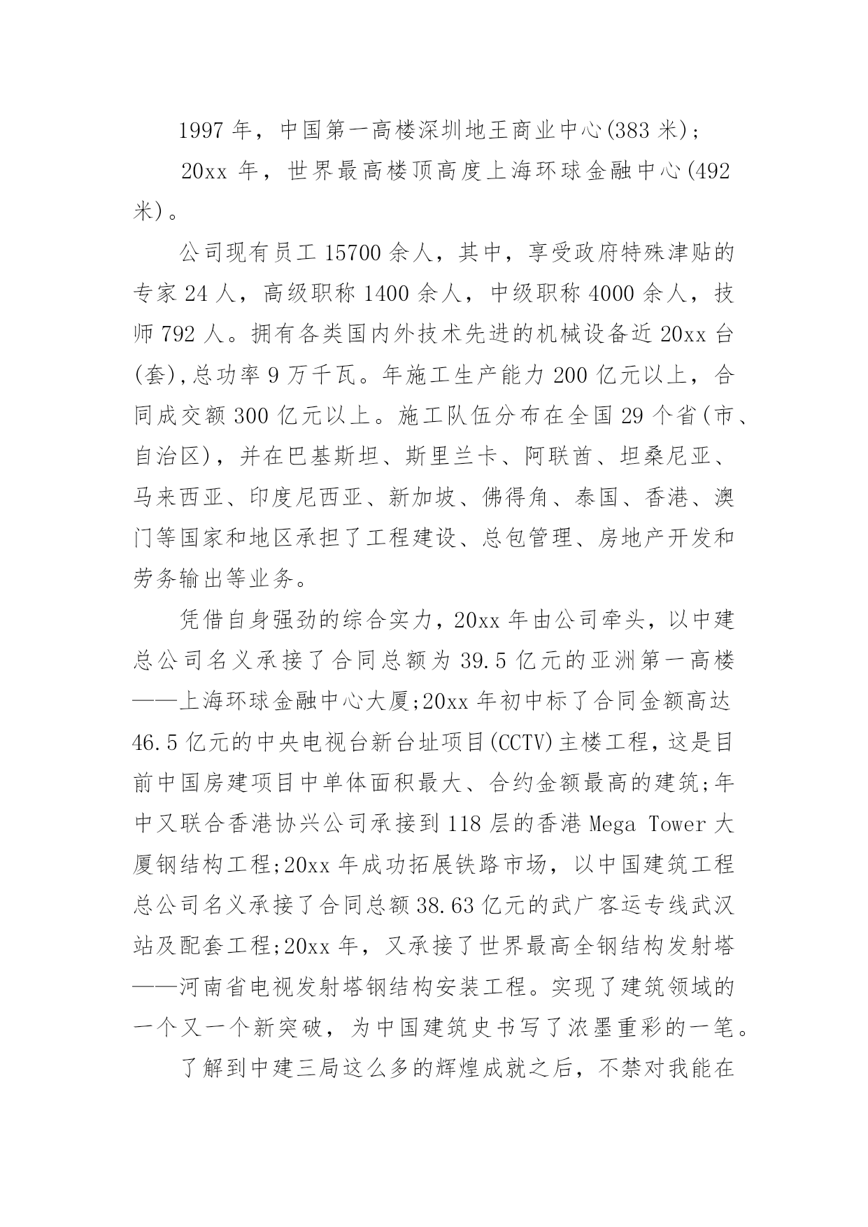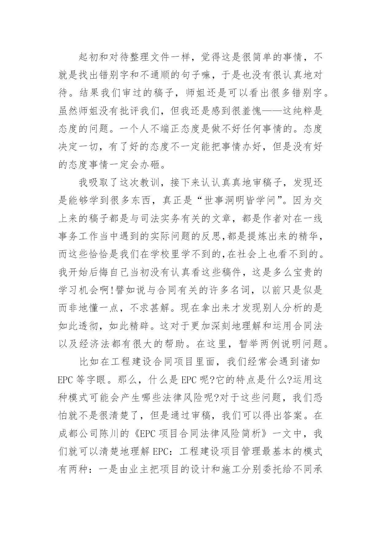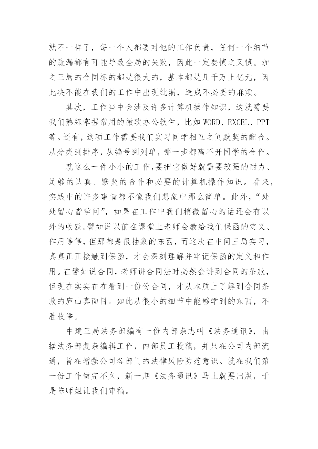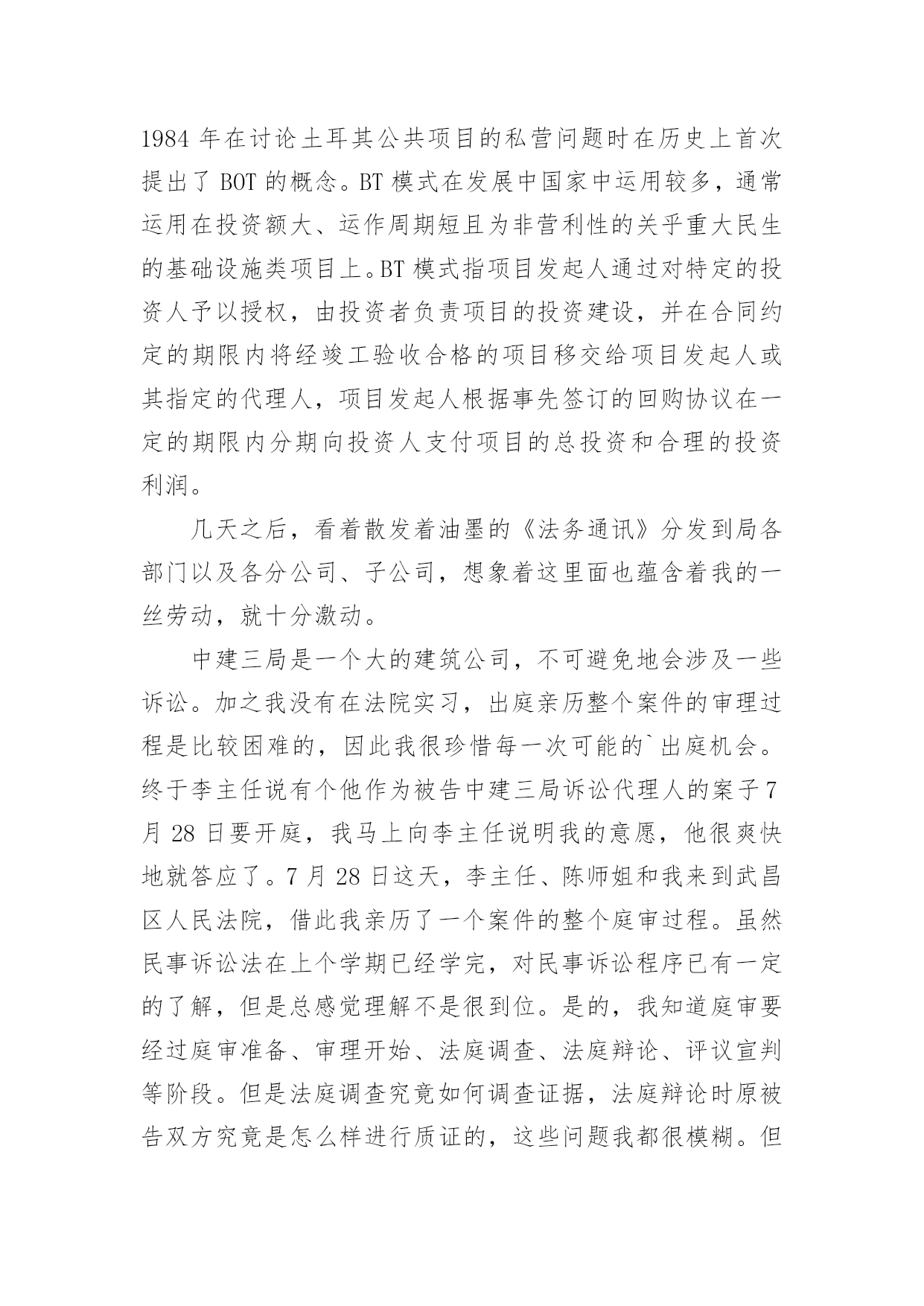 法务实习报告法务实习报告(15篇)在人们越来越注重自身素养的今天,报告的使用成为日常生活的常态,我们在写报告的时候要注意语言要准确、简洁。我们应当如何写报告呢?以下是小编为大家整理的法务实习报告,欢迎阅读与收藏。法务实习报告1众所周知,法律是一门实践性很强的学科。学以致用,历来为法律人所推崇。在现今的教育体制下,学校里学到的更多是理论知识,在实践方面还是有所欠缺。这样如果在大学期间不进行针对专业知识的实习,毕业后只能是一个会背法条、能讲法理,但是面对司法实务工作却一头雾水的不合格的法律人。如果这样的毕业生流入社会,投身司法实践,能够为推进我国社会主义法治建设做出应有的贡献,恐怕是值得怀疑的。就像学习游泳,教练在课堂上将各种各样游泳的技巧,听者貌似也学到了很多,可是一旦被推进水里,依然不会游泳,更有甚者会有淹死的风险。学习法律也一样,同学们私下里经常说:老师课堂上讲的东西好像自己也听懂了,就是那么回事。可是,一旦在生活中有人问及相关的法律问题,却常常哑口无言,说不出所以然来。这就是缺乏实践性锻炼的结果。学校安排在大二暑假实习,我认为是很科学的。首先,大一时候还没有接触相应的专业知识,实习为时过早;其次,大三暑假大部分同学都要准备司法考试,时间安排上会有冲突,而司法考试对于学习法律的人来说又是至关重要的;第三,经过大一大二的学习,专业必修课大部分已经接触,也相应具备了一定的法律思维,在知识储备和思维方式上都有了较大的提高,这个时候去实习效果最好;最后,经过实习,在以后的学习过程中必定会或多或少地考虑相关实务问题,容易把理论与实际相结合,不再纸上谈兵。带着实践中遇到的、听到的问题去思考理论问题,一定会产生不同的更加深刻的认识,对理论知识的掌握也会事半功倍,而且杜绝了人云亦云的欠佳的学习习惯,易于形成独立思考的习惯。不管将来是否从事司法实务工作,这对我们的成长都是一笔很大的财富。事非经过不知道。以前在课堂上老师常常会结合自己代理的案子来讲授知识,自然而然地会涉及到对当前司法现状的认识。但是因为没有亲身经历过,总觉得老师在危言耸听,夸大其词。然而,当我们去实习,也亲身投入到司法实践中的时候,才会明白老师当时说的是多么深刻。本次实习,好多同学都去了法院。而我因为种种原因去了公司。以前总以为公司法务工作人员就是合同保管员,公司不是十分重视也没有什么地位。但是在中建三局实习的这段时间才知道自己错得很远。在公司或许不如在法院接触的案子多,但是在这里依然有很多值得我们学习的东西。“学无止境”,的确是一条亘古不变的真理。7月11日早上8点钟,我们在李老师的带领下来到位于武珞路的新时代商务中心,也就是此次实习的单位——中建三局。李老师把我们带到四十三楼法律事务部,部门的李主任很热情地接待了我们,并把部门的其他工作人员介绍给我们。局法务部共有七个人,其中五个都是中南的校友,大家都感到十分亲切,有很多共同语言,就像在学校里一样。过后,李老师再一次强调了实习期间的纪律和我们应该注意的事项,暑期实习就算正式开始了。在实习之前,我对中建三局的名字是很陌生的,但是通过在单位的实习,我才逐渐了解到中建三局原来是一个非常了不起的大公司。中建三局全称中建三局建设工程股份有限公司,成立于20xx年12月29日,是具有多功能、集团化经营的大型建筑安装骨干企业。注册资本为人民币36630万元。经营范围涉及各类建筑工程总承包、施工、咨询、建筑技术开发与转让、机械设备租赁、路桥建设、商品混凝土生产和批发等。公司是以中国建筑第三工程局有限公司(以下简称“中国建筑三局有限公司”)为主发起人,联合香港协兴建筑有限公司、中国光大(澳门)有限公司、中国建筑科学研究院、武汉钢铁集团鄂城钢铁有限责任公司、中国华闻投资控股有限公司共同发起设立的外商投资股份制公司。下辖单位主要有:中建三局第一、二、三建设工程有限责任公司等控股子公司,以及总承包公司、股份公司(北京)、股份公司(沪)等非法人实体。公司全面继承了中国建筑三局有限公司成立以来取得的工程业绩:截至目前,共有湖北省电力调度楼、厦门嵩屿电厂、三峡工程开发总公司总部综合大楼、上海国际网球中心、天津泰达司法服务中心、河南省职工之家、武汉协和医院外科病房大楼等63项工程荣获中国建筑工程质量最高荣誉——鲁班奖(国家优质工程奖);深圳金福大厦、河南报业大厦、中铁十一局办公科研综合楼、清华大学美术学院教学楼、广西玉林体育馆等541项工程被评为省部级以上优质工程和样板工程;武汉世界贸易大厦、深圳鸿昌广场、南宁市建设大厦技术业务综合楼及地王国际商会中心等5项工程获得“全国建筑业新技术应用金牌示范工程”荣誉称号;辽宁广播电视发射塔主体工程成套施工技术、武汉国贸大厦综合施工技术、复杂空间钢结构施工技术的研究与应用等369项科技成果获得各级科学技术进步奖,其