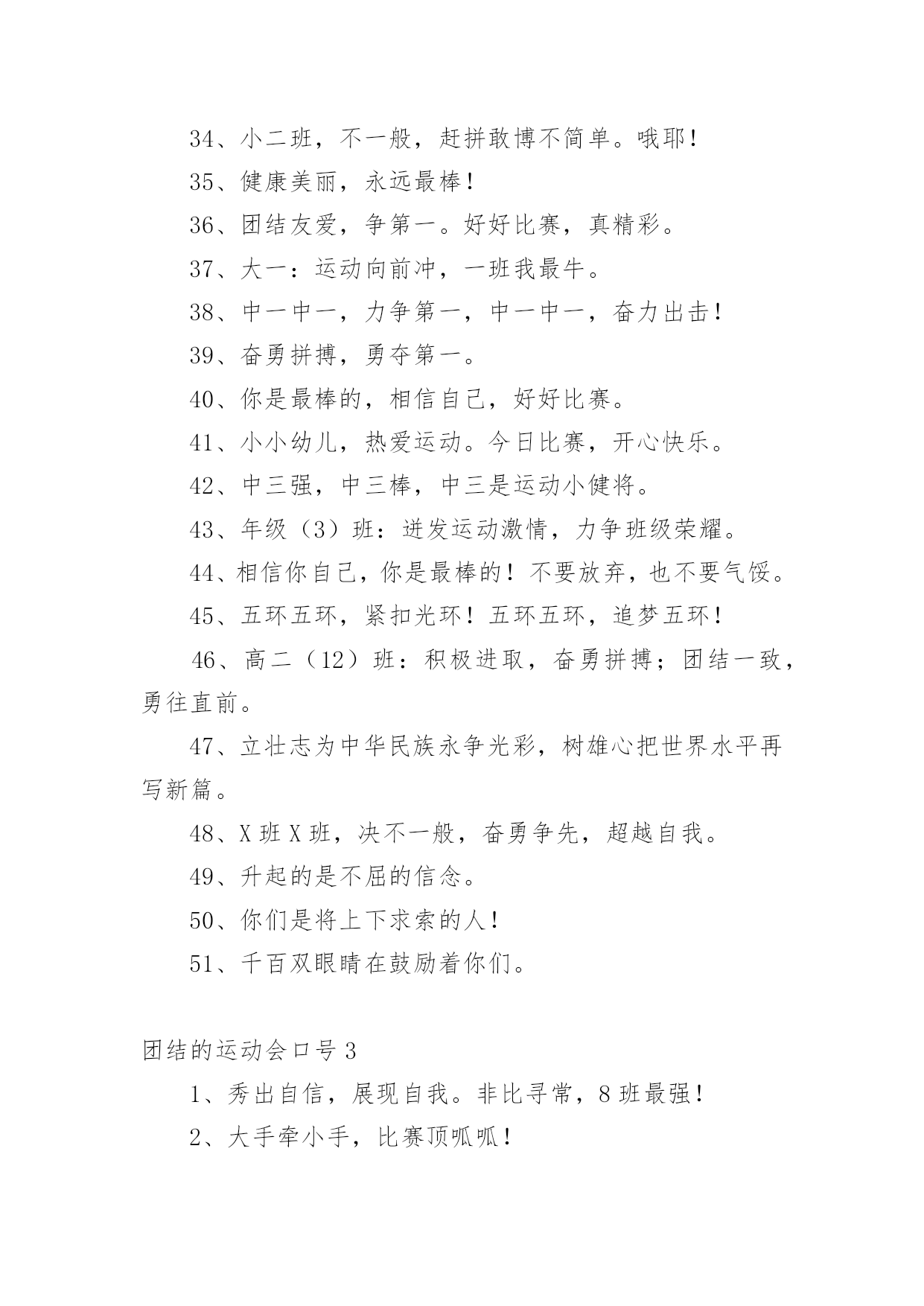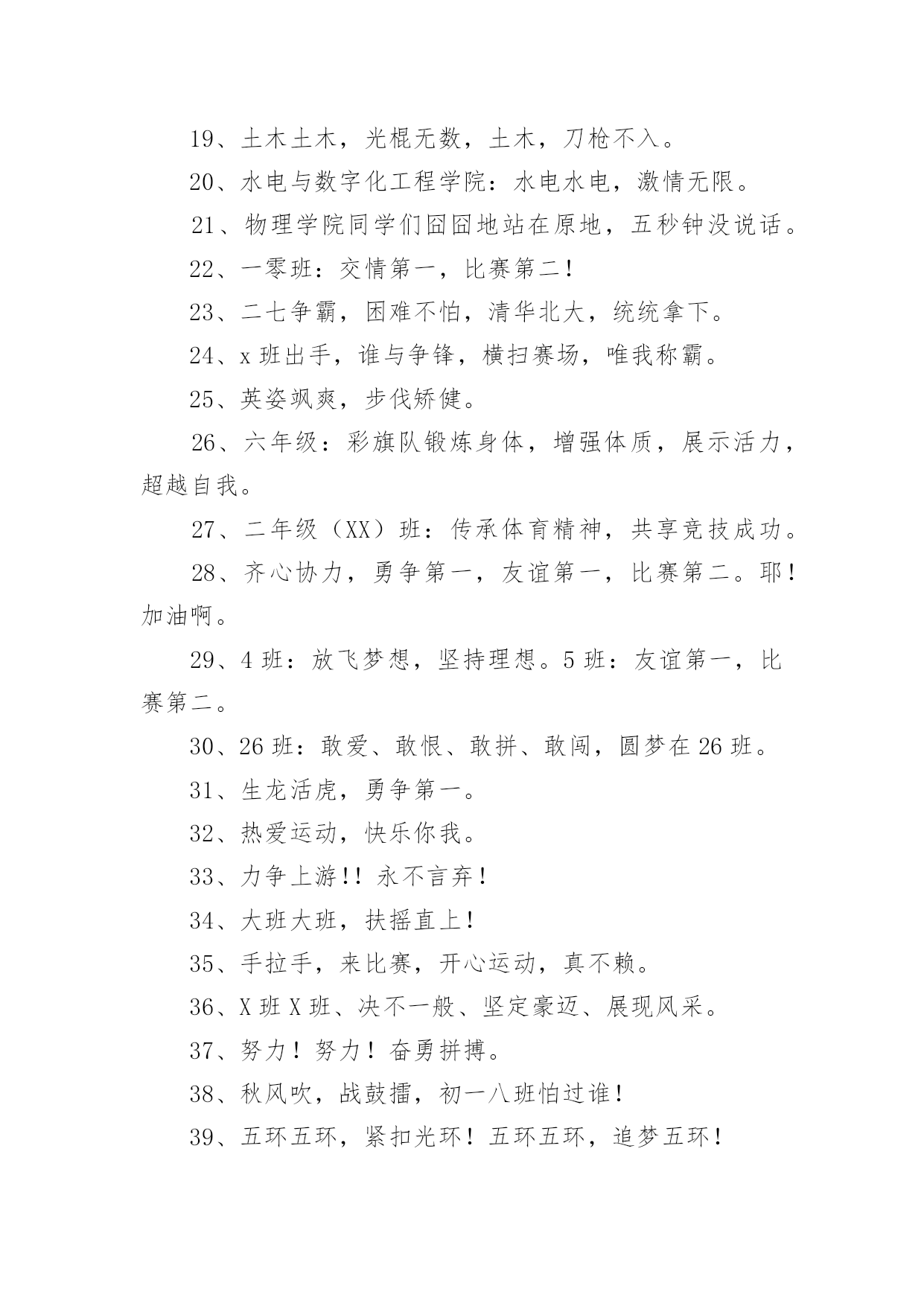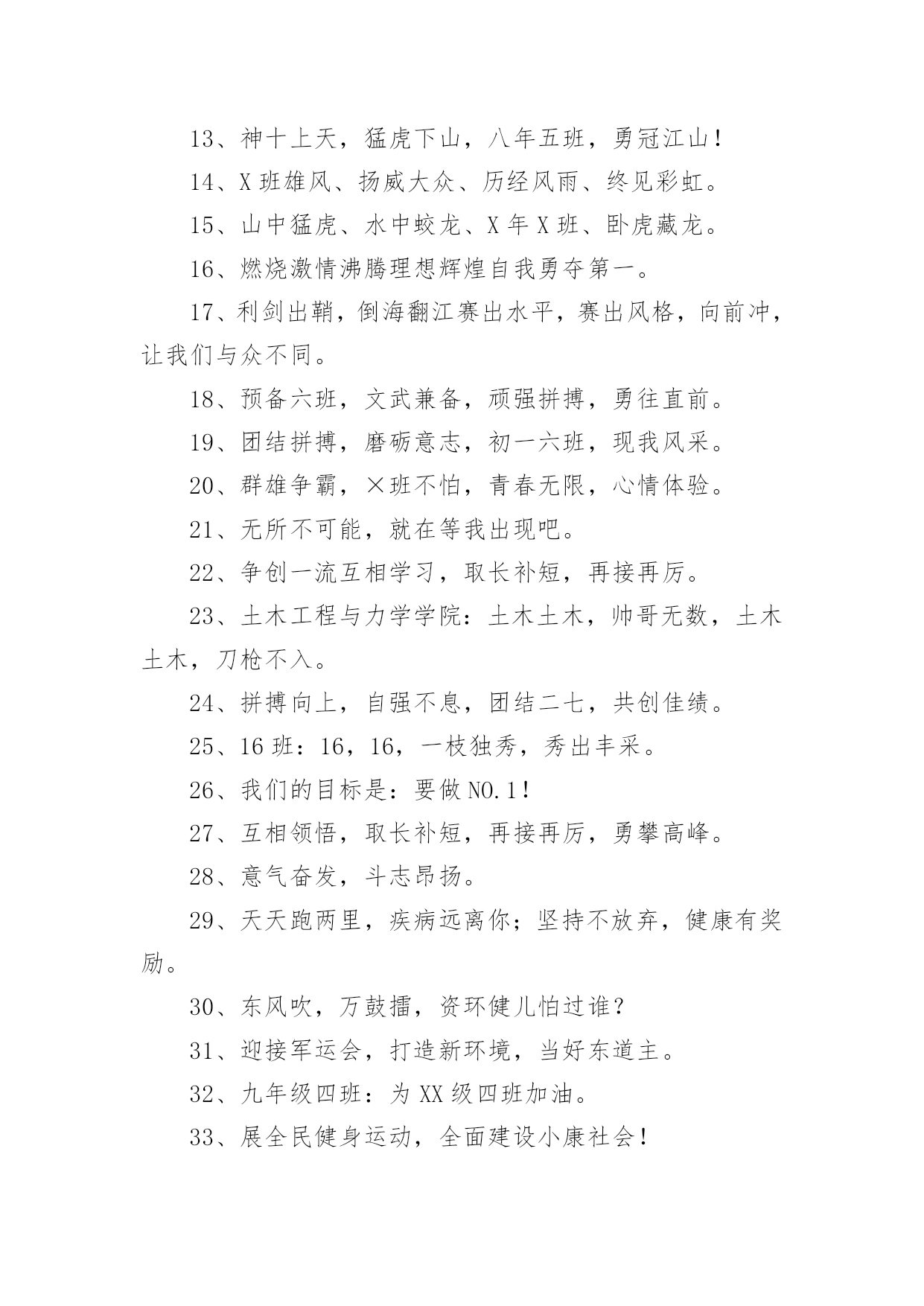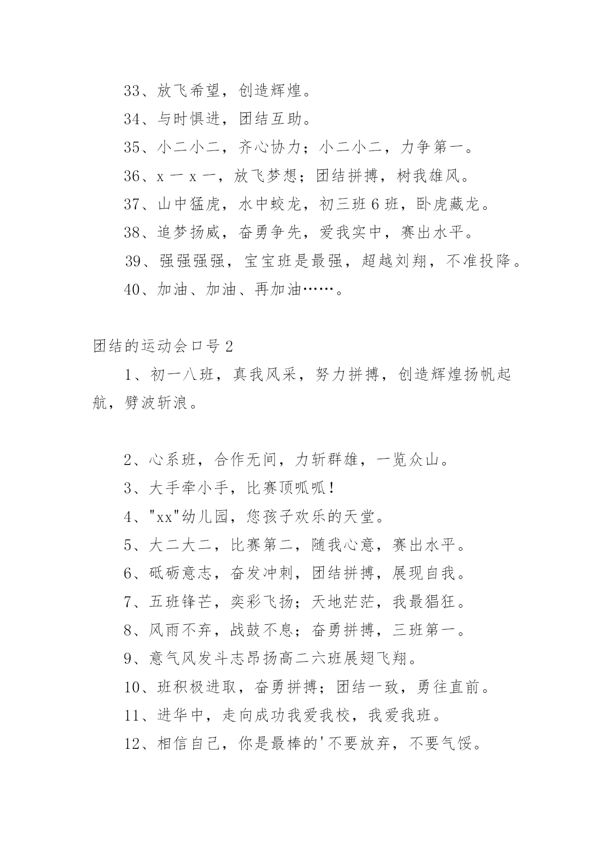 团结的运动会口号无论是在学校还是在社会中,大家都有令自己印象深刻的口号吧,口号以其时间性、阶段性和空间性的特色,表示着不同时代和不同地区人们的生活重点。你知道什么样的口号才能算得上是好的口号吗?以下是小编精心整理的团结的运动会口号,仅供参考,欢迎大家阅读。团结的运动会口号11、我健康,我快乐,我真的很不错!2、中二,中二,用力拼搏。3、班高二十五,藏龙卧虎;团结协作,奋勇争先。4、赶虎下山,驱龙出水,高二(二)班,独占山水。5、文能称霸,武能称雄,比赛场上,七班最强。6、气有浩然,心无止尽。7、展现自我,超越自我,初二二班,奋力拼搏。8、四班一出,谁与争锋,横扫赛场,唯我称。9、小二小二你最棒!小二小二你真强!10、赛场展雄姿,×班健儿竞风流。11、忆往昔,看今朝,××班独领风骚。12、土木土木,光棍无数,土木,刀枪不入。13、软件学院:软件软件,创意无限。14、一零班:交情第一,比赛第二!15、二七争霸,困难不怕,清华北大,统统拿下。16、柳树抽出新芽,怎能忘了春风的吹拂。17、追梦扬威,奋勇争先。相信自我,相信伙伴!18、四年级(XX)班:永不言败,勇往直前,携手共进,同创辉煌。19、12班:坚信未来的.明天将属于我们。20、发挥校园文化的育人功能,把德育、体育、美育有机结合起来!团结一致,奋力拼搏,自强不息,永争第一的精神在这里奔腾流淌。21、初三(6)初三(6)班,真我风采,努力拼搏,创造辉煌。22、初二(5)山中猛虎,水中蛟龙,初二(5)班,卧虎藏龙。23、四班雄风,扬威大众。24、二班雄风,扬威大众。25、我们年龄小,我们心气高。26、某人进分:全场最帅。我们崇拜。27、努力拼搏,勇争第一。28、锻炼身体,回报祖国。29、年级(2)班:强身健体,立志成材,2班2班,非同一般。30、年级(2)班:赛出体育真谛,弘扬奥运精神。31、年级(1)班:扬帆把舵,奋勇拼搏,看我一班,锐不可当。32、发扬奥运的精神,创造校运的佳绩!33、放飞希望,创造辉煌。34、与时惧进,团结互助。35、小二小二,齐心协力;小二小二,力争第一。36、x一x一,放飞梦想;团结拼搏,树我雄风。37、山中猛虎,水中蛟龙,初三班6班,卧虎藏龙。38、追梦扬威,奋勇争先,爱我实中,赛出水平。39、强强强强,宝宝班是最强,超越刘翔,不准投降。40、加油、加油、再加油……。团结的运动会口号21、初一八班,真我风采,努力拼搏,创造辉煌扬帆起航,劈波斩浪。2、心系班,合作无间,力斩群雄,一览众山。3、大手牵小手,比赛顶呱呱!4、"xx"幼儿园,您孩子欢乐的天堂。5、大二大二,比赛第二,随我心意,赛出水平。6、砥砺意志,奋发冲刺,团结拼搏,展现自我。7、五班锋芒,奕彩飞扬;天地茫茫,我最猖狂。8、风雨不弃,战鼓不息;奋勇拼搏,三班第一。9、意气风发斗志昂扬高二六班展翅飞翔。10、班积极进取,奋勇拼搏;团结一致,勇往直前。11、进华中,走向成功我爱我校,我爱我班。12、相信自己,你是最棒的'不要放弃,不要气馁。13、神十上天,猛虎下山,八年五班,勇冠江山!14、X班雄风、扬威大众、历经风雨、终见彩虹。15、山中猛虎、水中蛟龙、X年X班、卧虎藏龙。16、燃烧激情沸腾理想辉煌自我勇夺第一。17、利剑出鞘,倒海翻江赛出水平,赛出风格,向前冲,让我们与众不同。18、预备六班,文武兼备,顽强拼搏,勇往直前。19、团结拼搏,磨砺意志,初一六班,现我风采。20、群雄争霸,×班不怕,青春无限,心情体验。21、无所不可能,就在等我出现吧。22、争创一流互相学习,取长补短,再接再厉。23、土木工程与力学学院:土木土木,帅哥无数,土木土木,刀枪不入。24、拼搏向上,自强不息,团结二七,共创佳绩。25、16班:16,16,一枝独秀,秀出丰采。26、我们的目标是:要做NO.1!27、互相领悟,取长补短,再接再厉,勇攀高峰。28、意气奋发,斗志昂扬。29、天天跑两里,疾病远离你;坚持不放弃,健康有奖励。30、东风吹,万鼓擂,资环健儿怕过谁?31、迎接军运会,打造新环境,当好东道主。32、九年级四班:为XX级四班加油。33、展全民健身运动,全面建设小康社会!34、小二班,不一般,赶拼敢博不简单。哦耶!35、健康美丽,永远最棒!36、团结友爱,争第一。好好比赛,真精彩。37、大一:运动向前冲,一班我最牛。38、中一中一,力争第一,中一中一,奋力出击!39、奋勇拼搏,勇夺第一。40、你是最棒的,相信自己,好好比赛。41、小小幼儿,热爱运动。今日比赛,开心快乐。42、中三强,中三棒,中三是运动小健将。43、年级(3)班:迸发运动激情,力争班级荣耀。44、相信你自己,你是最棒的!不要放弃,也不要气馁。45、五环五环,紧扣光环!五环五环,追梦五环!46、高二(12)班:积极进取,奋勇拼搏;团结一致,勇