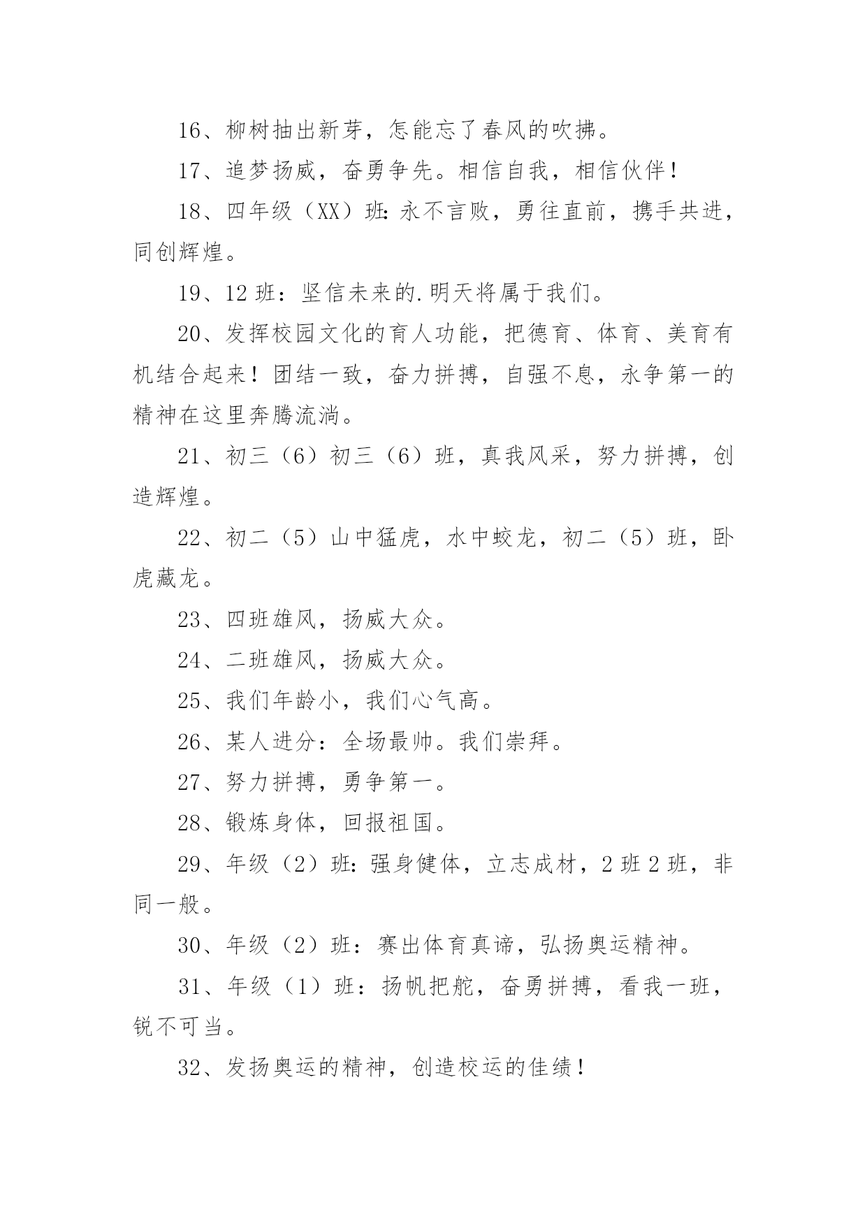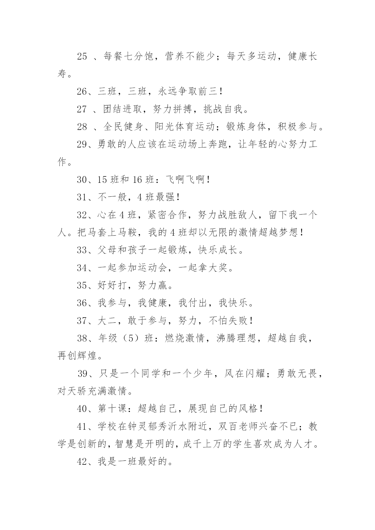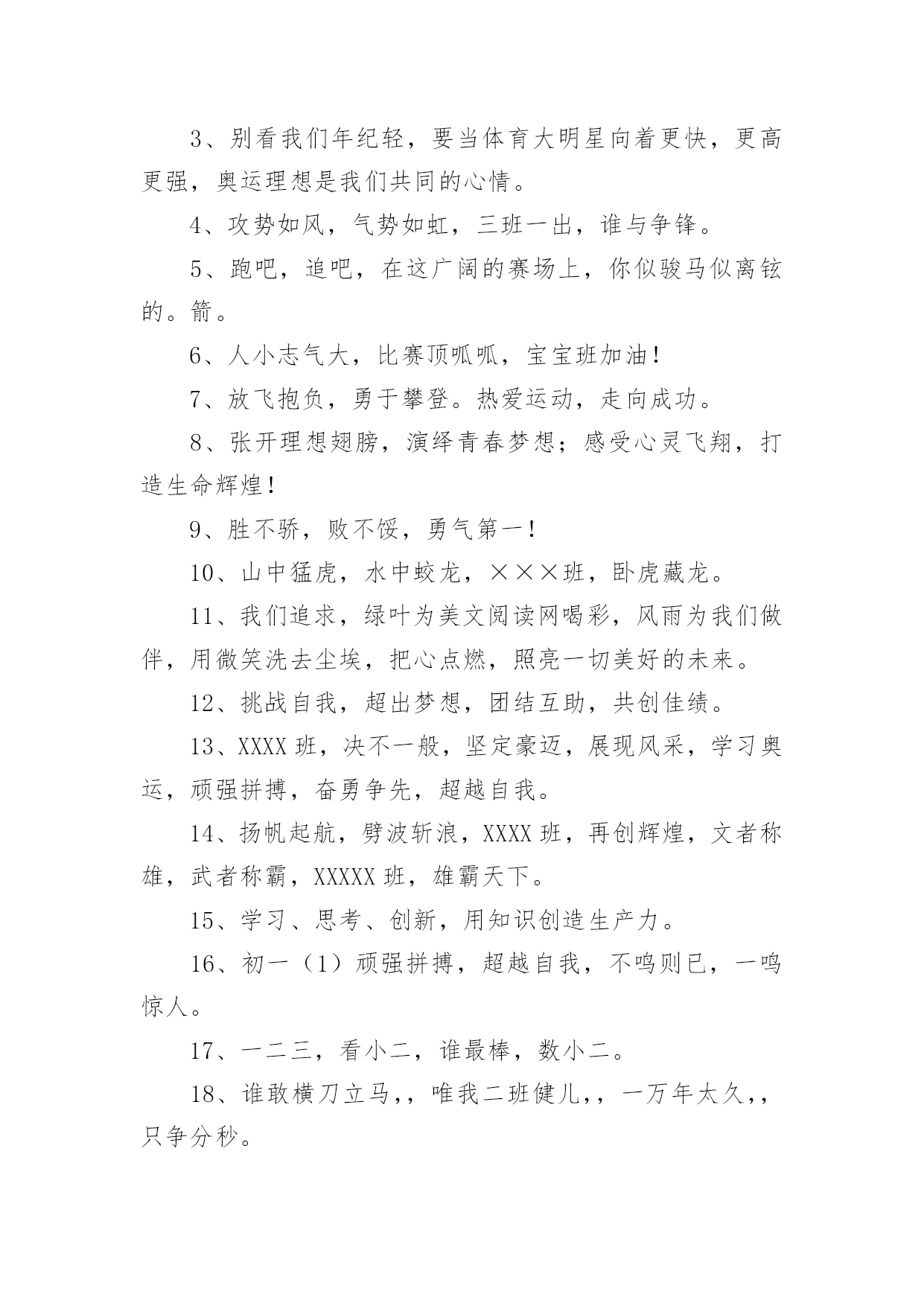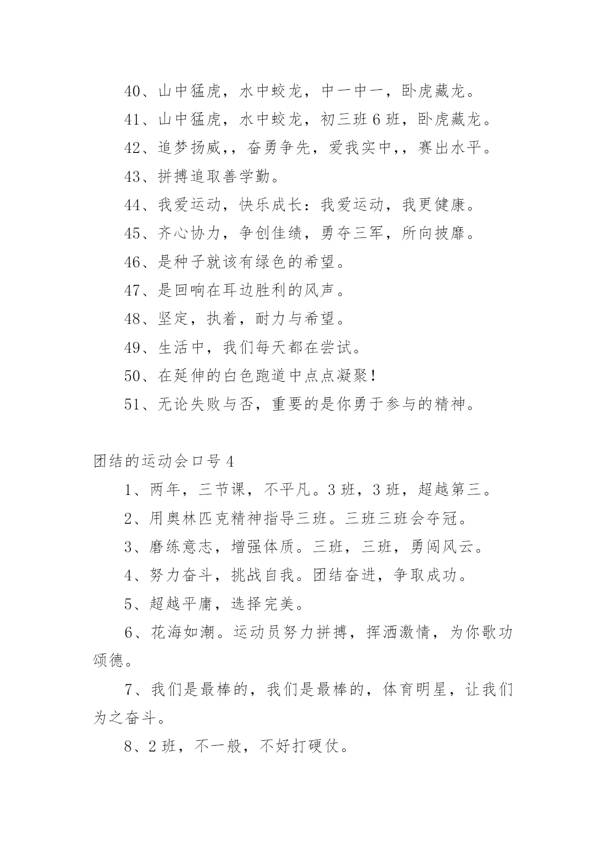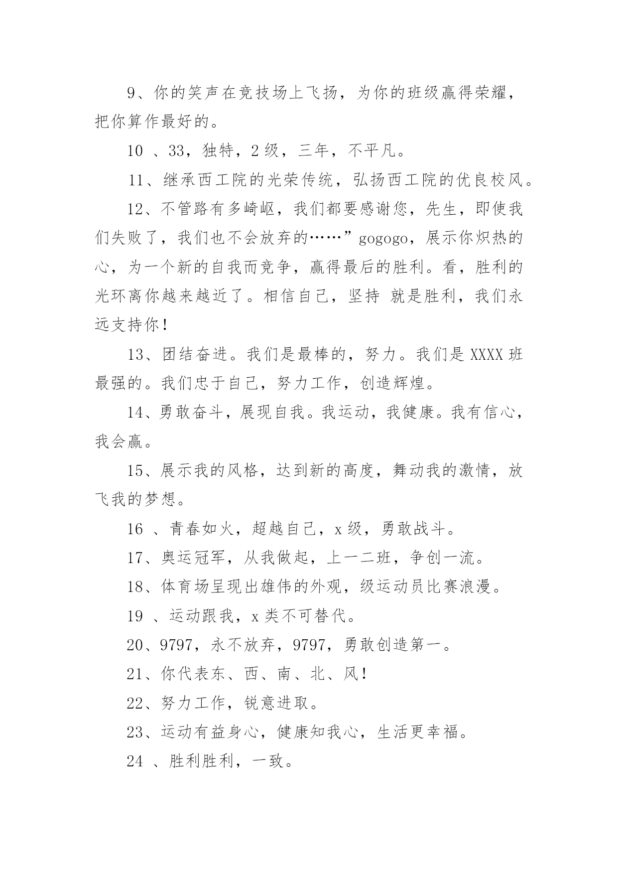 团结的运动会口号无论是在学校还是在社会中,大家都有令自己印象深刻的口号吧,口号以其时间性、阶段性和空间性的特色,表示着不同时代和不同地区人们的生活重点。你知道什么样的口号才能算得上是好的口号吗?以下是小编精心整理的团结的运动会口号,仅供参考,欢迎大家阅读。团结的运动会口号11、我健康,我快乐,我真的很不错!2、中二,中二,用力拼搏。3、班高二十五,藏龙卧虎;团结协作,奋勇争先。4、赶虎下山,驱龙出水,高二(二)班,独占山水。5、文能称霸,武能称雄,比赛场上,七班最强。6、气有浩然,心无止尽。7、展现自我,超越自我,初二二班,奋力拼搏。8、四班一出,谁与争锋,横扫赛场,唯我称。9、小二小二你最棒!小二小二你真强!10、赛场展雄姿,×班健儿竞风流。11、忆往昔,看今朝,××班独领风骚。12、土木土木,光棍无数,土木,刀枪不入。13、软件学院:软件软件,创意无限。14、一零班:交情第一,比赛第二!15、二七争霸,困难不怕,清华北大,统统拿下。16、柳树抽出新芽,怎能忘了春风的吹拂。17、追梦扬威,奋勇争先。相信自我,相信伙伴!18、四年级(XX)班:永不言败,勇往直前,携手共进,同创辉煌。19、12班:坚信未来的.明天将属于我们。20、发挥校园文化的育人功能,把德育、体育、美育有机结合起来!团结一致,奋力拼搏,自强不息,永争第一的精神在这里奔腾流淌。21、初三(6)初三(6)班,真我风采,努力拼搏,创造辉煌。22、初二(5)山中猛虎,水中蛟龙,初二(5)班,卧虎藏龙。23、四班雄风,扬威大众。24、二班雄风,扬威大众。25、我们年龄小,我们心气高。26、某人进分:全场最帅。我们崇拜。27、努力拼搏,勇争第一。28、锻炼身体,回报祖国。29、年级(2)班:强身健体,立志成材,2班2班,非同一般。30、年级(2)班:赛出体育真谛,弘扬奥运精神。31、年级(1)班:扬帆把舵,奋勇拼搏,看我一班,锐不可当。32、发扬奥运的精神,创造校运的佳绩!33、放飞希望,创造辉煌。34、与时惧进,团结互助。35、小二小二,齐心协力;小二小二,力争第一。36、x一x一,放飞梦想;团结拼搏,树我雄风。37、山中猛虎,水中蛟龙,初三班6班,卧虎藏龙。38、追梦扬威,奋勇争先,爱我实中,赛出水平。39、强强强强,宝宝班是最强,超越刘翔,不准投降。40、加油、加油、再加油……。团结的运动会口号21、初一八班,真我风采,努力拼搏,创造辉煌扬帆起航,劈波斩浪。2、心系班,合作无间,力斩群雄,一览众山。3、大手牵小手,比赛顶呱呱!4、"xx"幼儿园,您孩子欢乐的天堂。5、大二大二,比赛第二,随我心意,赛出水平。6、砥砺意志,奋发冲刺,团结拼搏,展现自我。7、五班锋芒,奕彩飞扬;天地茫茫,我最猖狂。8、风雨不弃,战鼓不息;奋勇拼搏,三班第一。9、意气风发斗志昂扬高二六班展翅飞翔。10、班积极进取,奋勇拼搏;团结一致,勇往直前。11、进华中,走向成功我爱我校,我爱我班。12、相信自己,你是最棒的'不要放弃,不要气馁。13、神十上天,猛虎下山,八年五班,勇冠江山!14、X班雄风、扬威大众、历经风雨、终见彩虹。15、山中猛虎、水中蛟龙、X年X班、卧虎藏龙。16、燃烧激情沸腾理想辉煌自我勇夺第一。17、利剑出鞘,倒海翻江赛出水平,赛出风格,向前冲,让我们与众不同。18、预备六班,文武兼备,顽强拼搏,勇往直前。19、团结拼搏,磨砺意志,初一六班,现我风采。20、群雄争霸,×班不怕,青春无限,心情体验。21、无所不可能,就在等我出现吧。22、争创一流互相学习,取长补短,再接再厉。23、土木工程与力学学院:土木土木,帅哥无数,土木土木,刀枪不入。24、拼搏向上,自强不息,团结二七,共创佳绩。25、16班:16,16,一枝独秀,秀出丰采。26、我们的目标是:要做NO.1!27、互相领悟,取长补短,再接再厉,勇攀高峰。28、意气奋发,斗志昂扬。29、天天跑两里,疾病远离你;坚持不放弃,健康有奖励。30、东风吹,万鼓擂,资环健儿怕过谁?31、迎接军运会,打造新环境,当好东道主。32、九年级四班:为XX级四班加油。33、展全民健身运动,全面建设小康社会!34、小二班,不一般,赶拼敢博不简单。哦耶!35、健康美丽,永远最棒!36、团结友爱,争第一。好好比赛,真精彩。37、大一:运动向前冲,一班我最牛。38、中一中一,力争第一,中一中一,奋力出击!39、奋勇拼搏,勇夺第一。40、你是最棒的,相信自己,好好比赛。41、小小幼儿,热爱运动。今日比赛,开心快乐。42、中三强,中三棒,中三是运动小健将。43、年级(3)班:迸发运动激情,力争班级荣耀。44、相信你自己,你是最棒的!不要放弃,也不要气馁。45、五环五环,紧扣光环!五环五环,追梦五环!46、高二(12)班:积极进取,奋勇拼搏;团结一致,勇