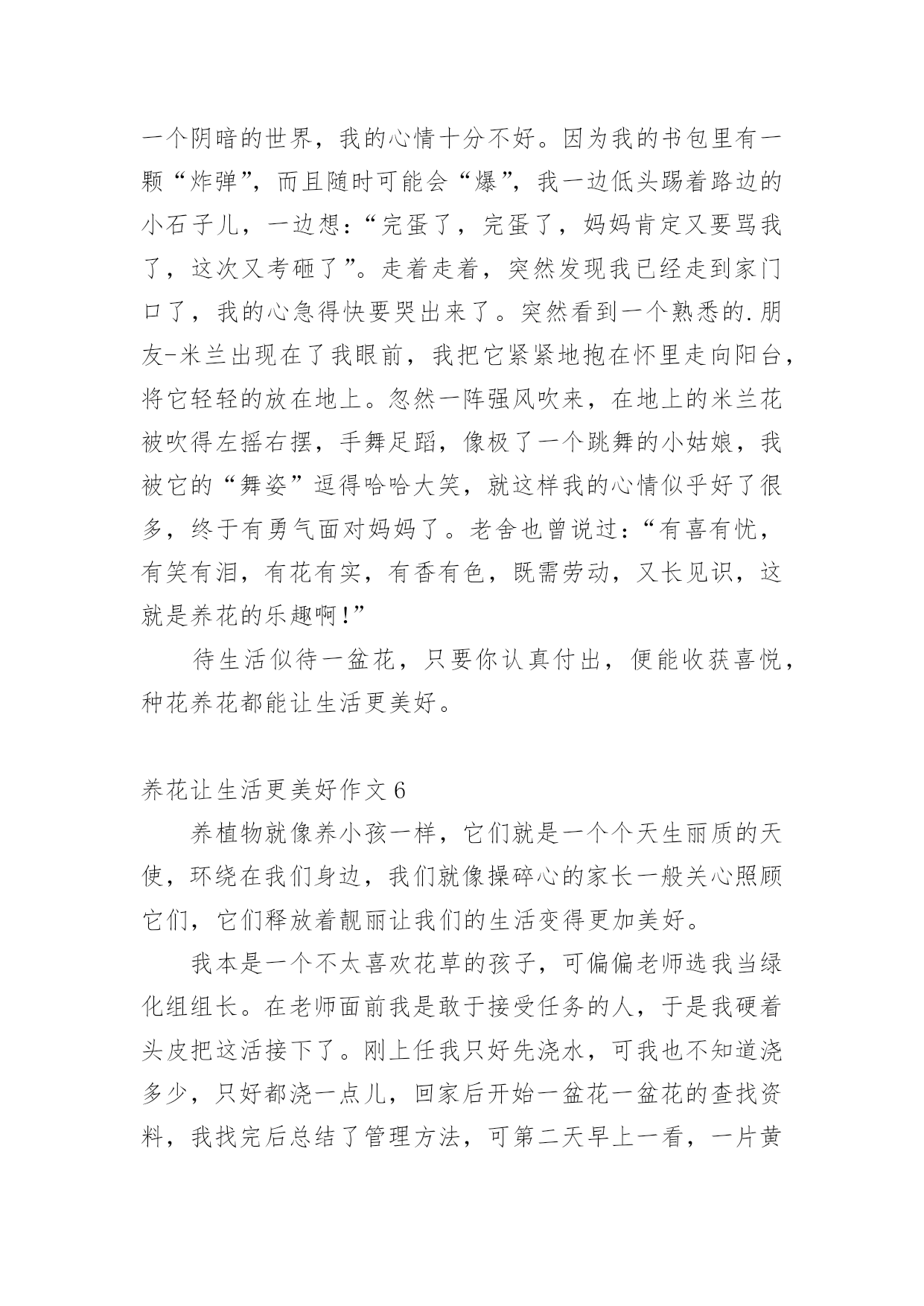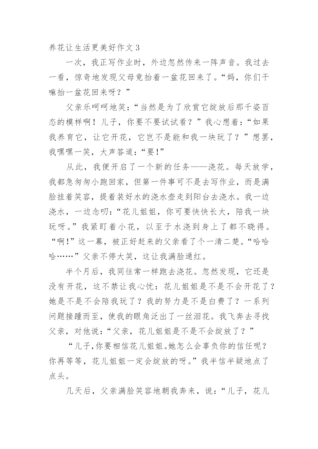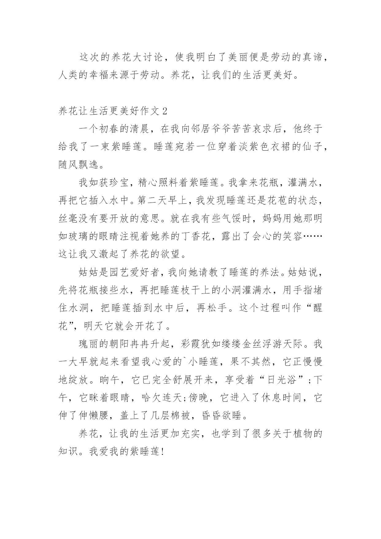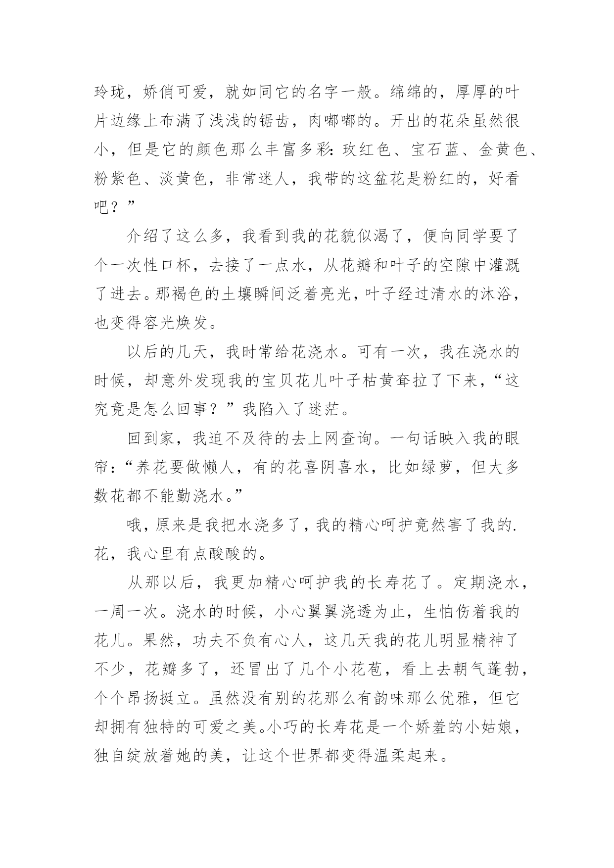养花让生活更美好作文[热]养花让生活更美好作文在平日的学习、工作和生活里,大家最不陌生的就是作文了吧,借助作文人们可以实现文化交流的目的。你写作文时总是无从下笔?以下是小编为大家收集的养花让生活更美好作文,仅供参考,欢迎大家阅读。养花让生活更美好作文1最近几天,我们学校开展了养护绿植活动,让每个同学把自家养的绿植带到学校。这个活动真有趣,我们都跃跃欲试。有的同学说要带绿萝,有的同学说要带多肉,还有的同学说要带滴水观音。大家五花八门的讨论着。老师宣布:“明天,我们举行一次养花大讨论好吗?一定要记得带上你养的绿植哦!”晚上,我在阳台上瞧着我养的长寿花,心想我们班的同学肯定会带绿萝,要不然带害羞草,或许还有人带红掌。我这盆长寿花肯定是花中仙子,一定会比他们的更美。到了第二天,我带着长寿花飞奔到了学校。一进教室,我发现同学们都比我来的还早,都在讨论着各自的花儿。一看见我来了,看见我手里乖巧的长寿花,大家异口同声的说:“哇,这个花好漂亮哦。!”“你看这花样子十分可爱,小巧玲珑,娇俏可爱,就如同它的名字一般。绵绵的,厚厚的叶片边缘上布满了浅浅的锯齿,肉嘟嘟的。开出的花朵虽然很小,但是它的颜色那么丰富多彩:玫红色、宝石蓝、金黄色、粉紫色、淡黄色,非常迷人,我带的这盆花是粉红的,好看吧?”介绍了这么多,我看到我的花貌似渴了,便向同学要了个一次性口杯,去接了一点水,从花瓣和叶子的空隙中灌溉了进去。那褐色的土壤瞬间泛着亮光,叶子经过清水的沐浴,也变得容光焕发。以后的几天,我时常给花浇水。可有一次,我在浇水的时候,却意外发现我的宝贝花儿叶子枯黄耷拉了下来,“这究竟是怎么回事?”我陷入了迷茫。回到家,我迫不及待的去上网查询。一句话映入我的眼帘:“养花要做懒人,有的花喜阴喜水,比如绿萝,但大多数花都不能勤浇水。”哦,原来是我把水浇多了,我的精心呵护竟然害了我的.花,我心里有点酸酸的。从那以后,我更加精心呵护我的长寿花了。定期浇水,一周一次。浇水的时候,小心翼翼浇透为止,生怕伤着我的花儿。果然,功夫不负有心人,这几天我的花儿明显精神了不少,花瓣多了,还冒出了几个小花苞,看上去朝气蓬勃,个个昂扬挺立。虽然没有别的花那么有韵味那么优雅,但它却拥有独特的可爱之美。小巧的长寿花是一个娇羞的小姑娘,独自绽放着她的美,让这个世界都变得温柔起来。这次的养花大讨论,使我明白了美丽便是劳动的真谛,人类的幸福来源于劳动。养花,让我们的生活更美好。养花让生活更美好作文2一个初春的清晨,在我向邻居爷爷苦苦哀求后,他终于给我了一束紫睡莲。睡莲宛若一位穿着淡紫色衣裙的仙子,随风飘逸。我如获珍宝,精心照料着紫睡莲。我拿来花瓶,灌满水,再把它插入水中。第二天早上,我发现睡莲还是花苞的状态,丝毫没有要开放的意思。就在我有些气馁时,妈妈用她那明如玻璃的眼睛注视着她养的丁香花,露出了会心的笑容……这让我又激起了养花的欲望。姑姑是园艺爱好者,我向她请教了睡莲的养法。姑姑说,先将花瓶接些水,再把睡莲枝干上的小洞灌满水,用手指堵住水洞,把睡莲插到水中后,再松手。这个过程叫作“醒花”,明天它就会开花了。瑰丽的朝阳冉冉升起,彩霞犹如缕缕金丝浮游天际。我一大早就起来看望我心爱的`小睡莲,果不其然,它正慢慢地绽放。晌午,它已完全舒展开来,享受着“日光浴”;下午,它眯着眼睛,哈欠连天;傍晚,它进入了休息时间,它伸了伸懒腰,盖上了几层棉被,昏昏欲睡。养花,让我的生活更加充实,也学到了很多关于植物的知识。我爱我的紫睡莲!养花让生活更美好作文3一次,我正写作业时,外边忽然传来一阵声音。我过去一看,惊奇地发现父母竟抬着一盆花回来了。“妈,你们干嘛抬一盆花回来呀?”父亲乐呵呵地笑:“当然是为了欣赏它绽放后那千姿百态的模样啊!儿子,你要不要试试看?”我心想着:“如果我养育它,让它开花,它岂不是能和我一块玩了?”想罢,我嘿嘿一笑,大声答道:“要!”从此,我便开启了一个新的任务——浇花。每天放学,我都急匆匆小跑回家,但第一件事可不是去写作业,而是满脸挂着笑容,提着装好水的浇水壶走到阳台去浇水。我一边浇水,一边念叨:“花儿姐姐,你可要快快长大,陪我一块玩呀。”我紧盯着小花,以至于水浇到身上了都不晓得。“啊!”这一幕,被正好赶来的父亲看了个一清二楚。“哈哈哈……”父亲不停大笑,这让我满脸通红。半个月后,我同往常一样跑去浇花。忽然发现,它还是没有开花,这不禁让我心忧:花儿姐姐是不是不会开花了?她是不是不会陪我玩了?我的努力是不是白费了?一系列问题接踵而至,使我的眼角泛出了一丝泪花。我飞奔去寻找父亲,对他说:“父亲,花儿姐姐是不是不会绽放了?”“儿子,你要相信花儿姐姐。她怎么会辜负你的信任呢?你再等等,花儿姐姐一定会绽放的呀。”我半信半疑地点了点头。几天后,父亲满脸笑容地朝我奔来,说:“儿子,花儿姐姐绽放了!”我立马从椅子上蹦