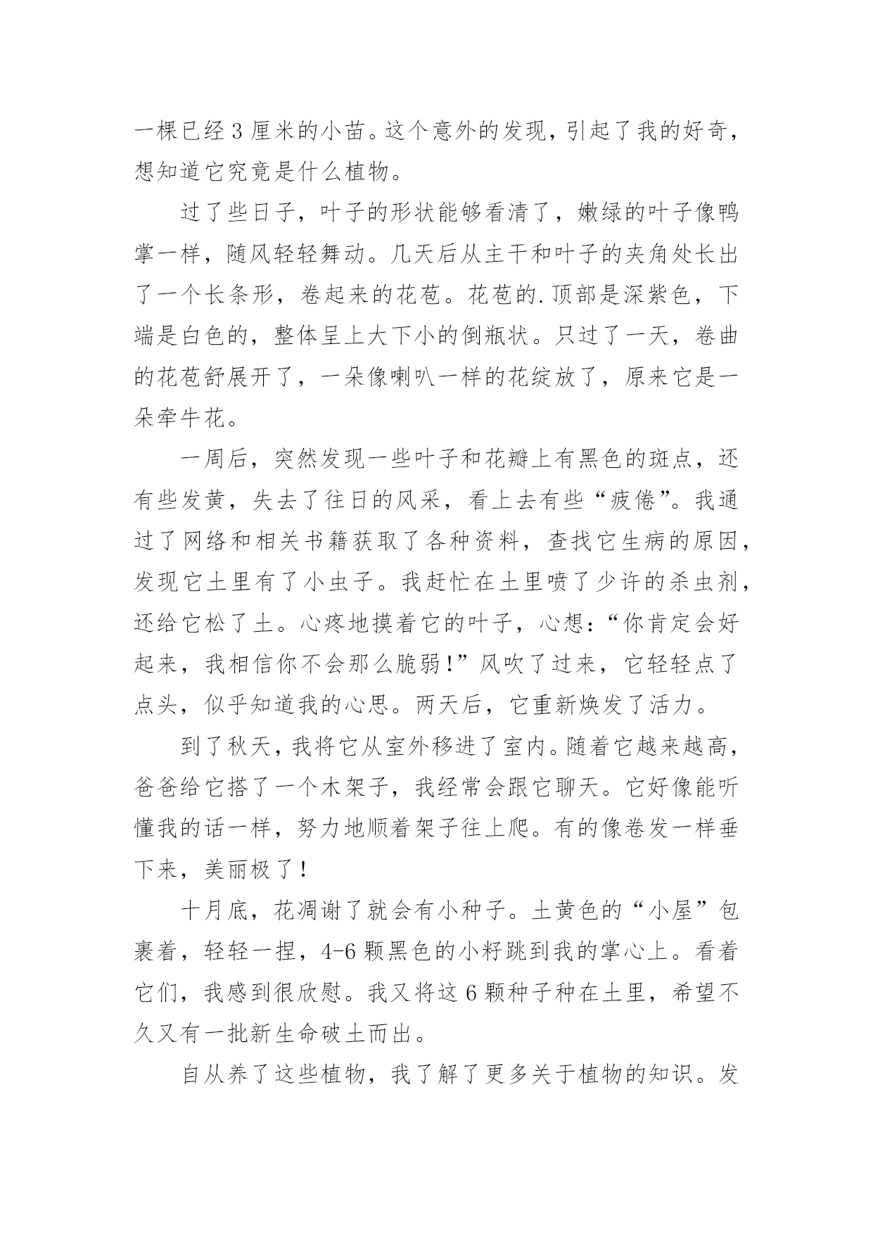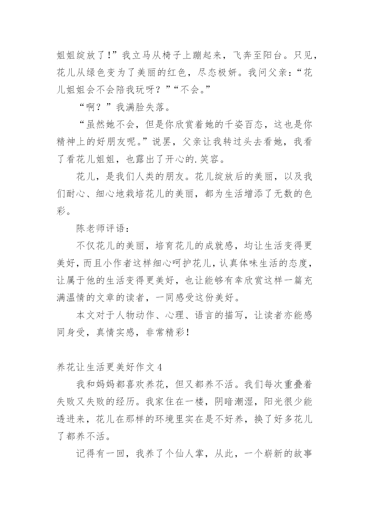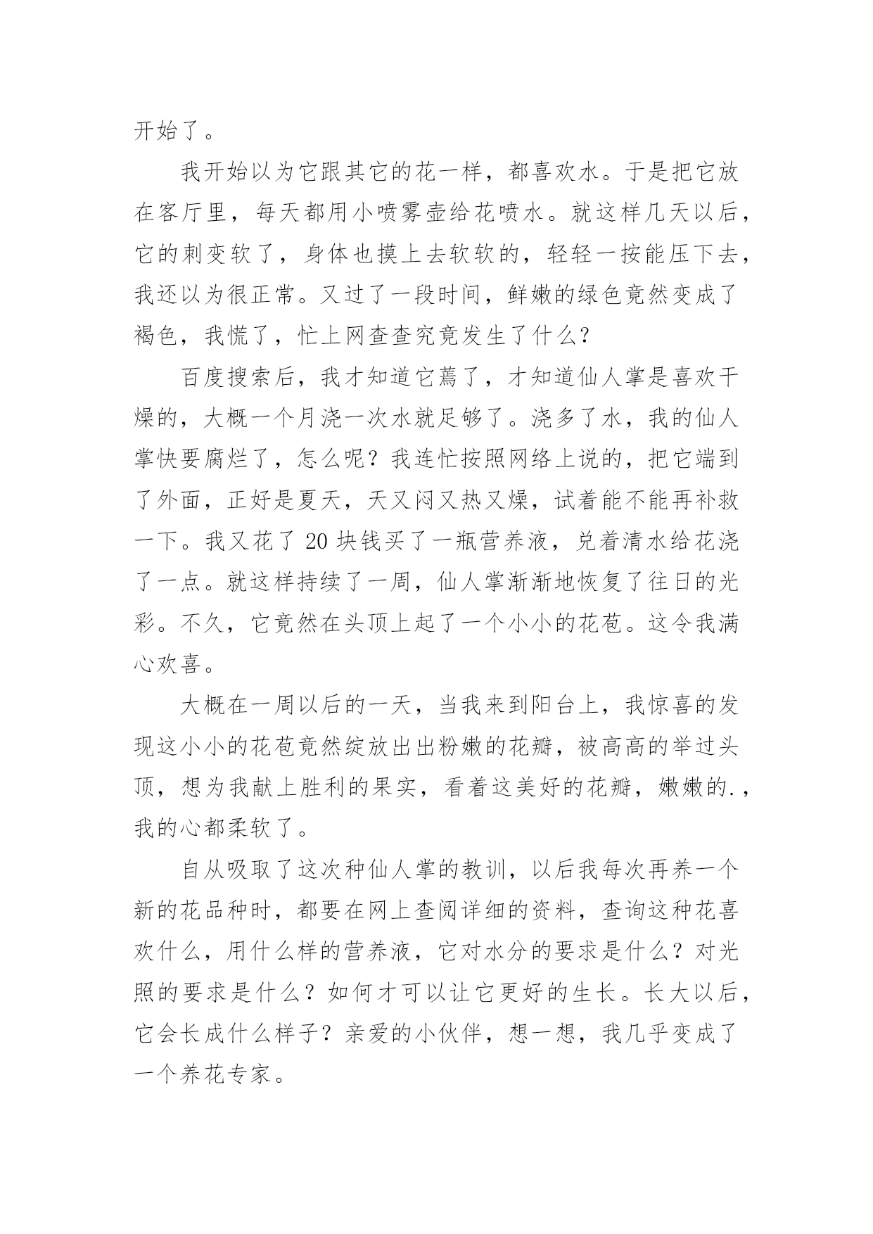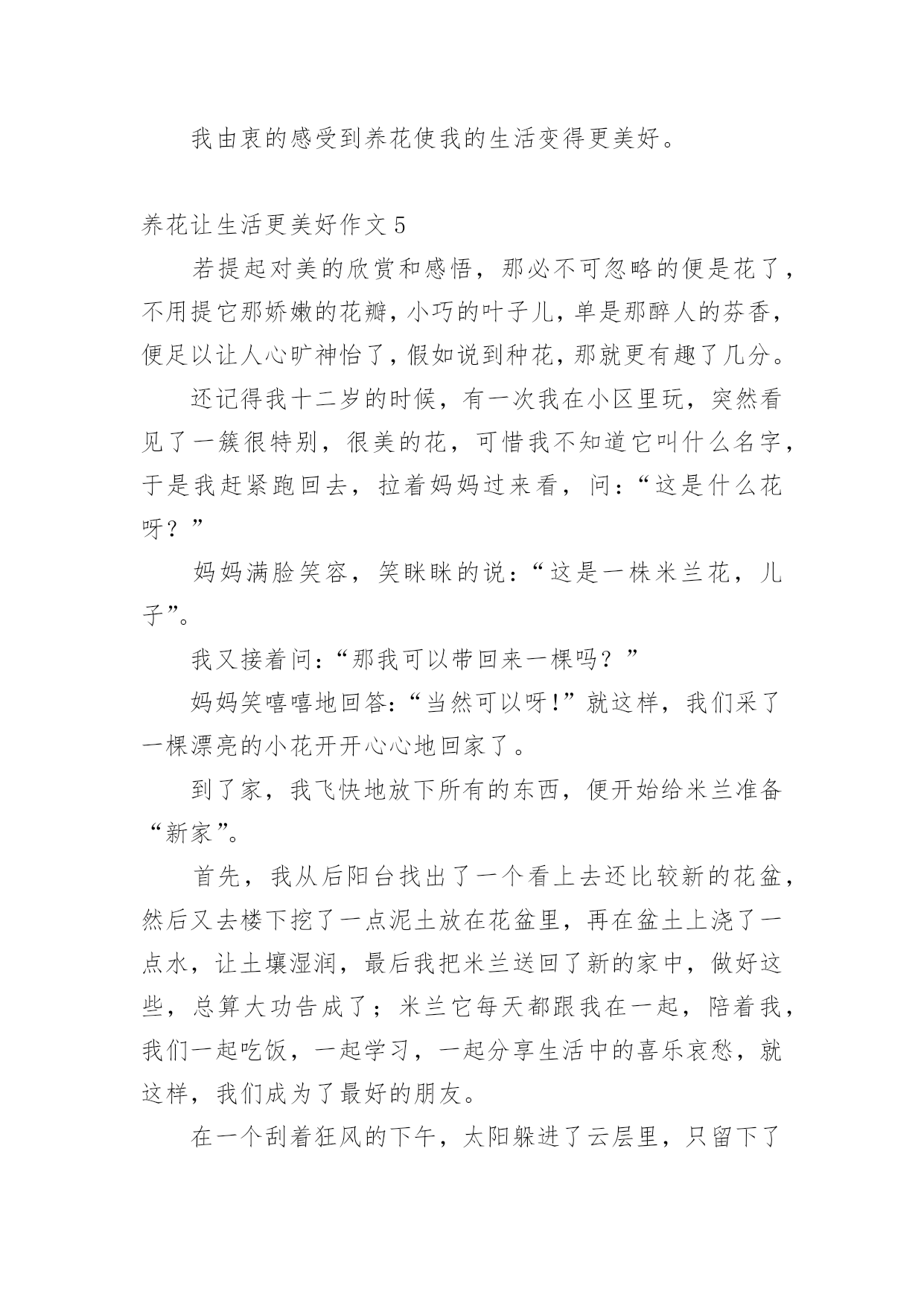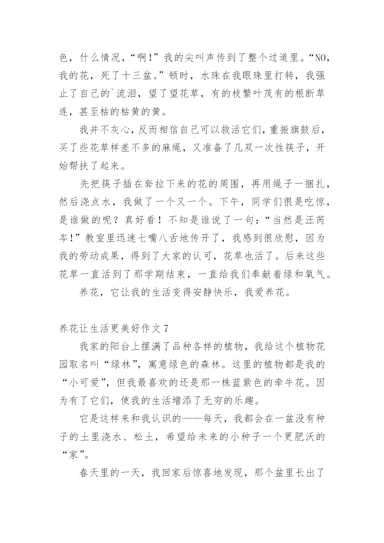 养花让生活更美好作文[热]养花让生活更美好作文在平日的学习、工作和生活里,大家最不陌生的就是作文了吧,借助作文人们可以实现文化交流的目的。你写作文时总是无从下笔?以下是小编为大家收集的养花让生活更美好作文,仅供参考,欢迎大家阅读。养花让生活更美好作文1最近几天,我们学校开展了养护绿植活动,让每个同学把自家养的绿植带到学校。这个活动真有趣,我们都跃跃欲试。有的同学说要带绿萝,有的同学说要带多肉,还有的同学说要带滴水观音。大家五花八门的讨论着。老师宣布:“明天,我们举行一次养花大讨论好吗?一定要记得带上你养的绿植哦!”晚上,我在阳台上瞧着我养的长寿花,心想我们班的同学肯定会带绿萝,要不然带害羞草,或许还有人带红掌。我这盆长寿花肯定是花中仙子,一定会比他们的更美。到了第二天,我带着长寿花飞奔到了学校。一进教室,我发现同学们都比我来的还早,都在讨论着各自的花儿。一看见我来了,看见我手里乖巧的长寿花,大家异口同声的说:“哇,这个花好漂亮哦。!”“你看这花样子十分可爱,小巧玲珑,娇俏可爱,就如同它的名字一般。绵绵的,厚厚的叶片边缘上布满了浅浅的锯齿,肉嘟嘟的。开出的花朵虽然很小,但是它的颜色那么丰富多彩:玫红色、宝石蓝、金黄色、粉紫色、淡黄色,非常迷人,我带的这盆花是粉红的,好看吧?”介绍了这么多,我看到我的花貌似渴了,便向同学要了个一次性口杯,去接了一点水,从花瓣和叶子的空隙中灌溉了进去。那褐色的土壤瞬间泛着亮光,叶子经过清水的沐浴,也变得容光焕发。以后的几天,我时常给花浇水。可有一次,我在浇水的时候,却意外发现我的宝贝花儿叶子枯黄耷拉了下来,“这究竟是怎么回事?”我陷入了迷茫。回到家,我迫不及待的去上网查询。一句话映入我的眼帘:“养花要做懒人,有的花喜阴喜水,比如绿萝,但大多数花都不能勤浇水。”哦,原来是我把水浇多了,我的精心呵护竟然害了我的.花,我心里有点酸酸的。从那以后,我更加精心呵护我的长寿花了。定期浇水,一周一次。浇水的时候,小心翼翼浇透为止,生怕伤着我的花儿。果然,功夫不负有心人,这几天我的花儿明显精神了不少,花瓣多了,还冒出了几个小花苞,看上去朝气蓬勃,个个昂扬挺立。虽然没有别的花那么有韵味那么优雅,但它却拥有独特的可爱之美。小巧的长寿花是一个娇羞的小姑娘,独自绽放着她的美,让这个世界都变得温柔起来。这次的养花大讨论,使我明白了美丽便是劳动的真谛,人类的幸福来源于劳动。养花,让我们的生活更美好。养花让生活更美好作文2一个初春的清晨,在我向邻居爷爷苦苦哀求后,他终于给我了一束紫睡莲。睡莲宛若一位穿着淡紫色衣裙的仙子,随风飘逸。我如获珍宝,精心照料着紫睡莲。我拿来花瓶,灌满水,再把它插入水中。第二天早上,我发现睡莲还是花苞的状态,丝毫没有要开放的意思。就在我有些气馁时,妈妈用她那明如玻璃的眼睛注视着她养的丁香花,露出了会心的笑容……这让我又激起了养花的欲望。姑姑是园艺爱好者,我向她请教了睡莲的养法。姑姑说,先将花瓶接些水,再把睡莲枝干上的小洞灌满水,用手指堵住水洞,把睡莲插到水中后,再松手。这个过程叫作“醒花”,明天它就会开花了。瑰丽的朝阳冉冉升起,彩霞犹如缕缕金丝浮游天际。我一大早就起来看望我心爱的`小睡莲,果不其然,它正慢慢地绽放。晌午,它已完全舒展开来,享受着“日光浴”;下午,它眯着眼睛,哈欠连天;傍晚,它进入了休息时间,它伸了伸懒腰,盖上了几层棉被,昏昏欲睡。养花,让我的生活更加充实,也学到了很多关于植物的知识。我爱我的紫睡莲!养花让生活更美好作文3一次,我正写作业时,外边忽然传来一阵声音。我过去一看,惊奇地发现父母竟抬着一盆花回来了。“妈,你们干嘛抬一盆花回来呀?”父亲乐呵呵地笑:“当然是为了欣赏它绽放后那千姿百态的模样啊!儿子,你要不要试试看?”我心想着:“如果我养育它,让它开花,它岂不是能和我一块玩了?”想罢,我嘿嘿一笑,大声答道:“要!”从此,我便开启了一个新的任务——浇花。每天放学,我都急匆匆小跑回家,但第一件事可不是去写作业,而是满脸挂着笑容,提着装好水的浇水壶走到阳台去浇水。我一边浇水,一边念叨:“花儿姐姐,你可要快快长大,陪我一块玩呀。”我紧盯着小花,以至于水浇到身上了都不晓得。“啊!”这一幕,被正好赶来的父亲看了个一清二楚。“哈哈哈……”父亲不停大笑,这让我满脸通红。半个月后,我同往常一样跑去浇花。忽然发现,它还是没有开花,这不禁让我心忧:花儿姐姐是不是不会开花了?她是不是不会陪我玩了?我的努力是不是白费了?一系列问题接踵而至,使我的眼角泛出了一丝泪花。我飞奔去寻找父亲,对他说:“父亲,花儿姐姐是不是不会绽放了?”“儿子,你要相信花儿姐姐。她怎么会辜负你的信任呢?你再等等,花儿姐姐一定会绽放的呀。”我半信半疑地点了点头。几天后,父亲满脸笑容地朝我奔来,说:“儿子,花儿姐姐绽放了!”我立马从椅子上蹦