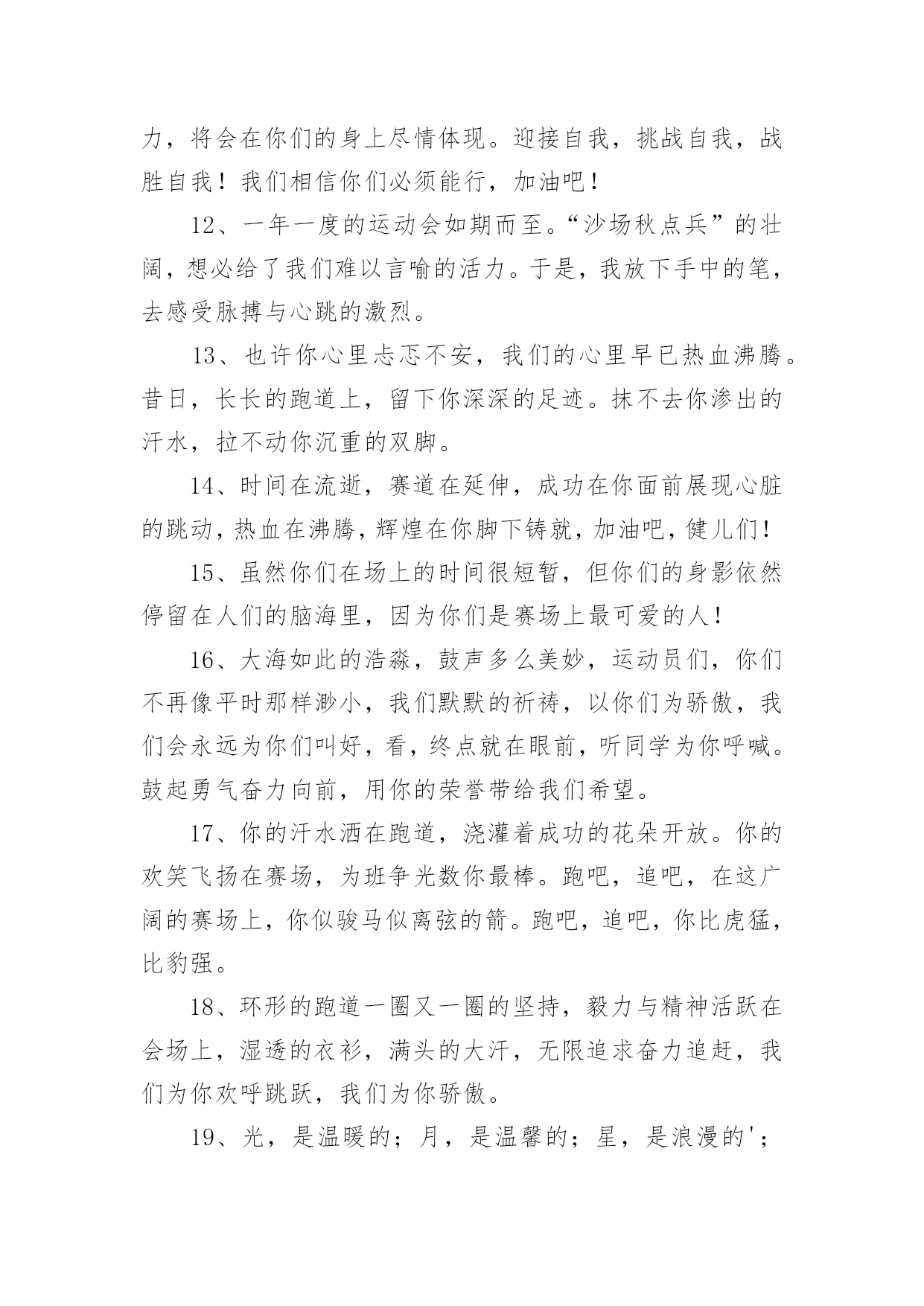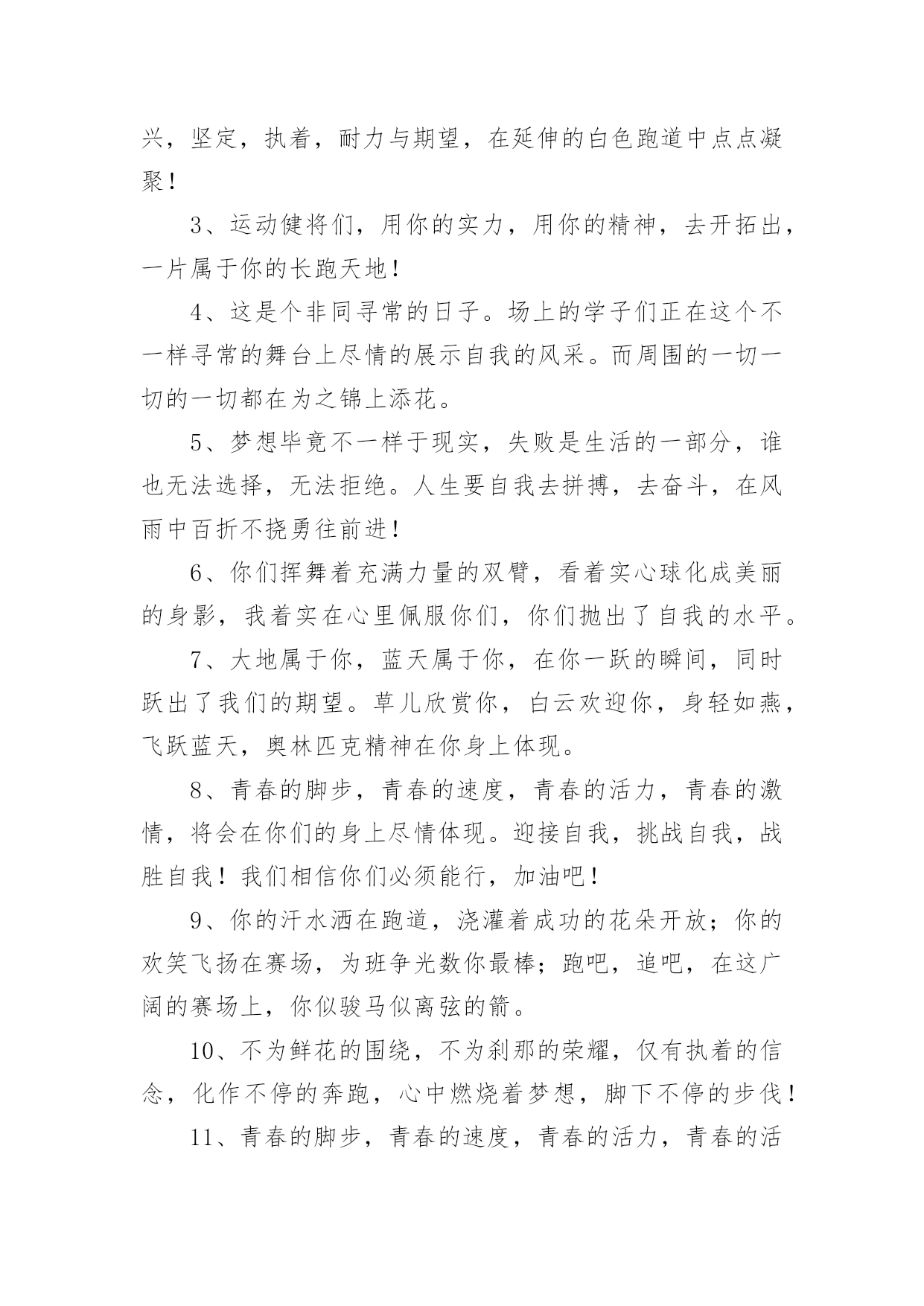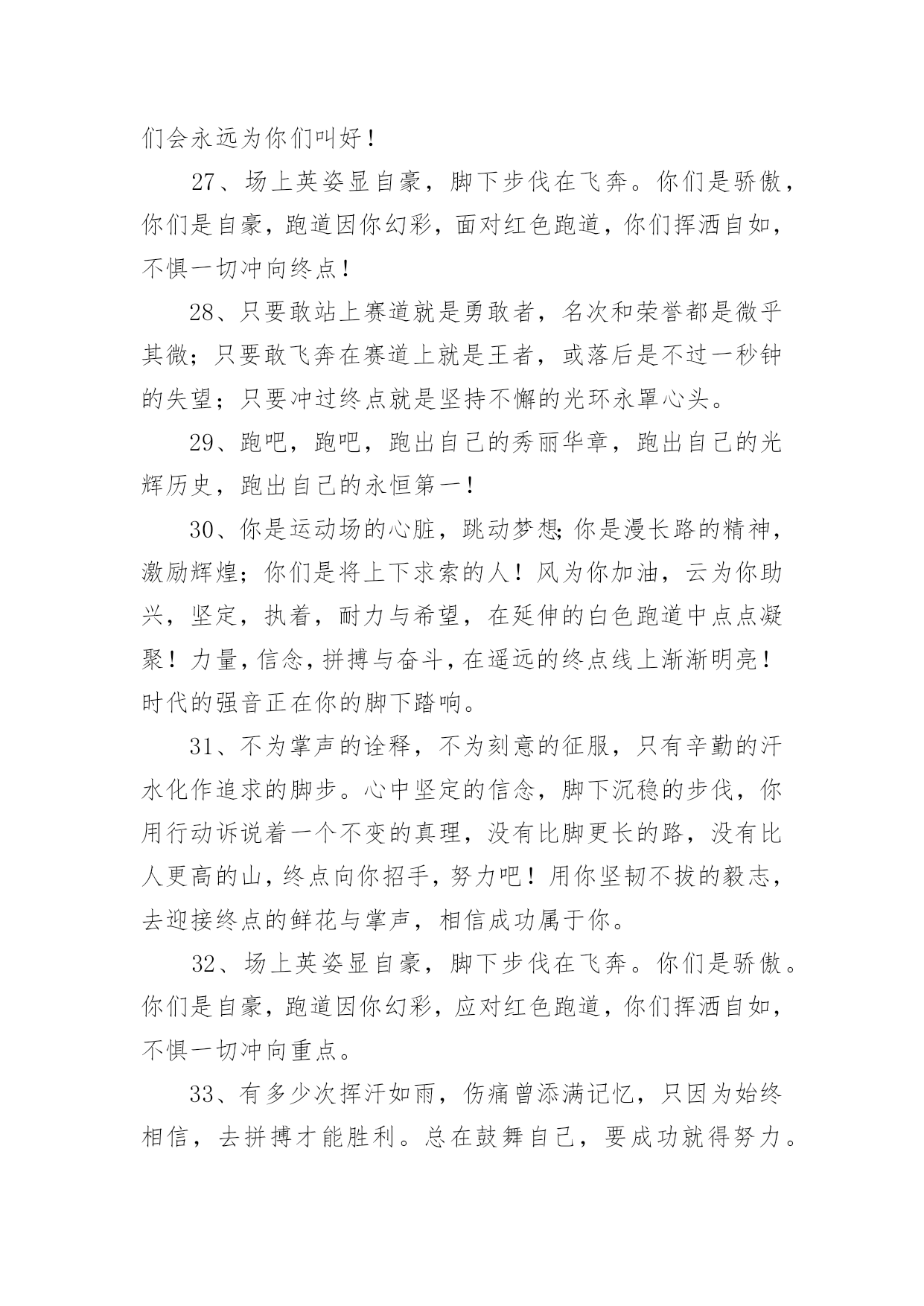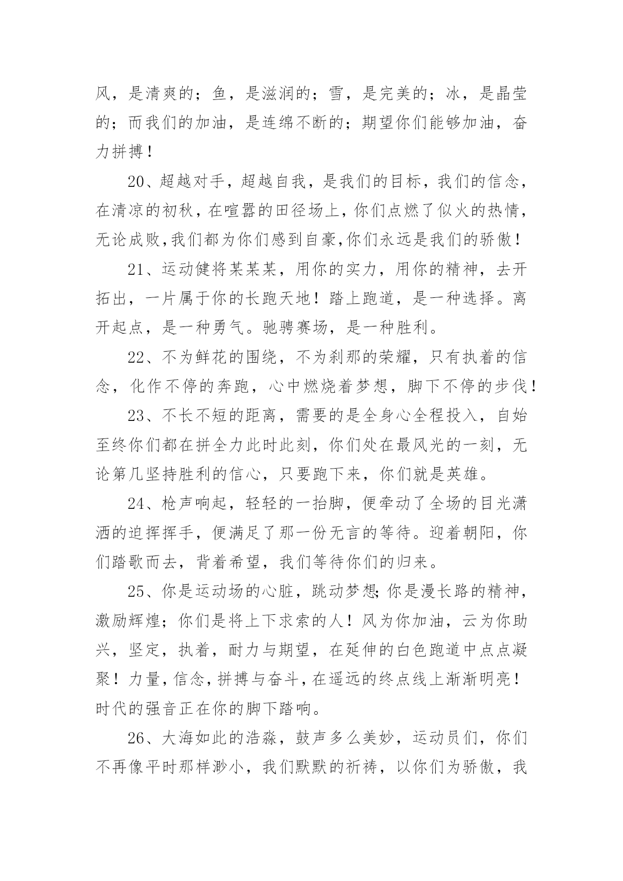 运动会加油稿运动会加油稿实用(15篇)在不断进步的时代,很多情况下我们需要用到加油稿,加油稿可以增添对方必胜的勇气和信心。那么,怎么去写加油稿呢?下面是小编精心整理的运动会加油稿,欢迎阅读与收藏。运动会加油稿1人生的路有坦途也有坎坷;走过的岁月有欢笑也有苦涩。泪水告诉我一个跌倒的故事。汗水使我多了一份沉重几多成熟。理想毕竟不一样于现实,失败是生活的`一部分谁也无法选取无法拒绝。人生要自我去拼搏去奋斗,在风雨中百屈不挠、勇往直前,在自我的每个驿站都留下一段无悔的回忆。流泪不是失落徘徊不是迷惑,成功属于那些战胜失败坚持不懈勇于追求梦想的人。白色的跑道是你运动的轨迹台上的呐喊是对你拼搏的肯定。这是耐力与意志的检验超载自我挑战自我是你的目标,当你体验过从他人身边攸勿而过时你将再次获得新的感悟,那是自我人生价值的体现更是为班级争夺荣誉的自豪拼搏吧!努力吧!运动健儿们胜利就在眼前是男儿我们不言放下。运动会加油稿21.年轻的我们自信飞扬,青春的气息如同出生的朝阳,蓬勃的力量如同阳光的挥洒。此时此刻,跑道便是我们精彩的舞台,声声加油便是我们最高的奖项!论何成功,谈何荣辱,心中的信念只有一个:拼搏!萧瑟的秋风,挡不住你们破竹的锐气。2.就像花儿准备了春秋冬,就是为了红透整个盛夏。就像雪花经历了春夏秋就是为了洁白整个严冬。蹲下,昂首,出发……轻轻的一抬脚,便牵动了全场的目光潇洒的迫挥挥手,便满足了那一份无言的等待。迎着朝阳,你们踏歌而去,背着期望,我们等待你们的归来。3.踏着春天的气息,迈着轻盈的'脚步,我们迎来了心仪已久的运动会。那里就是展示自我的舞台。我们向往高山的坚忍不拔,我们渴望大海的博大精深,还有,我们更痴迷于你们的速度激情。来吧,尽情释放你的活力。你的每一次冲刺,都叩动着我们的心弦;你的每一次跨越,都吸引着我们的视线;你的每一次起跳,都绷紧我们的神经。我们为你呐喊,我们为你自豪,我们为你疯狂。4.也许流星并不少见,但它燃烧的刹那,留给人间最美丽的回忆!也许笑脸并不少见,但胜利的喜悦,总会留给世界精彩的一瞬!是的,那些以前美妙的东西只有短短的一瞬间,但那却把最辉煌的一刻留给了人间。胜利,是每个人所追求的,胜利的喜悦,是胜利与重新开始的转折,胜利是新的开始!5.虽然你们在场上的时间很短暂,但你们的身影依然停留在人们的脑海里,因为你们是赛场上最可爱的人,不为掌声的注释,不为刻意的征服,不为失败的痛苦,只有辛勤的汗水化作成功的脚步。6.坚定,执着,耐力与期望,在延伸的白色跑道中点点凝聚!力量,信念,拼搏与奋斗,在遥远的终点线上渐渐明亮!时代的强音正在你的脚下踏响。运动会加油稿3运动员,当你驰骋在运动场上,你便征服了别人,你便征服了自己。站再那坚硬的起跑线前,也就是成就你梦想的时刻。是的,有很多梦是遥不可及的,但梦想是可以成真的。克雷洛夫有句名言:现实在此岸,理想在彼岸,中间隔着湍急的河流。努力行动则是架在川上的桥梁。要从现实的此岸,到达理想的`彼岸,重在努力,重在自信。贵在坚持,而这更应该是我们运动健儿的精神。雄鹰属于蓝天,激流属于大海,而我们的运动员则属于绿茵茵的草地。那是希望升起的地方,也将是胜利降临的舞台。自信的运动健儿们,当你们为梦想而拼搏,为胜利而流汗时,也在为我们xx中争光。运动会加油稿41、不要掉泪,不要屈服,哪怕胜利永远只是个未知数。跌倒了,不要放下,爬起来,继续努力前进!因为如果放下,虽不会再摔跤,可是——永远不会前进半步!2、你是运动场的心脏,跳动梦想;你是漫长路的精神,激励辉煌;你们是将上下求索的人!风为你加油,云为你助兴,坚定,执着,耐力与期望,在延伸的白色跑道中点点凝聚!3、运动健将们,用你的实力,用你的精神,去开拓出,一片属于你的长跑天地!4、这是个非同寻常的日子。场上的学子们正在这个不一样寻常的舞台上尽情的展示自我的风采。而周围的一切一切的一切都在为之锦上添花。5、梦想毕竟不一样于现实,失败是生活的一部分,谁也无法选择,无法拒绝。人生要自我去拼搏,去奋斗,在风雨中百折不挠勇往前进!6、你们挥舞着充满力量的双臂,看着实心球化成美丽的身影,我着实在心里佩服你们,你们抛出了自我的水平。7、大地属于你,蓝天属于你,在你一跃的瞬间,同时跃出了我们的期望。草儿欣赏你,白云欢迎你,身轻如燕,飞跃蓝天,奥林匹克精神在你身上体现。8、青春的脚步,青春的速度,青春的活力,青春的激情,将会在你们的身上尽情体现。迎接自我,挑战自我,战胜自我!我们相信你们必须能行,加油吧!9、你的汗水洒在跑道,浇灌着成功的花朵开放;你的欢笑飞扬在赛场,为班争光数你最棒;跑吧,追吧,在这广阔的赛场上,你似骏马似离弦的箭。10、不为鲜花的围绕,不为刹那的荣耀,仅有执着的信念,化作不停的奔跑,心中燃烧着梦想,脚下不停的步伐!11、青春的脚步,青春的速度,青