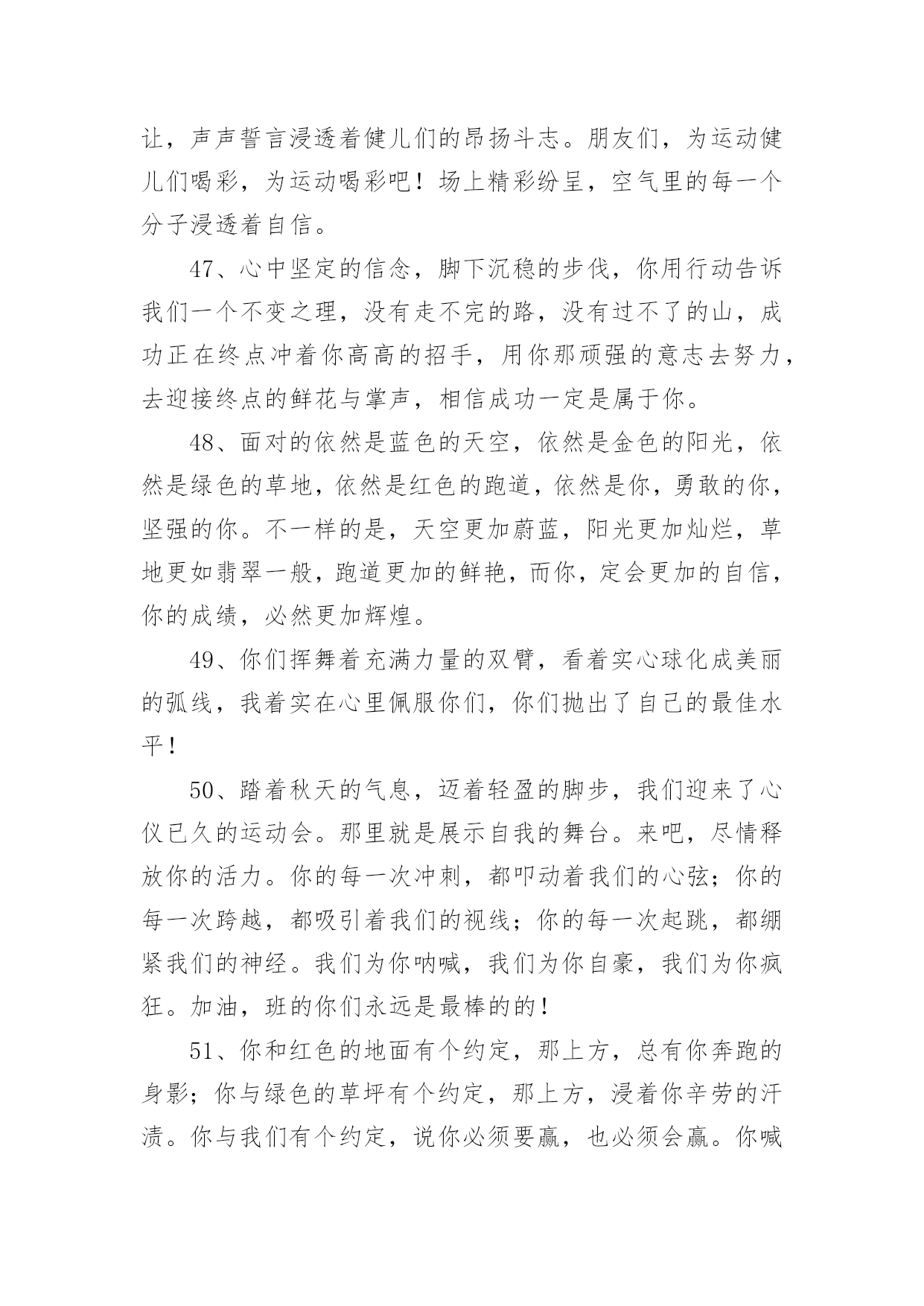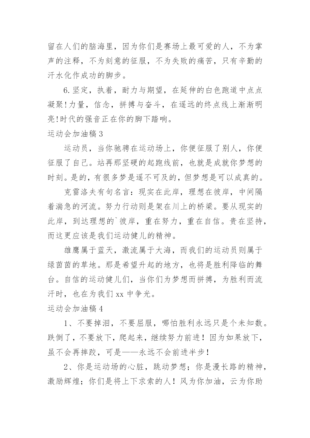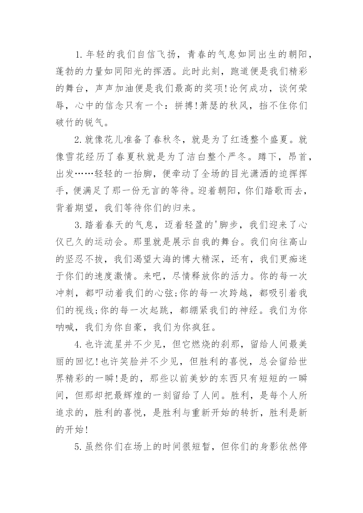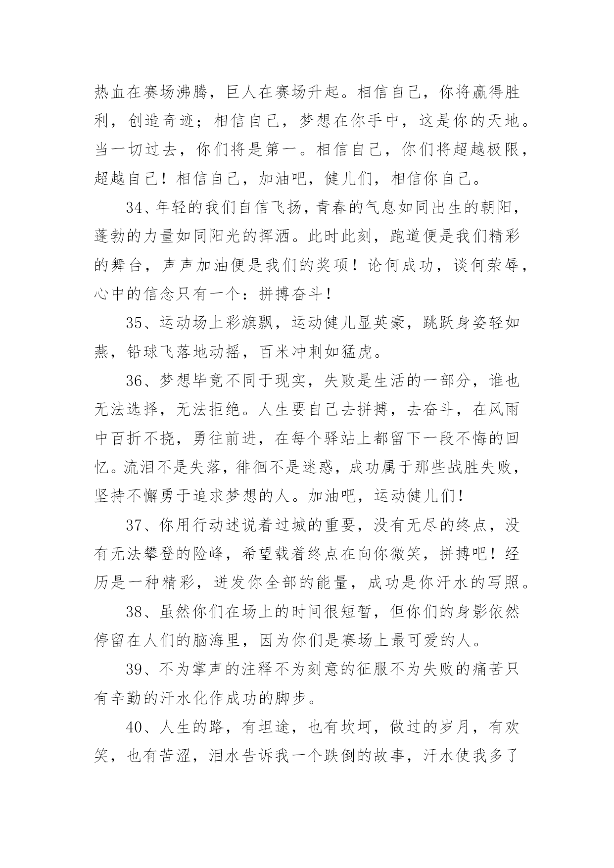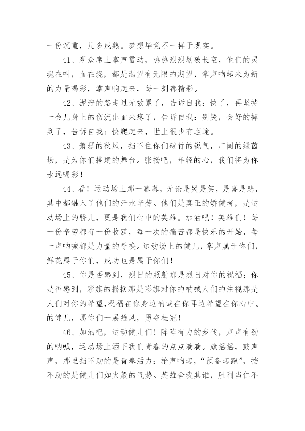 运动会加油稿运动会加油稿实用(15篇)在不断进步的时代,很多情况下我们需要用到加油稿,加油稿可以增添对方必胜的勇气和信心。那么,怎么去写加油稿呢?下面是小编精心整理的运动会加油稿,欢迎阅读与收藏。运动会加油稿1人生的路有坦途也有坎坷;走过的岁月有欢笑也有苦涩。泪水告诉我一个跌倒的故事。汗水使我多了一份沉重几多成熟。理想毕竟不一样于现实,失败是生活的`一部分谁也无法选取无法拒绝。人生要自我去拼搏去奋斗,在风雨中百屈不挠、勇往直前,在自我的每个驿站都留下一段无悔的回忆。流泪不是失落徘徊不是迷惑,成功属于那些战胜失败坚持不懈勇于追求梦想的人。白色的跑道是你运动的轨迹台上的呐喊是对你拼搏的肯定。这是耐力与意志的检验超载自我挑战自我是你的目标,当你体验过从他人身边攸勿而过时你将再次获得新的感悟,那是自我人生价值的体现更是为班级争夺荣誉的自豪拼搏吧!努力吧!运动健儿们胜利就在眼前是男儿我们不言放下。运动会加油稿21.年轻的我们自信飞扬,青春的气息如同出生的朝阳,蓬勃的力量如同阳光的挥洒。此时此刻,跑道便是我们精彩的舞台,声声加油便是我们最高的奖项!论何成功,谈何荣辱,心中的信念只有一个:拼搏!萧瑟的秋风,挡不住你们破竹的锐气。2.就像花儿准备了春秋冬,就是为了红透整个盛夏。就像雪花经历了春夏秋就是为了洁白整个严冬。蹲下,昂首,出发……轻轻的一抬脚,便牵动了全场的目光潇洒的迫挥挥手,便满足了那一份无言的等待。迎着朝阳,你们踏歌而去,背着期望,我们等待你们的归来。3.踏着春天的气息,迈着轻盈的'脚步,我们迎来了心仪已久的运动会。那里就是展示自我的舞台。我们向往高山的坚忍不拔,我们渴望大海的博大精深,还有,我们更痴迷于你们的速度激情。来吧,尽情释放你的活力。你的每一次冲刺,都叩动着我们的心弦;你的每一次跨越,都吸引着我们的视线;你的每一次起跳,都绷紧我们的神经。我们为你呐喊,我们为你自豪,我们为你疯狂。4.也许流星并不少见,但它燃烧的刹那,留给人间最美丽的回忆!也许笑脸并不少见,但胜利的喜悦,总会留给世界精彩的一瞬!是的,那些以前美妙的东西只有短短的一瞬间,但那却把最辉煌的一刻留给了人间。胜利,是每个人所追求的,胜利的喜悦,是胜利与重新开始的转折,胜利是新的开始!5.虽然你们在场上的时间很短暂,但你们的身影依然停留在人们的脑海里,因为你们是赛场上最可爱的人,不为掌声的注释,不为刻意的征服,不为失败的痛苦,只有辛勤的汗水化作成功的脚步。6.坚定,执着,耐力与期望,在延伸的白色跑道中点点凝聚!力量,信念,拼搏与奋斗,在遥远的终点线上渐渐明亮!时代的强音正在你的脚下踏响。运动会加油稿3运动员,当你驰骋在运动场上,你便征服了别人,你便征服了自己。站再那坚硬的起跑线前,也就是成就你梦想的时刻。是的,有很多梦是遥不可及的,但梦想是可以成真的。克雷洛夫有句名言:现实在此岸,理想在彼岸,中间隔着湍急的河流。努力行动则是架在川上的桥梁。要从现实的此岸,到达理想的`彼岸,重在努力,重在自信。贵在坚持,而这更应该是我们运动健儿的精神。雄鹰属于蓝天,激流属于大海,而我们的运动员则属于绿茵茵的草地。那是希望升起的地方,也将是胜利降临的舞台。自信的运动健儿们,当你们为梦想而拼搏,为胜利而流汗时,也在为我们xx中争光。运动会加油稿41、不要掉泪,不要屈服,哪怕胜利永远只是个未知数。跌倒了,不要放下,爬起来,继续努力前进!因为如果放下,虽不会再摔跤,可是——永远不会前进半步!2、你是运动场的心脏,跳动梦想;你是漫长路的精神,激励辉煌;你们是将上下求索的人!风为你加油,云为你助兴,坚定,执着,耐力与期望,在延伸的白色跑道中点点凝聚!3、运动健将们,用你的实力,用你的精神,去开拓出,一片属于你的长跑天地!4、这是个非同寻常的日子。场上的学子们正在这个不一样寻常的舞台上尽情的展示自我的风采。而周围的一切一切的一切都在为之锦上添花。5、梦想毕竟不一样于现实,失败是生活的一部分,谁也无法选择,无法拒绝。人生要自我去拼搏,去奋斗,在风雨中百折不挠勇往前进!6、你们挥舞着充满力量的双臂,看着实心球化成美丽的身影,我着实在心里佩服你们,你们抛出了自我的水平。7、大地属于你,蓝天属于你,在你一跃的瞬间,同时跃出了我们的期望。草儿欣赏你,白云欢迎你,身轻如燕,飞跃蓝天,奥林匹克精神在你身上体现。8、青春的脚步,青春的速度,青春的活力,青春的激情,将会在你们的身上尽情体现。迎接自我,挑战自我,战胜自我!我们相信你们必须能行,加油吧!9、你的汗水洒在跑道,浇灌着成功的花朵开放;你的欢笑飞扬在赛场,为班争光数你最棒;跑吧,追吧,在这广阔的赛场上,你似骏马似离弦的箭。10、不为鲜花的围绕,不为刹那的荣耀,仅有执着的信念,化作不停的奔跑,心中燃烧着梦想,脚下不停的步伐!11、青春的脚步,青春的速度,青