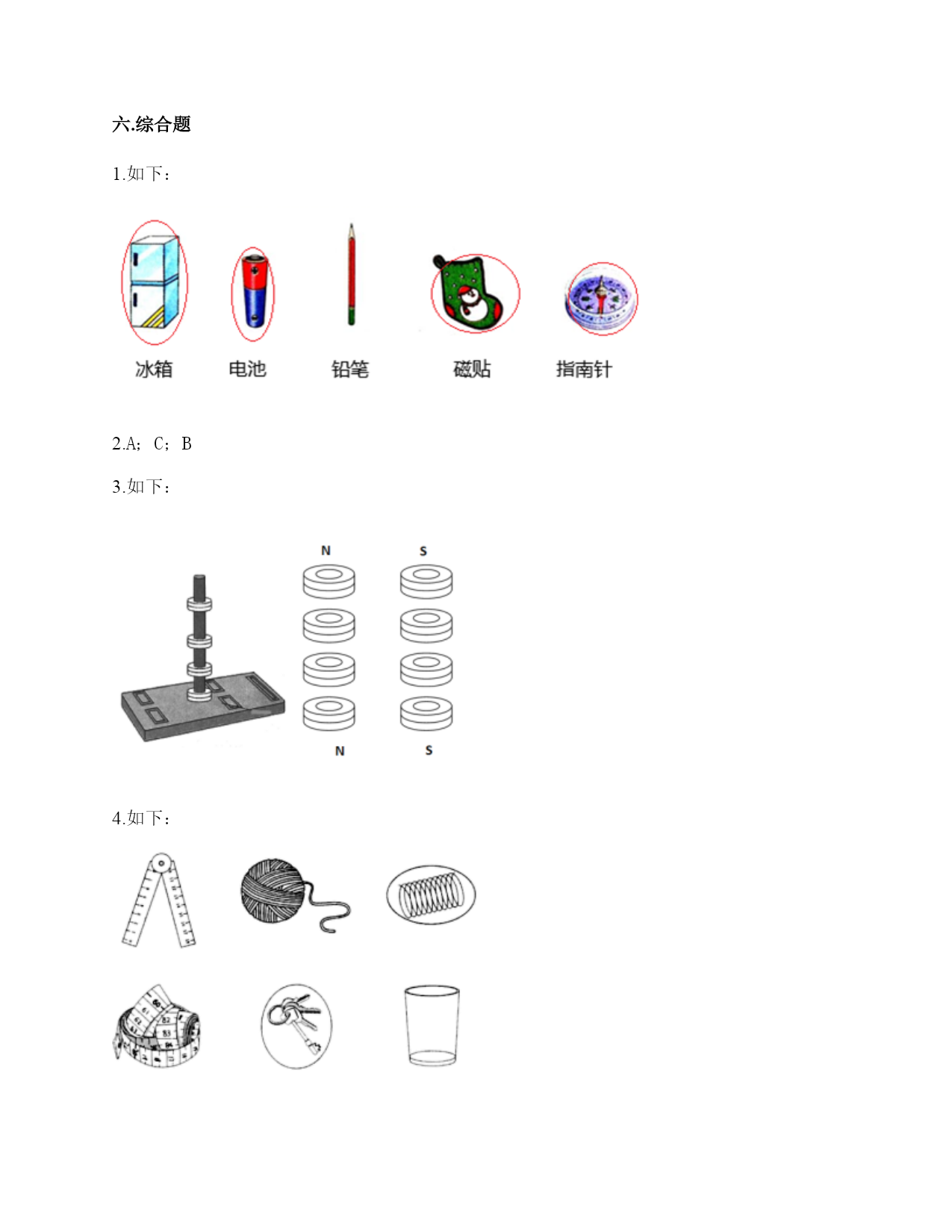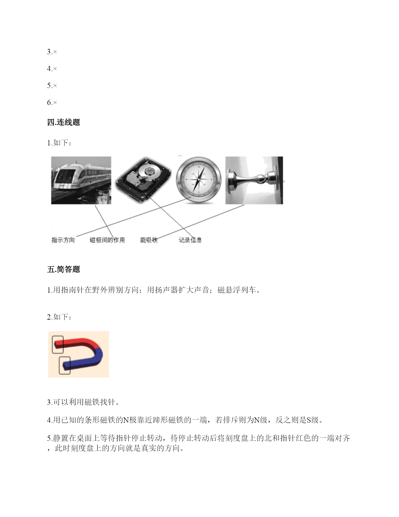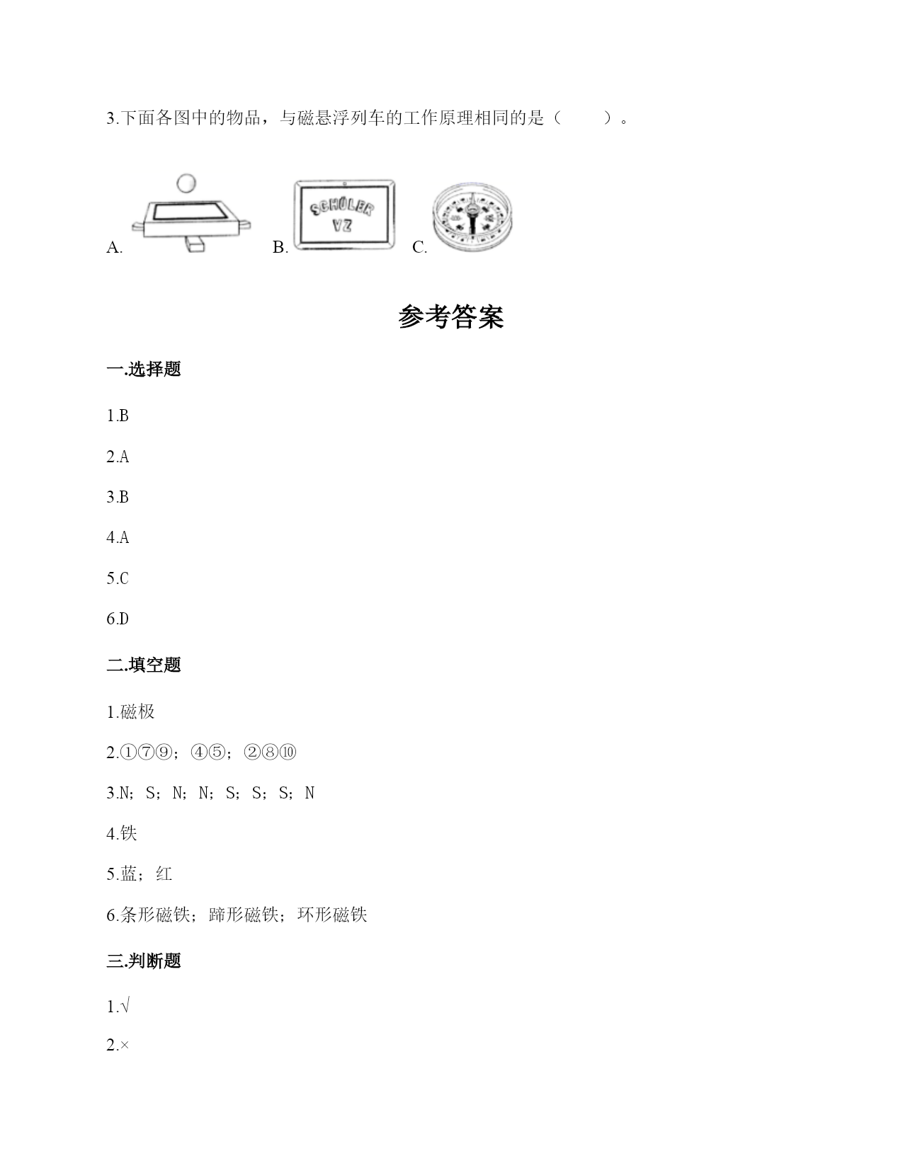 小学科学《磁铁》练习题一.选择题(共6题,共12分)1.两根用白纸包裹的磁铁按下图位置摆放,它们之间的作用是相互排斥。已知A端的磁极是N极,那么D端的磁极是()。A.南极B.北极C.东极2.指南针的外壳所用的材质不可能是()。A.铁B.铜C.塑料3.一块磁铁有()磁极。A.没有B.2个C.不同的磁铁不一样4.冰箱门里安装磁铁,起的作用是()。A.既可以吸住又方便开关B.牢牢吸住C.防止食物变质5.把一块条形磁铁悬挂在空中使它能自由转动等磁铁静止时我们发现——磁极的两端分别指向()。A.东、西B.东、南C.南、北D.东、北6.如图的条形磁铁磁力最强的部分是()。A.A和BB.B和CC.C和DD.A和D二.填空题(共6题,共36分)1.磁铁的磁力最大的地方叫作(),每个磁铁都有两处这种地方。2.分一分,将序号填在相应的磁铁功能横线上。①硬盘②冰箱贴③瓷勺④耳机⑤扬声器⑥钢针⑦磁带⑧磁悬浮列车⑨磁条卡⑩门吸记录信息:()振动发声:()相互作用:()3.我们用条形磁铁的一块磁极靠近另一块条形磁铁的磁极,有4种情况,即用()极去靠近()极、用()极去靠近()极、用()极去靠近()极、用()极去靠近()极。4.磁铁能隔着一些物体不太厚的物体也能吸()。5.磁铁的()色部分指向南方,()色部分指向北方。6.磁铁的形状有()、()、()等。三.判断题(共6题,共12分)1.悬浮地球仪利用了相同磁极相互排斥的原理。()2.将两块条形磁铁放在一起,它们之间的作用力有四种情况。()3.把两个完全相同的磁铁吸在一起,磁力会增大一些,但不是成倍增长。如果把多个完全相同的磁铁吸在一起,磁力会增大,但是每次增长的磁力会随磁铁个数的增加而变小。()4.在判断条形磁铁能否指示方向的实验中,我们只做一次实验就可以了。()5.无论距离多远,磁铁都可以吸引铁制小车。()6.用磁铁的磁极在钢针上来回摩擦数次,就能够使原本没有磁性的钢针带有磁性。()四.连线题(共1题,共4分)1.把下列事物和应用磁铁的原理用线连起来。五.简答题(共5题,共25分)1.写出三个磁铁在生活中应用的实例。2.在蹄形磁铁上用“○”标出磁极。3.奶奶缝衣服时,不小心把针掉到地上了,你打算用什么办法帮奶奶找针?4.如何判断蹄形磁铁的磁极?5.如何使用指南针辨认方向?六.综合题(共5题,共27分)1.下列哪些物体含有磁铁?把含有磁铁的物体圈出来。2.小明的爸爸是个户外运动爱好者,家里有很多户外运动装备,小明在爸爸的登山包的金属挂扣上发现了指南针。如下图所示,请你仔细观察图片,回答相关问题。使用这个指南针时,应该将挂扣()。A.平着放B.立着放C.倾斜放这种挂扣的材质不可能是()。A.铜B.塑料C.铁小明在指南针的方位盘上发现了N,这个方向是()。A.东B.北C.南3.用磁铁学具盒中的环形磁铁设计一个悬浮塔,有两种摆放方式。请在下面右图中用字母标出这两种摆法的磁极。4.圈出图中能被磁铁吸引的物体。5.磁悬浮列车由于其轨道的磁力使之悬浮在轨道上,行使时不需接触地面,因此只受来自空气的阻力。磁悬浮列车的最高速度可达每小时603公里。1.磁悬浮列车是利用()实现悬浮的。A.磁极间的相互作用B.空气浮力C.空气阻力2.萌萌用两块环形磁铁模拟磁悬浮列车的工作原理,通过图片我们可以判断,磁悬浮列车的工作原理与()相同。图1图2A.图1B.图2C.图1和图2都不3.下面各图中的物品,与磁悬浮列车的工作原理相同的是()。A.B.C.参考答案一.选择题1.B2.A3.B4.A5.C6.D二.填空题1.磁极2.①⑦⑨;④⑤;②⑧⑩3.N;S;N;N;S;S;S;N4.铁5.蓝;红6.条形磁铁;蹄形磁铁;环形磁铁三.判断题1.√2.×3.×4.×5.×6.×四.连线题1.如下:五.简答题1.用指南针在野外辨别方向;用扬声器扩大声音;磁悬浮列车。2.如下:3.可以利用磁铁找针。4.用已知的条形磁铁的N极靠近蹄形磁铁的一端,若排斥则为N级,反之则是S级。5.静置在桌面上等待指针停止转动,待停止转动后将刻度盘上的北和指针红色的一端对齐,此时刻度盘上的方向就是真实的方向。六.综合题1.如下:2.A;C;B3.如下:4.如下:5.A;B;A