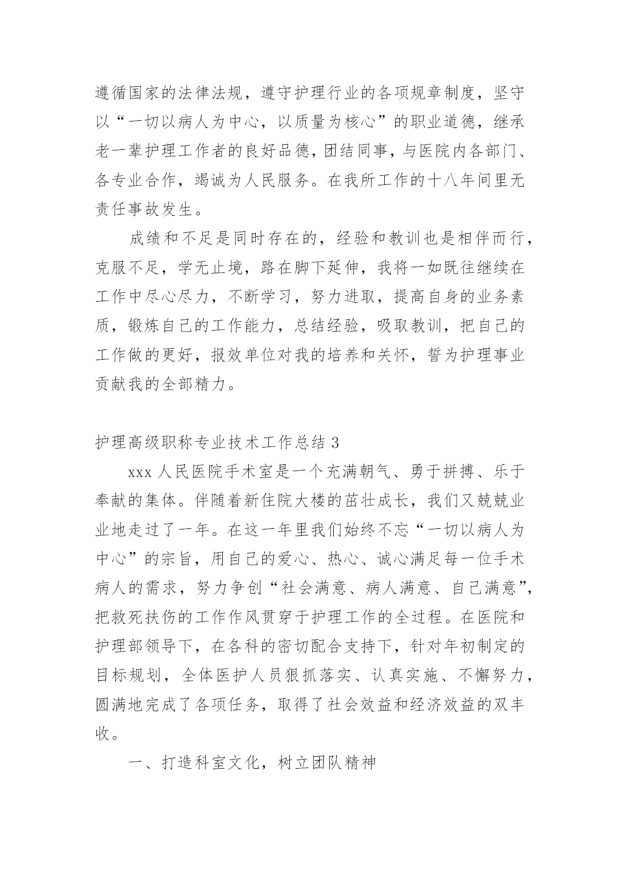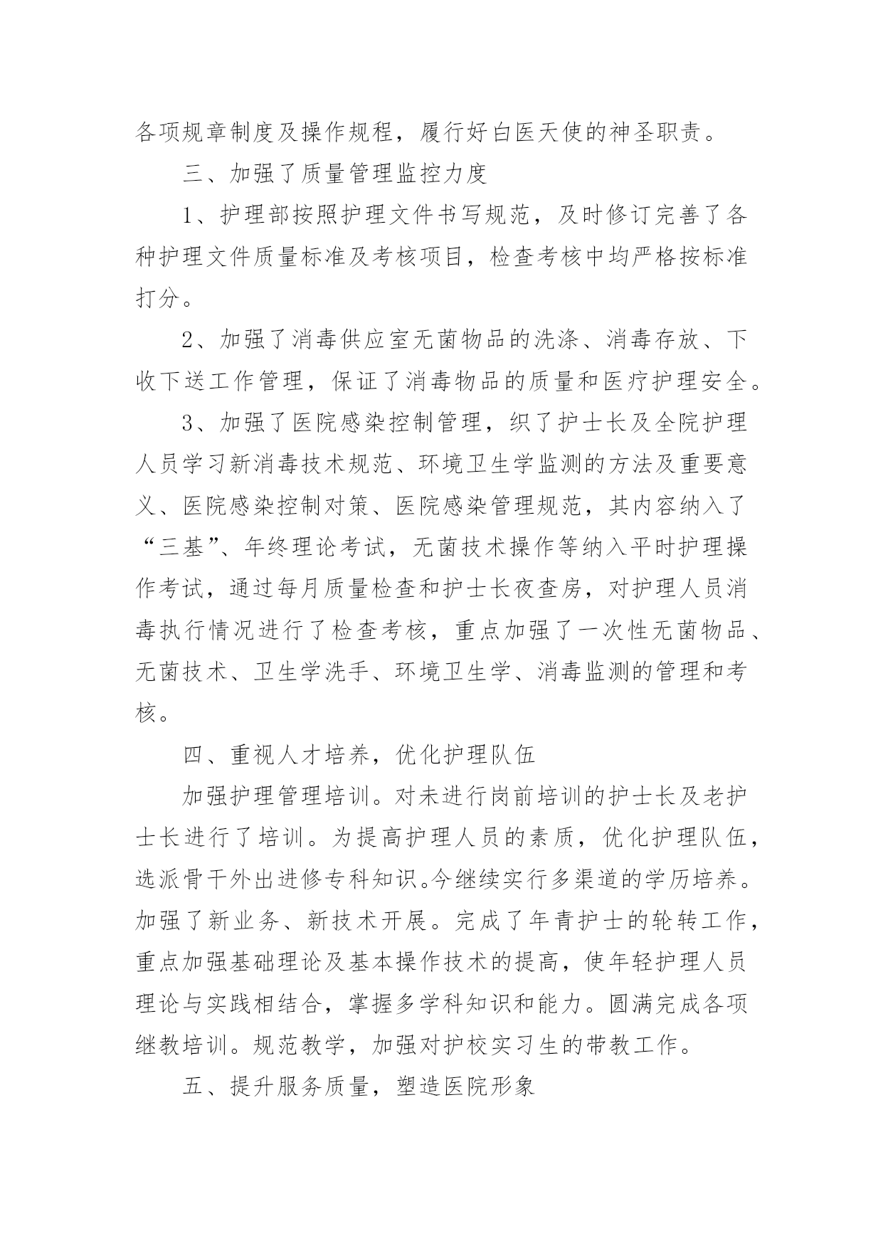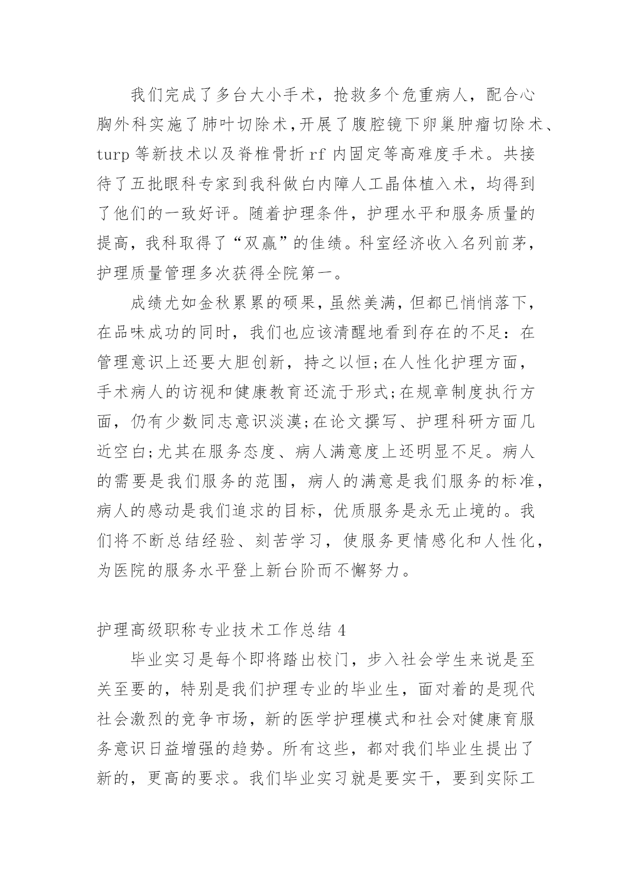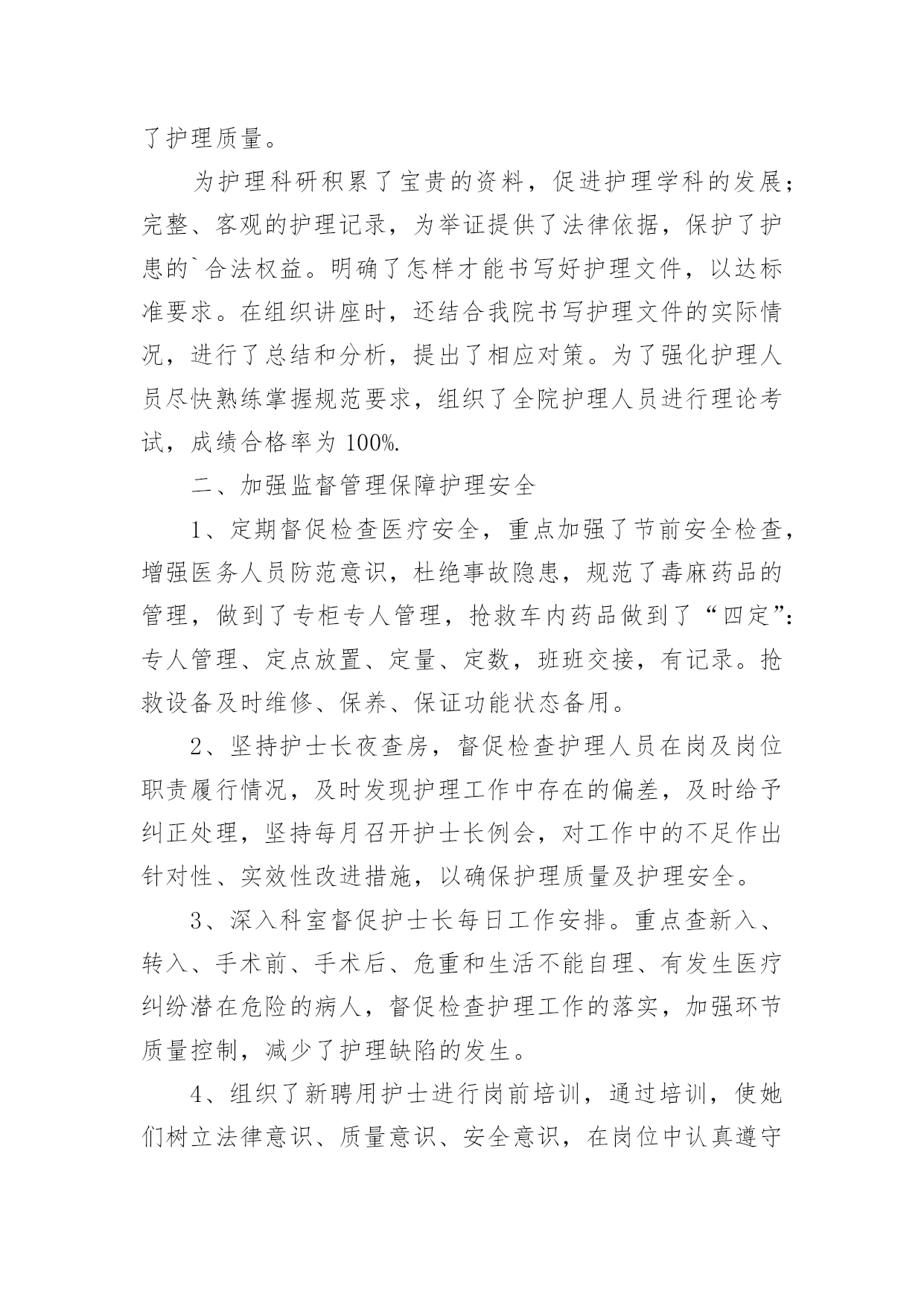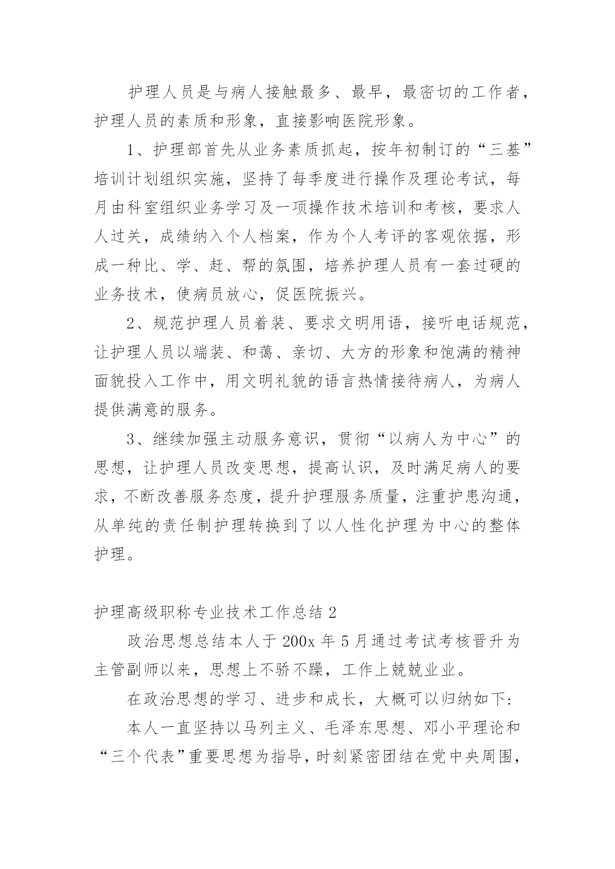 护理高级职称专业技术工作总结总结是指社会团体、企业单位和个人在自身的某一时期、某一项目或某些工作告一段落或者全部完成后进行回顾检查、分析评价,从而肯定成绩,得到经验,找出差距,得出教训和一些规律性认识的一种书面材料,它能够使头脑更加清醒,目标更加明确,让我们来为自己写一份总结吧。总结怎么写才是正确的呢?以下是小编收集整理的护理高级职称专业技术工作总结,仅供参考,大家一起来看看吧。护理高级职称专业技术工作总结1随着人事制度的进一步深化,护理部在医院领导的带领和支持下,重点规范了护理文件书写,提高了护理人员法制观念;加强监督管理,保障了护理安全;加大了护理质量监控力度;重视护理骨干的培养,优化了护理队伍,提升了护理服务质量。全院护理服务质量稳中有升,病人满意度高。现将一年来临床护理部工作总结如下:一、规范护理文件书写,强化护理法制意识随着人们法律意识的提高,新医疗事故处理条例的颁布,如何在护理服务中加强法制建设,提高护理人员法制意识,已成为护理管理的一个重要环节。护理部于今年严格按照相关要求,制定了医院护理文件书写实施细则,采取集中讲座、分病区学习等形式进行培训,使护理人员更加明确了护理文件书写的意义,规范了护士的行为,保障了护理安全,提高了护理质量。为护理科研积累了宝贵的资料,促进护理学科的发展;完整、客观的护理记录,为举证提供了法律依据,保护了护患的`合法权益。明确了怎样才能书写好护理文件,以达标准要求。在组织讲座时,还结合我院书写护理文件的实际情况,进行了总结和分析,提出了相应对策。为了强化护理人员尽快熟练掌握规范要求,组织了全院护理人员进行理论考试,成绩合格率为100%.二、加强监督管理保障护理安全1、定期督促检查医疗安全,重点加强了节前安全检查,增强医务人员防范意识,杜绝事故隐患,规范了毒麻药品的管理,做到了专柜专人管理,抢救车内药品做到了“四定”:专人管理、定点放置、定量、定数,班班交接,有记录。抢救设备及时维修、保养、保证功能状态备用。2、坚持护士长夜查房,督促检查护理人员在岗及岗位职责履行情况,及时发现护理工作中存在的偏差,及时给予纠正处理,坚持每月召开护士长例会,对工作中的不足作出针对性、实效性改进措施,以确保护理质量及护理安全。3、深入科室督促护士长每日工作安排。重点查新入、转入、手术前、手术后、危重和生活不能自理、有发生医疗纠纷潜在危险的病人,督促检查护理工作的落实,加强环节质量控制,减少了护理缺陷的发生。4、组织了新聘用护士进行岗前培训,通过培训,使她们树立法律意识、质量意识、安全意识,在岗位中认真遵守各项规章制度及操作规程,履行好白医天使的神圣职责。三、加强了质量管理监控力度1、护理部按照护理文件书写规范,及时修订完善了各种护理文件质量标准及考核项目,检查考核中均严格按标准打分。2、加强了消毒供应室无菌物品的洗涤、消毒存放、下收下送工作管理,保证了消毒物品的质量和医疗护理安全。3、加强了医院感染控制管理,织了护士长及全院护理人员学习新消毒技术规范、环境卫生学监测的方法及重要意义、医院感染控制对策、医院感染管理规范,其内容纳入了“三基”、年终理论考试,无菌技术操作等纳入平时护理操作考试,通过每月质量检查和护士长夜查房,对护理人员消毒执行情况进行了检查考核,重点加强了一次性无菌物品、无菌技术、卫生学洗手、环境卫生学、消毒监测的管理和考核。四、重视人才培养,优化护理队伍加强护理管理培训。对未进行岗前培训的护士长及老护士长进行了培训。为提高护理人员的素质,优化护理队伍,选派骨干外出进修专科知识。今继续实行多渠道的学历培养。加强了新业务、新技术开展。完成了年青护士的轮转工作,重点加强基础理论及基本操作技术的提高,使年轻护理人员理论与实践相结合,掌握多学科知识和能力。圆满完成各项继教培训。规范教学,加强对护校实习生的带教工作。五、提升服务质量,塑造医院形象护理人员是与病人接触最多、最早,最密切的工作者,护理人员的素质和形象,直接影响医院形象。1、护理部首先从业务素质抓起,按年初制订的“三基”培训计划组织实施,坚持了每季度进行操作及理论考试,每月由科室组织业务学习及一项操作技术培训和考核,要求人人过关,成绩纳入个人档案,作为个人考评的客观依据,形成一种比、学、赶、帮的氛围,培养护理人员有一套过硬的业务技术,使病员放心,促医院振兴。2、规范护理人员着装、要求文明用语,接听电话规范,让护理人员以端装、和蔼、亲切、大方的形象和饱满的精神面貌投入工作中,用文明礼貌的语言热情接待病人,为病人提供满意的服务。3、继续加强主动服务意识,贯彻“以病人为中心”的思想,让护理人员改变思想,提高认识,及时满足病人的要求,不断改善服务态度,提升护理服务质量,注重护患沟通,从单纯的责任制护理转换到了以人性化护理为中心的整体护理。护理高级职称