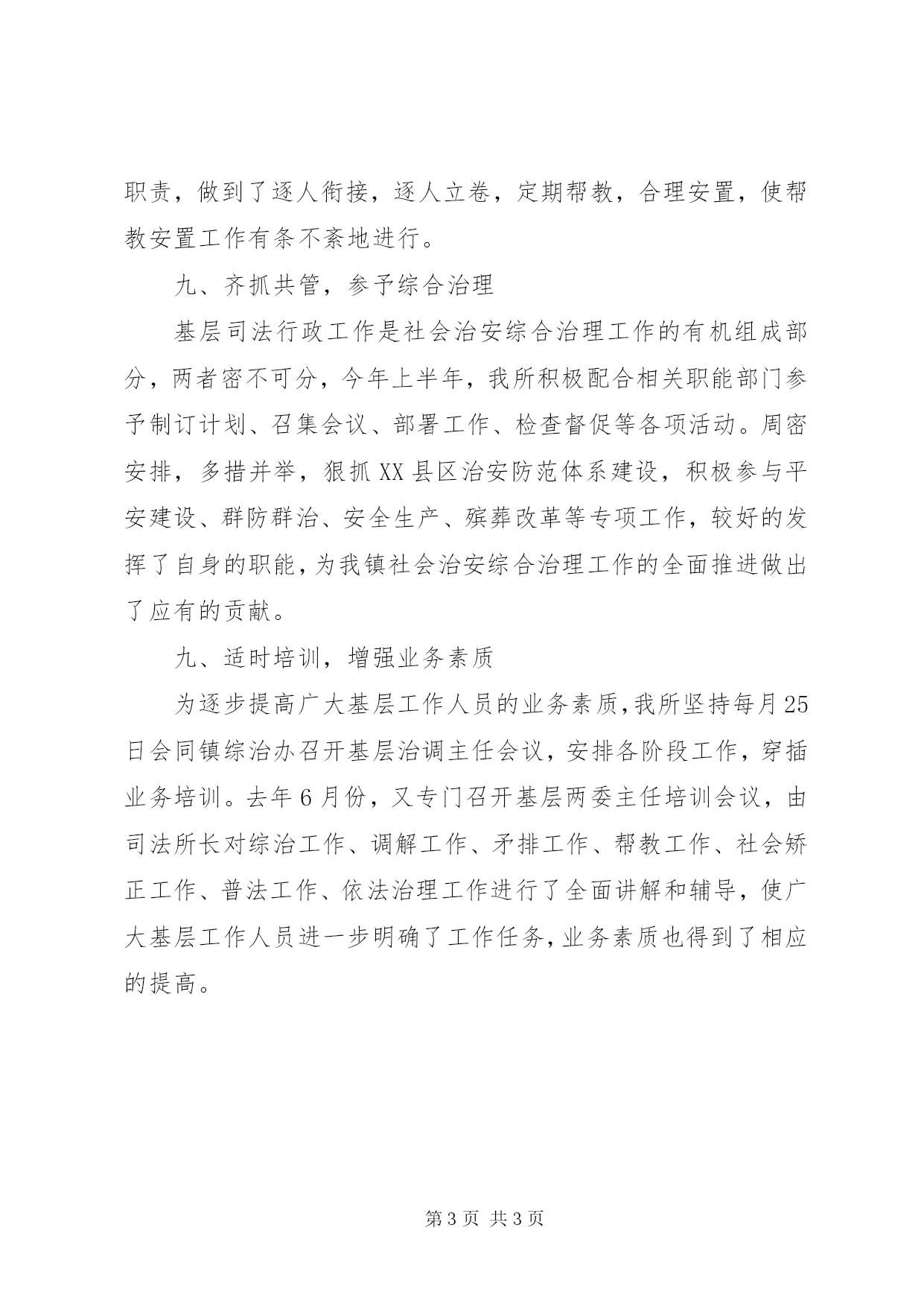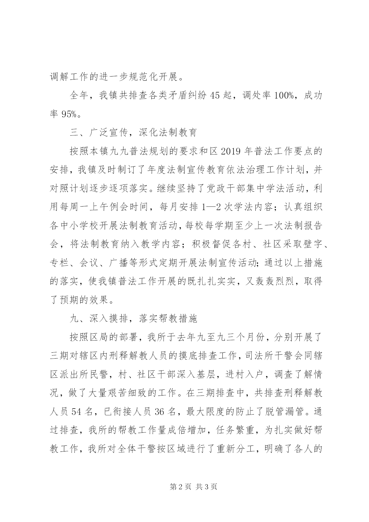 第PAGE\*Arabic\*MERGEFORMAT3页共NUMPAGES\*MERGEFORMAT3页乡镇XX年司法所工作总结2019年,**镇司法所在区司法局和镇党委、政府的领导下,按照上级的各阶段工作部署,精心组织,周密安排,强化措施,全面落实,不断加强创新力度,不断拓展业务范围,各项业务工作均取得可喜成绩。现将上半年工作开展情况如下:一、完善资料,规范档案管理我所今年上半年狠抓了业务资料的规范化建设,专门调整了业务档案柜,重新购置了高规格档案盒,全部更新了统一的档案标签,将司法行政、人民调解、矛盾排查、安置帮教、普法宣传、综合治理、日常工作各类文件、资料、台帐、记录、卷宗分门别类,整理归档。做到了存放齐全,管理有序,格式统一,登记规范,档案管理工作基本上达到了规范化、经常化的要求。二、定期排查,促进调解工作按照矛排工作“排查得早,发现得早,控制得住,解决得好”的工作要求,**镇司法所坚持每月25日召开一次基层矛排信息员会议,对基层各类矛盾纠纷进行摸底排查,对排查出的问题,明确专人,限时调处。通过各阶段排查,全面掌握和有效调处辖区内存在的各种矛盾纠纷和不稳定因素,着力解决影响社会稳定的热点、难点问题,真正将各类矛盾纠纷解决在基层,消灭在萌芽状态。同时,在今年上半年,我所还积极开展了基层矛排工作站的组建和“九统一”调委会的检查验收工作,促进了基层人民调解工作的进一步规范化开展。全年,我镇共排查各类矛盾纠纷45起,调处率100%,成功率95%。三、广泛宣传,深化法制教育按照本镇九九普法规划的要求和区2019年普法工作要点的安排,我镇及时制订了年度法制宣传教育依法治理工作计划,并对照计划逐步逐项落实。继续坚持了党政干部集中学法活动,利用每周一上午例会时间,每月安排1—2次学法内容;认真组织各中小学校开展法制教育活动,每校每学期至少上一次法制报告会,将法制教育纳入教学内容;积极督促各村、社区采取壁字、专栏、会议、广播等形式定期开展法制宣传活动;通过以上措施的落实,使我镇普法工作开展的既扎扎实实,又轰轰烈烈,取得了预期的效果。九、深入摸排,落实帮教措施按照区局的部署,我所于去年九至九三个月份,分别开展了三期对辖区内刑释解教人员的摸底排查工作,司法所干警会同辖区派出所民警,村、社区干部深入基层,进村入户,调查了解情况,做了大量艰苦细致的工作。在三期排查中,共排查刑释解教人员54名,已衔接人员36名,最大限度的防止了脱管漏管。通过排查,我所的帮教工作量成倍增加,任务繁重,为扎实做好帮教工作,我所对全体干警按区域进行了重新分工,明确了各人的职责,做到了逐人衔接,逐人立卷,定期帮教,合理安置,使帮教安置工作有条不紊地进行。九、齐抓共管,参予综合治理基层司法行政工作是社会治安综合治理工作的有机组成部分,两者密不可分,今年上半年,我所积极配合相关职能部门参予制订计划、召集会议、部署工作、检查督促等各项活动。周密安排,多措并举,狠抓XX县区治安防范体系建设,积极参与平安建设、群防群治、安全生产、殡葬改革等专项工作,较好的发挥了自身的职能,为我镇社会治安综合治理工作的全面推进做出了应有的贡献。九、适时培训,增强业务素质为逐步提高广大基层工作人员的业务素质,我所坚持每月25日会同镇综治办召开基层治调主任会议,安排各阶段工作,穿插业务培训。去年6月份,又专门召开基层两委主任培训会议,由司法所长对综治工作、调解工作、矛排工作、帮教工作、社会矫正工作、普法工作、依法治理工作进行了全面讲解和辅导,使广大基层工作人员进一步明确了工作任务,业务素质也得到了相应的提高。