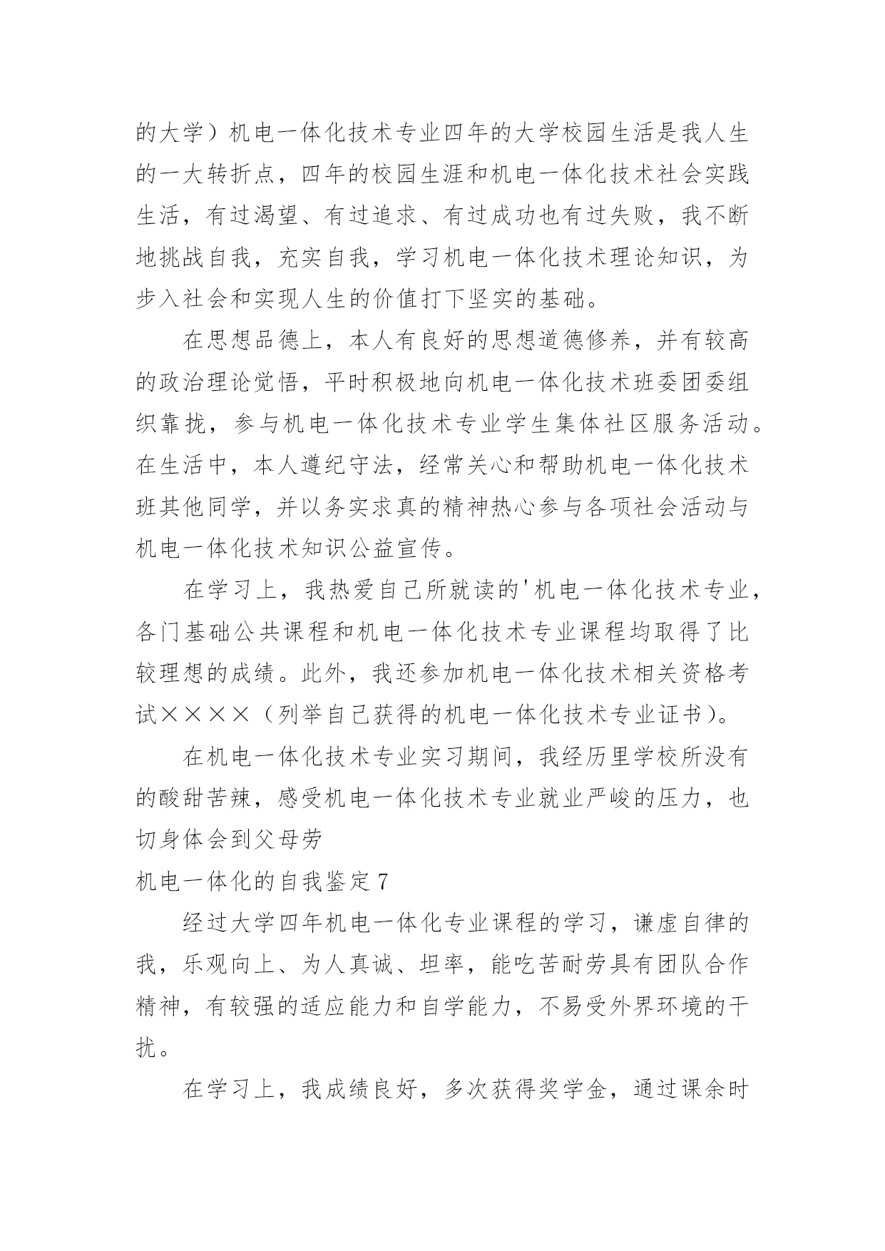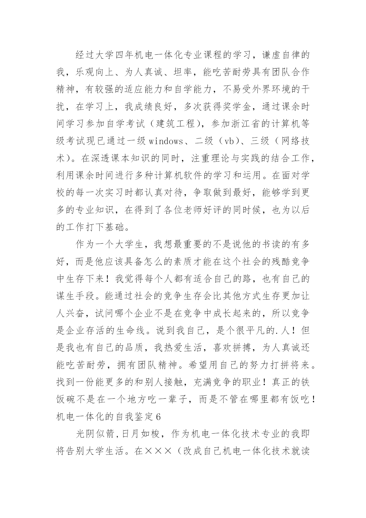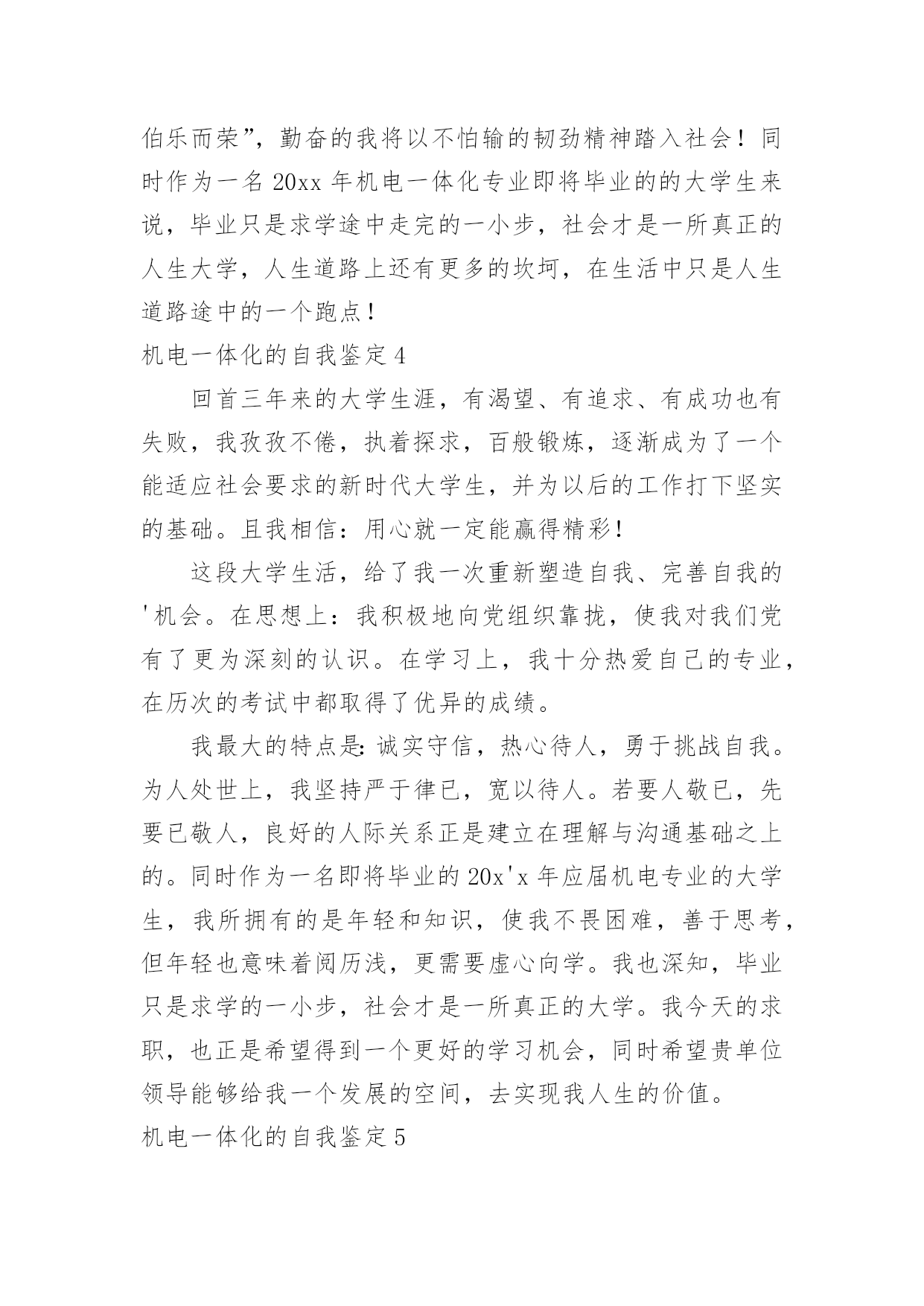 机电一体化的自我鉴定机电一体化的自我鉴定自我鉴定是对自己过去某一阶段的学习或工作进行分析,并作出相应的总结,它可以帮助我们有寻找学习和工作中的规律,因此好好准备一份自我鉴定吧。自我鉴定怎么写才不会流于形式呢?以下是小编整理的机电一体化的自我鉴定,仅供参考,大家一起来看看吧。机电一体化的自我鉴定1三年大学学习,使我自身的各方面能力以及交际能力等都有了质的飞跃;让我懂得了除学习以外的个人处事能力的重要性和交际能力的必要性。在校期间,我虚心求学、刻苦认真、吃苦耐劳,工作兢兢业业,及时总结;注重理论联系实际,培养自己的自学能力以及分析、解决问题的能力。在丰富多彩的大学生活中,为了扩大知识面和培养自己的业余爱好;积极参加校内外的实践活动,重视团队合作精神;作为系学生会干部的我,有较强的组织、宣传、管理和应变能力;有高度的责任心和良好的人际关系。在出色地完成上级交予的'任务外,还在校内组织和开展一些有意义的活动中,能有力地组织同学及调动同学们的积极性,从中也锻炼和提高了自己的组织和领导能力。表现出较强的与人密切合作的能力和良好的环境适应能力;并且深受同学们和老师以及领导的认可。除此之外,课余时间我经常利用网络带来的便利,关注最新科学技术动态;尤其是有关本专业的知识。使自己始终紧跟世界最新发展潮流和时代的步伐。因此我学习熟练掌握windows、office等软件的操作和安装系统,熟悉网页设计;一直以“一专多能,全面发展”来严格要求自己,勤奋拼搏、刻苦好学。踏实并系统地学习所开的课程知识,并取得了优异成绩。三年的在校生活只是我人生路上的一小段,如今我有信心接受任何新的挑战和考验。我想在以后的人生生活中,这几年的知识沉淀一定会使我受益非浅,我会一如既往地努力!机电一体化的自我鉴定2回首三年来的大学生涯,有渴望、有追求、有成功也有失败,我孜孜不倦,执着探求,百般锻炼,逐渐成为了一个能适应社会要求的新时代大学生,并为以后的工作打下坚实的基础。且我相信:用心就一定能赢得精彩!这段大学生活,给了我一次重新塑造自我、完善自我的机会.在思想上:我积极地向党组织靠拢,使我对我们党有了更为深刻的认识。在学习上,我十分热爱自己的专业,在历次的考试中都取得了优异的成绩。我最大的特点是:诚实守信,热心待人,勇于挑战自我。为人处世上,我坚持严于律已,宽以待人.若要人敬已,先要已敬人,良好的人际关系正是建立在理解与沟通基础之上的。同时作为一名即将毕业的XX年应届机电专业的大学生,我所拥有的是年轻和知识,使我不畏困难,善于思考,但年轻也意味着阅历浅,更需要虚心向学。我也深知,毕业只是求学的一小步,社会才是一所真正的'大学。我今天的求职,也正是希望得到一个更好的学习机会,同时希望贵单位领导能够给我一个发展的空间,去实现我人生的价值。机电一体化的自我鉴定3回首三年来的大学生涯,有渴望、有追求、有成功也有失败,我孜孜不倦,执着探求,百般锻炼,逐渐成为了一个能适应社会要求的新时代大学生,并为以后的工作打下坚实的基础。且我相信:用心就一定能赢得精彩!这段大学生活,给了我一次重新塑造自我、完善自我的机会.在思想上:我积极地向党组织靠拢,使我对我们党有了更为深刻的认识。在学习上,我十分热爱自己的专业,在历次的考试中都取得了优异的成绩。我最大的特点是:诚实守信,热心待人,勇于挑战自我。为人处世上,我坚持严于律已,宽以待人.若要人敬已,先要已敬人,良好的人际关系正是建立在理解与沟通基础之上的。同时作为一名即将毕业的12年机电专业的大学生,我所拥有的是年轻和知识,使我不畏困难,善于思考,但年轻也意味着阅历浅,更需要虚心向学。我也深知,只是求学的一小步,社会才是一所真正的大学。我现在的实习工作,也正是希望得到一个更好的学习机会,同时希望单位领导能够给我一个发展的空间,去实现我人生的价值。三年的大学生活,使自己的知识水平、思想境界、工作能力等方面都迈上了一个新的台阶。在这即将挥手告别美好大学生活,踏上社会征途的时候,我整军待发,将以饱满的热情、坚定的信心、高度的责任感投入到新的生活环境中,去迎接新的挑战,攀登新的高峰。我对自己的专业无比地热爱,在光辉灿烂的大学三年岁月里,有成功也有失败,有喜有悲。我在老师的教导下通过自身刻苦学习,掌握了一定的专业知识,也养成了认真对待学习、工作的好习惯。大学是育人培才的'摇篮,身处其中的我在不知不觉中慢慢成长,不但专业知识丰富了,能力提高了,而且人生观、世界观也得到了更好的锤炼。学习上,我圆满地完成本专业课程学习,并取得了优秀成绩,每学期末考试成绩都在班上前三名。因此让自己取得了自信和增强了走向社会立足于社会的信心,养成了严谨务实、积级向上、耐心负责的敬业精神。人总是在学习中进步,在工作中锻炼!思想上,有良好道德修养,并有坚定的政治方向和明确的学习奋斗目标。