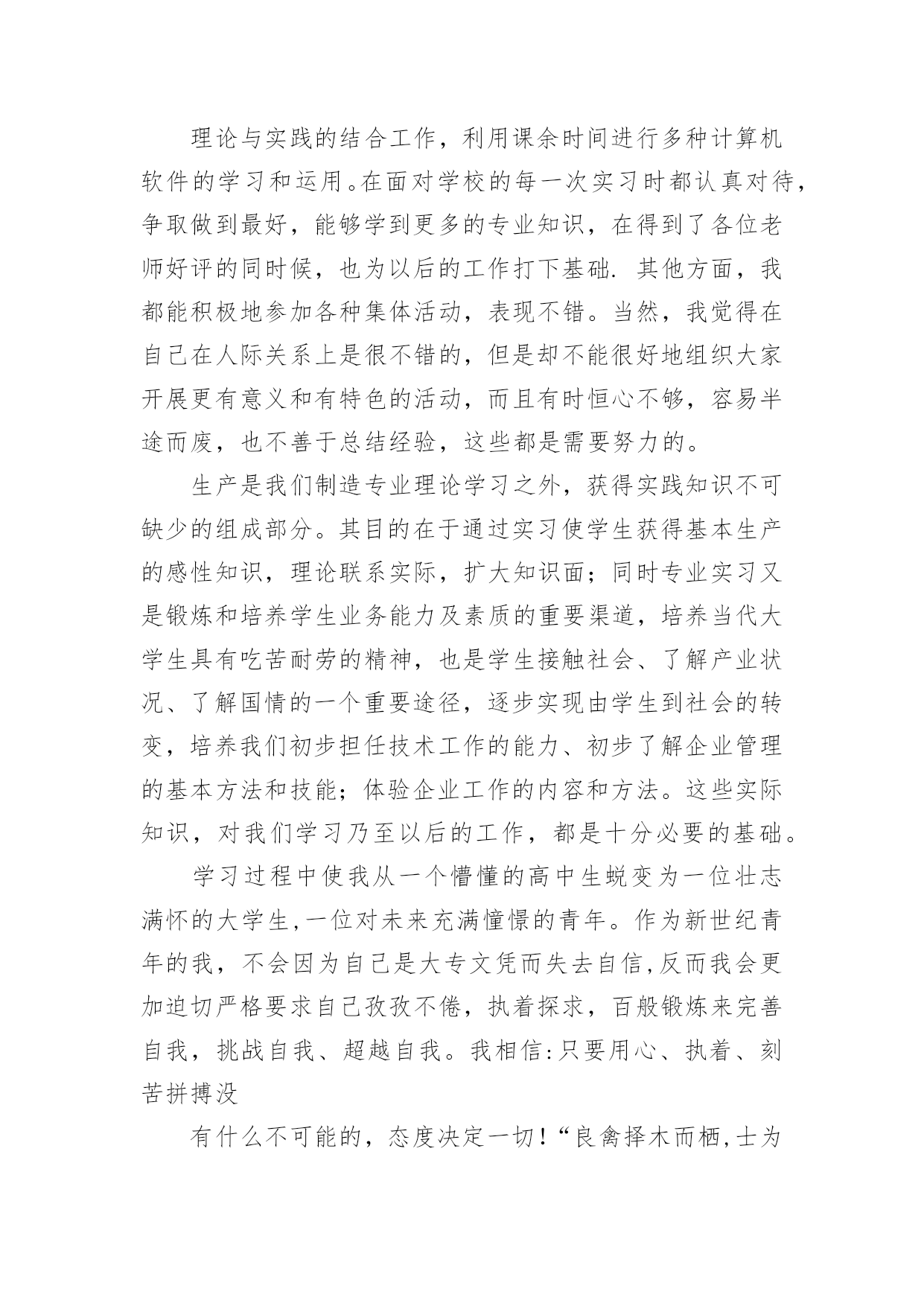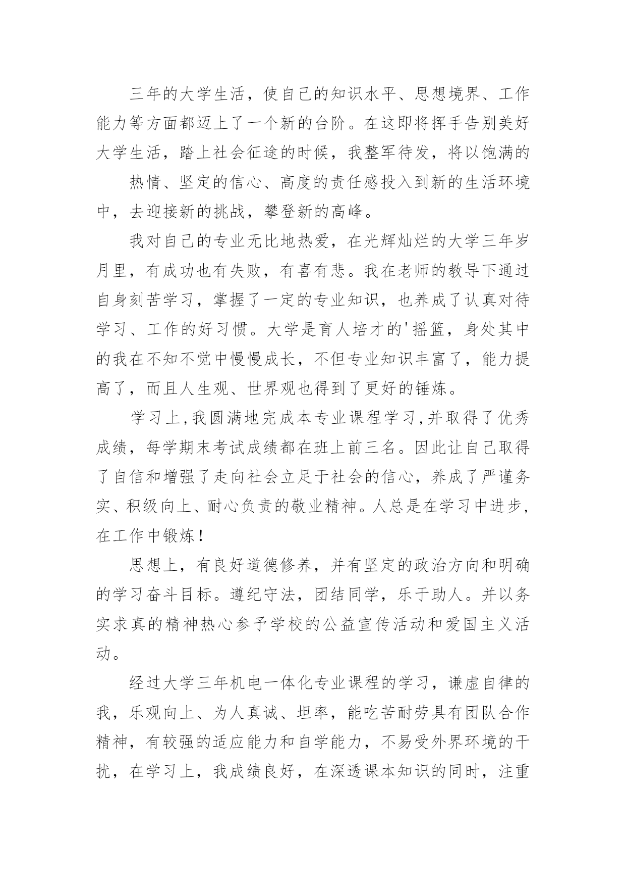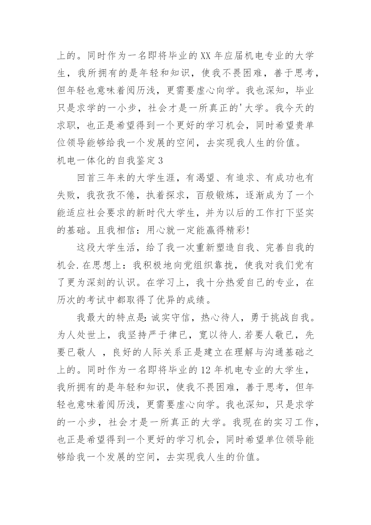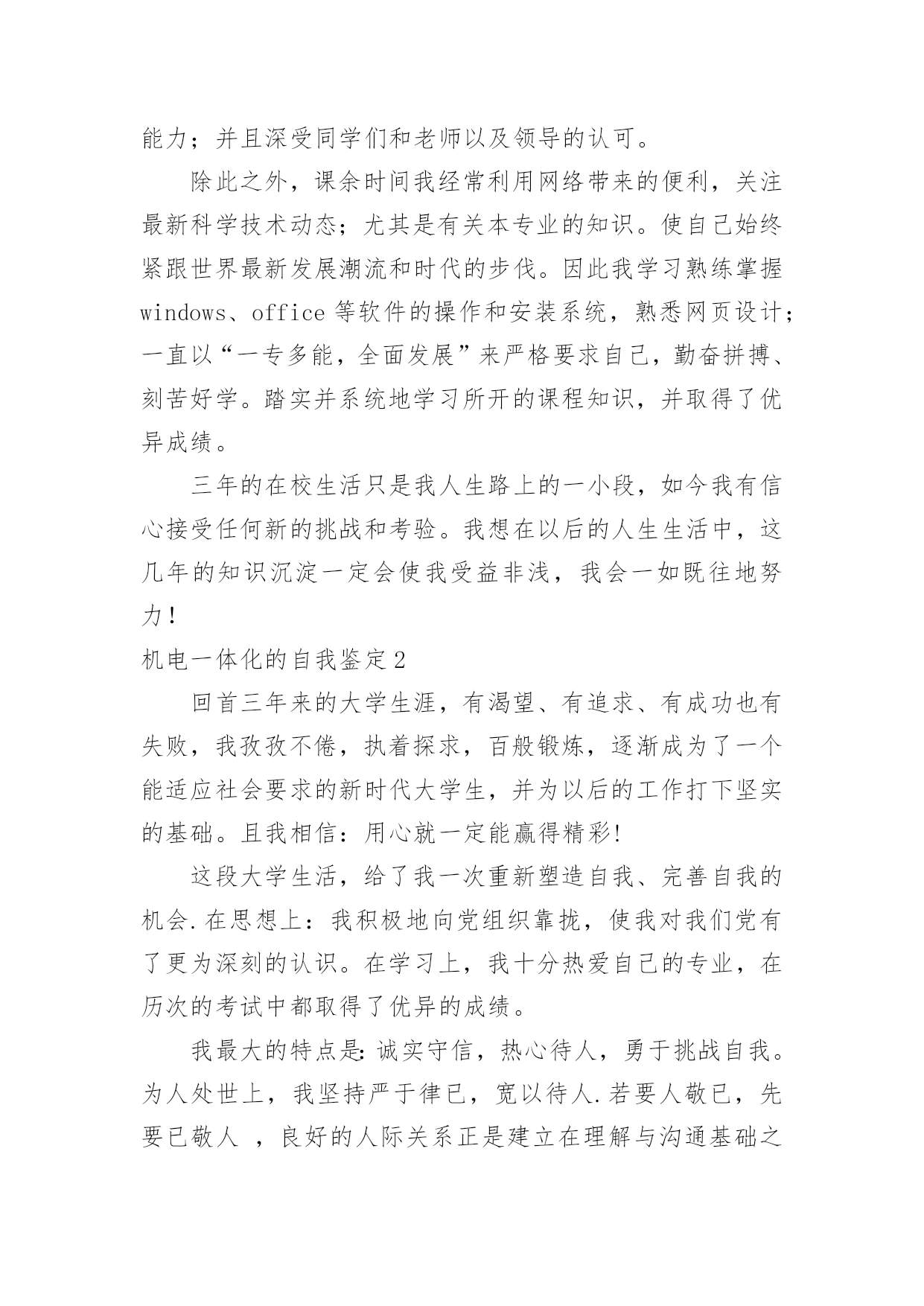 机电一体化的自我鉴定机电一体化的自我鉴定自我鉴定是对自己过去某一阶段的学习或工作进行分析,并作出相应的总结,它可以帮助我们有寻找学习和工作中的规律,因此好好准备一份自我鉴定吧。自我鉴定怎么写才不会流于形式呢?以下是小编整理的机电一体化的自我鉴定,仅供参考,大家一起来看看吧。机电一体化的自我鉴定1三年大学学习,使我自身的各方面能力以及交际能力等都有了质的飞跃;让我懂得了除学习以外的个人处事能力的重要性和交际能力的必要性。在校期间,我虚心求学、刻苦认真、吃苦耐劳,工作兢兢业业,及时总结;注重理论联系实际,培养自己的自学能力以及分析、解决问题的能力。在丰富多彩的大学生活中,为了扩大知识面和培养自己的业余爱好;积极参加校内外的实践活动,重视团队合作精神;作为系学生会干部的我,有较强的组织、宣传、管理和应变能力;有高度的责任心和良好的人际关系。在出色地完成上级交予的'任务外,还在校内组织和开展一些有意义的活动中,能有力地组织同学及调动同学们的积极性,从中也锻炼和提高了自己的组织和领导能力。表现出较强的与人密切合作的能力和良好的环境适应能力;并且深受同学们和老师以及领导的认可。除此之外,课余时间我经常利用网络带来的便利,关注最新科学技术动态;尤其是有关本专业的知识。使自己始终紧跟世界最新发展潮流和时代的步伐。因此我学习熟练掌握windows、office等软件的操作和安装系统,熟悉网页设计;一直以“一专多能,全面发展”来严格要求自己,勤奋拼搏、刻苦好学。踏实并系统地学习所开的课程知识,并取得了优异成绩。三年的在校生活只是我人生路上的一小段,如今我有信心接受任何新的挑战和考验。我想在以后的人生生活中,这几年的知识沉淀一定会使我受益非浅,我会一如既往地努力!机电一体化的自我鉴定2回首三年来的大学生涯,有渴望、有追求、有成功也有失败,我孜孜不倦,执着探求,百般锻炼,逐渐成为了一个能适应社会要求的新时代大学生,并为以后的工作打下坚实的基础。且我相信:用心就一定能赢得精彩!这段大学生活,给了我一次重新塑造自我、完善自我的机会.在思想上:我积极地向党组织靠拢,使我对我们党有了更为深刻的认识。在学习上,我十分热爱自己的专业,在历次的考试中都取得了优异的成绩。我最大的特点是:诚实守信,热心待人,勇于挑战自我。为人处世上,我坚持严于律已,宽以待人.若要人敬已,先要已敬人,良好的人际关系正是建立在理解与沟通基础之上的。同时作为一名即将毕业的XX年应届机电专业的大学生,我所拥有的是年轻和知识,使我不畏困难,善于思考,但年轻也意味着阅历浅,更需要虚心向学。我也深知,毕业只是求学的一小步,社会才是一所真正的'大学。我今天的求职,也正是希望得到一个更好的学习机会,同时希望贵单位领导能够给我一个发展的空间,去实现我人生的价值。机电一体化的自我鉴定3回首三年来的大学生涯,有渴望、有追求、有成功也有失败,我孜孜不倦,执着探求,百般锻炼,逐渐成为了一个能适应社会要求的新时代大学生,并为以后的工作打下坚实的基础。且我相信:用心就一定能赢得精彩!这段大学生活,给了我一次重新塑造自我、完善自我的机会.在思想上:我积极地向党组织靠拢,使我对我们党有了更为深刻的认识。在学习上,我十分热爱自己的专业,在历次的考试中都取得了优异的成绩。我最大的特点是:诚实守信,热心待人,勇于挑战自我。为人处世上,我坚持严于律已,宽以待人.若要人敬已,先要已敬人,良好的人际关系正是建立在理解与沟通基础之上的。同时作为一名即将毕业的12年机电专业的大学生,我所拥有的是年轻和知识,使我不畏困难,善于思考,但年轻也意味着阅历浅,更需要虚心向学。我也深知,只是求学的一小步,社会才是一所真正的大学。我现在的实习工作,也正是希望得到一个更好的学习机会,同时希望单位领导能够给我一个发展的空间,去实现我人生的价值。三年的大学生活,使自己的知识水平、思想境界、工作能力等方面都迈上了一个新的台阶。在这即将挥手告别美好大学生活,踏上社会征途的时候,我整军待发,将以饱满的热情、坚定的信心、高度的责任感投入到新的生活环境中,去迎接新的挑战,攀登新的高峰。我对自己的专业无比地热爱,在光辉灿烂的大学三年岁月里,有成功也有失败,有喜有悲。我在老师的教导下通过自身刻苦学习,掌握了一定的专业知识,也养成了认真对待学习、工作的好习惯。大学是育人培才的'摇篮,身处其中的我在不知不觉中慢慢成长,不但专业知识丰富了,能力提高了,而且人生观、世界观也得到了更好的锤炼。学习上,我圆满地完成本专业课程学习,并取得了优秀成绩,每学期末考试成绩都在班上前三名。因此让自己取得了自信和增强了走向社会立足于社会的信心,养成了严谨务实、积级向上、耐心负责的敬业精神。人总是在学习中进步,在工作中锻炼!思想上,有良好道德修养,并有坚定的政治方向和明确的学习奋斗目标。