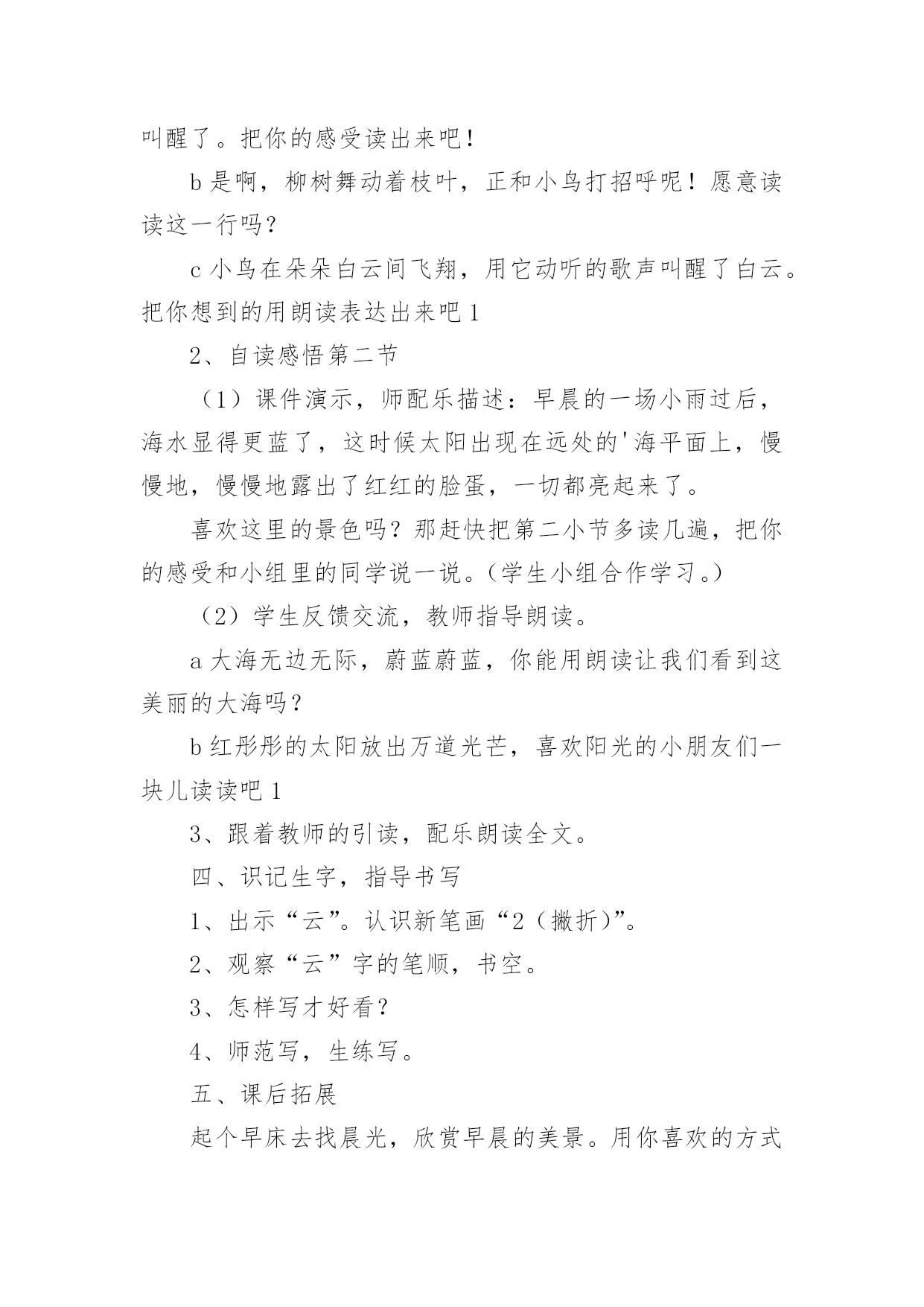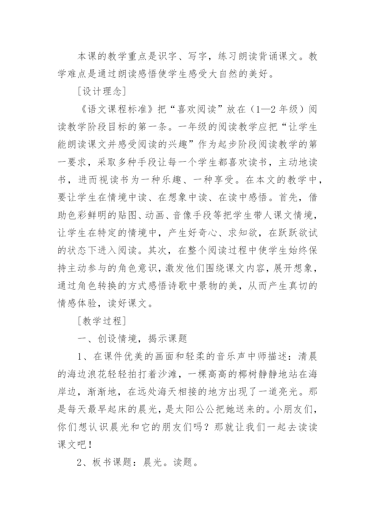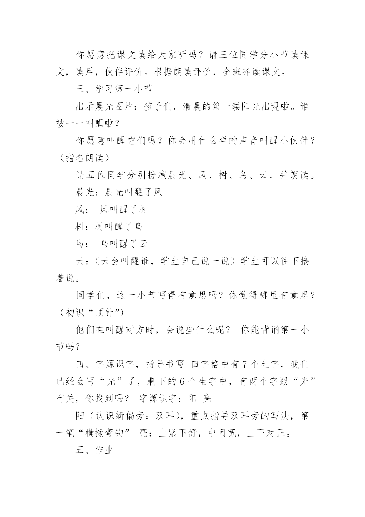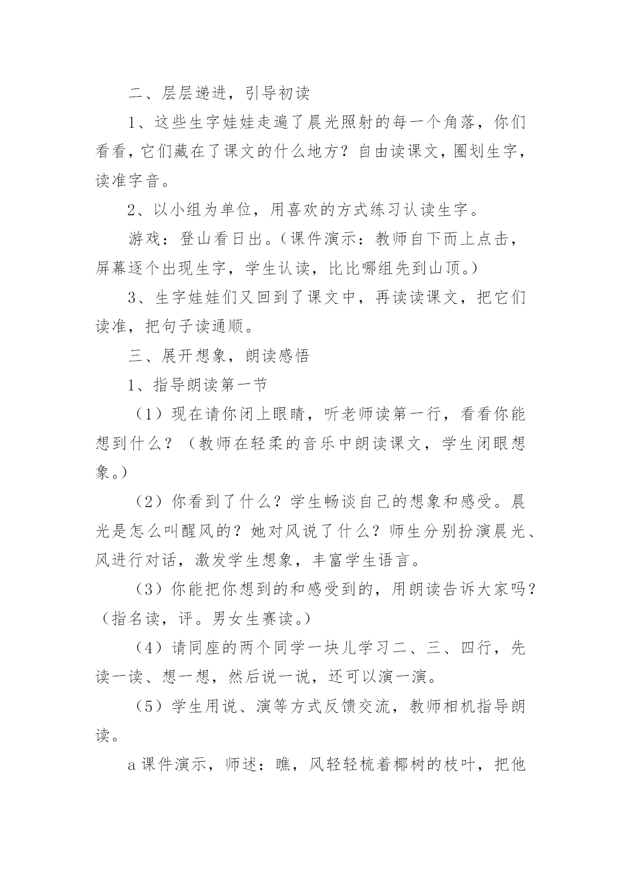 晨光教学设计晨光教学设计作为一名为他人授业解惑的教育工作者,就有可能用到教学设计,借助教学设计可以让教学工作更加有效地进行。那么应当如何写教学设计呢?下面是小编精心整理的晨光教学设计,仅供参考,希望能够帮助到大家。晨光教学设计1[教学内容]课文是一首诗歌,共两节,向我们描绘了清晨海边的美景,海风轻抚着浪花,椰树轻舞着枝叶,鸟儿在海天之间欢唱,晨雨过后红红的朝阳与蔚蓝的大海相映生辉。诗歌运用拟人化的手法使晨光、风、树、鸟、云、海的形象更加鲜活,让孩子们充分感受到大自然的美好。课文的插图形象地再现了诗歌所描绘的如画景观。[教学目标]1、学会“光、了、风、云、水、升、太”七个生字,会认“叫、变、成、洗、亮、阳”六个生字。认识新笔画“2(撇折)”。2、正确流利地朗读课文,背诵课文。3、使学生感受到海边早晨美丽的景象,激发学生观察自然和热爱自然的情感。[教学重难点]本课的教学重点是识字、写字,练习朗读背诵课文。教学难点是通过朗读感悟使学生感受大自然的美好。[设计理念]《语文课程标准》把“喜欢阅读”放在(1—2年级)阅读教学阶段目标的第一条。一年级的阅读教学应把“让学生能朗读课文并感受阅读的兴趣”作为起步阶段阅读教学的第一要求,采取多种手段让每一个学生都喜欢读书,主动地读书,进而视读书为一种乐趣、一种享受。在本文的教学中,要让学生在情境中读、在想象中读、在读中感悟。首先,借助色彩鲜明的贴图、动画、音像手段等把学生带人课文情境,让学生在特定的情境中,产生好奇心、求知欲,在跃跃欲试的状态下进入阅读。其次,在整个阅读过程中使学生始终保持主动参与的角色意识,激发他们围绕课文内容,展开想象,通过角色转换的方式感悟诗歌中景物的美,从而产生真切的情感体验,读好课文。[教学过程]一、创设情境,揭示课题1、在课件优美的画面和轻柔的音乐声中师描述:清晨的海边浪花轻轻拍打着沙滩,一棵高高的椰树静静地站在海岸边,渐渐地,在远处海天相接的地方出现了一道亮光。那是每天最早起床的晨光,是太阳公公把她送来的。小朋友们,你们想认识晨光和它的朋友们吗?那就让我们一起去读读课文吧!2、板书课题:晨光。读题。二、层层递进,引导初读1、这些生字娃娃走遍了晨光照射的每一个角落,你们看看,它们藏在了课文的什么地方?自由读课文,圈划生字,读准字音。2、以小组为单位,用喜欢的方式练习认读生字。游戏:登山看日出。(课件演示:教师自下而上点击,屏幕逐个出现生字,学生认读,比比哪组先到山顶。)3、生字娃娃们又回到了课文中,再读读课文,把它们读准,把句子读通顺。三、展开想象,朗读感悟1、指导朗读第一节(1)现在请你闭上眼睛,听老师读第一行,看看你能想到什么?(教师在轻柔的音乐中朗读课文,学生闭眼想象。)(2)你看到了什么?学生畅谈自己的想象和感受。晨光是怎么叫醒风的?她对风说了什么?师生分别扮演晨光、风进行对话,激发学生想象,丰富学生语言。(3)你能把你想到的和感受到的,用朗读告诉大家吗?(指名读,评。男女生赛读。)(4)请同座的两个同学一块儿学习二、三、四行,先读一读、想一想,然后说一说,还可以演一演。(5)学生用说、演等方式反馈交流,教师相机指导朗读。a课件演示,师述:瞧,风轻轻梳着椰树的枝叶,把他叫醒了。把你的感受读出来吧!b是啊,柳树舞动着枝叶,正和小鸟打招呼呢!愿意读读这一行吗?c小鸟在朵朵白云间飞翔,用它动听的歌声叫醒了白云。把你想到的用朗读表达出来吧12、自读感悟第二节(1)课件演示,师配乐描述:早晨的一场小雨过后,海水显得更蓝了,这时候太阳出现在远处的'海平面上,慢慢地,慢慢地露出了红红的脸蛋,一切都亮起来了。喜欢这里的景色吗?那赶快把第二小节多读几遍,把你的感受和小组里的同学说一说。(学生小组合作学习。)(2)学生反馈交流,教师指导朗读。a大海无边无际,蔚蓝蔚蓝,你能用朗读让我们看到这美丽的大海吗?b红彤彤的太阳放出万道光芒,喜欢阳光的小朋友们一块儿读读吧13、跟着教师的引读,配乐朗读全文。四、识记生字,指导书写1、出示“云”。认识新笔画“2(撇折)”。2、观察“云”字的笔顺,书空。3、怎样写才好看?4、师范写,生练写。五、课后拓展起个早床去找晨光,欣赏早晨的美景。用你喜欢的方式把早晨的美景带回来。(如记日记、照相、画画等)(第二课时:背诵课文;指导写字。)晨光教学设计2单元教材分析:本单元包括四篇识字课文和一个练习。《识字1》以词串识字的形式出现,围绕“春天”这个主题勾画了一幅春光明媚、鸟语花香的春景图,并分别从“气象、草木、动物、花朵”等不同的方面介绍了春天的特征,让我们感受到了春天的美丽多姿。《识字2》也是以词串识字的形式出现,围绕足球运动,把12个词语按一定的逻辑关系排成四组,第一组介绍了和足球相关的场地,第二、三组介绍了踢足球的动作和技巧,第四组介绍的观众反映。使
