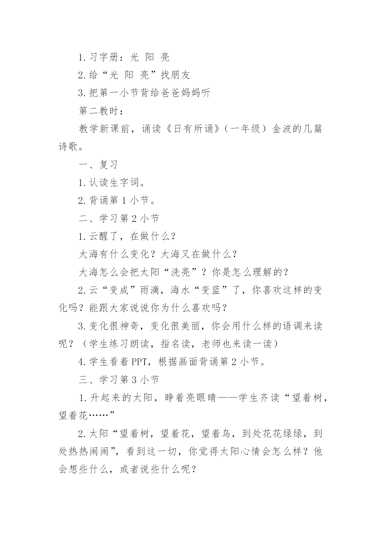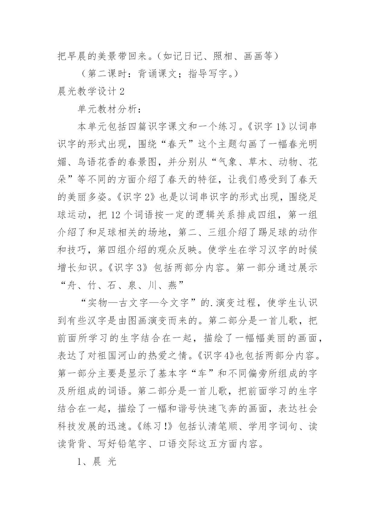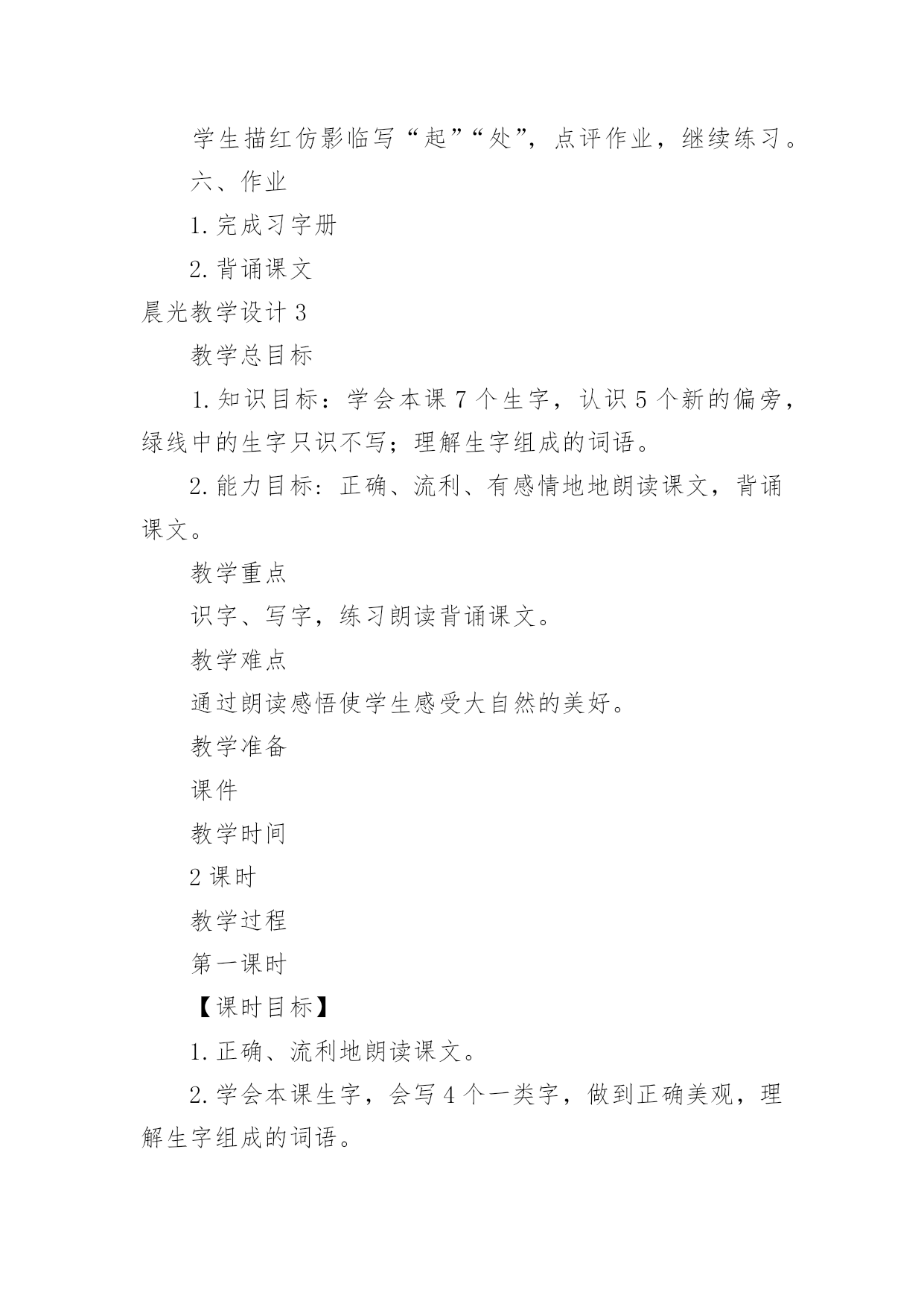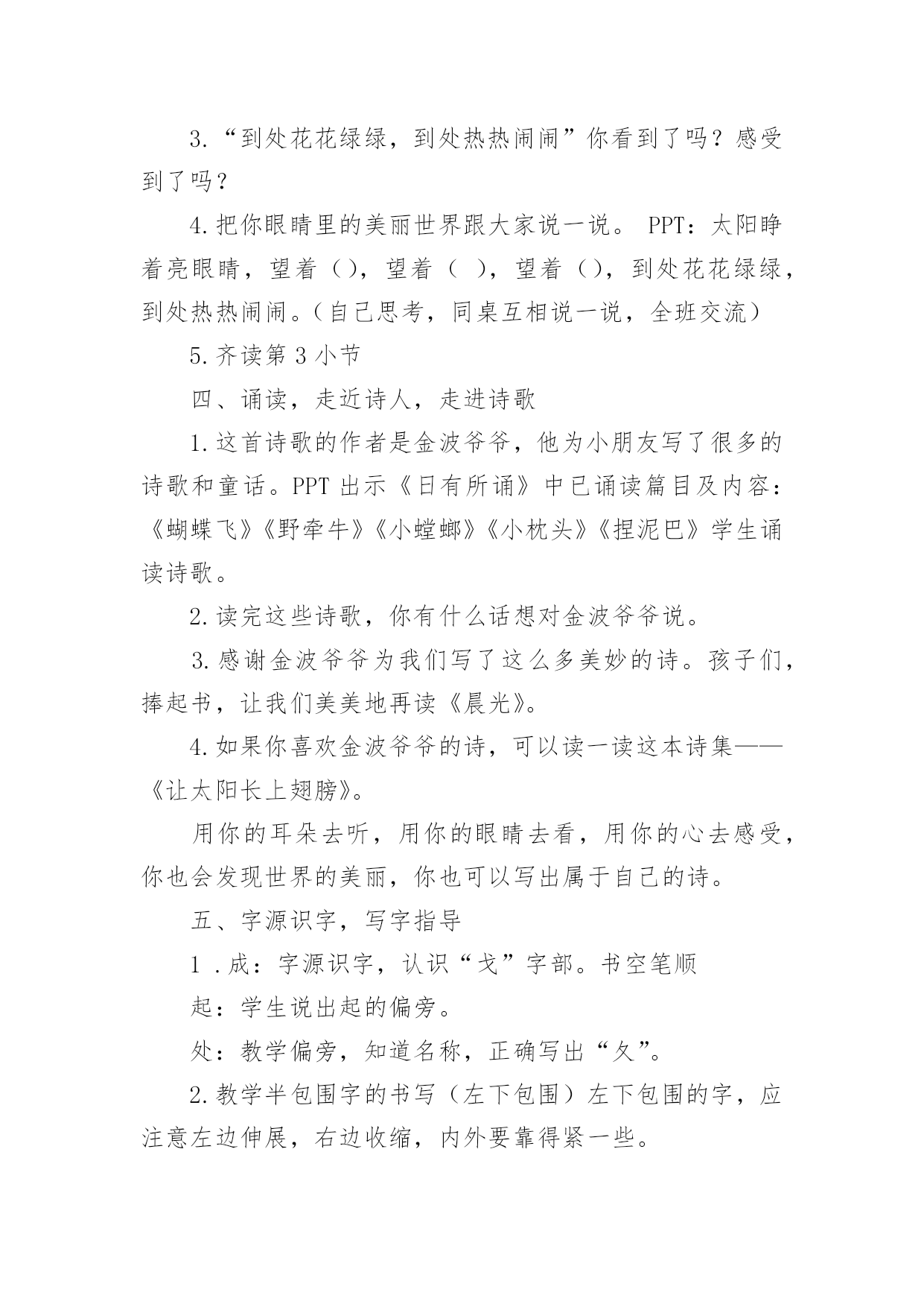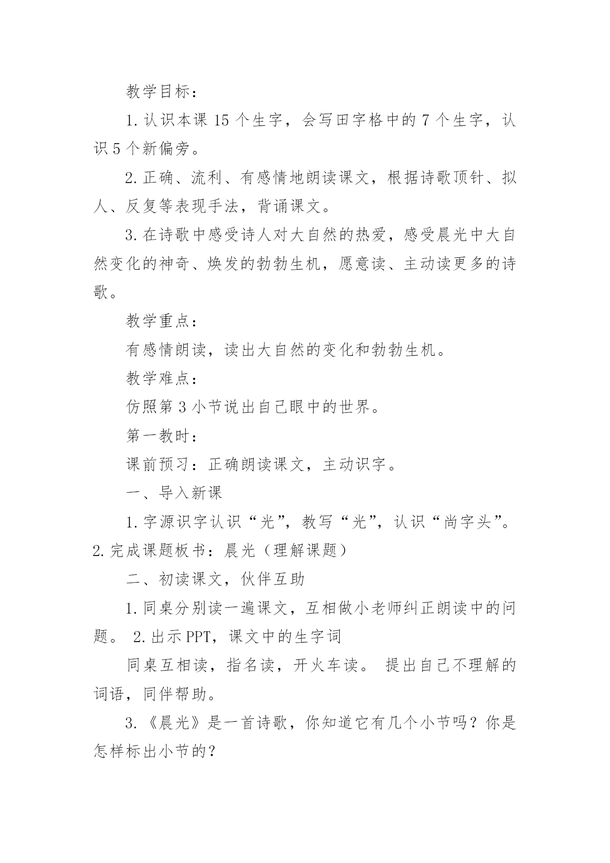 晨光教学设计晨光教学设计作为一名为他人授业解惑的教育工作者,就有可能用到教学设计,借助教学设计可以让教学工作更加有效地进行。那么应当如何写教学设计呢?下面是小编精心整理的晨光教学设计,仅供参考,希望能够帮助到大家。晨光教学设计1[教学内容]课文是一首诗歌,共两节,向我们描绘了清晨海边的美景,海风轻抚着浪花,椰树轻舞着枝叶,鸟儿在海天之间欢唱,晨雨过后红红的朝阳与蔚蓝的大海相映生辉。诗歌运用拟人化的手法使晨光、风、树、鸟、云、海的形象更加鲜活,让孩子们充分感受到大自然的美好。课文的插图形象地再现了诗歌所描绘的如画景观。[教学目标]1、学会“光、了、风、云、水、升、太”七个生字,会认“叫、变、成、洗、亮、阳”六个生字。认识新笔画“2(撇折)”。2、正确流利地朗读课文,背诵课文。3、使学生感受到海边早晨美丽的景象,激发学生观察自然和热爱自然的情感。[教学重难点]本课的教学重点是识字、写字,练习朗读背诵课文。教学难点是通过朗读感悟使学生感受大自然的美好。[设计理念]《语文课程标准》把“喜欢阅读”放在(1—2年级)阅读教学阶段目标的第一条。一年级的阅读教学应把“让学生能朗读课文并感受阅读的兴趣”作为起步阶段阅读教学的第一要求,采取多种手段让每一个学生都喜欢读书,主动地读书,进而视读书为一种乐趣、一种享受。在本文的教学中,要让学生在情境中读、在想象中读、在读中感悟。首先,借助色彩鲜明的贴图、动画、音像手段等把学生带人课文情境,让学生在特定的情境中,产生好奇心、求知欲,在跃跃欲试的状态下进入阅读。其次,在整个阅读过程中使学生始终保持主动参与的角色意识,激发他们围绕课文内容,展开想象,通过角色转换的方式感悟诗歌中景物的美,从而产生真切的情感体验,读好课文。[教学过程]一、创设情境,揭示课题1、在课件优美的画面和轻柔的音乐声中师描述:清晨的海边浪花轻轻拍打着沙滩,一棵高高的椰树静静地站在海岸边,渐渐地,在远处海天相接的地方出现了一道亮光。那是每天最早起床的晨光,是太阳公公把她送来的。小朋友们,你们想认识晨光和它的朋友们吗?那就让我们一起去读读课文吧!2、板书课题:晨光。读题。二、层层递进,引导初读1、这些生字娃娃走遍了晨光照射的每一个角落,你们看看,它们藏在了课文的什么地方?自由读课文,圈划生字,读准字音。2、以小组为单位,用喜欢的方式练习认读生字。游戏:登山看日出。(课件演示:教师自下而上点击,屏幕逐个出现生字,学生认读,比比哪组先到山顶。)3、生字娃娃们又回到了课文中,再读读课文,把它们读准,把句子读通顺。三、展开想象,朗读感悟1、指导朗读第一节(1)现在请你闭上眼睛,听老师读第一行,看看你能想到什么?(教师在轻柔的音乐中朗读课文,学生闭眼想象。)(2)你看到了什么?学生畅谈自己的想象和感受。晨光是怎么叫醒风的?她对风说了什么?师生分别扮演晨光、风进行对话,激发学生想象,丰富学生语言。(3)你能把你想到的和感受到的,用朗读告诉大家吗?(指名读,评。男女生赛读。)(4)请同座的两个同学一块儿学习二、三、四行,先读一读、想一想,然后说一说,还可以演一演。(5)学生用说、演等方式反馈交流,教师相机指导朗读。a课件演示,师述:瞧,风轻轻梳着椰树的枝叶,把他叫醒了。把你的感受读出来吧!b是啊,柳树舞动着枝叶,正和小鸟打招呼呢!愿意读读这一行吗?c小鸟在朵朵白云间飞翔,用它动听的歌声叫醒了白云。把你想到的用朗读表达出来吧12、自读感悟第二节(1)课件演示,师配乐描述:早晨的一场小雨过后,海水显得更蓝了,这时候太阳出现在远处的'海平面上,慢慢地,慢慢地露出了红红的脸蛋,一切都亮起来了。喜欢这里的景色吗?那赶快把第二小节多读几遍,把你的感受和小组里的同学说一说。(学生小组合作学习。)(2)学生反馈交流,教师指导朗读。a大海无边无际,蔚蓝蔚蓝,你能用朗读让我们看到这美丽的大海吗?b红彤彤的太阳放出万道光芒,喜欢阳光的小朋友们一块儿读读吧13、跟着教师的引读,配乐朗读全文。四、识记生字,指导书写1、出示“云”。认识新笔画“2(撇折)”。2、观察“云”字的笔顺,书空。3、怎样写才好看?4、师范写,生练写。五、课后拓展起个早床去找晨光,欣赏早晨的美景。用你喜欢的方式把早晨的美景带回来。(如记日记、照相、画画等)(第二课时:背诵课文;指导写字。)晨光教学设计2单元教材分析:本单元包括四篇识字课文和一个练习。《识字1》以词串识字的形式出现,围绕“春天”这个主题勾画了一幅春光明媚、鸟语花香的春景图,并分别从“气象、草木、动物、花朵”等不同的方面介绍了春天的特征,让我们感受到了春天的美丽多姿。《识字2》也是以词串识字的形式出现,围绕足球运动,把12个词语按一定的逻辑关系排成四组,第一组介绍了和足球相关的场地,第二、三组介绍了踢足球的动作和技巧,第四组介绍的观众反映。使