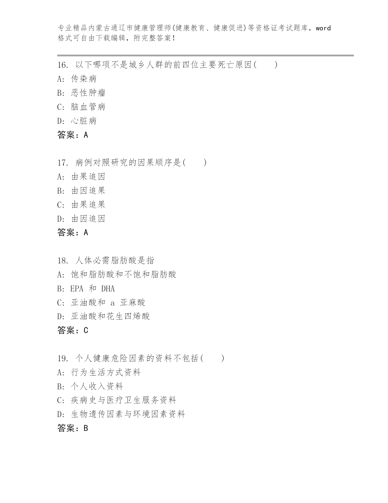 精品内蒙古通辽市健康管理师(健康教育、健康促进)等资格证考试通用题库完整答案
