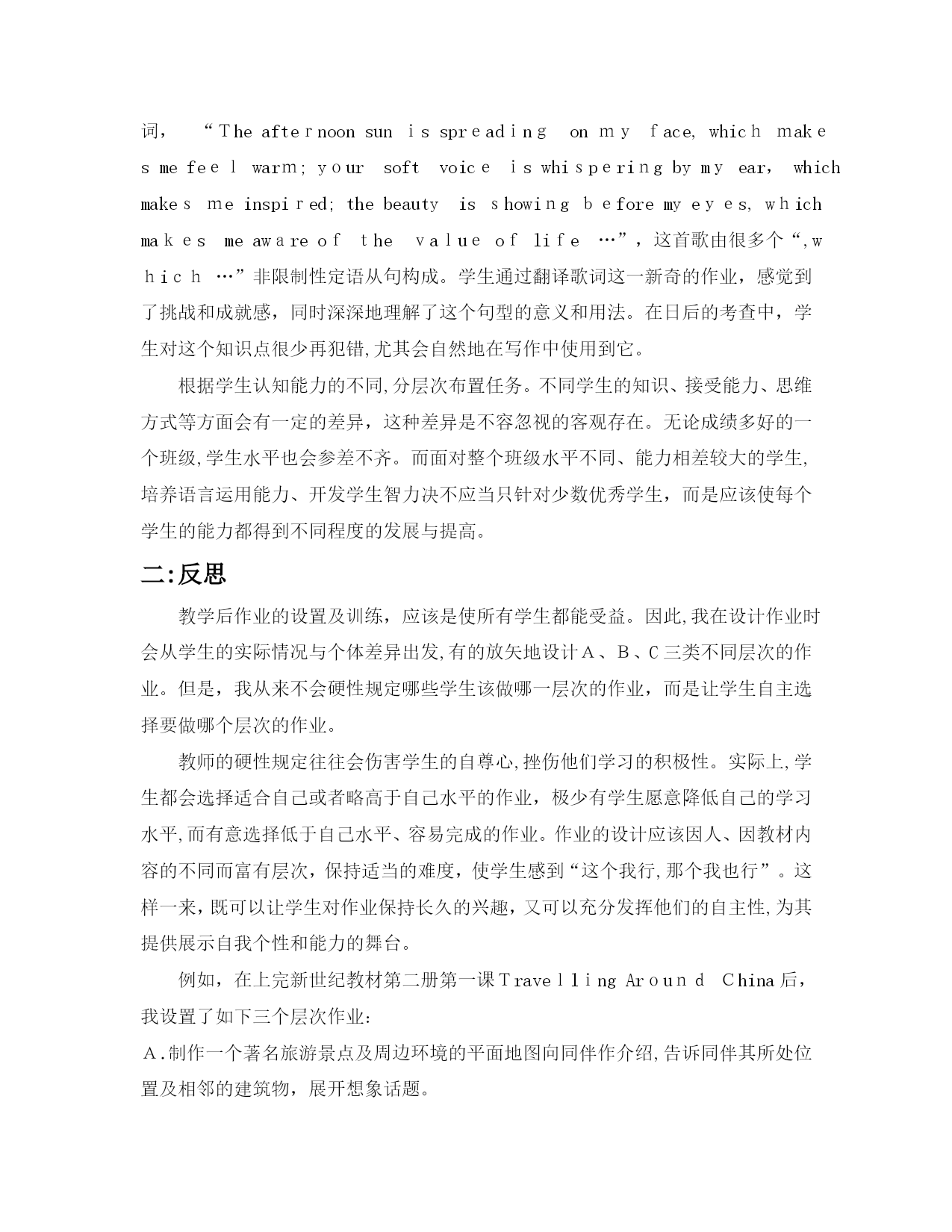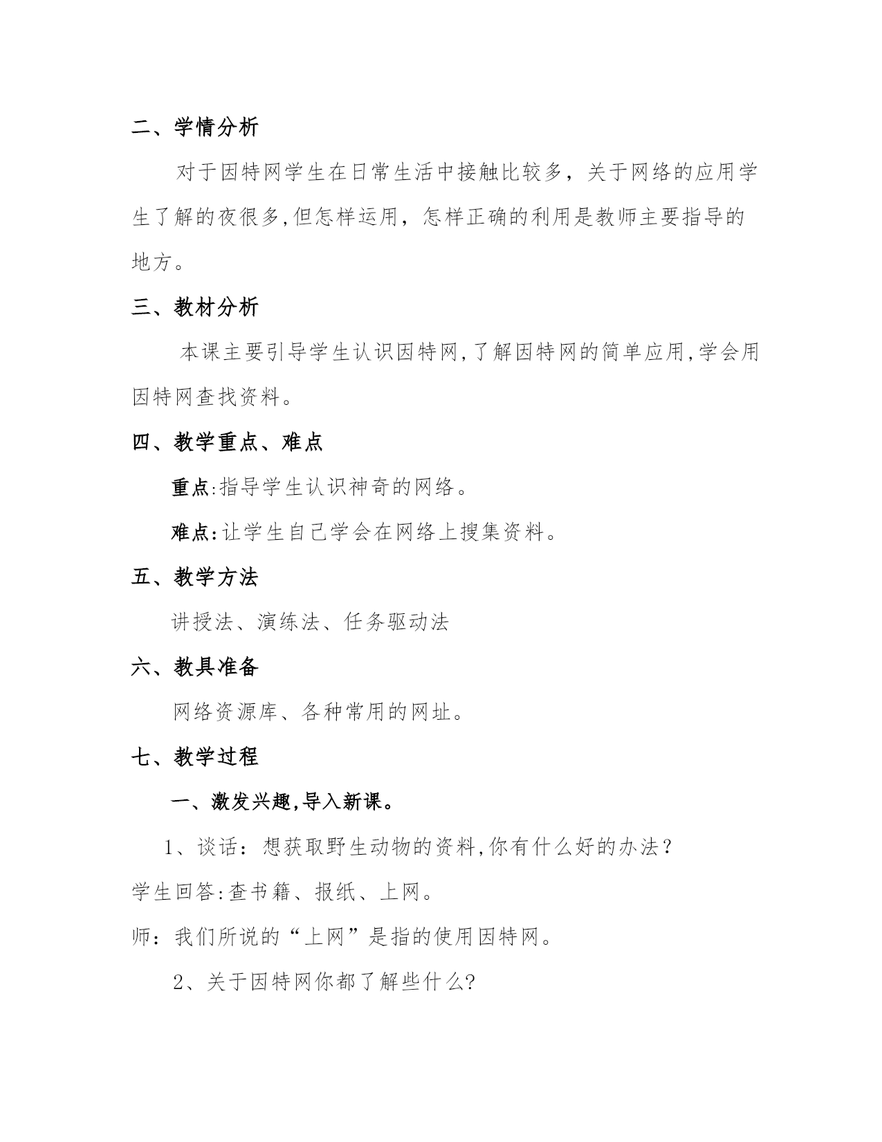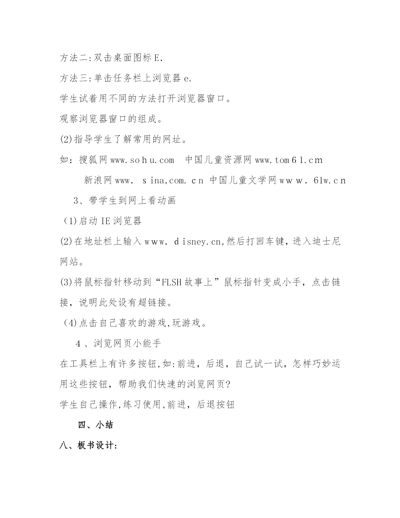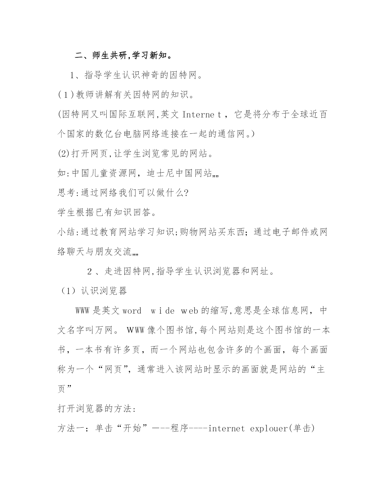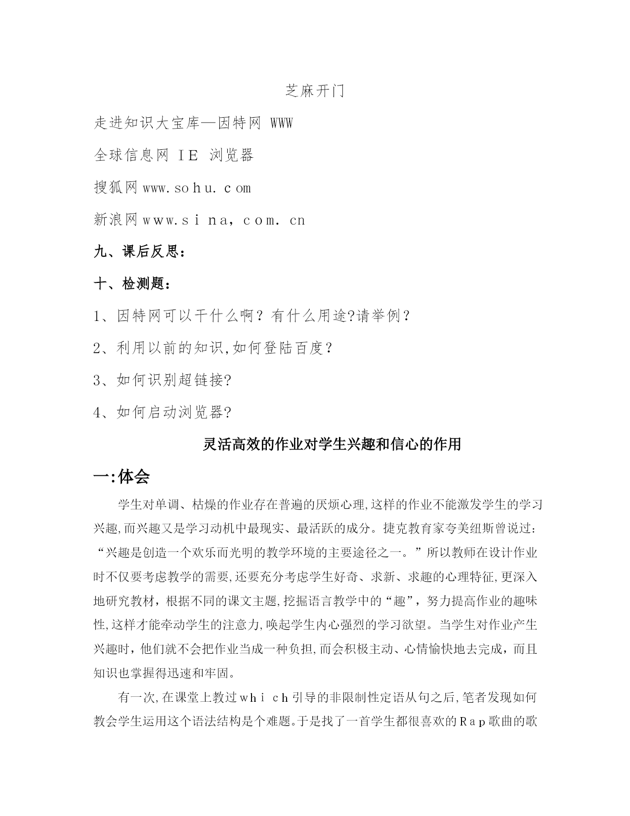 教学设计《芝麻开门》教学设计一、学习目标1、指导学生认识神奇的因特网。2、学会使用浏览器,并会通过网址查找网站。3、能通过网络看动画,并搜索自己想要的知识,培养学生对网络应用的兴趣。二、学情分析对于因特网学生在日常生活中接触比较多,关于网络的应用学生了解的夜很多,但怎样运用,怎样正确的利用是教师主要指导的地方。三、教材分析本课主要引导学生认识因特网,了解因特网的简单应用,学会用因特网查找资料。四、教学重点、难点重点:指导学生认识神奇的网络。难点:让学生自己学会在网络上搜集资料。五、教学方法讲授法、演练法、任务驱动法六、教具准备网络资源库、各种常用的网址。七、教学过程一、激发兴趣,导入新课。1、谈话:想获取野生动物的资料,你有什么好的办法?学生回答:查书籍、报纸、上网。师:我们所说的“上网”是指的使用因特网。2、关于因特网你都了解些什么?二、师生共研,学习新知。1、指导学生认识神奇的因特网。(1)教师讲解有关因特网的知识。(因特网又叫国际互联网,英文Internet,它是将分布于全球近百个国家的数亿台电脑网络连接在一起的通信网。)(2)打开网页,让学生浏览常见的网站。如:中国儿童资源网,迪士尼中国网站„„思考:通过网络我们可以做什么?学生根据已有知识回答。小结:通过教育网站学习知识;购物网站买东西;通过电子邮件或网络聊天与朋友交流„„2、走进因特网,指导学生认识浏览器和网址。(1)认识浏览器WWW是英文wordwideweb的缩写,意思是全球信息网,中文名字叫万网。WWW像个图书馆,每个网站则是这个图书馆的一本书,一本书有许多页,而一个网站也包含许多的个画面,每个画面称为一个“网页”,通常进入该网站时显示的画面就是网站的“主页”打开浏览器的方法:方法一:单击“开始”---程序----internetexplouer(单击)方法二:双击桌面图标E.方法三:单击任务栏上浏览器e.学生试着用不同的方法打开浏览器窗口。观察浏览器窗口的组成。(2)指导学生了解常用的网址。如:搜狐网www.sohu.com中国儿童资源网www.tom61.cm新浪网www.sina,com.cn中国儿童文学网www.61w.cn3、带学生到网上看动画(1)启动IE浏览器(2)在地址栏上输入www.disney.cn,然后打回车键,进入迪士尼网站。(3)将鼠标指针移动到“FLSH故事上”鼠标指针变成小手,点击链接,说明此处设有超链接。(4)点击自己喜欢的游戏,玩游戏。4、浏览网页小能手在工具栏上有许多按钮,如:前进,后退,自己试一试,怎样巧妙运用这些按钮,帮助我们快速的浏览网页?学生自己操作,练习使用,前进,后退按钮小结板书设计:芝麻开门走进知识大宝库—因特网WWW全球信息网IE浏览器搜狐网www.sohu.com新浪网www.sina,com.cn课后反思:十、检测题:1、因特网可以干什么啊?有什么用途?请举例?2、利用以前的知识,如何登陆百度?3、如何识别超链接?4、如何启动浏览器?灵活高效的作业对学生兴趣和信心的作用一:体会学生对单调、枯燥的作业存在普遍的厌烦心理,这样的作业不能激发学生的学习兴趣,而兴趣又是学习动机中最现实、最活跃的成分。捷克教育家夸美纽斯曾说过:“兴趣是创造一个欢乐而光明的教学环境的主要途径之一。”所以教师在设计作业时不仅要考虑教学的需要,还要充分考虑学生好奇、求新、求趣的心理特征,更深入地研究教材,根据不同的课文主题,挖掘语言教学中的“趣”,努力提高作业的趣味性,这样才能牵动学生的注意力,唤起学生内心强烈的学习欲望。当学生对作业产生兴趣时,他们就不会把作业当成一种负担,而会积极主动、心情愉快地去完成,而且知识也掌握得迅速和牢固。有一次,在课堂上教过which引导的非限制性定语从句之后,笔者发现如何教会学生运用这个语法结构是个难题。于是找了一首学生都很喜欢的Rap歌曲的歌词,“Theafternoonsunisspreadingonmyface,whichmakesmefeelwarm;yoursoftvoiceiswhisperingbymyear,whichmakesmeinspired;thebeautyisshowingbeforemyeyes,whichmakesmeawareofthevalueoflife…”,这首歌由很多个“,which…”非限制性定语从句构成。学生通过翻译歌词这一新奇的作业,感觉到了挑战和成就感,同时深深地理解了这个句型的意义和用法。在日后的考查中,学生对这个知识点很少再犯错,尤其会自然地在写作中使用到它。根据学生认知能力的不同,分层次布置任务