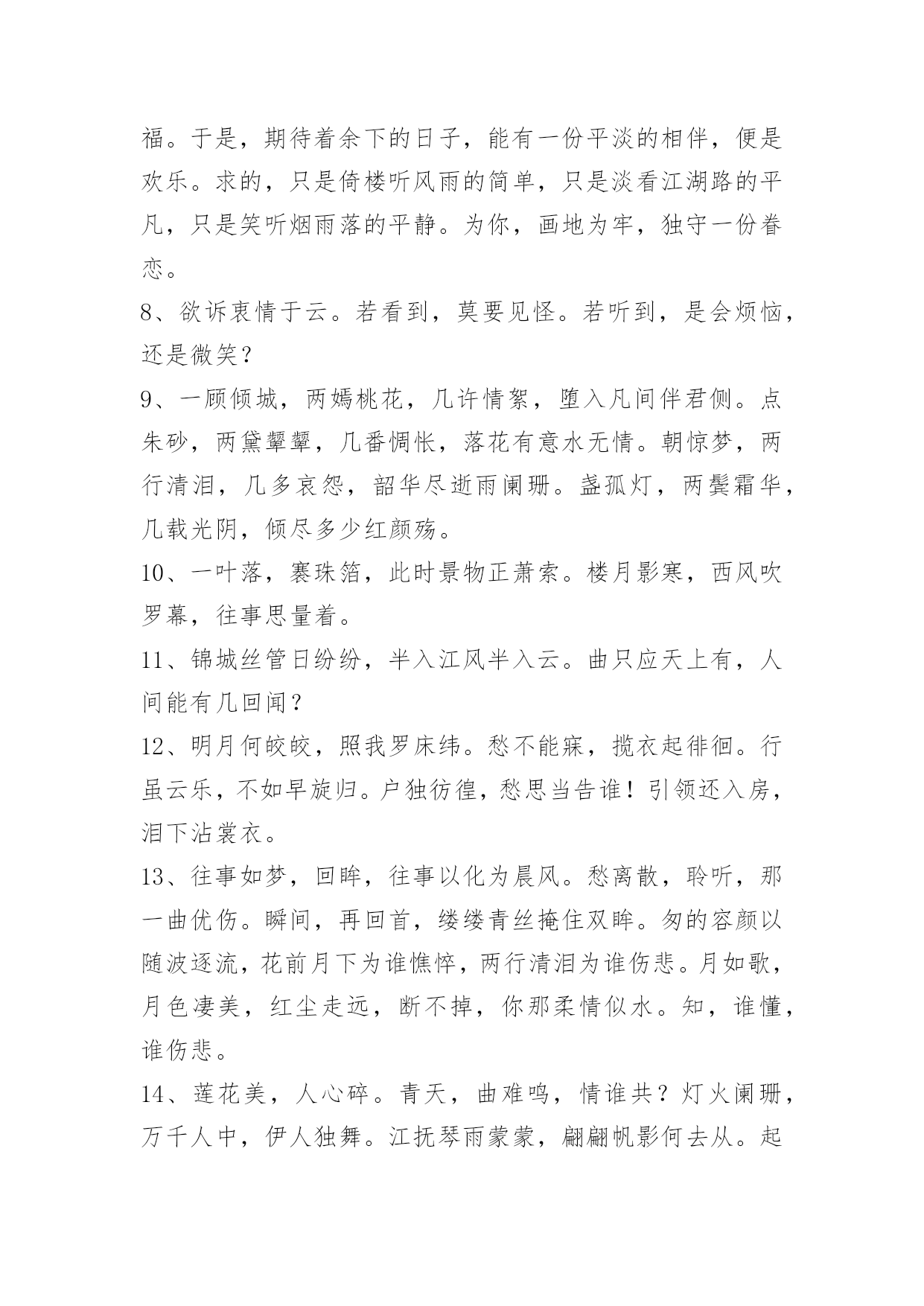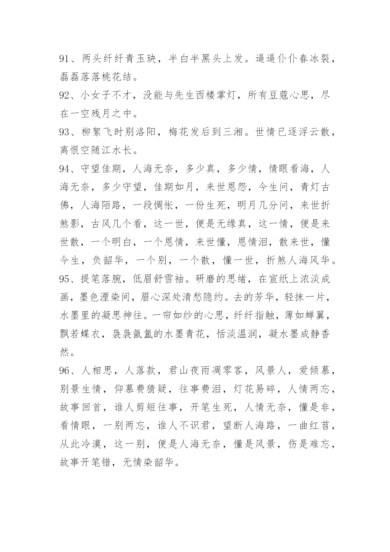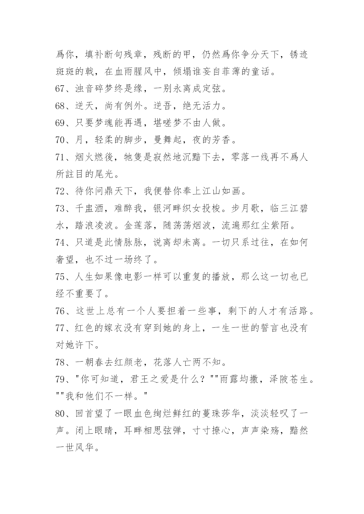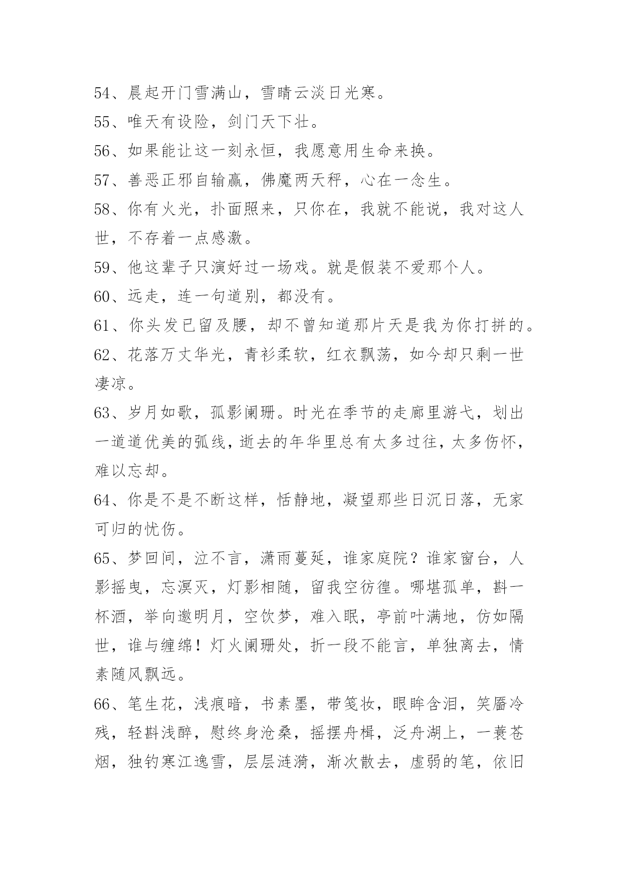 常用古风句子96条2022年常用古风句子汇编96条雨落将伞避水丝,雨住不问红伞姿。似情事亦如此,才教生死作相思。下面是小编整理的古风句子96条,欢迎大家借鉴与参考,希望对大家有所帮助。1、风过云飘雨,山形笼雾烟。浮生迷醉一回闲,绿意沁窗轩。//凄雨何须愁绝,来日艳阳高澈。自由来去觅初心,闲情笑古今。2、丁丁漏水夜何长,漫漫轻云露月光。秋逼暗虫通夕响,征衣未寄莫飞霜。3、秋来红枣压枝繁,堆向君家白玉盘。4、临别请君喝一杯故土的水,君走遍天下,也别忘了把家乡装在胸中。5、电灯下的甜美微笑,都不在微笑,钢琴键上,灰尘飞腾,古老手指交织按响,写下古典为君送行。6、千年一轮回,陌上红尘中迷醉了谁的双眼?奢靡繁世间染指了谁的昨天?穿越时空的隧道,浪迹前世的逐波。不慎迷失的旅途里再次回到梦中的江南。那一天,桃花纷飞,青丝拂柳。倩笑了半面的妆容。抚一曲,千年的瑶琴,沉醉了谁的心?迷茫中,惊鸿了那一撇,沦陷了那一眼,一沉沦便是千年。7、一生,一世;两度轮回,终于,换得一场与你厮守的幸福。于是,期待着余下的日子,能有一份平淡的相伴,便是欢乐。求的,只是倚楼听风雨的简单,只是淡看江湖路的平凡,只是笑听烟雨落的平静。为你,画地为牢,独守一份眷恋。8、欲诉衷情于云。若看到,莫要见怪。若听到,是会烦恼,还是微笑?9、一顾倾城,两嫣桃花,几许情絮,堕入凡间伴君侧。点朱砂,两黛颦颦,几番惆怅,落花有意水无情。朝惊梦,两行清泪,几多哀怨,韶华尽逝雨阑珊。盏孤灯,两鬓霜华,几载光阴,倾尽多少红颜殇。10、一叶落,褰珠箔,此时景物正萧索。楼月影寒,西风吹罗幕,往事思量着。11、锦城丝管日纷纷,半入江风半入云。曲只应天上有,人间能有几回闻?12、明月何皎皎,照我罗床纬。愁不能寐,揽衣起徘徊。行虽云乐,不如早旋归。户独彷徨,愁思当告谁!引领还入房,泪下沾裳衣。13、往事如梦,回眸,往事以化为晨风。愁离散,聆听,那一曲优伤。瞬间,再回首,缕缕青丝掩住双眸。匆的容颜以随波逐流,花前月下为谁憔悴,两行清泪为谁伤悲。月如歌,月色凄美,红尘走远,断不掉,你那柔情似水。知,谁懂,谁伤悲。14、莲花美,人心碎。青天,曲难鸣,情谁共?灯火阑珊,万千人中,伊人独舞。江抚琴雨蒙蒙,翩翩帆影何去从。起潮又落,笑面盖泪颜。纷落英,落花有人葬;叶叶相思,相思无处藏。长莺飞人不归,一池旖旎皆虚妄。恨两茫茫,不思量,爱意早苍茫。15、相思树下,一曲葬花,葬了一季桃红柳绿,葬了一季繁华盛世,也葬了今生的误入红尘。16、往事如烟,落下的总是最深的思念,你我的距离就象是明月与清泉般,只能相望却不能相依,"情"字何解?怎么落笔都不对,一曲断弦已然成殇,你的容颜成了我绘不出的青花图案,乱了我三世的遗憾,你的流年,在似锦如花的最深处走过,不是为了我,却乱了我的浮生,你一低头,写我一生的伤怀。17、往事懒述,朦朦月儿驻,风轻摇叶,瑟瑟初秋暮,淡陌相思寄哀愁,谁可慰,心思悄瘦,夜未央,谁人不寐,皎月悄落泪,身只无人随,思量或已碎,青丝晚成雪,寞见花不谢,痴痴忘勿为,千城不觅,道是轮回,忘川不忘情,自哀泣,奈何心念,不相忘,道心毁,终不成绝情,痴不放。18、这一世,你是我,遗忘千年的红颜知己,你是我,染尽了红尘,散尽了伤感的思念。起缘灭,擦肩而过,谁倾了我的城,我负了谁的心,从此,那一抹容颜遗忘天涯,了无相望。你,错过一季,那是落花的时节。身落红,裙袂飘飘,甩出柔情的水袖,恍若甩出千年的过往。19、谁翻乐府凄凉曲,风也萧萧,雨也萧萧,瘦尽灯花又一宵。知何事萦怀抱,醒也无聊,醉也无聊,梦里何曾到谢桥。20、爱他需要勇气,被他爱需要运气。臣妾有这个勇气,可臣妾没那个运气。21、纷繁的离绪,烦乱的交杂,没有了君的导航,臣妾注定会迷失在这雨季。22、君的心可以选择爱臣妾或不爱臣妾,而臣妾的心只能选择爱君或更爱君。23、君的梦里有明天,但臣妾的季节没有春天,只有夏日陪着臣妾迷惘。24、一点残红欲尽时,乍凉秋气满屏帏。桐叶上三更雨,叶叶声声是别离。25、一窗秋风,一阕清词,凝成静默刻在断肠处,泡一杯茶端坐于桌前,隔世离空念君,任春去秋来,任花开花谢,将那几许伤痛隐于花荫深处,唯有,将君的身影搁浅在记忆中。在翰园碑林古韵古雅的风景区,收集一份自在,携带一份飘逸,彰显远离尘嚣的一份雅致。26、入红尘,只因为生自烟雨的性情,语红尘,只因为爱尽烟雨的空灵,叹红尘,只因为看遍烟雨的凄零。红尘,却爱不能红尘飘渺如烟雨,盼红尘,却盼不得红尘清冷如烟雨,恨红尘,却恨不尽红尘纷乱如烟雨,奈红尘,却奈不何红尘飘飞如烟雨~~烟雨红尘,点点离人泪。27、谁是谁前世的牵绊?谁是谁今生的梵音?谁为谁望穿秋水?谁又拿浮生乱了流年?却原来,繁华过后一场空,誓言缱绻,梦非梦,蝶舞庄周,花非花。世间,许多事,求得,求之不得;许多梦,忘得,忘记不得。28、君用