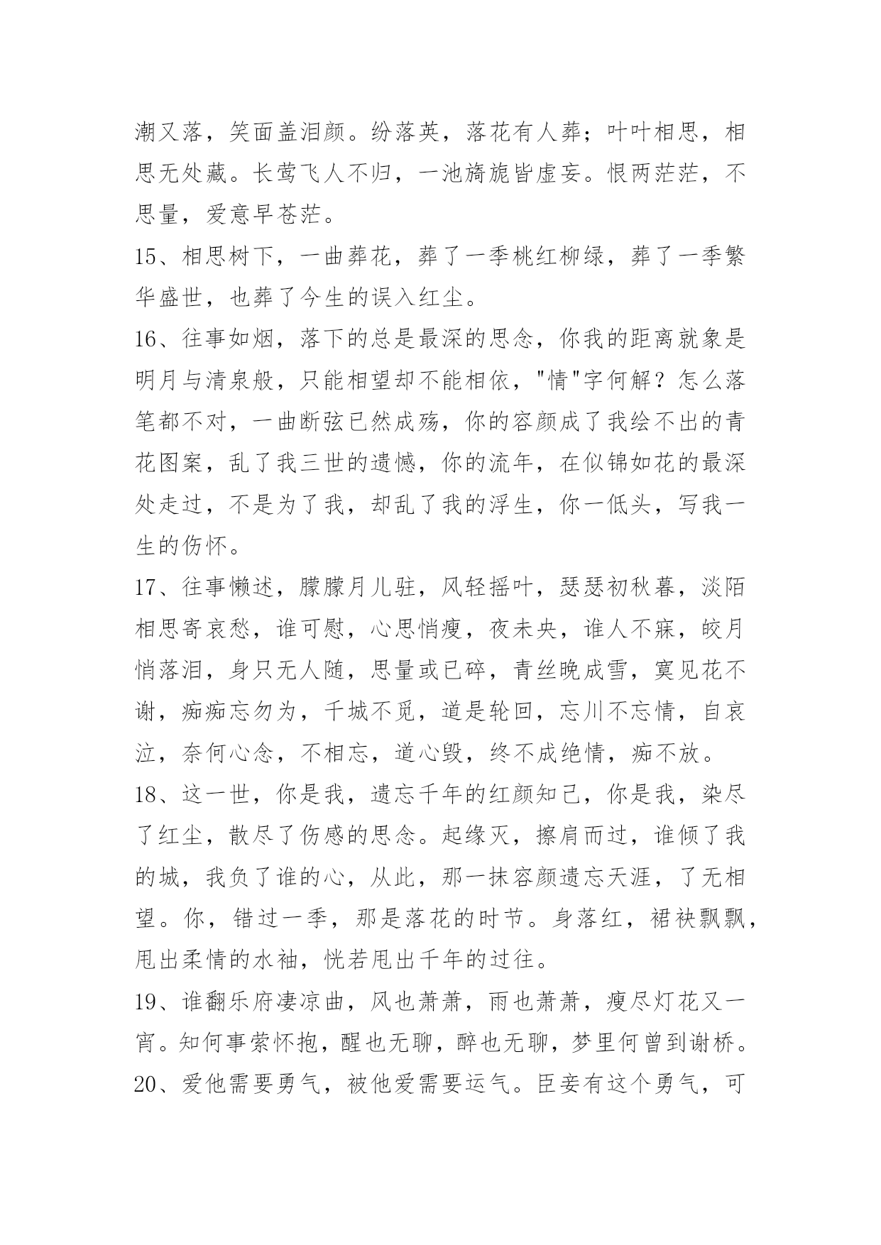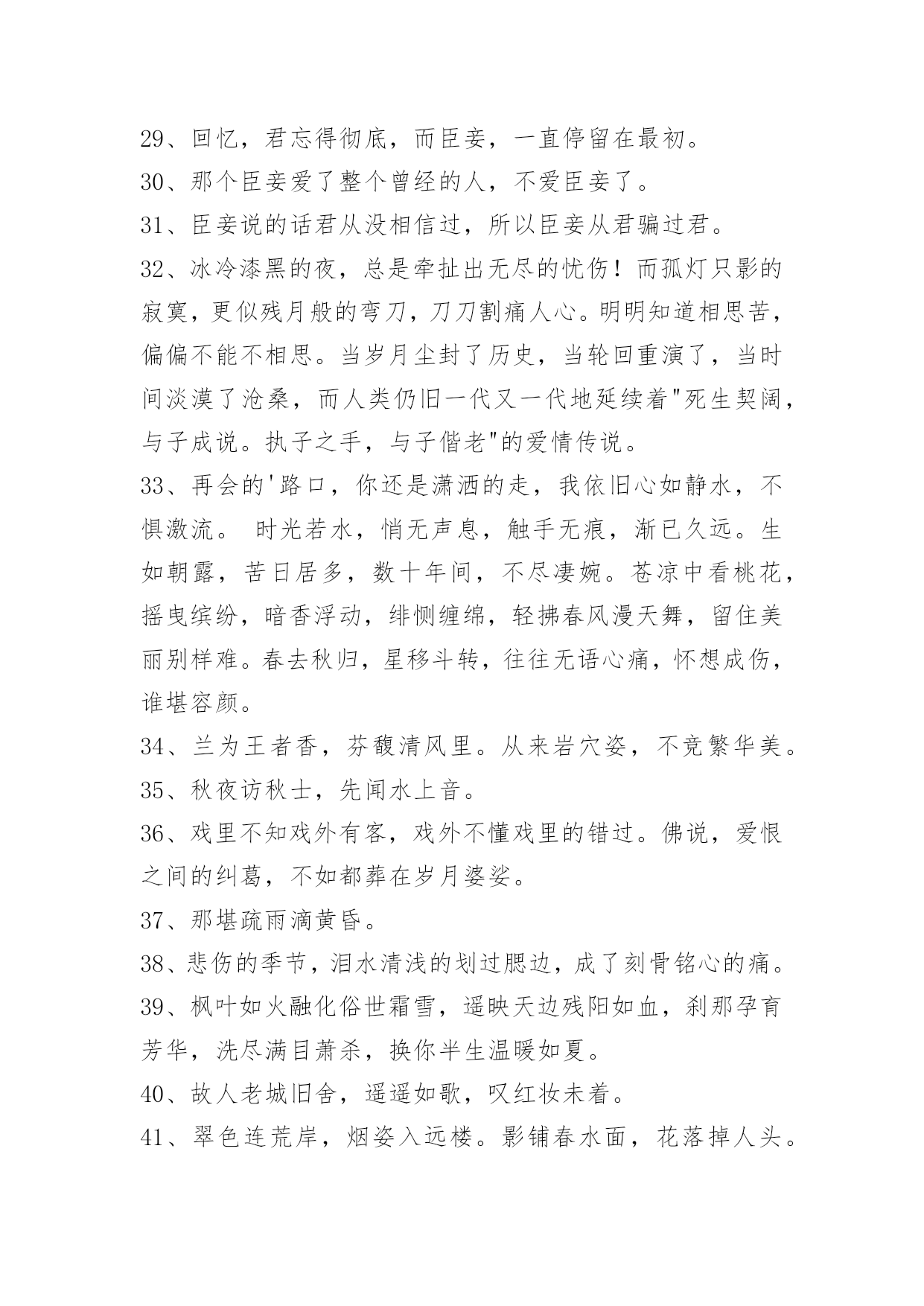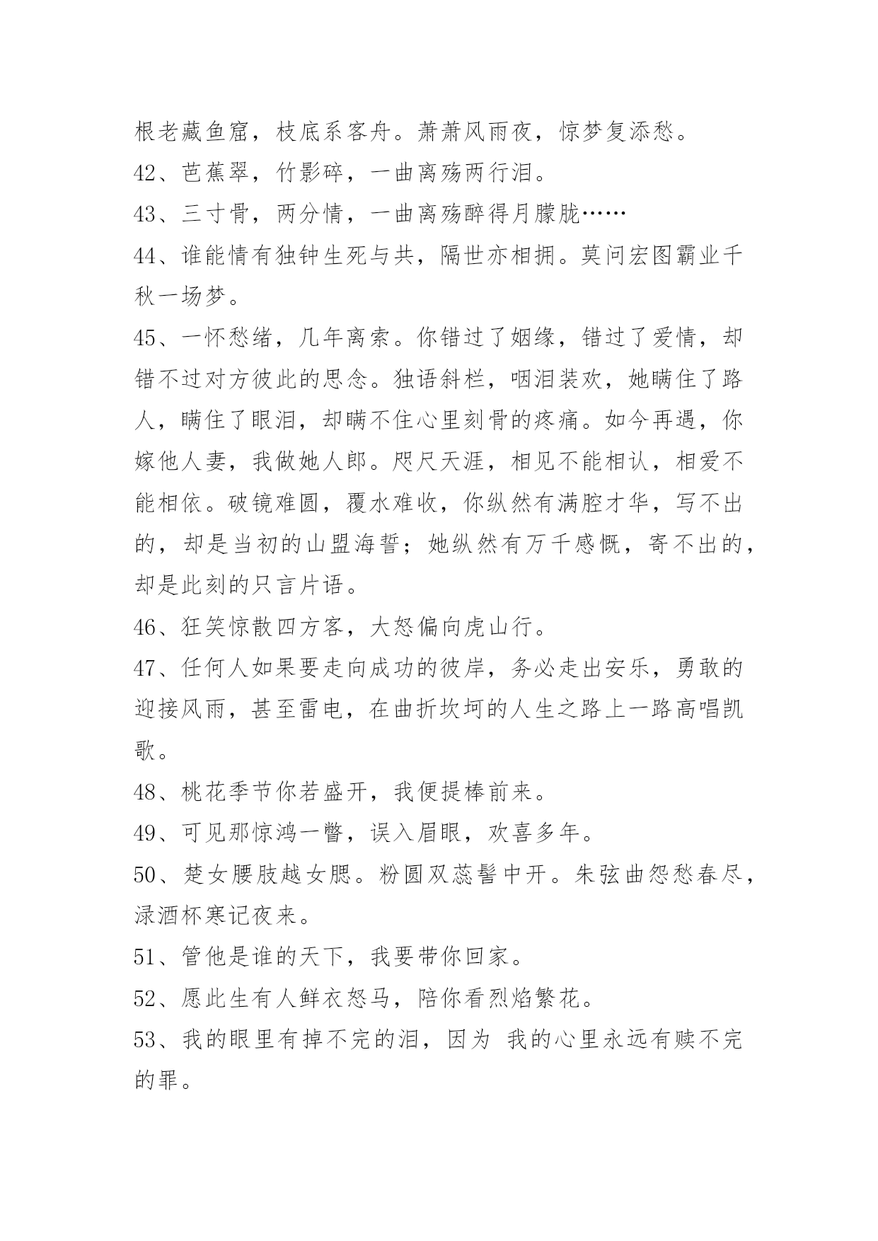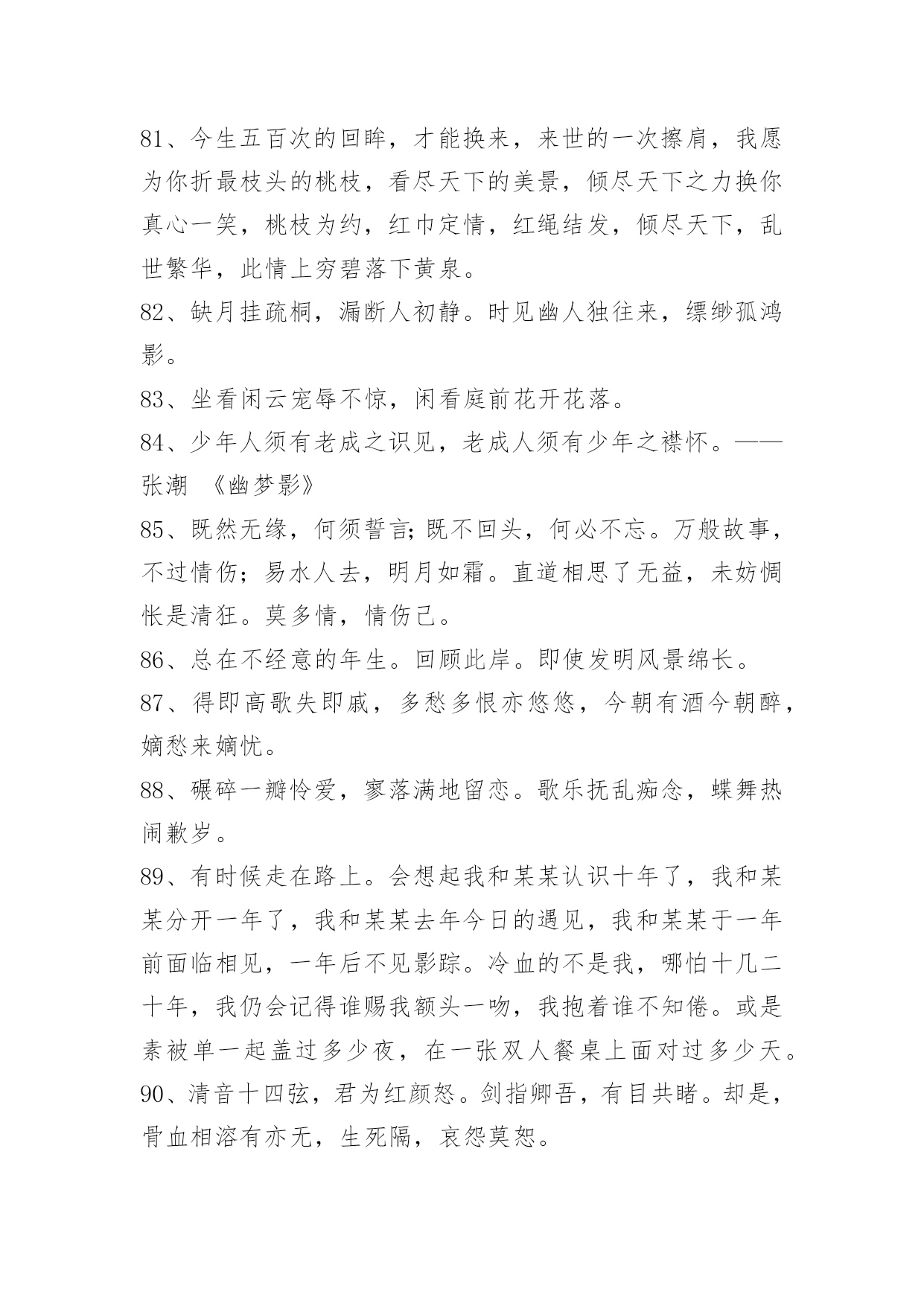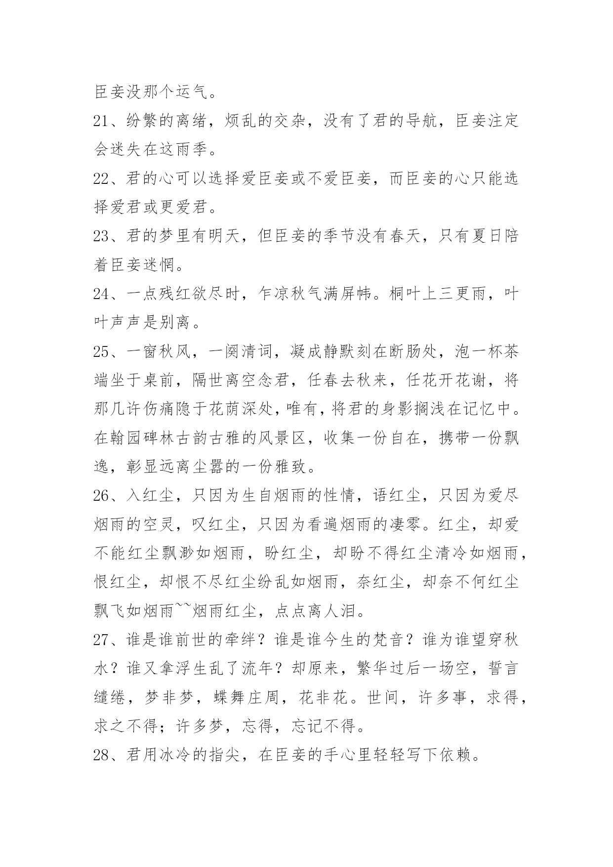 常用古风句子96条2022年常用古风句子汇编96条雨落将伞避水丝,雨住不问红伞姿。似情事亦如此,才教生死作相思。下面是小编整理的古风句子96条,欢迎大家借鉴与参考,希望对大家有所帮助。1、风过云飘雨,山形笼雾烟。浮生迷醉一回闲,绿意沁窗轩。//凄雨何须愁绝,来日艳阳高澈。自由来去觅初心,闲情笑古今。2、丁丁漏水夜何长,漫漫轻云露月光。秋逼暗虫通夕响,征衣未寄莫飞霜。3、秋来红枣压枝繁,堆向君家白玉盘。4、临别请君喝一杯故土的水,君走遍天下,也别忘了把家乡装在胸中。5、电灯下的甜美微笑,都不在微笑,钢琴键上,灰尘飞腾,古老手指交织按响,写下古典为君送行。6、千年一轮回,陌上红尘中迷醉了谁的双眼?奢靡繁世间染指了谁的昨天?穿越时空的隧道,浪迹前世的逐波。不慎迷失的旅途里再次回到梦中的江南。那一天,桃花纷飞,青丝拂柳。倩笑了半面的妆容。抚一曲,千年的瑶琴,沉醉了谁的心?迷茫中,惊鸿了那一撇,沦陷了那一眼,一沉沦便是千年。7、一生,一世;两度轮回,终于,换得一场与你厮守的幸福。于是,期待着余下的日子,能有一份平淡的相伴,便是欢乐。求的,只是倚楼听风雨的简单,只是淡看江湖路的平凡,只是笑听烟雨落的平静。为你,画地为牢,独守一份眷恋。8、欲诉衷情于云。若看到,莫要见怪。若听到,是会烦恼,还是微笑?9、一顾倾城,两嫣桃花,几许情絮,堕入凡间伴君侧。点朱砂,两黛颦颦,几番惆怅,落花有意水无情。朝惊梦,两行清泪,几多哀怨,韶华尽逝雨阑珊。盏孤灯,两鬓霜华,几载光阴,倾尽多少红颜殇。10、一叶落,褰珠箔,此时景物正萧索。楼月影寒,西风吹罗幕,往事思量着。11、锦城丝管日纷纷,半入江风半入云。曲只应天上有,人间能有几回闻?12、明月何皎皎,照我罗床纬。愁不能寐,揽衣起徘徊。行虽云乐,不如早旋归。户独彷徨,愁思当告谁!引领还入房,泪下沾裳衣。13、往事如梦,回眸,往事以化为晨风。愁离散,聆听,那一曲优伤。瞬间,再回首,缕缕青丝掩住双眸。匆的容颜以随波逐流,花前月下为谁憔悴,两行清泪为谁伤悲。月如歌,月色凄美,红尘走远,断不掉,你那柔情似水。知,谁懂,谁伤悲。14、莲花美,人心碎。青天,曲难鸣,情谁共?灯火阑珊,万千人中,伊人独舞。江抚琴雨蒙蒙,翩翩帆影何去从。起潮又落,笑面盖泪颜。纷落英,落花有人葬;叶叶相思,相思无处藏。长莺飞人不归,一池旖旎皆虚妄。恨两茫茫,不思量,爱意早苍茫。15、相思树下,一曲葬花,葬了一季桃红柳绿,葬了一季繁华盛世,也葬了今生的误入红尘。16、往事如烟,落下的总是最深的思念,你我的距离就象是明月与清泉般,只能相望却不能相依,"情"字何解?怎么落笔都不对,一曲断弦已然成殇,你的容颜成了我绘不出的青花图案,乱了我三世的遗憾,你的流年,在似锦如花的最深处走过,不是为了我,却乱了我的浮生,你一低头,写我一生的伤怀。17、往事懒述,朦朦月儿驻,风轻摇叶,瑟瑟初秋暮,淡陌相思寄哀愁,谁可慰,心思悄瘦,夜未央,谁人不寐,皎月悄落泪,身只无人随,思量或已碎,青丝晚成雪,寞见花不谢,痴痴忘勿为,千城不觅,道是轮回,忘川不忘情,自哀泣,奈何心念,不相忘,道心毁,终不成绝情,痴不放。18、这一世,你是我,遗忘千年的红颜知己,你是我,染尽了红尘,散尽了伤感的思念。起缘灭,擦肩而过,谁倾了我的城,我负了谁的心,从此,那一抹容颜遗忘天涯,了无相望。你,错过一季,那是落花的时节。身落红,裙袂飘飘,甩出柔情的水袖,恍若甩出千年的过往。19、谁翻乐府凄凉曲,风也萧萧,雨也萧萧,瘦尽灯花又一宵。知何事萦怀抱,醒也无聊,醉也无聊,梦里何曾到谢桥。20、爱他需要勇气,被他爱需要运气。臣妾有这个勇气,可臣妾没那个运气。21、纷繁的离绪,烦乱的交杂,没有了君的导航,臣妾注定会迷失在这雨季。22、君的心可以选择爱臣妾或不爱臣妾,而臣妾的心只能选择爱君或更爱君。23、君的梦里有明天,但臣妾的季节没有春天,只有夏日陪着臣妾迷惘。24、一点残红欲尽时,乍凉秋气满屏帏。桐叶上三更雨,叶叶声声是别离。25、一窗秋风,一阕清词,凝成静默刻在断肠处,泡一杯茶端坐于桌前,隔世离空念君,任春去秋来,任花开花谢,将那几许伤痛隐于花荫深处,唯有,将君的身影搁浅在记忆中。在翰园碑林古韵古雅的风景区,收集一份自在,携带一份飘逸,彰显远离尘嚣的一份雅致。26、入红尘,只因为生自烟雨的性情,语红尘,只因为爱尽烟雨的空灵,叹红尘,只因为看遍烟雨的凄零。红尘,却爱不能红尘飘渺如烟雨,盼红尘,却盼不得红尘清冷如烟雨,恨红尘,却恨不尽红尘纷乱如烟雨,奈红尘,却奈不何红尘飘飞如烟雨~~烟雨红尘,点点离人泪。27、谁是谁前世的牵绊?谁是谁今生的梵音?谁为谁望穿秋水?谁又拿浮生乱了流年?却原来,繁华过后一场空,誓言缱绻,梦非梦,蝶舞庄周,花非花。世间,许多事,求得,求之不得;许多梦,忘得,忘记不得。28、君用