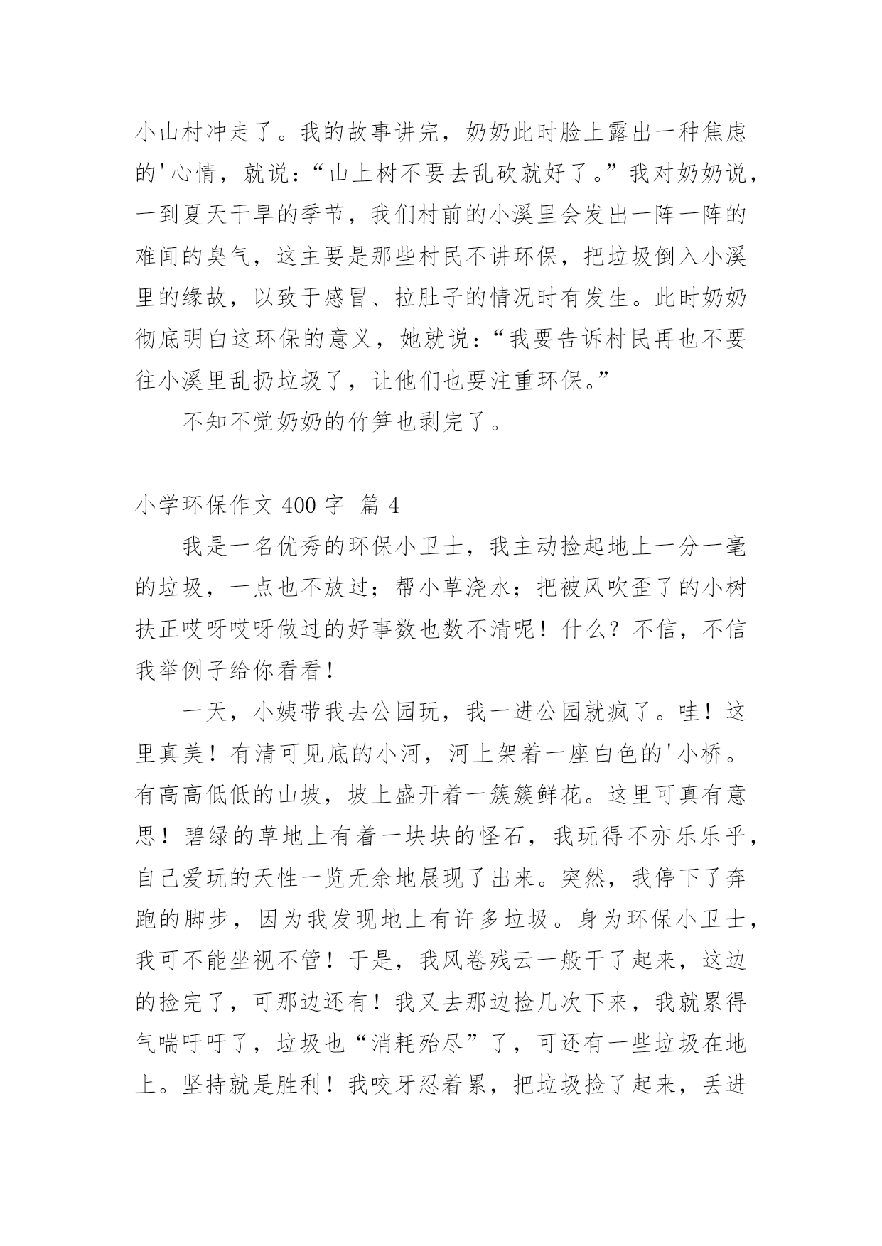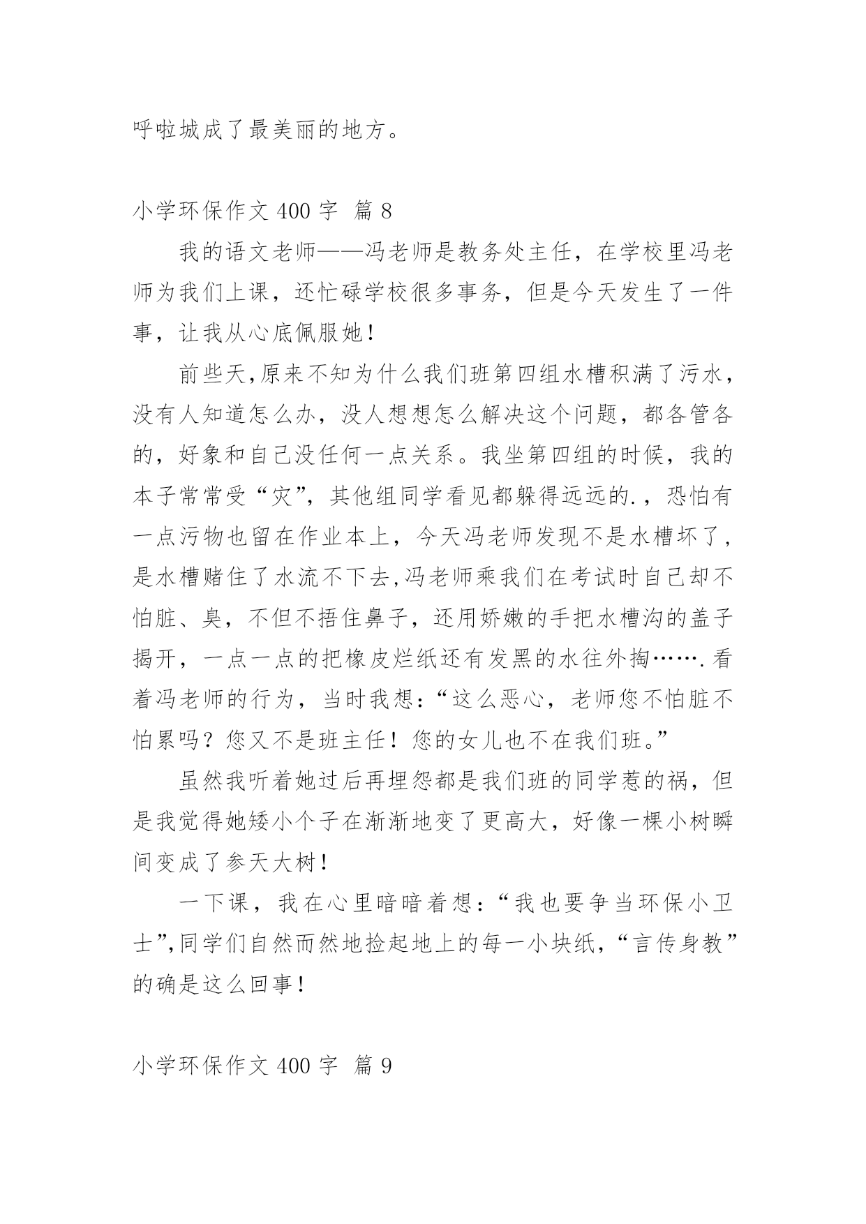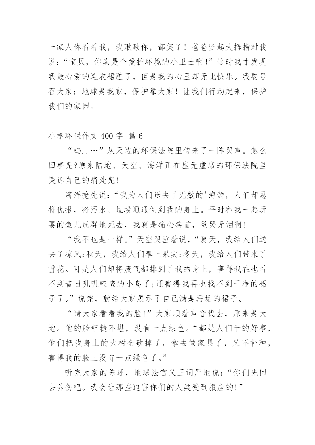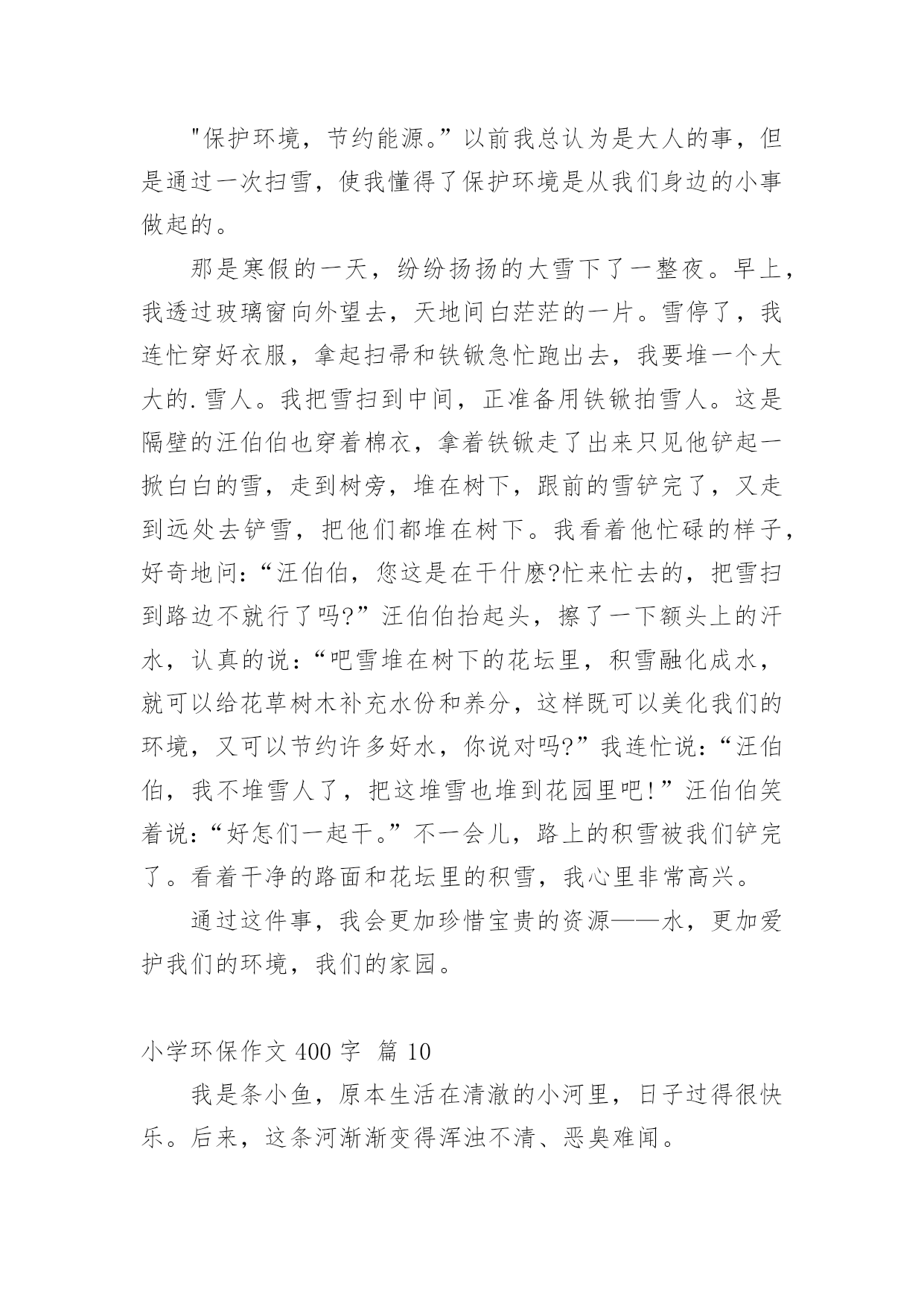 小学环保作文400字小学环保作文400字10篇[优]在日常学习、工作或生活中,大家或多或少都会接触过作文吧,作文一定要做到主题集中,围绕同一主题作深入阐述,切忌东拉西扯,主题涣散甚至无主题。你知道作文怎样才能写的好吗?下面是小编为大家收集的小学环保作文400字10篇,希望对大家有所帮助。小学环保作文400字篇1六月五日是国际环保日,每到这一天每个人都应该为环保做些什么,我也不例外。那天早上,我去一家早餐店里去吃早饭。我找了一个位子坐下,随手便拿出了我自己带的筷子吃起饭来。正在这时,来了两位衣着华丽的大姐姐。一位大姐姐说道:“服务员,拿两双筷子!”不一会儿,服务员拿着两双筷子给她们。一位大姐姐接过筷子说道:“我要的是一次性筷子,这样的筷子我们怎么敢用呢?”服务员听了,温和地说道:“你们尽管使用吧,我们这里的卫生是一流的,这里的筷子都是经过消毒的`。”那位大姐姐又应声说道:“我们怎么要相信你们?我才不会上当呢!”我听到这里,便听不下去了,就走过去,对她说:“大姐姐,你们放心用吧,这里的碗筷的确很卫生,我经常到这里吃饭的。”那位大姐姐哼了一声,说道:“那你为什么不用这里的筷子?”“因为我习惯自己带筷子。再说了,现在早就杜绝一次性筷子了因为做一次性筷子要用许多木材,所以我们要少用一次性筷子,为环保做贡献。”我把她们说的心服口服,最后还是使用了店里的筷子。我吃晚饭了,走到柜台去付钱。老板高兴地说:“刚才你说的太好了,所以这顿饭我请了!”我还是把钱给了他,并说:“谢谢您的好意,但这是我应该做的事,因为环保人人有责嘛!”走出店门,我胸前的红领巾仿佛更鲜艳了,树木也在向我招手致谢,夸我是一个环保小卫士呢!小学环保作文400字篇2昔日的地球是一个美丽的蓝色水球,外围弥漫着一层神密的薄纱;现在的地球就快变成了一个千疮百孔的灰色星球,人类的这种行为使地球毫无生机。曾经有一片大海,它与蓝天对印,与天空的小鸟做朋友。人们坐在沙滩上,孩子们玩了起来。海很静,仿佛明镜一般,倒映着蓝天白云,绿树红花,犹如一块碧玉。再看仔细一点,便可以看清海水格外清澈,连里面的细沙、石子都看得一清二楚。不过,现在的那片海已经不那么美丽了因为它已经被人类破坏了。当我心情不好的.时候,我就坐在沙滩上,把心情平静下来。那天,我跑向大海。我呆住了,眼前出现的竟是一片垃圾。我心中充满了怒气,可恶的人类,怎么可以这样伤害我们的家?于是,我暗下决心,阻止人类的行为。说行动就行动,我马上开始了计划。弟弟知道后,说我傻说我天真!我没有理会他,继续我的计划。我拿出一张纸,在纸上画了一片大海,小鸟在蓝天下翱翔,写着大海是一颗蓝宝石,请不要让它失去光彩。我把纸夹好,插在了沙滩上。我把沙滩上的垃圾捡了起来,不在有人乱丢垃圾了。此时此刻,我觉得无比地幸福,我决定要继续保护我们的家园,不让任何人去伤害它。为什么草这么绿呢?是因为有地球妈妈的滋养,可如今,我们共同的母亲地球已经憔悴了!在地球上生存的人们,让我们一起去保护她,守护她,让她露出灿烂的笑容吧!从环保做起,从节约做起吧!小学环保作文400字篇3我的奶奶是个农村人,在农村里村民都不知道“环保”两个字,把垃圾乱在马路上和小溪里,就连自家门前的不远处也会乱扔胜脏东西,所以,弄得到处都臭臭的。看到这种情况,我很心疼,原本明净、美丽的农村被被严重污染了。星期天,我决定给奶奶讲讲环保的重要性。讲什么呢?对了,先从讲故事开始,因为奶奶最喜欢我讲故事给她听。于是,我马上搬来小凳,坐在奶奶身旁帮奶奶剥笋,边剥笋边讲故事,想了一会儿,我决定讲《一外小村庄的故事》,原本是一个美丽、干净的小山村,山上树木郁郁葱葱,后来那些人把山上树砍光了,土地都有松软了,一场大雨把整个小山村冲走了。我的故事讲完,奶奶此时脸上露出一种焦虑的'心情,就说:“山上树不要去乱砍就好了。”我对奶奶说,一到夏天干旱的季节,我们村前的小溪里会发出一阵一阵的难闻的臭气,这主要是那些村民不讲环保,把垃圾倒入小溪里的缘故,以致于感冒、拉肚子的情况时有发生。此时奶奶彻底明白这环保的意义,她就说:“我要告诉村民再也不要往小溪里乱扔垃圾了,让他们也要注重环保。”不知不觉奶奶的竹笋也剥完了。小学环保作文400字篇4我是一名优秀的环保小卫士,我主动捡起地上一分一毫的垃圾,一点也不放过;帮小草浇水;把被风吹歪了的小树扶正哎呀哎呀做过的好事数也数不清呢!什么?不信,不信我举例子给你看看!一天,小姨带我去公园玩,我一进公园就疯了。哇!这里真美!有清可见底的小河,河上架着一座白色的'小桥。有高高低低的山坡,坡上盛开着一簇簇鲜花。这里可真有意思!碧绿的草地上有着一块块的怪石,我玩得不亦乐乐乎,自己爱玩的天性一览无余地展现了出来。突然,我停下了奔跑的脚步,因为我发现地上有许多垃圾。身为环保小卫士,我可不能坐视不管!于是,我风