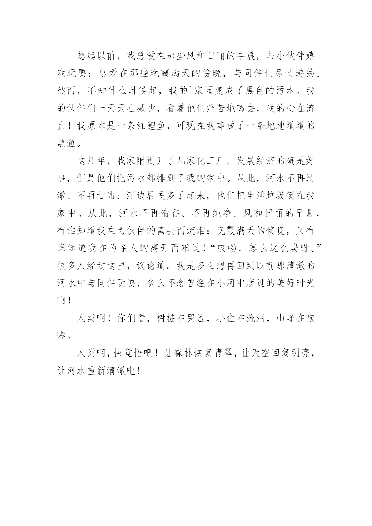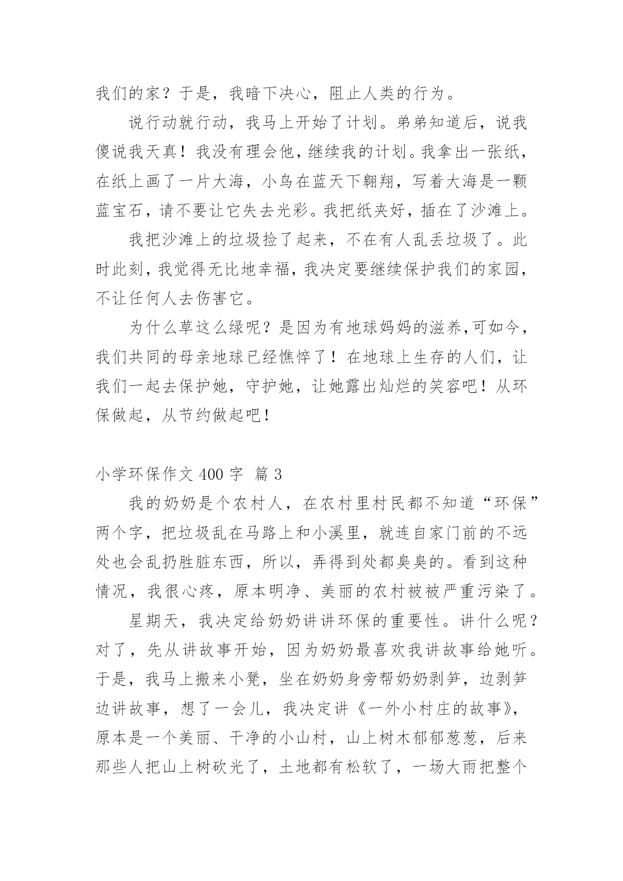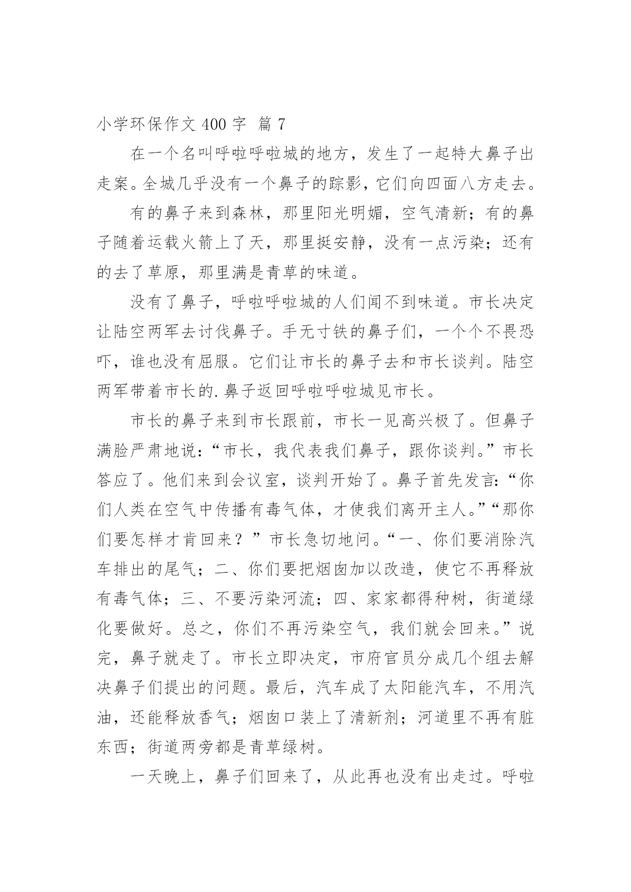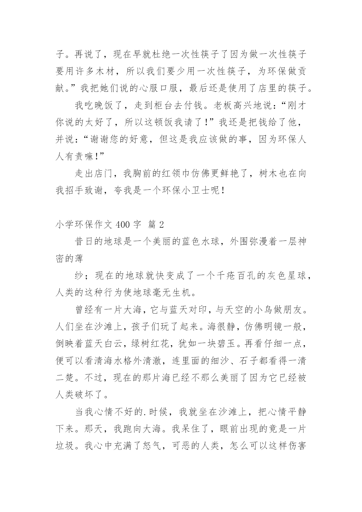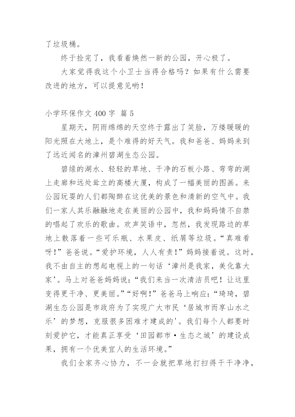 小学环保作文400字小学环保作文400字10篇[优]在日常学习、工作或生活中,大家或多或少都会接触过作文吧,作文一定要做到主题集中,围绕同一主题作深入阐述,切忌东拉西扯,主题涣散甚至无主题。你知道作文怎样才能写的好吗?下面是小编为大家收集的小学环保作文400字10篇,希望对大家有所帮助。小学环保作文400字篇1六月五日是国际环保日,每到这一天每个人都应该为环保做些什么,我也不例外。那天早上,我去一家早餐店里去吃早饭。我找了一个位子坐下,随手便拿出了我自己带的筷子吃起饭来。正在这时,来了两位衣着华丽的大姐姐。一位大姐姐说道:“服务员,拿两双筷子!”不一会儿,服务员拿着两双筷子给她们。一位大姐姐接过筷子说道:“我要的是一次性筷子,这样的筷子我们怎么敢用呢?”服务员听了,温和地说道:“你们尽管使用吧,我们这里的卫生是一流的,这里的筷子都是经过消毒的`。”那位大姐姐又应声说道:“我们怎么要相信你们?我才不会上当呢!”我听到这里,便听不下去了,就走过去,对她说:“大姐姐,你们放心用吧,这里的碗筷的确很卫生,我经常到这里吃饭的。”那位大姐姐哼了一声,说道:“那你为什么不用这里的筷子?”“因为我习惯自己带筷子。再说了,现在早就杜绝一次性筷子了因为做一次性筷子要用许多木材,所以我们要少用一次性筷子,为环保做贡献。”我把她们说的心服口服,最后还是使用了店里的筷子。我吃晚饭了,走到柜台去付钱。老板高兴地说:“刚才你说的太好了,所以这顿饭我请了!”我还是把钱给了他,并说:“谢谢您的好意,但这是我应该做的事,因为环保人人有责嘛!”走出店门,我胸前的红领巾仿佛更鲜艳了,树木也在向我招手致谢,夸我是一个环保小卫士呢!小学环保作文400字篇2昔日的地球是一个美丽的蓝色水球,外围弥漫着一层神密的薄纱;现在的地球就快变成了一个千疮百孔的灰色星球,人类的这种行为使地球毫无生机。曾经有一片大海,它与蓝天对印,与天空的小鸟做朋友。人们坐在沙滩上,孩子们玩了起来。海很静,仿佛明镜一般,倒映着蓝天白云,绿树红花,犹如一块碧玉。再看仔细一点,便可以看清海水格外清澈,连里面的细沙、石子都看得一清二楚。不过,现在的那片海已经不那么美丽了因为它已经被人类破坏了。当我心情不好的.时候,我就坐在沙滩上,把心情平静下来。那天,我跑向大海。我呆住了,眼前出现的竟是一片垃圾。我心中充满了怒气,可恶的人类,怎么可以这样伤害我们的家?于是,我暗下决心,阻止人类的行为。说行动就行动,我马上开始了计划。弟弟知道后,说我傻说我天真!我没有理会他,继续我的计划。我拿出一张纸,在纸上画了一片大海,小鸟在蓝天下翱翔,写着大海是一颗蓝宝石,请不要让它失去光彩。我把纸夹好,插在了沙滩上。我把沙滩上的垃圾捡了起来,不在有人乱丢垃圾了。此时此刻,我觉得无比地幸福,我决定要继续保护我们的家园,不让任何人去伤害它。为什么草这么绿呢?是因为有地球妈妈的滋养,可如今,我们共同的母亲地球已经憔悴了!在地球上生存的人们,让我们一起去保护她,守护她,让她露出灿烂的笑容吧!从环保做起,从节约做起吧!小学环保作文400字篇3我的奶奶是个农村人,在农村里村民都不知道“环保”两个字,把垃圾乱在马路上和小溪里,就连自家门前的不远处也会乱扔胜脏东西,所以,弄得到处都臭臭的。看到这种情况,我很心疼,原本明净、美丽的农村被被严重污染了。星期天,我决定给奶奶讲讲环保的重要性。讲什么呢?对了,先从讲故事开始,因为奶奶最喜欢我讲故事给她听。于是,我马上搬来小凳,坐在奶奶身旁帮奶奶剥笋,边剥笋边讲故事,想了一会儿,我决定讲《一外小村庄的故事》,原本是一个美丽、干净的小山村,山上树木郁郁葱葱,后来那些人把山上树砍光了,土地都有松软了,一场大雨把整个小山村冲走了。我的故事讲完,奶奶此时脸上露出一种焦虑的'心情,就说:“山上树不要去乱砍就好了。”我对奶奶说,一到夏天干旱的季节,我们村前的小溪里会发出一阵一阵的难闻的臭气,这主要是那些村民不讲环保,把垃圾倒入小溪里的缘故,以致于感冒、拉肚子的情况时有发生。此时奶奶彻底明白这环保的意义,她就说:“我要告诉村民再也不要往小溪里乱扔垃圾了,让他们也要注重环保。”不知不觉奶奶的竹笋也剥完了。小学环保作文400字篇4我是一名优秀的环保小卫士,我主动捡起地上一分一毫的垃圾,一点也不放过;帮小草浇水;把被风吹歪了的小树扶正哎呀哎呀做过的好事数也数不清呢!什么?不信,不信我举例子给你看看!一天,小姨带我去公园玩,我一进公园就疯了。哇!这里真美!有清可见底的小河,河上架着一座白色的'小桥。有高高低低的山坡,坡上盛开着一簇簇鲜花。这里可真有意思!碧绿的草地上有着一块块的怪石,我玩得不亦乐乐乎,自己爱玩的天性一览无余地展现了出来。突然,我停下了奔跑的脚步,因为我发现地上有许多垃圾。身为环保小卫士,我可不能坐视不管!于是,我风