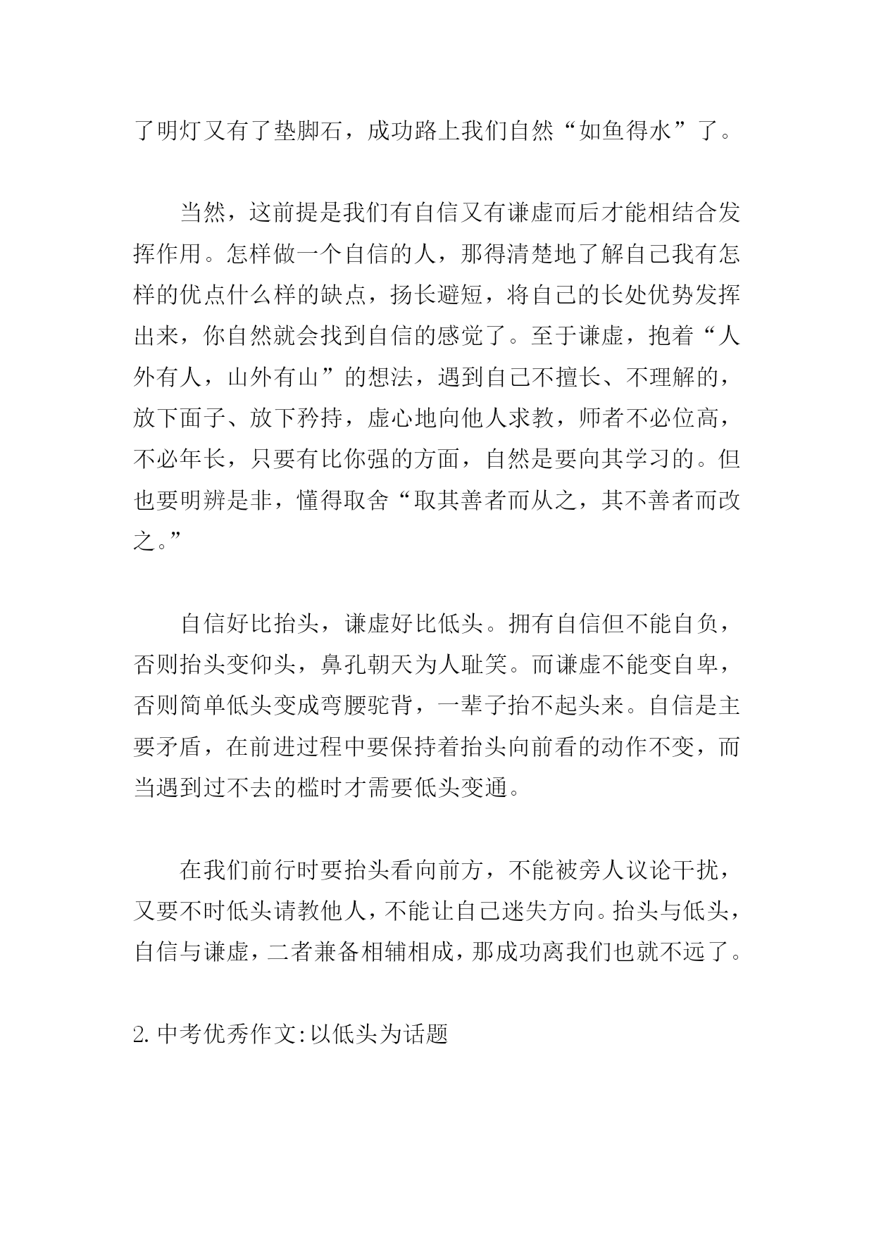 中考优秀作文:以低头为话题1.中考优秀作文:以低头为话题一个成功的人自然具备多种美好的品质,而自信与谦虚是两个必须兼备的品质。自信好比成功路上的明灯,让我们能够看清方向。一个有自信的人才会有明确的方向和目标,才会坚持自己的理想。放眼社会,有多少有志青年在踏入社会后将理想彻底抛弃了。谦虚好比是成功路上的垫脚石,在到达成功的过程中总免不了遇到泥泞的小路或湍急的河流,自己一人无法解决时,谦虚就发挥了它的作用,虚心向人讨教,借鉴别人的经验,成功地踩着垫脚石走出泥泞的小路或越过湍急的河流。如果自信和谦虚脱离了,那你的成功路也许会变得十分艰难。没有了谦虚为伴,盲目的自信会变成自大。六年前诺基亚断言苹果不会成为他们强有力的对手,而今天,苹果占据了主要市场诺基亚却消退了。同样地,离开了自信的谦虚就变成了一味的低头,最终在别人的建议声中迷失自己。只有自信与谦虚同时具兼备,才能顺利获得成功。既有了明灯又有了垫脚石,成功路上我们自然“如鱼得水”了。当然,这前提是我们有自信又有谦虚而后才能相结合发挥作用。怎样做一个自信的人,那得清楚地了解自己我有怎样的优点什么样的缺点,扬长避短,将自己的长处优势发挥出来,你自然就会找到自信的感觉了。至于谦虚,抱着“人外有人,山外有山”的想法,遇到自己不擅长、不理解的,放下面子、放下矜持,虚心地向他人求教,师者不必位高,不必年长,只要有比你强的方面,自然是要向其学习的。但也要明辨是非,懂得取舍“取其善者而从之,其不善者而改之。”自信好比抬头,谦虚好比低头。拥有自信但不能自负,否则抬头变仰头,鼻孔朝天为人耻笑。而谦虚不能变自卑,否则简单低头变成弯腰驼背,一辈子抬不起头来。自信是主要矛盾,在前进过程中要保持着抬头向前看的动作不变,而当遇到过不去的槛时才需要低头变通。在我们前行时要抬头看向前方,不能被旁人议论干扰,又要不时低头请教他人,不能让自己迷失方向。抬头与低头,自信与谦虚,二者兼备相辅相成,那成功离我们也就不远了。2.中考优秀作文:以低头为话题雪松懂得低头,能够造就一片上头的翠绿;海鸥懂得低头,可以忍受狂风暴雨的冲击;如果我能学会低头,可能就不会发生那件事了。那年我十岁了,但还是那样倔强。大概是暑假的一天,爸爸买回来一个大西瓜,他把西瓜切开,我和妹妹都去争那块的,自然是我赢了,妹妹便坐在地上大哭,爸爸顿时也手足无措了。这时,妈妈生气地走进来,把我还未啃完的西瓜从我手中打落,严厉地说:“吃吃吃,就知道吃。”妈妈歇了一口气,又接着骂道:“你看看你,姐姐没个姐姐样,不知道让着妹妹,自私。”听到这里,我再也抑制不住了,大声吼起来:“是呀,我是没姐姐样,难道为了让你们开心,我就要按照你们说的去做吗?”“翅膀长硬了,想飞了。”说完,妈妈抡起棍子,就向我打来。我仍不认错,跑进我的房间,“砰”一声关上了房门这样倔强的性格,也一直伴随我进入初中,直到有一次那天,我很烦躁,走进教室,看见一黑板的作业,自然就别提多急了。于是,三下五除二地抄了题,做完作业,便摆在桌子上,自己哼着小曲出去玩了。回来的时候,我看见小玲坐在我位子上。她一看见我回来,就拿着我刚才做的作业跑过来,热情地对我说:“过来一下,你这几道题错了,你看。”我不屑一顾地说:“是你错了吧,我怎么可能会错呢。”她仍说:“你的确错了。”我轻蔑地笑了一下,便走到另一个同学那儿去了,只给她留下了一个背影。第二天,我刚走到教室门口,就听见小月在对几个同学说:“我还当她多厉害,这是她的卷子,错了七八个。”她一边说,一边向大家展示我的卷子。我望着他们,连去抢卷子的勇气都没有了,看着小玲那被一百分映得灿烂的脸,我终于低下了头。的确,人生如一泓水,温存而灵动,懂得屈伸自如,学会低头这种智慧会使你困境中得到柳暗花明的转机。3.中考优秀作文:以低头为话题抬头,把自己的头抬起来,低头,把自己的头低下来。这两个很简单的动作,头只要轻轻的一动就可以做到,但是,往往这两个很简单的动作却被赋予了一个重要的意义,那就是“尊严”。尊严是不可以践踏的尊严也是不融践踏的,在中国悠悠五千年的历史长河中,被这两个动作所折磨的人不计其数,但是又有几个可以驾驭这两个动作驾驭这自己的尊严在历史的长河中扬帆起舞。屈原这个人大家都非常熟悉,他就是不容自己自己的尊严被践踏,不与世俗同流合污的精神被世人铭记,屈原从小生活在贵族家庭中,得到的思想教育也是十分高尚的,为什么就不会察言观色呢?屈原不是不会而是不愿与那些人一起同流合污,他代表着自己的理想,代表着自己的尊严,代表着自己的一切一切,就是因为自己所代表的以及自己自己的品格,屈原才会向那江上纵身一跃。他那一跳是仰望天空的,是看着天空与漂泊的白云,没有向那江上看一眼,他是不愿也是不屑的向江中
