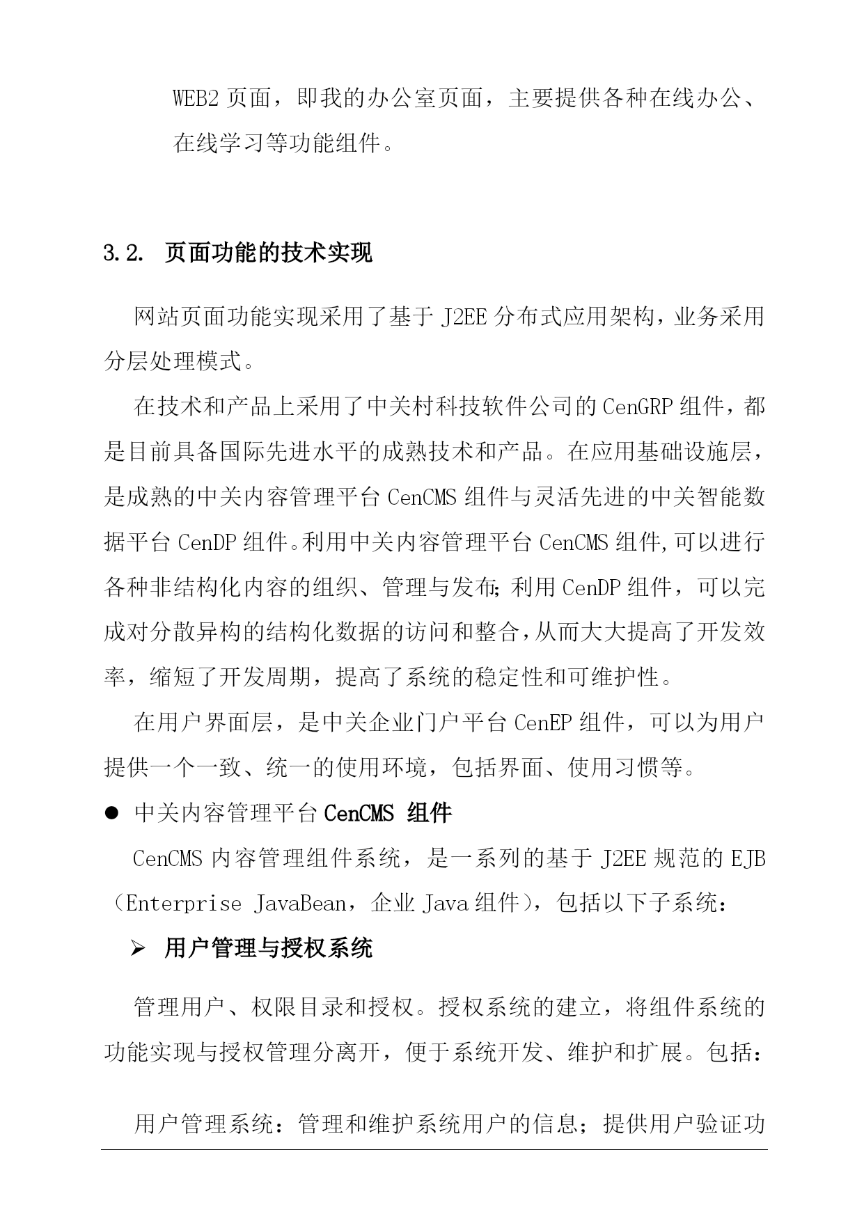 北京市内网平台案例介绍TOC\o"1-3"\h\z\uHYPERLINK\l"_Toc36534432"项目背景PAGEREF_Toc36534432\h2HYPERLINK\l"_Toc36534433"规划项目内容PAGEREF_Toc36534433\h2HYPERLINK\l"_Toc36534434"2.1对2.0版栏目与内容的调整PAGEREF_Toc36534434\h2HYPERLINK\l"_Toc36534435"2.2个性化办公页面的设计PAGEREF_Toc36534435\h3HYPERLINK\l"_Toc36534436"2.3安全认证机制的完善PAGEREF_Toc36534436\h3HYPERLINK\l"_Toc36534437"2.4一站式服务PAGEREF_Toc36534437\h3HYPERLINK\l"_Toc36534438"2.5协同办公与工作流PAGEREF_Toc36534438\h3HYPERLINK\l"_Toc36534439"2.6支持空间数据库的整合PAGEREF_Toc36534439\h4HYPERLINK\l"_Toc36534440"2.7在门户平台中集成办公自动化功能PAGEREF_Toc36534440\h4HYPERLINK\l"_Toc36534441"项目实现内容与技术实现PAGEREF_Toc36534441\h5HYPERLINK\l"_Toc36534442"3.1.网站总体架构PAGEREF_Toc36534442\h5HYPERLINK\l"_Toc36534443"3.2.页面功能的技术实现PAGEREF_Toc36534443\h7HYPERLINK\l"_Toc36534444"项目评价PAGEREF_Toc36534444\h12HYPERLINK\l"_Toc36534445"4.1生产效率评价PAGEREF_Toc36534445\h12HYPERLINK\l"_Toc36534446"4.2技术方法评价PAGEREF_Toc36534446\h13HYPERLINK\l"_Toc36534447"4.3产品质量评价PAGEREF_Toc36534447\h13HYPERLINK\l"_Toc36534448"4.4经验和教训PAGEREF_Toc36534448\h13项目背景随着信息技术的发展,信息化水平已成为衡量一个国家现代化水平和综合国力的重要标志。应用信息技术服务社会、管理社会,是促进信息技术发展和应用必然需要,也是政府信息化的首要目标。以信息网络技术应用为基础,建设电子政府系统,实施电子政务,才能有效保证以网络为基础的社会和经济秩序,电子政务是信息化社会的基础。北京市信息资源管理中心成立于2001年3月,是北京市信息化工作办公室所属的事业单位,是为北京市信息资源开发与利用提供保障服务的管理机构。北京市信息资源管理中心作为首都信息资源的共享交换中心,致力于首都信息资源的开发利用及整合共享。由北京市信息资源管理中心负责建设的政务内网门户网站(2.0版本)已经完成,主要实现了四个委办局(市农委、市林业局、市水利局、市信息资源管理中心)的七个应用系统及数据库的整合。同时完成了门户网站静态网页的制作、门户网站动态信息的发布,以及门户网站的用户注册、管理员功能模块、基于关键字的检索等功能。为了更为有效的实现各委办局之间的信息共享,并保证各类信息的安全可靠的被使用,因此决定通过建立一个政务内网门户网站将各类应用系统进行个性化的整合,并通过安全认证的方式,对用户的使用权限进行管理。规划项目内容按照北京市信息资源网中心工程总体设计,进一步开发、改进和调整北京市政务内网门户2.0版的内容与功能,推进北京市信息资源网的信息资源共享整合和应用集成,促进北京市政务内网工程的建设和应用。参考北京市政务管理的有关要求,并结合2.1版作为向领导进行演示汇报的功能定位,最后双方确认项目内容如下:对2.0版栏目与内容的调整按照北京市政务管理的有关要求,调整现有门户上的栏目与内容。在风格设计时要注意内网与外网风格的统一。要体现出政府网站与政务内网的不同,突出其门户特点,强调符合政务办公的流程,成为北京市政府提高政务办公效率和质量的工具。在内容设计上要体现出市领导关心的热点、焦点内容(如十六大、2002年北京市