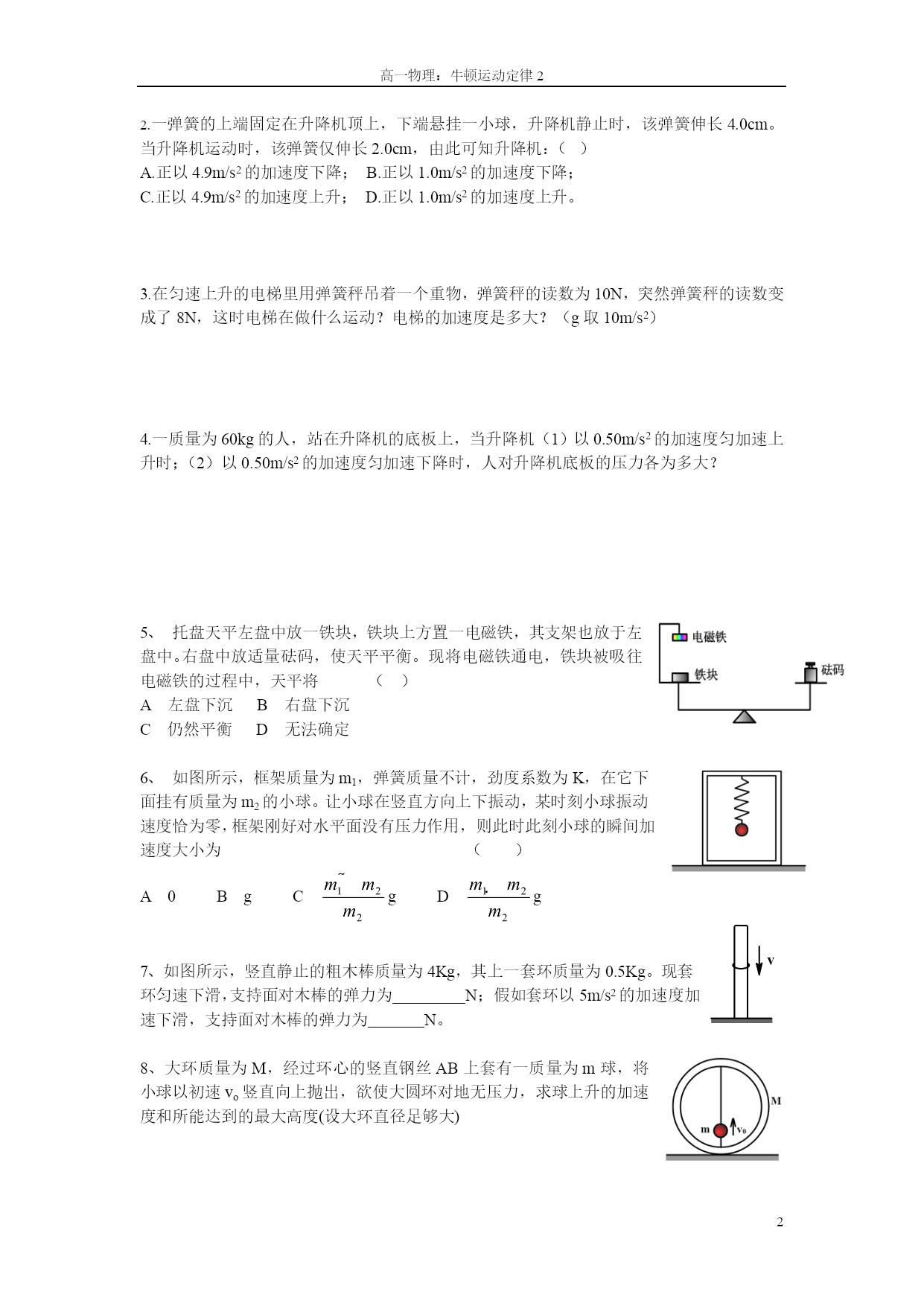 高一物理:牛顿运动定律22.在倾角为30º的光滑斜面上,用平行于斜面向上的力F把物体m推上去,其加速度大小恰好等于不加F时物体下滑的加速度,则F的大小等于多少?3.质量为20kg的物体若用20N的水平力牵引它,刚好能在水平面上匀速前进。求:若改用50N拉力沿与水平方向成的夹角向斜上方拉它,使物体由静止出发在水平面上前进2.3m,它的速度多大?在前进2.3m时撤去拉力,又经过3s钟,物体的速度多大?物体总共通过多大位移?(g取10m/s2)4.如图所示,物体A的质量为10kg,放在水平地面上,物体A与地面间动摩擦因数μ=0.2,如果用与水平成30°倾角的力拉它,为了产生1m/s2的加速度,F需要多大?(g=10m/s2)6、风洞实验室中可产生水平方向、大小可以调节的风力,现将一套有小球的细直杆放入风洞实验室,小球直径略大于细杆直径,如图所示,(1)当杆在水平方向上固定时,调节风力的大小,使小球在杆上做匀速运动,这时小球所受的风力为小球重力的0.5倍,求小球与杆间的动摩擦因数。(2)保持小球所受风力不变,使杆与水平方向间夹角为37°并固定,则小球从静止出发在细杆上滑下距离s所需的时间为多少?(sin37°=0.6,coa37°=0.8)1、蹦床是运动员在一张绷紧的弹性网上蹦跳、翻滚并做各种空中动作的运动项目。一个质量为60Kg的运动员,从离水平网面3.2m高处自由下落,着网后沿竖直方向蹦回离水平网面5.0m高处。已知运动员与网接触的时间为1.2s。若把在这段时间内网队运动员的作用力当作恒力处理,求此力的大小。2.一弹簧的上端固定在升降机顶上,下端悬挂一小球,升降机静止时,该弹簧伸长4.0cm。当升降机运动时,该弹簧仅伸长2.0cm,由此可知升降机:()A.正以4.9m/s2的加速度下降;B.正以1.0m/s2的加速度下降;C.正以4.9m/s2的加速度上升;D.正以1.0m/s2的加速度上升。3.在匀速上升的电梯里用弹簧秤吊着一个重物,弹簧秤的读数为10N,突然弹簧秤的读数变成了8N,这时电梯在做什么运动?电梯的加速度是多大?(g取10m/s2)4.一质量为60kg的人,站在升降机的底板上,当升降机(1)以0.50m/s2的加速度匀加速上升时;(2)以0.50m/s2的加速度匀加速下降时,人对升降机底板的压力各为多大?5、托盘天平左盘中放一铁块,铁块上方置一电磁铁,其支架也放于左盘中。右盘中放适量砝码,使天平平衡。现将电磁铁通电,铁块被吸往电磁铁的过程中,天平将()A左盘下沉B右盘下沉C仍然平衡D无法确定6、如图所示,框架质量为m1,弹簧质量不计,劲度系数为K,在它下面挂有质量为m2的小球。让小球在竖直方向上下振动,某时刻小球振动速度恰为零,框架刚好对水平面没有压力作用,则此时此刻小球的瞬间加速度大小为()A0BgCgDg7、如图所示,竖直静止的粗木棒质量为4Kg,其上一套环质量为0.5Kg。现套环匀速下滑,支持面对木棒的弹力为N;假如套环以5m/s2的加速度加速下滑,支持面对木棒的弹力为N。8、大环质量为M,经过环心的竖直钢丝AB上套有一质量为m球,将小球以初速vo竖直向上抛出,欲使大圆环对地无压力,求球上升的加速度和所能达到的最大高度(设大环直径足够大)