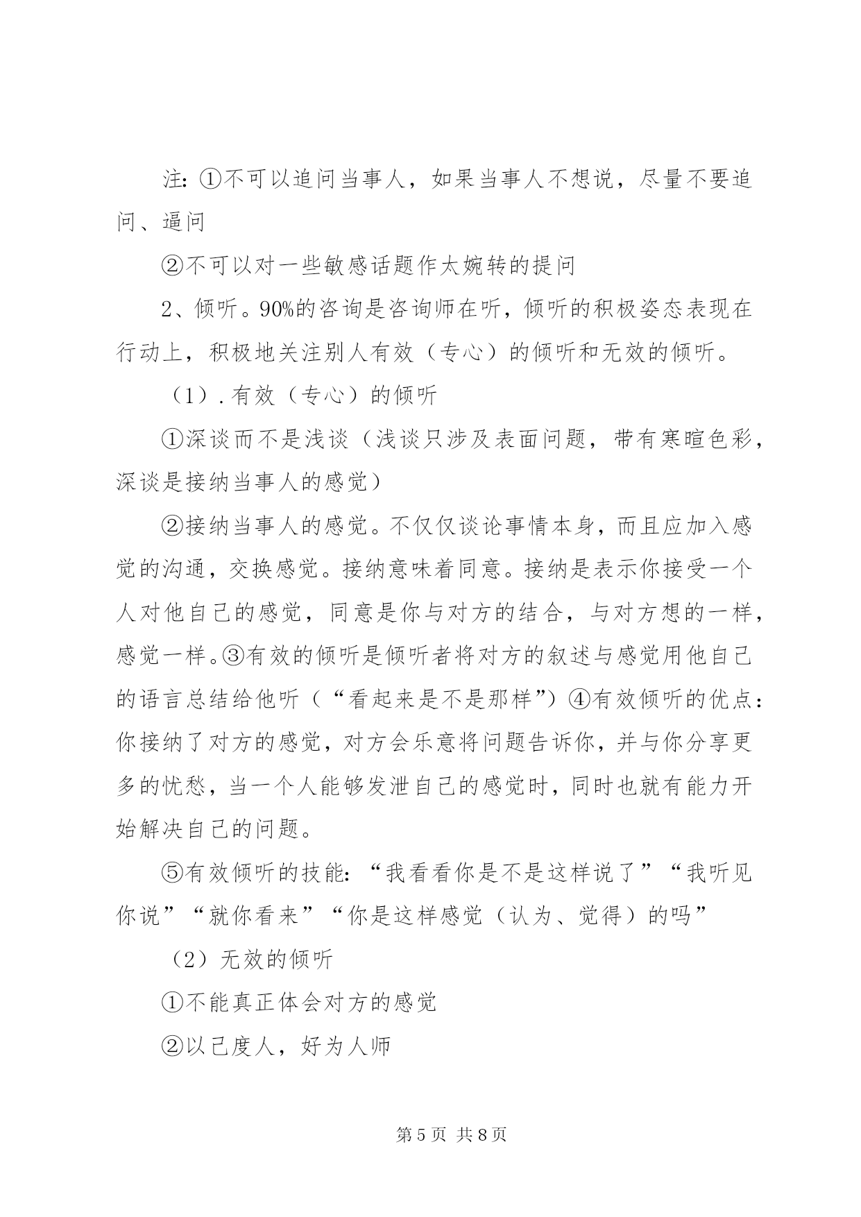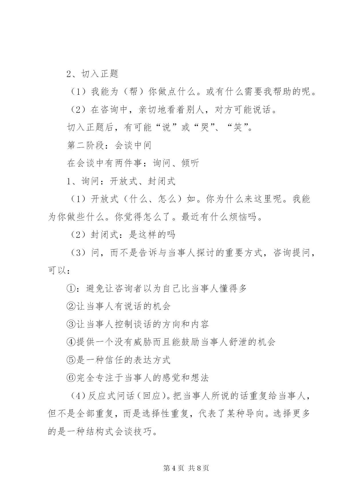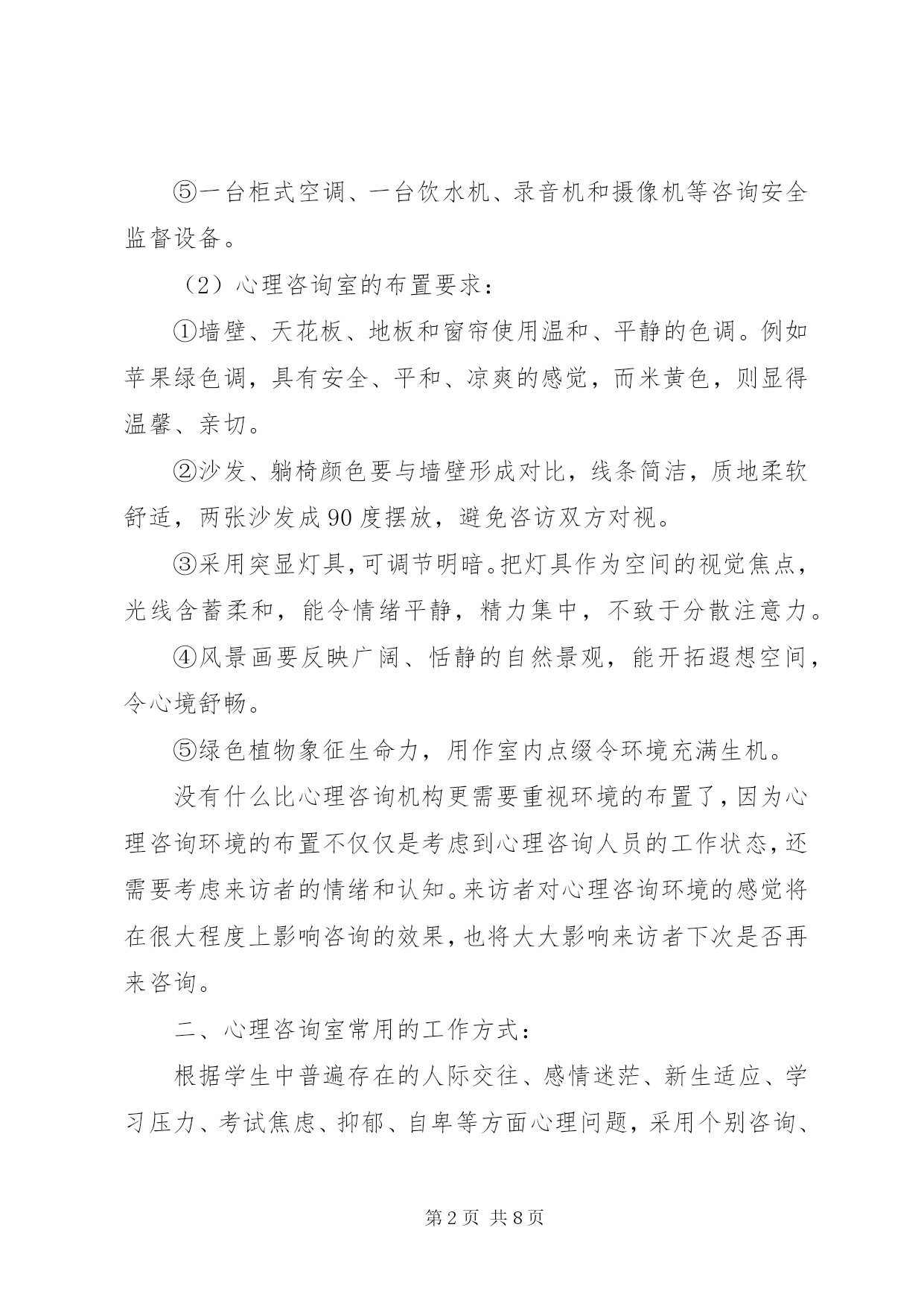 第PAGE\*Arabic\*MERGEFORMAT8页共NUMPAGES\*MERGEFORMAT8页心理咨询室建设经费申请报告一、心理咨询室的环境布置:心理咨询室的功能有“个体咨询”、“教师办公”、“团体辅导”和“测试及心理档案”,从而提高功能室的面积利用率,并使整个室内规划具有系统性和多功能性。1.工作运作。要求每周开放6小时以上,每学期1次室外大型咨询活动。2.心理咨询室布置要求:实用面积约30平方米(5m*6m)。太大:不安全,太小:压迫感。(1)基本配置包括:①一张办公桌,配有电话、电脑(内装心理测试档案系统)、打印机。②一个书架,分装若干心理书籍和报刊,一盏可调明暗的立地灯;灯光需明亮一点。还要有全身单面镜,用于观察矫正不当行为。③一张舒适的软沙发,一张圆形茶几,上面放有纸巾盒、糖果、点心、小盆栽;抱枕要形状多样、色彩灿烂,令室内环境轻松、活泼。④墙壁挂《学校心理咨询工作守则》,《心理咨询室使用规则》,风景画等。心理咨询接待表格、心理常识海报或背景音乐。⑤一台柜式空调、一台饮水机、录音机和摄像机等咨询安全监督设备。(2)心理咨询室的布置要求:①墙壁、天花板、地板和窗帘使用温和、平静的色调。例如苹果绿色调,具有安全、平和、凉爽的感觉,而米黄色,则显得温馨、亲切。②沙发、躺椅颜色要与墙壁形成对比,线条简洁,质地柔软舒适,两张沙发成90度摆放,避免咨访双方对视。③采用突显灯具,可调节明暗。把灯具作为空间的视觉焦点,光线含蓄柔和,能令情绪平静,精力集中,不致于分散注意力。④风景画要反映广阔、恬静的自然景观,能开拓遐想空间,令心境舒畅。⑤绿色植物象征生命力,用作室内点缀令环境充满生机。没有什么比心理咨询机构更需要重视环境的布置了,因为心理咨询环境的布置不仅仅是考虑到心理咨询人员的工作状态,还需要考虑来访者的情绪和认知。来访者对心理咨询环境的感觉将在很大程度上影响咨询的效果,也将大大影响来访者下次是否再来咨询。二、心理咨询室常用的工作方式:根据学生中普遍存在的人际交往、感情迷茫、新生适应、学习压力、考试焦虑、抑郁、自卑等方面心理问题,采用个别咨询、团体义务咨询、心理行为训练、书信咨询(“心语”信箱)、热线咨询、电子信箱、现场咨询、讲座、观看心理影片、表演心理剧、心理知识竞赛等灵活丰富的工作方式,向学生提供经常、及时、有效的心理健康指导与服务。1.“信箱”“信箱”是心理咨询室专门为学生进行心理问题咨询而开设的。随着社会的发展,中学生心理问题也越来越多,而出于某些原因,好多同学不愿与心理咨询师进行面对面交流。2.探求心灵的声音菁菁的校园,中学生们是流动的生命之源,是美丽的青春风景线。这儿有浓郁的活力,强烈的渴求,密集的信息,浪漫的旋律。中学是人生旅途的重要驿站,是生命茁壮成长的关键时期,更是心理从幼稚走向成熟的微妙阶段。学习观、价值观在这儿碰撞,世界观、人生观在这儿形成。三、心理咨询室进行咨询的步骤:咨询一般控制在40分钟内,分为三个阶段:开始会谈会谈中间结束会谈第一阶段:开始会谈1、寒暄:话题(1)针对当事人(2)针对咨询师(3)中性话题若来访者很严肃,已经准备好,可省略寒暄,进入正题2、切入正题(1)我能为(帮)你做点什么。或有什么需要我帮助的呢。(2)在咨询中,亲切地看着别人,对方可能说话。切入正题后,有可能“说”或“哭”、“笑”。第二阶段:会谈中间在会谈中有两件事:询问、倾听1、询问:开放式、封闭式(1)开放式(什么、怎么)如。你为什么来这里呢。我能为你做些什么。你觉得怎么了。最近有什么烦恼吗。(2)封闭式:是这样的吗(3)问,而不是告诉与当事人探讨的重要方式,咨询提问,可以:①:避免让咨询者以为自己比当事人懂得多②让当事人有说话的机会③让当事人控制谈话的方向和内容④提供一个没有威胁而且能鼓励当事人舒泄的机会⑤是一种信任的表达方式⑥完全专注于当事人的感觉和想法(4)反应式问话(回应)。把当事人所说的话重复给当事人,但不是全部重复,而是选择性重复,代表了某种导向。选择更多的是一种结构式会谈技巧。注:①不可以追问当事人,如果当事人不想说,尽量不要追问、逼问②不可以对一些敏感话题作太婉转的提问2、倾听。90%的咨询是咨询师在听,倾听的积极姿态表现在行动上,积极地关注别人有效(专心)的倾听和无效的倾听。(1).有效(专心)的倾听①深谈而不是浅谈(浅谈只涉及表面问题,带有寒暄色彩,深谈是接纳当事人的感觉)②接纳当事人的感觉。不仅仅谈论事情本身,而且应加入感觉的沟通,交换感觉。接纳意味着同意。接纳是表示你接受一个人对他自己的感觉,同意是你与对方的结合,与对方想的一样,感觉一样。③有效的倾听是倾听者将对方的叙述与感觉用他自己的语言总结给他听(“看起来是不是那样”)④有效倾听的优点:你接纳了对方的感觉,对方会乐