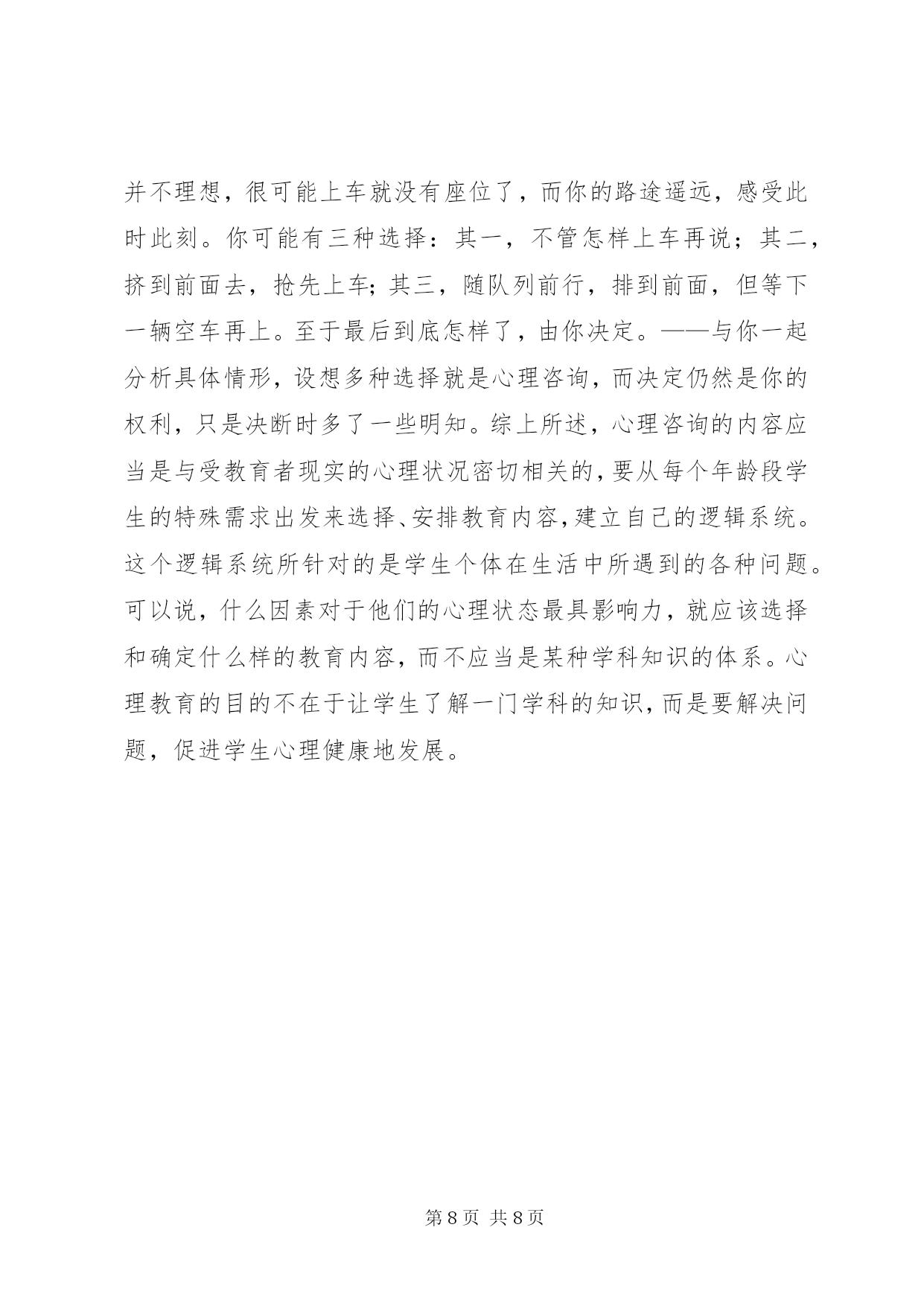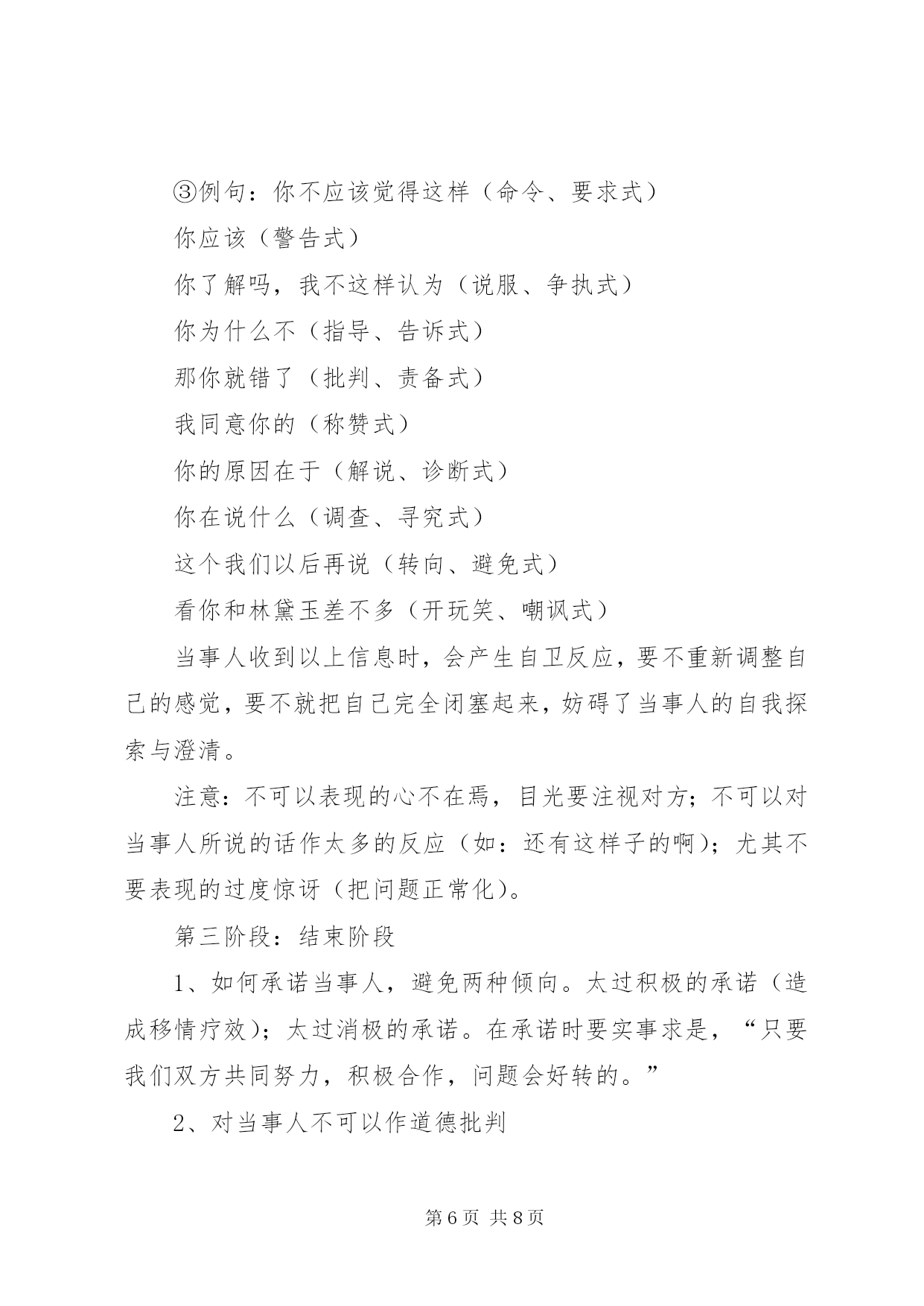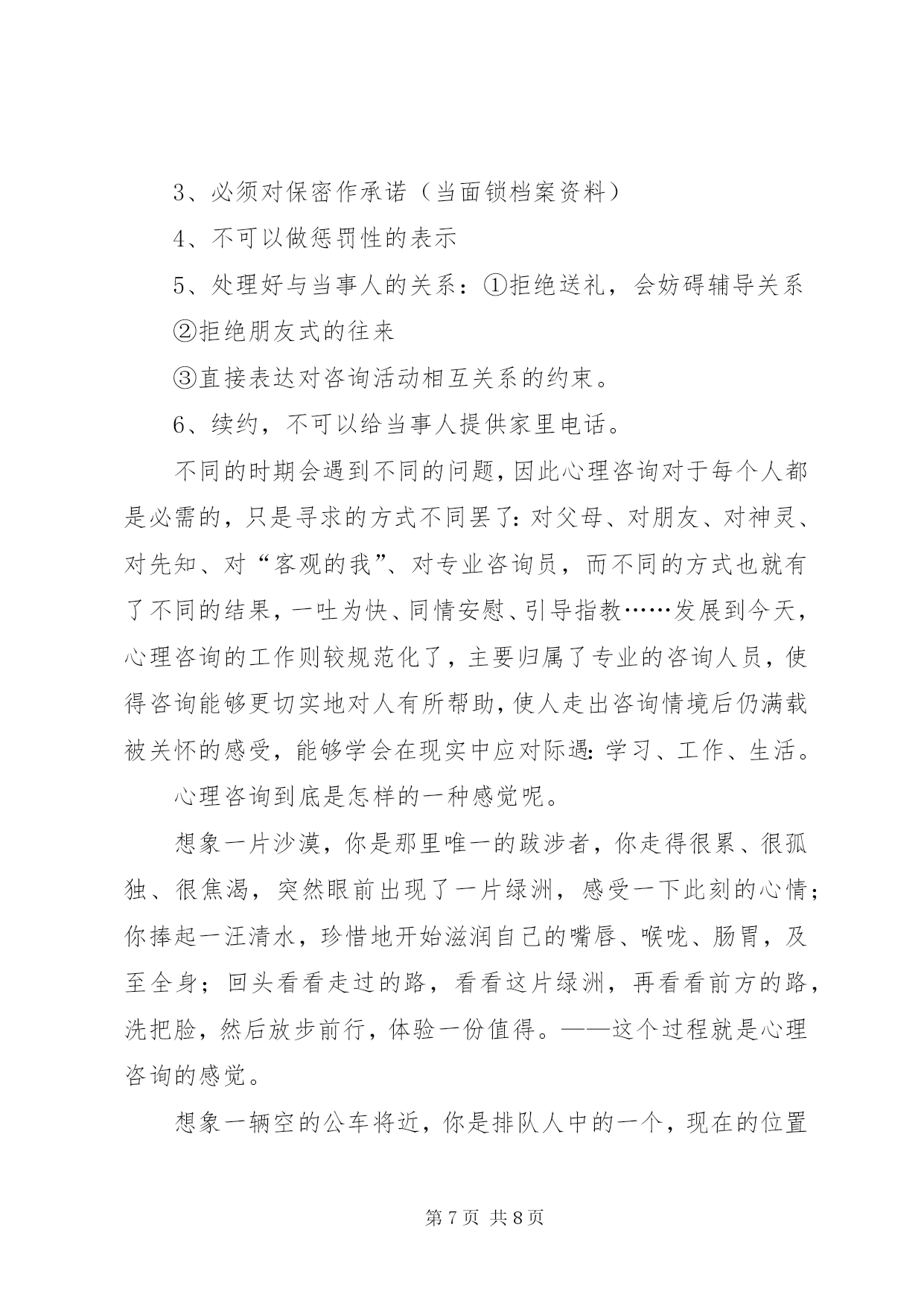 第PAGE\*Arabic\*MERGEFORMAT8页共NUMPAGES\*MERGEFORMAT8页心理咨询室建设经费申请报告一、心理咨询室的环境布置:心理咨询室的功能有“个体咨询”、“教师办公”、“团体辅导”和“测试及心理档案”,从而提高功能室的面积利用率,并使整个室内规划具有系统性和多功能性。1.工作运作。要求每周开放6小时以上,每学期1次室外大型咨询活动。2.心理咨询室布置要求:实用面积约30平方米(5m*6m)。太大:不安全,太小:压迫感。(1)基本配置包括:①一张办公桌,配有电话、电脑(内装心理测试档案系统)、打印机。②一个书架,分装若干心理书籍和报刊,一盏可调明暗的立地灯;灯光需明亮一点。还要有全身单面镜,用于观察矫正不当行为。③一张舒适的软沙发,一张圆形茶几,上面放有纸巾盒、糖果、点心、小盆栽;抱枕要形状多样、色彩灿烂,令室内环境轻松、活泼。④墙壁挂《学校心理咨询工作守则》,《心理咨询室使用规则》,风景画等。心理咨询接待表格、心理常识海报或背景音乐。⑤一台柜式空调、一台饮水机、录音机和摄像机等咨询安全监督设备。(2)心理咨询室的布置要求:①墙壁、天花板、地板和窗帘使用温和、平静的色调。例如苹果绿色调,具有安全、平和、凉爽的感觉,而米黄色,则显得温馨、亲切。②沙发、躺椅颜色要与墙壁形成对比,线条简洁,质地柔软舒适,两张沙发成90度摆放,避免咨访双方对视。③采用突显灯具,可调节明暗。把灯具作为空间的视觉焦点,光线含蓄柔和,能令情绪平静,精力集中,不致于分散注意力。④风景画要反映广阔、恬静的自然景观,能开拓遐想空间,令心境舒畅。⑤绿色植物象征生命力,用作室内点缀令环境充满生机。没有什么比心理咨询机构更需要重视环境的布置了,因为心理咨询环境的布置不仅仅是考虑到心理咨询人员的工作状态,还需要考虑来访者的情绪和认知。来访者对心理咨询环境的感觉将在很大程度上影响咨询的效果,也将大大影响来访者下次是否再来咨询。二、心理咨询室常用的工作方式:根据学生中普遍存在的人际交往、感情迷茫、新生适应、学习压力、考试焦虑、抑郁、自卑等方面心理问题,采用个别咨询、团体义务咨询、心理行为训练、书信咨询(“心语”信箱)、热线咨询、电子信箱、现场咨询、讲座、观看心理影片、表演心理剧、心理知识竞赛等灵活丰富的工作方式,向学生提供经常、及时、有效的心理健康指导与服务。1.“信箱”“信箱”是心理咨询室专门为学生进行心理问题咨询而开设的。随着社会的发展,中学生心理问题也越来越多,而出于某些原因,好多同学不愿与心理咨询师进行面对面交流。2.探求心灵的声音菁菁的校园,中学生们是流动的生命之源,是美丽的青春风景线。这儿有浓郁的活力,强烈的渴求,密集的信息,浪漫的旋律。中学是人生旅途的重要驿站,是生命茁壮成长的关键时期,更是心理从幼稚走向成熟的微妙阶段。学习观、价值观在这儿碰撞,世界观、人生观在这儿形成。三、心理咨询室进行咨询的步骤:咨询一般控制在40分钟内,分为三个阶段:开始会谈会谈中间结束会谈第一阶段:开始会谈1、寒暄:话题(1)针对当事人(2)针对咨询师(3)中性话题若来访者很严肃,已经准备好,可省略寒暄,进入正题2、切入正题(1)我能为(帮)你做点什么。或有什么需要我帮助的呢。(2)在咨询中,亲切地看着别人,对方可能说话。切入正题后,有可能“说”或“哭”、“笑”。第二阶段:会谈中间在会谈中有两件事:询问、倾听1、询问:开放式、封闭式(1)开放式(什么、怎么)如。你为什么来这里呢。我能为你做些什么。你觉得怎么了。最近有什么烦恼吗。(2)封闭式:是这样的吗(3)问,而不是告诉与当事人探讨的重要方式,咨询提问,可以:①:避免让咨询者以为自己比当事人懂得多②让当事人有说话的机会③让当事人控制谈话的方向和内容④提供一个没有威胁而且能鼓励当事人舒泄的机会⑤是一种信任的表达方式⑥完全专注于当事人的感觉和想法(4)反应式问话(回应)。把当事人所说的话重复给当事人,但不是全部重复,而是选择性重复,代表了某种导向。选择更多的是一种结构式会谈技巧。注:①不可以追问当事人,如果当事人不想说,尽量不要追问、逼问②不可以对一些敏感话题作太婉转的提问2、倾听。90%的咨询是咨询师在听,倾听的积极姿态表现在行动上,积极地关注别人有效(专心)的倾听和无效的倾听。(1).有效(专心)的倾听①深谈而不是浅谈(浅谈只涉及表面问题,带有寒暄色彩,深谈是接纳当事人的感觉)②接纳当事人的感觉。不仅仅谈论事情本身,而且应加入感觉的沟通,交换感觉。接纳意味着同意。接纳是表示你接受一个人对他自己的感觉,同意是你与对方的结合,与对方想的一样,感觉一样。③有效的倾听是倾听者将对方的叙述与感觉用他自己的语言总结给他听(“看起来是不是那样”)④有效倾听的优点:你接纳了对方的感觉,对方会乐