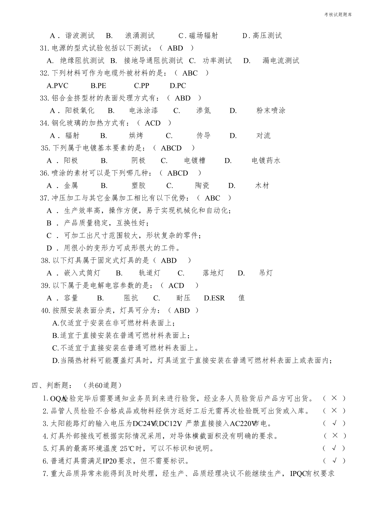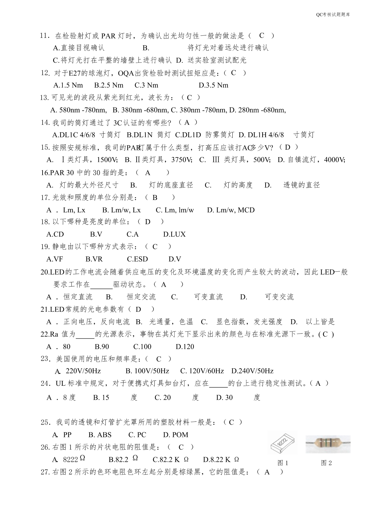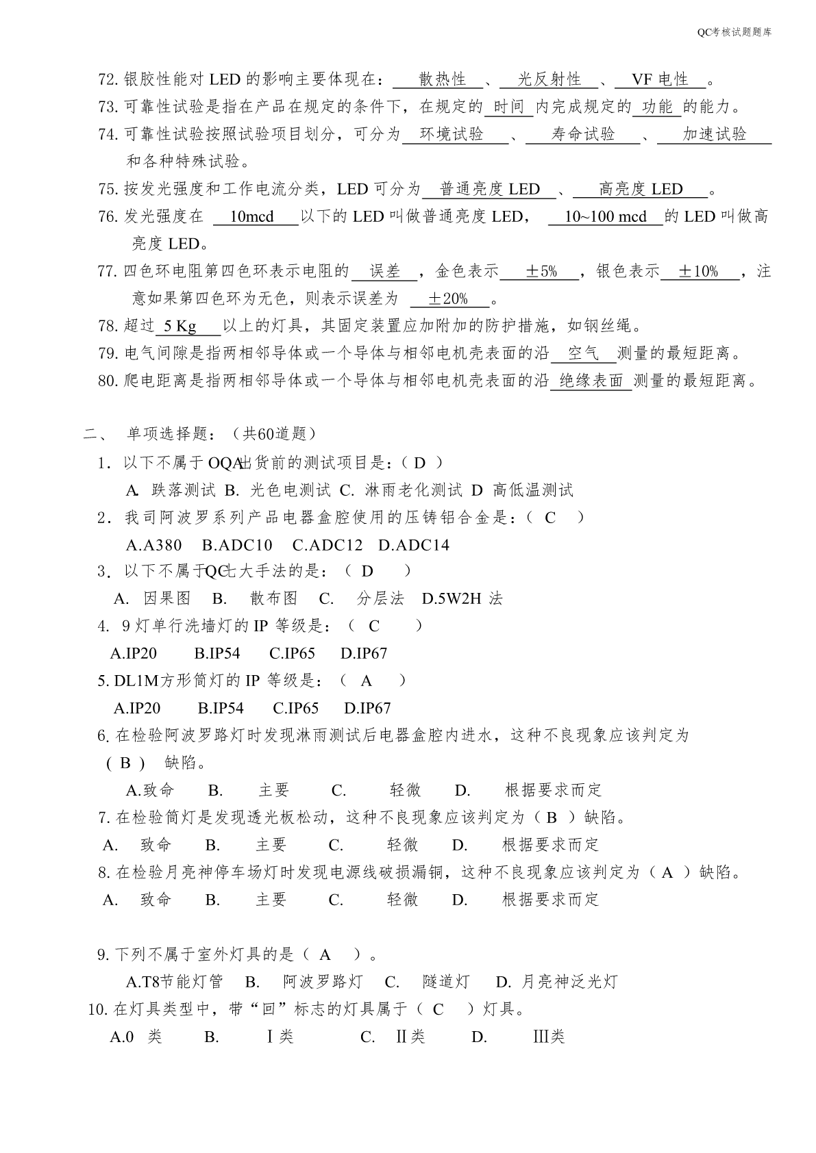 QC考核试题题库QC考核试题题库一、填空题:(共80道题)1.光通量是指光源在单位时间内发出的光量总和,单位用流明表示。2.光效是指光源所发出的总光通量与该光源所消耗的电功率的比值,单位用流明/瓦表示。3.显指是指光源对物体的显色能力,用字母Ra表示。4.当光源所发出的光的颜色与黑体在某一温度下辐射的颜色相同时,黑体的温度称为该光源的色温,单位用绝对温度K表示。5.功率是指功与完成这些功所用的时间的比值,单位是:瓦特。6.功率因数是指在交流电路中,电压与电流之间的相位差的余弦值,用字母PF表示。7.光的波长决定光的颜色,是由形成P-N结材料决定的。8.发光强度,简称光强,国际单位是坎德拉,符号为cd。9.在LED的光色电参数中,光通量用符号Φ表示,单位为流明,用符号lm表示。10.任何来料及作业不良造成物料无法正常使用,影响订单完成的,IPQC要及时发出《品质异常反馈单》进行追踪。11.IPQC做首件检验时的检验依据有:客户订单、BOM、图纸、NPI作业指导书、成品检验规范。12.IPQC每天应及时将巡检状况记录到《制程巡检记录表》上交给部门主管,以方便及时掌握生产品质状况,并且可为以后不良追踪有寻可查,如不良数统计,当天拉上发生重大问题,以及个人认为存在的品质隐患。13.IPQC一般采用的检查方式为抽检,检查内容一般分为对各工序的产品质量进行抽检、对各工序的操作人员的作业方式进行检查,对控制计划中的内容进行点检。14.IPQC的中文意思是:制程品质控制。15.IPQC采用的检验方式是在生产过程中的各工序之间巡回检查,所以又称为巡检。16.压铸机、压铸合金和压铸模具是压铸生产的三大要素,缺一不可。压铸工艺就是将这三大要素有机地加以综合运用,从而稳定地、有节奏地和高效地生产出外观、功能、尺寸符合要求的铸件。17.常用的压铸合金有铝合金、锌合金和镁合金,铝合金常用的牌号有主要有A380、ADC10、ADC12、ADC14,锌合金常用的牌号主要有ZA8,ZA10,ZA12。镁合金常用的牌号有主要有AZ91D、AM60B、AS41A和AE42等。18.灯具铭牌上的图示符号的高度不少于5mm,文字和数字的高度不少于3mm。19.GB7000.1-2007灯具按防触电等级分类,分为Ⅰ级、Ⅱ级、Ⅲ级三个类别。20.GB7000.1-2007等同于采用IEC60598-1:2003标准。21.老炼1000小时的LED道路/隧道照明产品稳定工作时的光电参数值称为LED道路/隧道照明产品的初始值。QC考核试题题库22.LED道路/隧道照明产品的初始光通量应不低于额定光通量的90%,不高于额定光通量的120%。23.按照额定光通量,LED道路/隧道照明产品可划分为3000lm、5400lm、9000lm和14000lm四种规格。24.按照额定相关色温,LED道路/隧道照明产品可划分为低色温产品(额定色温≤3500K)和高色温产品(3500K<额定色温≤6500K)。25.LED道路/隧道照明产品的功率因数应不低于0.95,额定寿命应不低于30000h。26.LED道路/隧道照明产品中的低色温产品的光效不低于85lm/w,高色温产品的光效不低于90lm/w。27.LED道路/隧道照明产品的3000h光通维持率不低于96%,6000h光通维持率不低于92%,10000h光通维持率不低于86%。28.一般SMD光源都是棱形的,其叫法是根据长*宽来的。29.LED(LightEmittingDiode),中文名叫发光二极管,是一种固态的半导体器件,它可以直接把电转化为光。30.可见光的波段范围是380nm-780nm。31.LED的正向工作电压VF,参数表中给出的工作电压是在给定的正向电流下得到的。一般是在IF=20mA时测得的。发光二极体正向工作电压VF在1.4~3.0V。32.LED按结构分有全环氧包封、金属底座环氧封装、陶瓷底座环氧封装及玻璃包封等结构。33.GB7000.1-2007适用于使用电光源、电源电压不超过1000V的灯具的一般要求。34.双重绝缘是指由基本绝缘和附加绝缘组成的绝缘。35.对非安全特低电压的基本绝缘,要求达到的最低绝缘阻抗是2MΩ。36.对双重绝缘或者加强绝缘,要求达到的最低绝缘阻抗是4MΩ。37.按照使用环境分,灯具可分为室内灯具和室外灯具。38.按照安装方式分,灯具可分为固定式灯具和可移动式灯具。39.按照发光原理分类,光源可分为热致发光光源、气体发光光源、固体照明光源。40.镇流器主要分为两大类:电感镇流器、电子镇流器。41.按使用场合分类,灯具可分为正常条件下使用的灯具和恶劣条