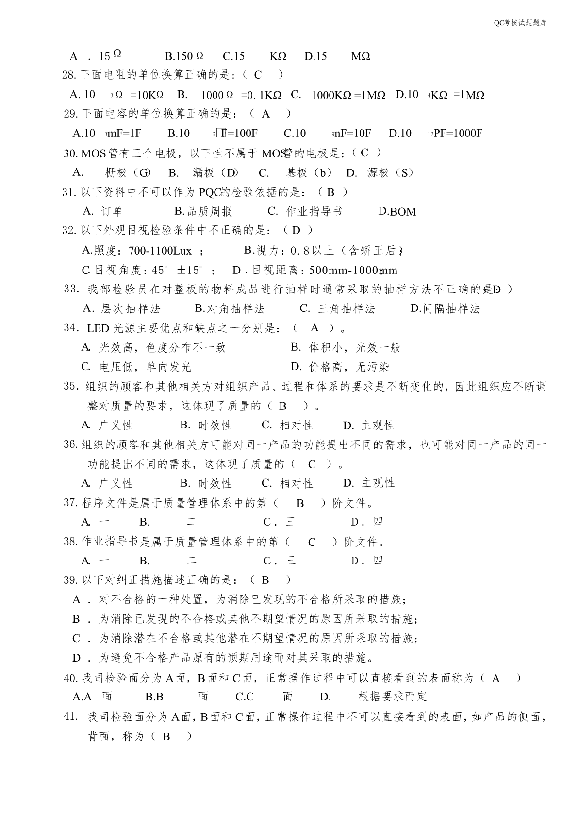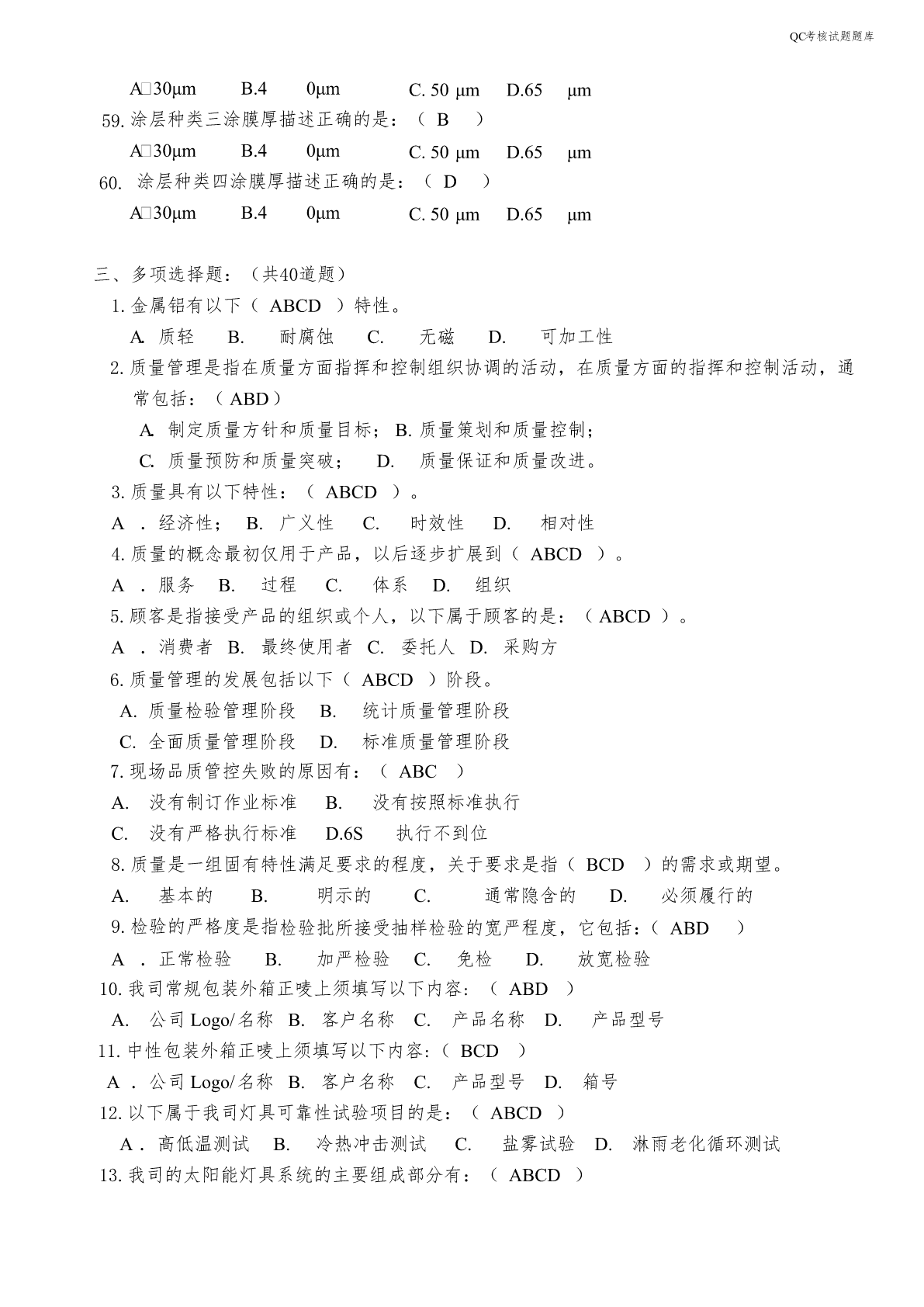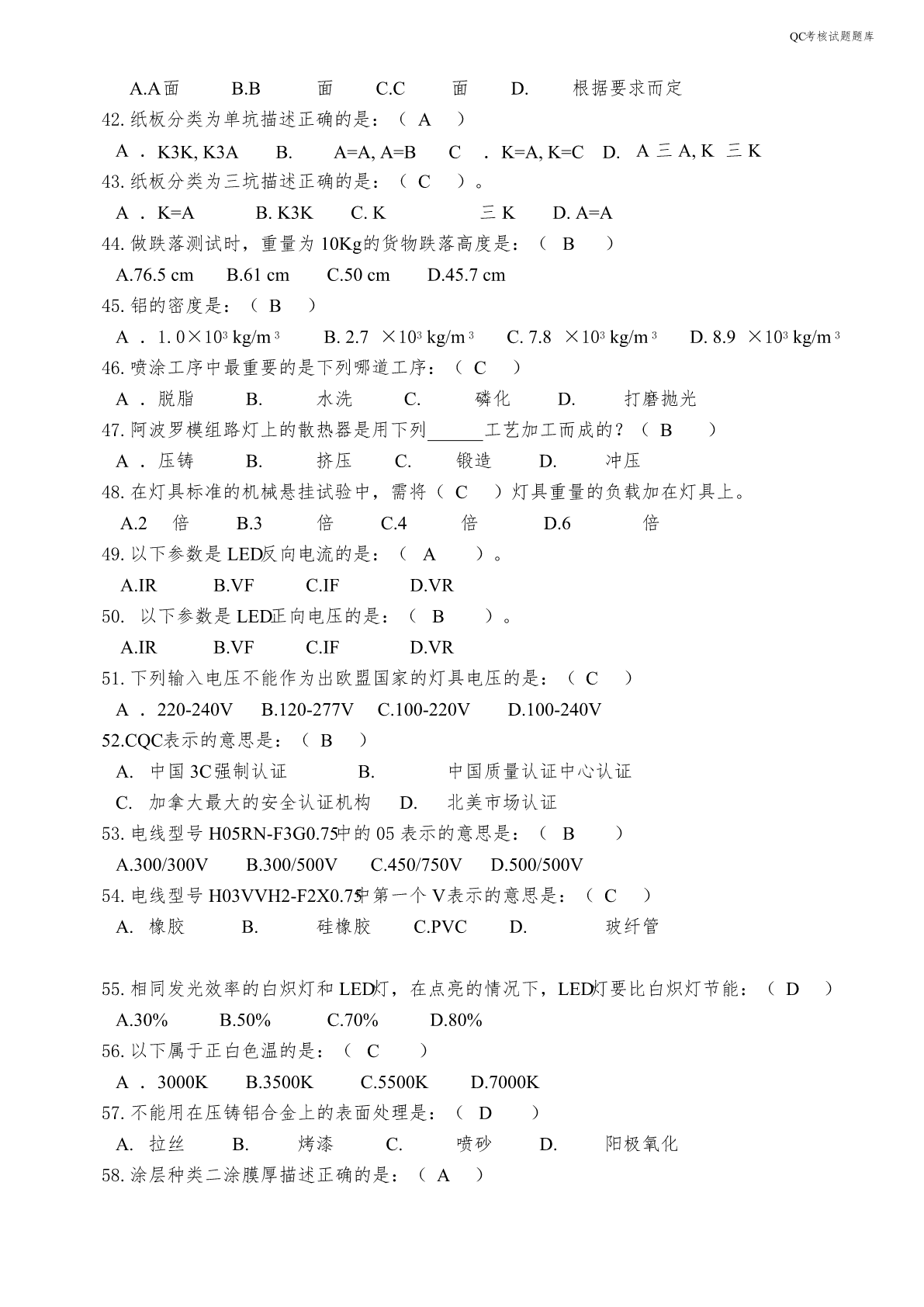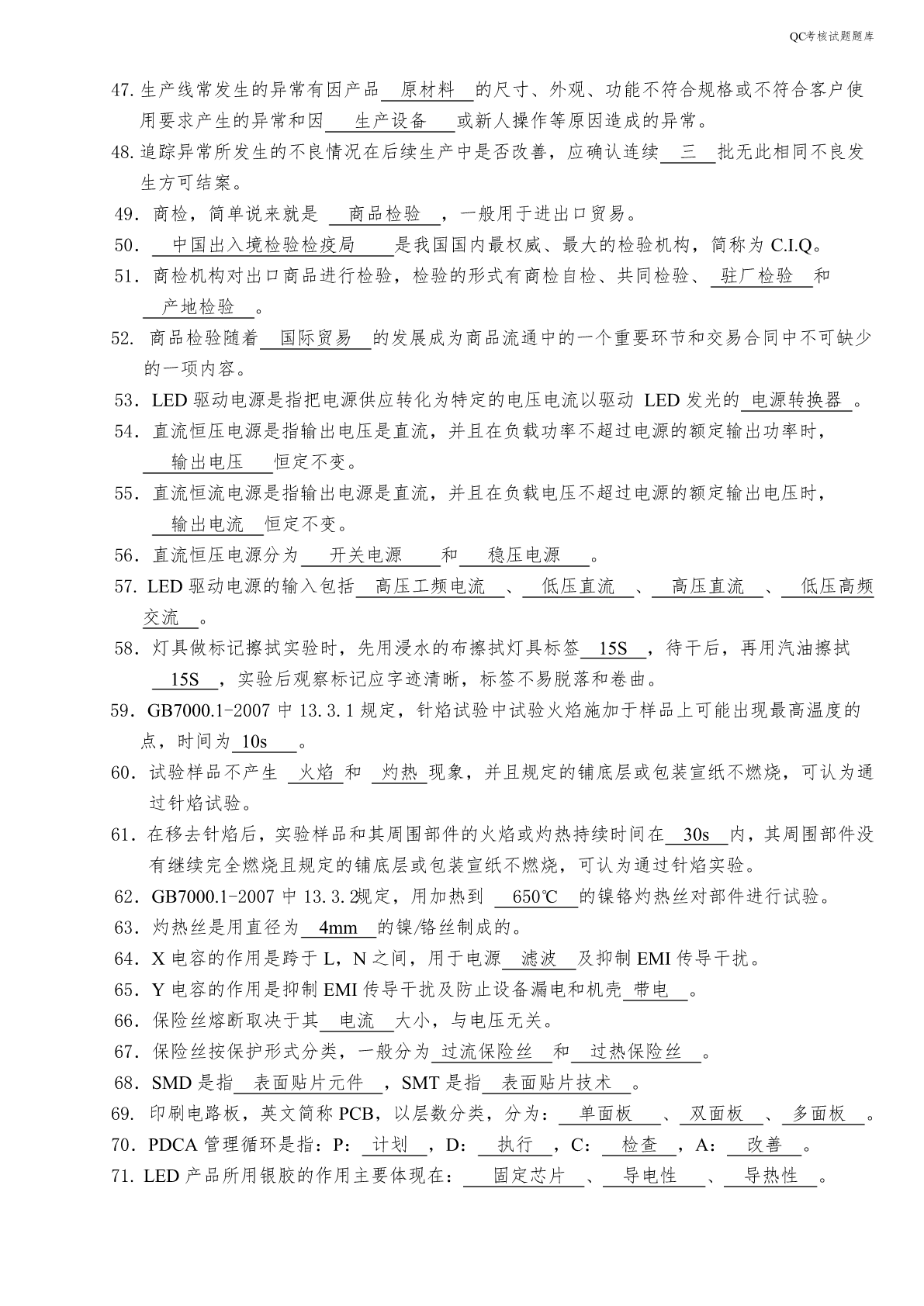 QC考核试题题库QC考核试题题库一、填空题:(共80道题)1.光通量是指光源在单位时间内发出的光量总和,单位用流明表示。2.光效是指光源所发出的总光通量与该光源所消耗的电功率的比值,单位用流明/瓦表示。3.显指是指光源对物体的显色能力,用字母Ra表示。4.当光源所发出的光的颜色与黑体在某一温度下辐射的颜色相同时,黑体的温度称为该光源的色温,单位用绝对温度K表示。5.功率是指功与完成这些功所用的时间的比值,单位是:瓦特。6.功率因数是指在交流电路中,电压与电流之间的相位差的余弦值,用字母PF表示。7.光的波长决定光的颜色,是由形成P-N结材料决定的。8.发光强度,简称光强,国际单位是坎德拉,符号为cd。9.在LED的光色电参数中,光通量用符号Φ表示,单位为流明,用符号lm表示。10.任何来料及作业不良造成物料无法正常使用,影响订单完成的,IPQC要及时发出《品质异常反馈单》进行追踪。11.IPQC做首件检验时的检验依据有:客户订单、BOM、图纸、NPI作业指导书、成品检验规范。12.IPQC每天应及时将巡检状况记录到《制程巡检记录表》上交给部门主管,以方便及时掌握生产品质状况,并且可为以后不良追踪有寻可查,如不良数统计,当天拉上发生重大问题,以及个人认为存在的品质隐患。13.IPQC一般采用的检查方式为抽检,检查内容一般分为对各工序的产品质量进行抽检、对各工序的操作人员的作业方式进行检查,对控制计划中的内容进行点检。14.IPQC的中文意思是:制程品质控制。15.IPQC采用的检验方式是在生产过程中的各工序之间巡回检查,所以又称为巡检。16.压铸机、压铸合金和压铸模具是压铸生产的三大要素,缺一不可。压铸工艺就是将这三大要素有机地加以综合运用,从而稳定地、有节奏地和高效地生产出外观、功能、尺寸符合要求的铸件。17.常用的压铸合金有铝合金、锌合金和镁合金,铝合金常用的牌号有主要有A380、ADC10、ADC12、ADC14,锌合金常用的牌号主要有ZA8,ZA10,ZA12。镁合金常用的牌号有主要有AZ91D、AM60B、AS41A和AE42等。18.灯具铭牌上的图示符号的高度不少于5mm,文字和数字的高度不少于3mm。19.GB7000.1-2007灯具按防触电等级分类,分为Ⅰ级、Ⅱ级、Ⅲ级三个类别。20.GB7000.1-2007等同于采用IEC60598-1:2003标准。21.老炼1000小时的LED道路/隧道照明产品稳定工作时的光电参数值称为LED道路/隧道照明产品的初始值。QC考核试题题库22.LED道路/隧道照明产品的初始光通量应不低于额定光通量的90%,不高于额定光通量的120%。23.按照额定光通量,LED道路/隧道照明产品可划分为3000lm、5400lm、9000lm和14000lm四种规格。24.按照额定相关色温,LED道路/隧道照明产品可划分为低色温产品(额定色温≤3500K)和高色温产品(3500K<额定色温≤6500K)。25.LED道路/隧道照明产品的功率因数应不低于0.95,额定寿命应不低于30000h。26.LED道路/隧道照明产品中的低色温产品的光效不低于85lm/w,高色温产品的光效不低于90lm/w。27.LED道路/隧道照明产品的3000h光通维持率不低于96%,6000h光通维持率不低于92%,10000h光通维持率不低于86%。28.一般SMD光源都是棱形的,其叫法是根据长*宽来的。29.LED(LightEmittingDiode),中文名叫发光二极管,是一种固态的半导体器件,它可以直接把电转化为光。30.可见光的波段范围是380nm-780nm。31.LED的正向工作电压VF,参数表中给出的工作电压是在给定的正向电流下得到的。一般是在IF=20mA时测得的。发光二极体正向工作电压VF在1.4~3.0V。32.LED按结构分有全环氧包封、金属底座环氧封装、陶瓷底座环氧封装及玻璃包封等结构。33.GB7000.1-2007适用于使用电光源、电源电压不超过1000V的灯具的一般要求。34.双重绝缘是指由基本绝缘和附加绝缘组成的绝缘。35.对非安全特低电压的基本绝缘,要求达到的最低绝缘阻抗是2MΩ。36.对双重绝缘或者加强绝缘,要求达到的最低绝缘阻抗是4MΩ。37.按照使用环境分,灯具可分为室内灯具和室外灯具。38.按照安装方式分,灯具可分为固定式灯具和可移动式灯具。39.按照发光原理分类,光源可分为热致发光光源、气体发光光源、固体照明光源。40.镇流器主要分为两大类:电感镇流器、电子镇流器。41.按使用场合分类,灯具可分为正常条件下使用的灯具和恶劣条