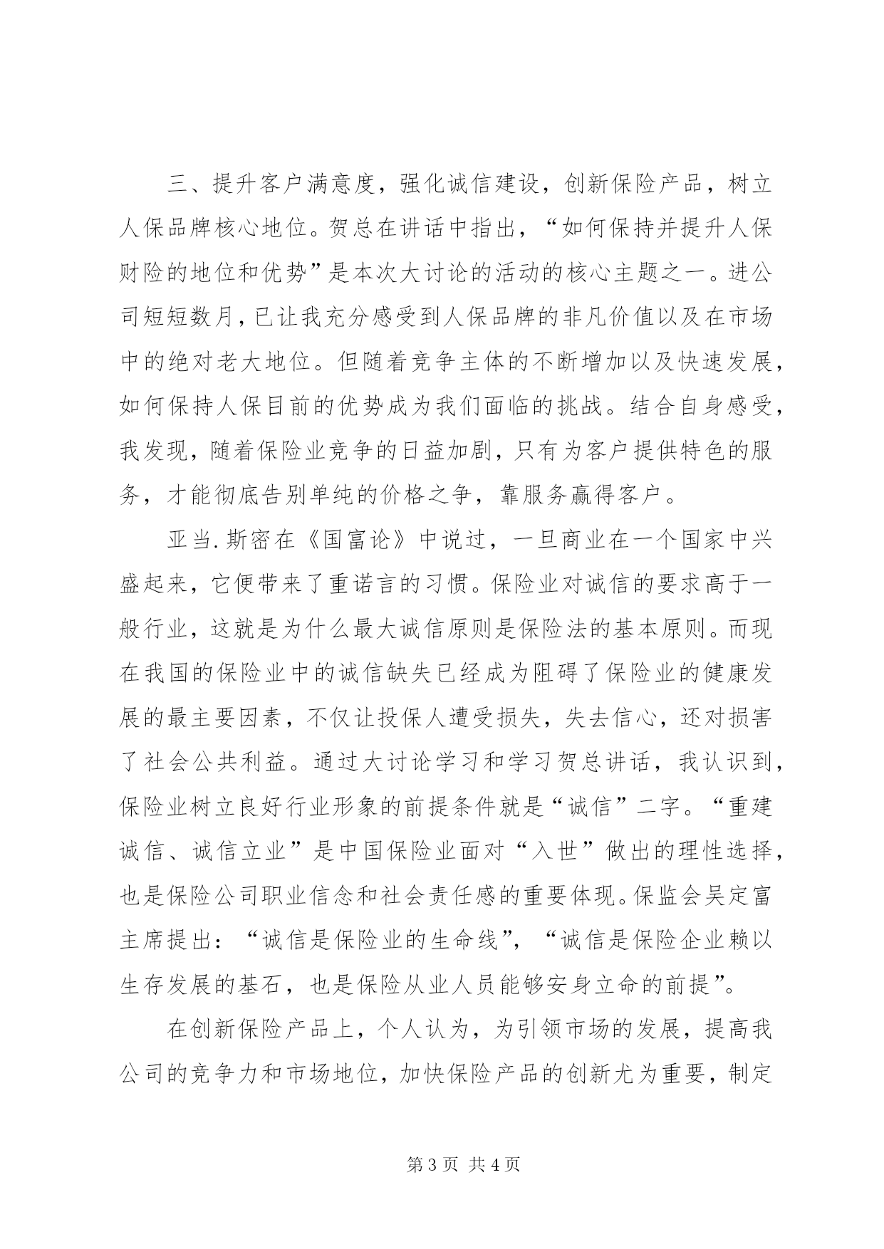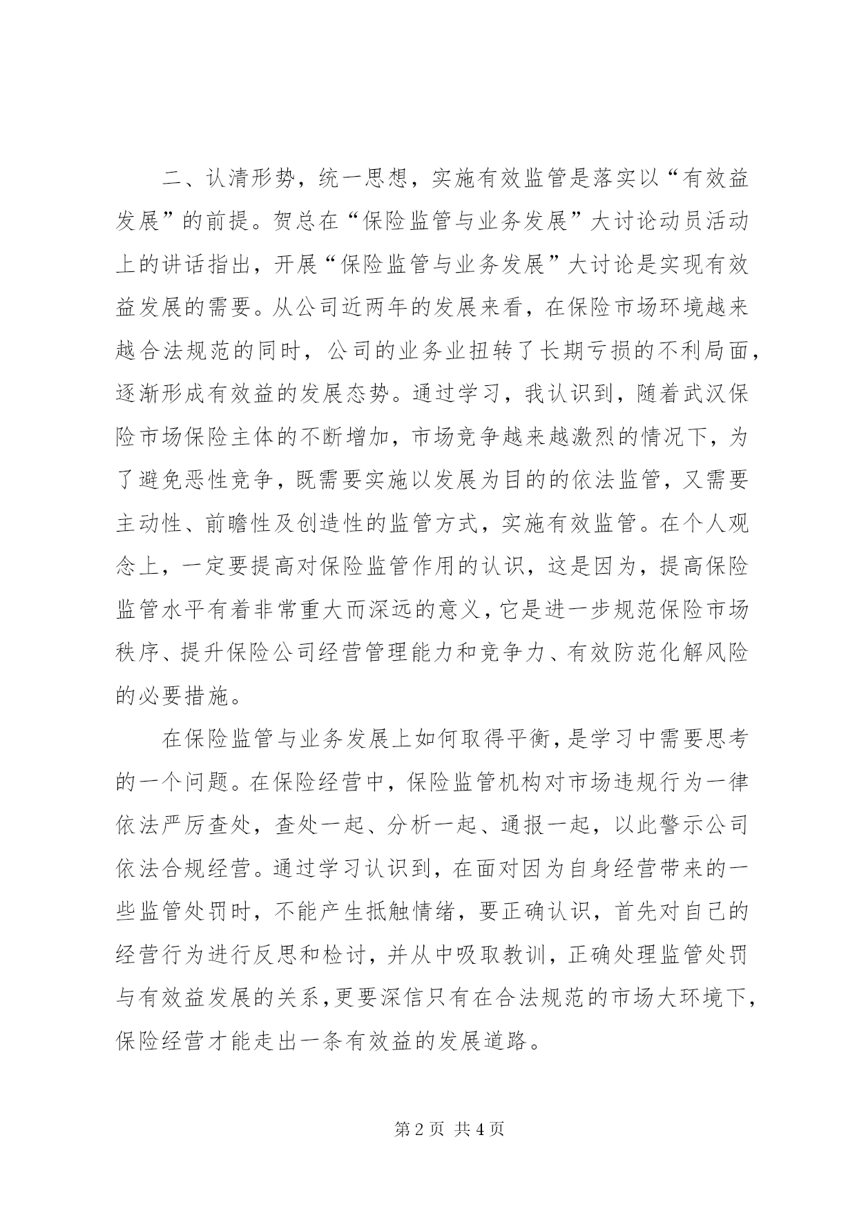 第PAGE\*Arabic\*MERGEFORMAT4页共NUMPAGES\*MERGEFORMAT4页保险监管与业务发展学习心得近日,省公司、市公司组织开展了“保险监管与业务发展”大讨论活动,作为一名刚刚踏入保险行业的新兵,第一次较为系统地接触和学习了《保险法》中有关依法合规经营和保险监的知识,这为我以后工作的开展打下了良好的思想基础,也让我充分认识到保险监管与业务发展的必要性和重要性。一、树立合规经营意识,强化内控建设,在企业内部营造奋发进取的良好精神状态。入司前,每次听见身边人谈起“保险公司”,得到的评语总是这句话“保险公司就是骗人的,就是一大忽悠”。入司后发现,随着保险业改革发展的日趋深入,投保人与保险人之间的利益纠纷不断增多,而一些利益的调解方式难以获得客户的满意,慢慢在客户心目中造就了“投保易、理赔难”的主观印象。而在保险经营中,一些保险公司经常游走在法律的边缘,不断和法律打起擦边球,结果导致整个市场环境越来越混乱。综合各种因素,保险公司的外部环境被越描越黑,竞争也越来越无序,也间接影响了投保人对保险公司的信心。学习保险监管,就是要牢固树立依法合规意识,不断强化公司内控建设,其最终目的就是要引领公司建立健全现代企业制度。在工作中,不要存有任何侥幸意识,要利用业务时间,主动学习公司内控制度建设,增强依法合规意识,养成自觉控制风险的行为习惯。二、认清形势,统一思想,实施有效监管是落实以“有效益发展”的前提。贺总在“保险监管与业务发展”大讨论动员活动上的讲话指出,开展“保险监管与业务发展”大讨论是实现有效益发展的需要。从公司近两年的发展来看,在保险市场环境越来越合法规范的同时,公司的业务业扭转了长期亏损的不利局面,逐渐形成有效益的发展态势。通过学习,我认识到,随着武汉保险市场保险主体的不断增加,市场竞争越来越激烈的情况下,为了避免恶性竞争,既需要实施以发展为目的的依法监管,又需要主动性、前瞻性及创造性的监管方式,实施有效监管。在个人观念上,一定要提高对保险监管作用的认识,这是因为,提高保险监管水平有着非常重大而深远的意义,它是进一步规范保险市场秩序、提升保险公司经营管理能力和竞争力、有效防范化解风险的必要措施。在保险监管与业务发展上如何取得平衡,是学习中需要思考的一个问题。在保险经营中,保险监管机构对市场违规行为一律依法严厉查处,查处一起、分析一起、通报一起,以此警示公司依法合规经营。通过学习认识到,在面对因为自身经营带来的一些监管处罚时,不能产生抵触情绪,要正确认识,首先对自己的经营行为进行反思和检讨,并从中吸取教训,正确处理监管处罚与有效益发展的关系,更要深信只有在合法规范的市场大环境下,保险经营才能走出一条有效益的发展道路。三、提升客户满意度,强化诚信建设,创新保险产品,树立人保品牌核心地位。贺总在讲话中指出,“如何保持并提升人保财险的地位和优势”是本次大讨论的活动的核心主题之一。进公司短短数月,已让我充分感受到人保品牌的非凡价值以及在市场中的绝对老大地位。但随着竞争主体的不断增加以及快速发展,如何保持人保目前的优势成为我们面临的挑战。结合自身感受,我发现,随着保险业竞争的日益加剧,只有为客户提供特色的服务,才能彻底告别单纯的价格之争,靠服务赢得客户。亚当.斯密在《国富论》中说过,一旦商业在一个国家中兴盛起来,它便带来了重诺言的习惯。保险业对诚信的要求高于一般行业,这就是为什么最大诚信原则是保险法的基本原则。而现在我国的保险业中的诚信缺失已经成为阻碍了保险业的健康发展的最主要因素,不仅让投保人遭受损失,失去信心,还对损害了社会公共利益。通过大讨论学习和学习贺总讲话,我认识到,保险业树立良好行业形象的前提条件就是“诚信”二字。“重建诚信、诚信立业”是中国保险业面对“入世”做出的理性选择,也是保险公司职业信念和社会责任感的重要体现。保监会吴定富主席提出:“诚信是保险业的生命线”,“诚信是保险企业赖以生存发展的基石,也是保险从业人员能够安身立命的前提”。在创新保险产品上,个人认为,为引领市场的发展,提高我公司的竞争力和市场地位,加快保险产品的创新尤为重要,制定既让客户满意,又让竞争对手望尘莫及的保险产品,这是保持并提升人保财险地位和优势的一个小小建议。