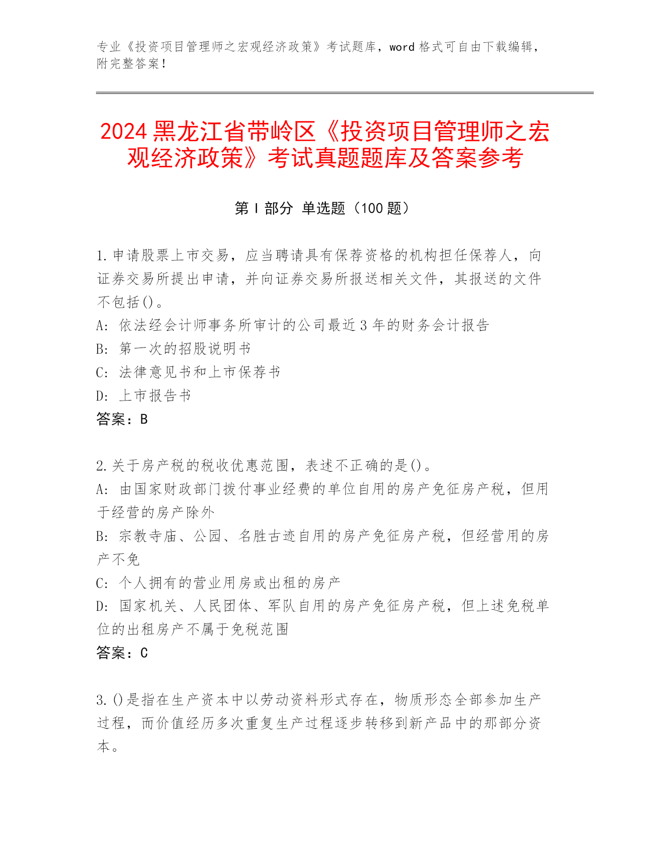 2024黑龙江省带岭区《投资项目管理师之宏观经济政策》考试真题题库及答案参考