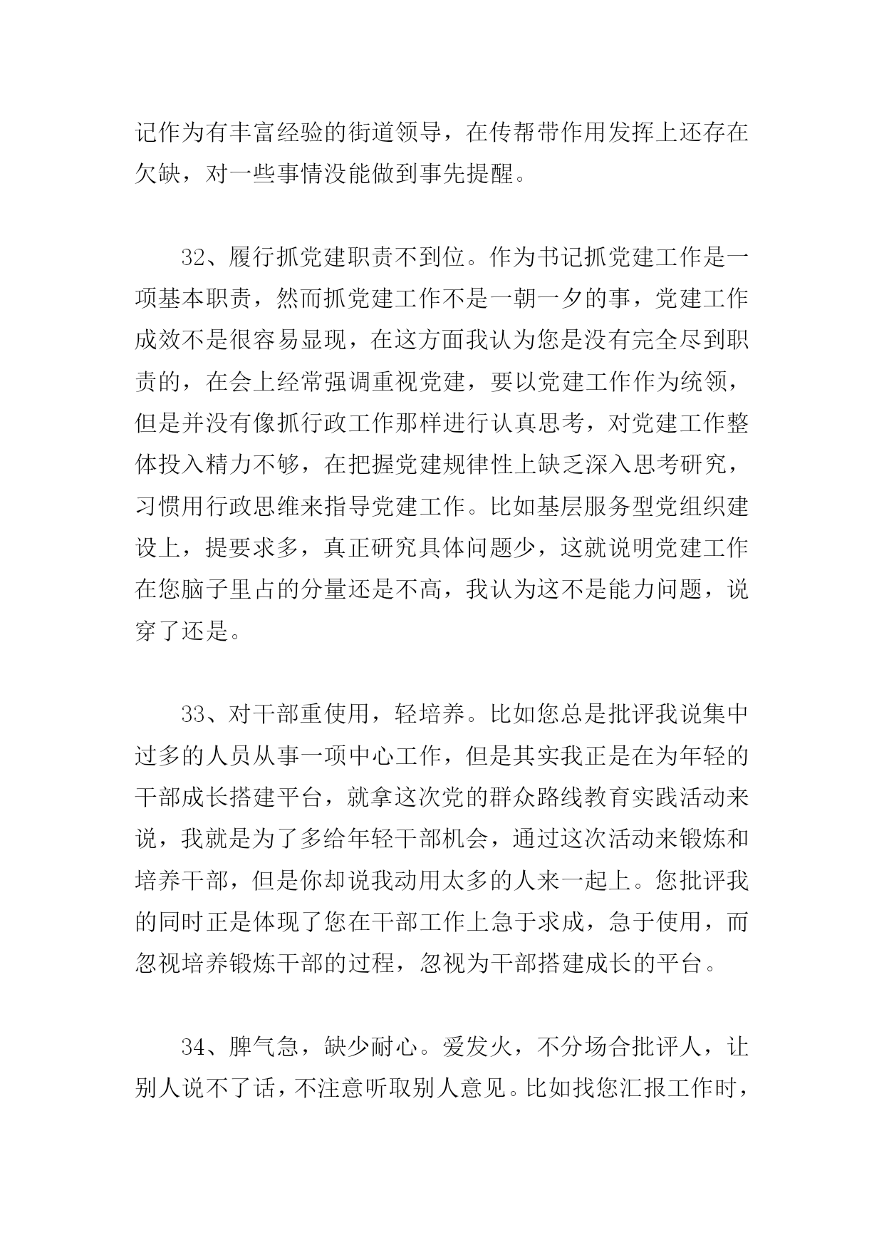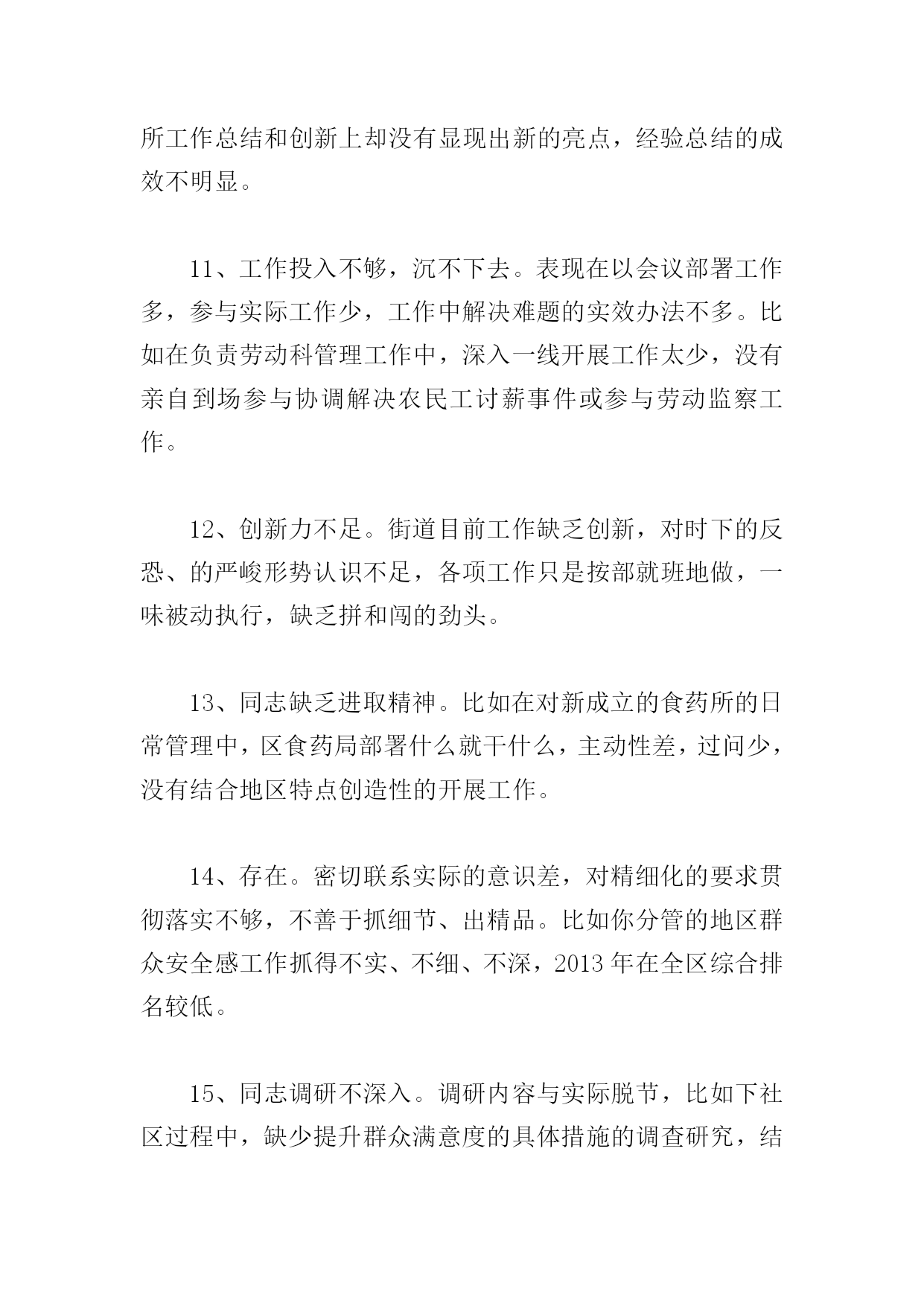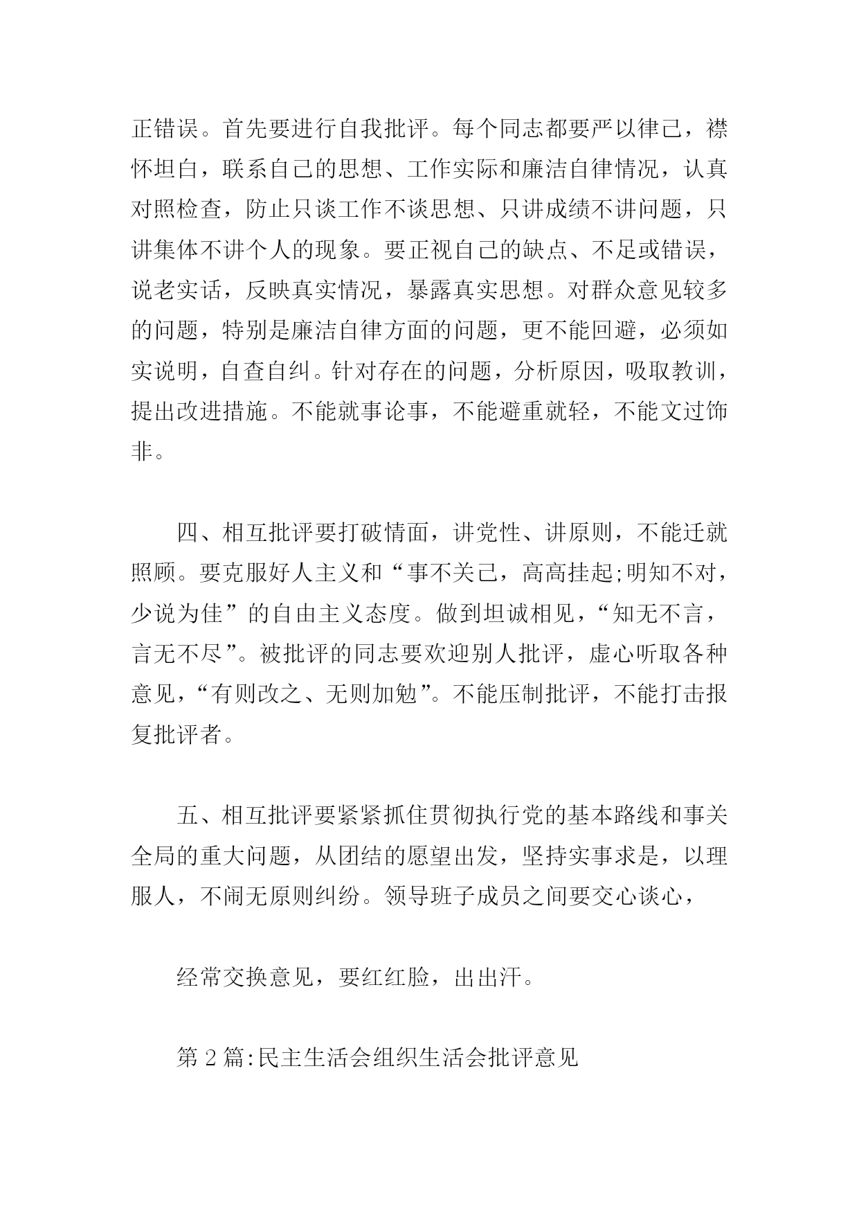 民主生活会组织生活会批评意见【十篇】第1篇:民主生活会组织生活会批评意见一、进一步提高对开好领导干部民主生活会重要性的认识党员领导干部民主生活会制度,是党内政治生活中的一项重要制度,是解决领导班子自身矛盾、加强党内监督、提高领导干部思想水平和党性修养的有效途径,是建设高素质干部队伍的一项重要措施。实践证明,坚持民主生活会制度,有利于党组织对干部的严格要求、严格管理、严格监督,有利于领导干部自重、自省、自警、自励,廉洁自律,有利于统一思想、改进作风、增强团结、提高领导班子的战斗力。县以上党员领导干部在积极参加所在党支部、党小组的组织生活会的同时,要认真参加领导班子民主生活会,自觉接受党组织和群众的监督,经受党内生活的锻炼,努力使自己成为新时期合格的领导干部。二、明确民主生活会的目的要求,充分做好会前的准备工作民主生活会不同于一般的工作会、总结会,应以讲学习、讲政治、讲正气,增强党性锻炼为重点,按照“三严”“四自”的要求,围绕学习、思想、作风、廉洁自律、遵纪守法等方面的问题汇报思想状况,进行对照检查,开展批评和自我批评。不能把民主生活会开成研究工作的会议,不能回避矛盾,脱离实际空泛议论。根据实际需要每次会议应重点解决一两个突出问题或召开专题民主生活会。民主生活会召开的时间、议题,会前应报告上级党组织。民主生活会前,应委托组织部或机关党组织广泛征求党内外群众对领导班子及其成员的意见和建议。要采取多种形式把群众的意见收集起来,并如实向主要负责同志及每个成员反馈,以便有针对性地开展批评和自我批评。上级党委、组织部门要事先有组织地收集和掌握群众和干部反映,及有关情况。对有关领导成员需要在民主生活会上说明或检查的问题,可在会前同主要领导干部或领导成员本人沟通。参加指导下级党委(党组)民主生活会的人员,根据需要可提前到会,同主要领导干部一起研究开好民主生活会的有关事项。民主生活会后,应将会议的基本情况、解决的问题、整改措施,及时报告上级党组织,必要时要向下级党组织和党员通报。三、严肃认真地开展批评和自我批评开好民主生活会,必须运用批评和自我批评的武器,开展积极的思想斗争。这是提高民主生活会质量,搞好党内监督的关键。每个领导成员都要以对党的事业、对同志高度负责的态度,严肃认真地开展批评和自我批评,分清是非,团结同志,坚持真理,修正错误。首先要进行自我批评。每个同志都要严以律己,襟怀坦白,联系自己的思想、工作实际和廉洁自律情况,认真对照检查,防止只谈工作不谈思想、只讲成绩不讲问题,只讲集体不讲个人的现象。要正视自己的缺点、不足或错误,说老实话,反映真实情况,暴露真实思想。对群众意见较多的问题,特别是廉洁自律方面的问题,更不能回避,必须如实说明,自查自纠。针对存在的问题,分析原因,吸取教训,提出改进措施。不能就事论事,不能避重就轻,不能文过饰非。四、相互批评要打破情面,讲党性、讲原则,不能迁就照顾。要克服好人主义和“事不关己,高高挂起;明知不对,少说为佳”的自由主义态度。做到坦诚相见,“知无不言,言无不尽”。被批评的同志要欢迎别人批评,虚心听取各种意见,“有则改之、无则加勉”。不能压制批评,不能打击报复批评者。五、相互批评要紧紧抓住贯彻执行党的基本路线和事关全局的重大问题,从团结的愿望出发,坚持实事求是,以理服人,不闹无原则纠纷。领导班子成员之间要交心谈心,经常交换意见,要红红脸,出出汗。第2篇:民主生活会组织生活会批评意见1、深入实际不够。对地区发展的现状和趋势认识和了解不全面,对分管工作的指导力度不够。在探索特点规律、总结经验做法、搞好服务指导等方面做得还不够好。比如在思想上不重视统计工作,认为其人事、业务均在区统计局管理,没有进行业务钻研,未能与街道整体工作进行融合没有将统计工作的成果更好地服务于本地区建设。2、统筹兼顾不到位。对窗口单位的要求尚停留在完成既定任务、不出错的层面,主要表现在工作中听分管科室汇报工作的时候多,下基层调研的时候少,对分管科室的履职情况了解不全面、不及时。缺乏系统思维,如服务大厅的硬件改造。今天西大厅漏雨就西边防水,明天东大厅漏雨就东边防水,没有未雨绸缪的意识,不能一次性发现问题,综合处理,总在事后处理。3、缺乏担当。基层工作经验方面欠缺,处理很多具体工作过程中有畏难情绪。对街道整体工作了解不多,有群众上门反映问题或采取较为激烈的方式时,办法不多,总要依靠科长解决问题。4、存在好人主义。干事激情不足,有时总当老好人,不敢过多批评干部,管理不严。比如在对窗口服务业管理上,为民服务大厅是街道最重要最集中的窗口单位,你在管理中对人员要求不严,发生一些与居民、办事人员的冲突后,客观原因找的多,主观原因找的少,批评教育不够。5、对工作的监督不到位。比如对社区劳动保障工作