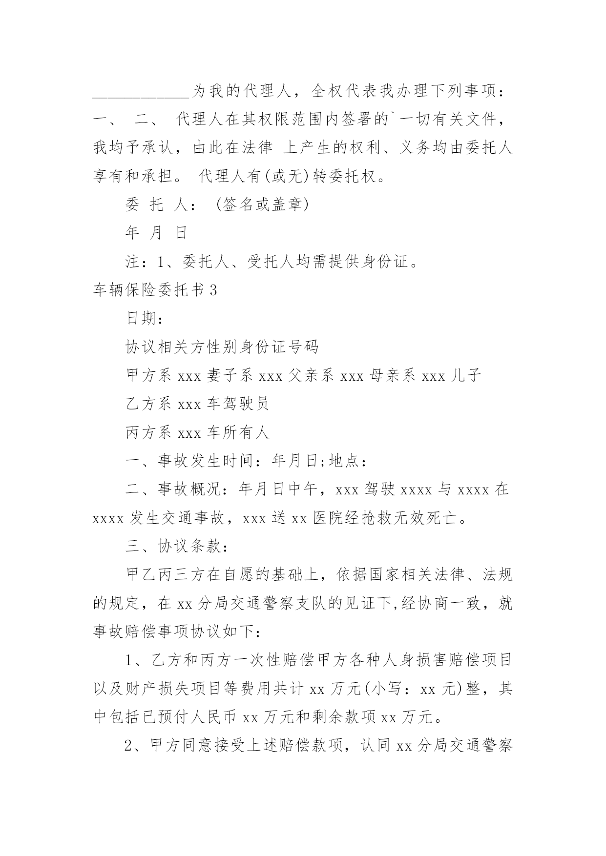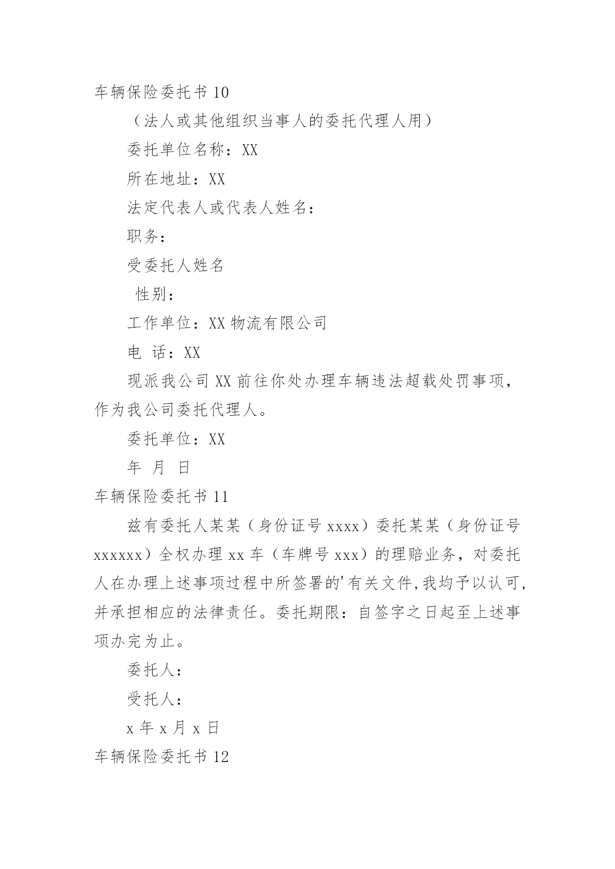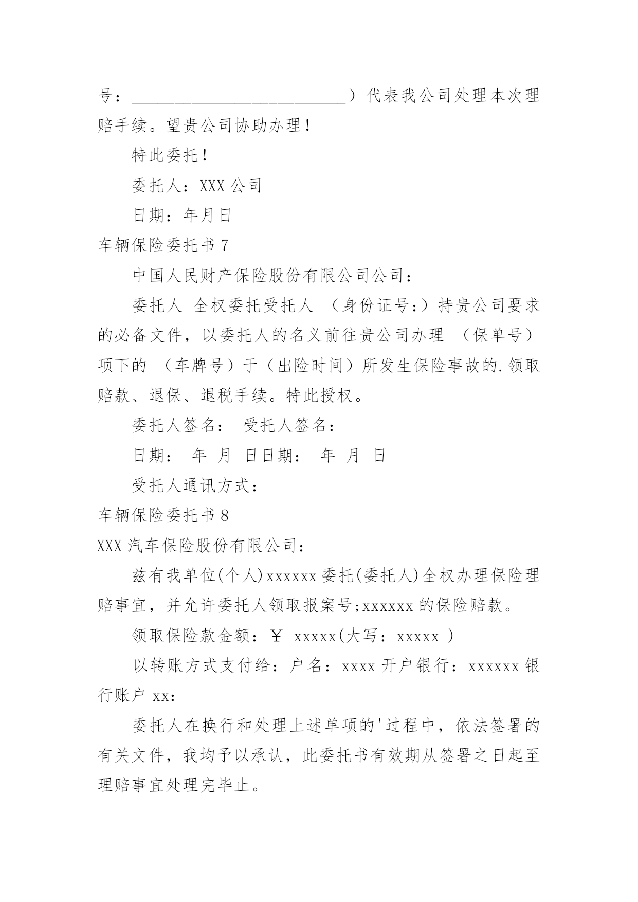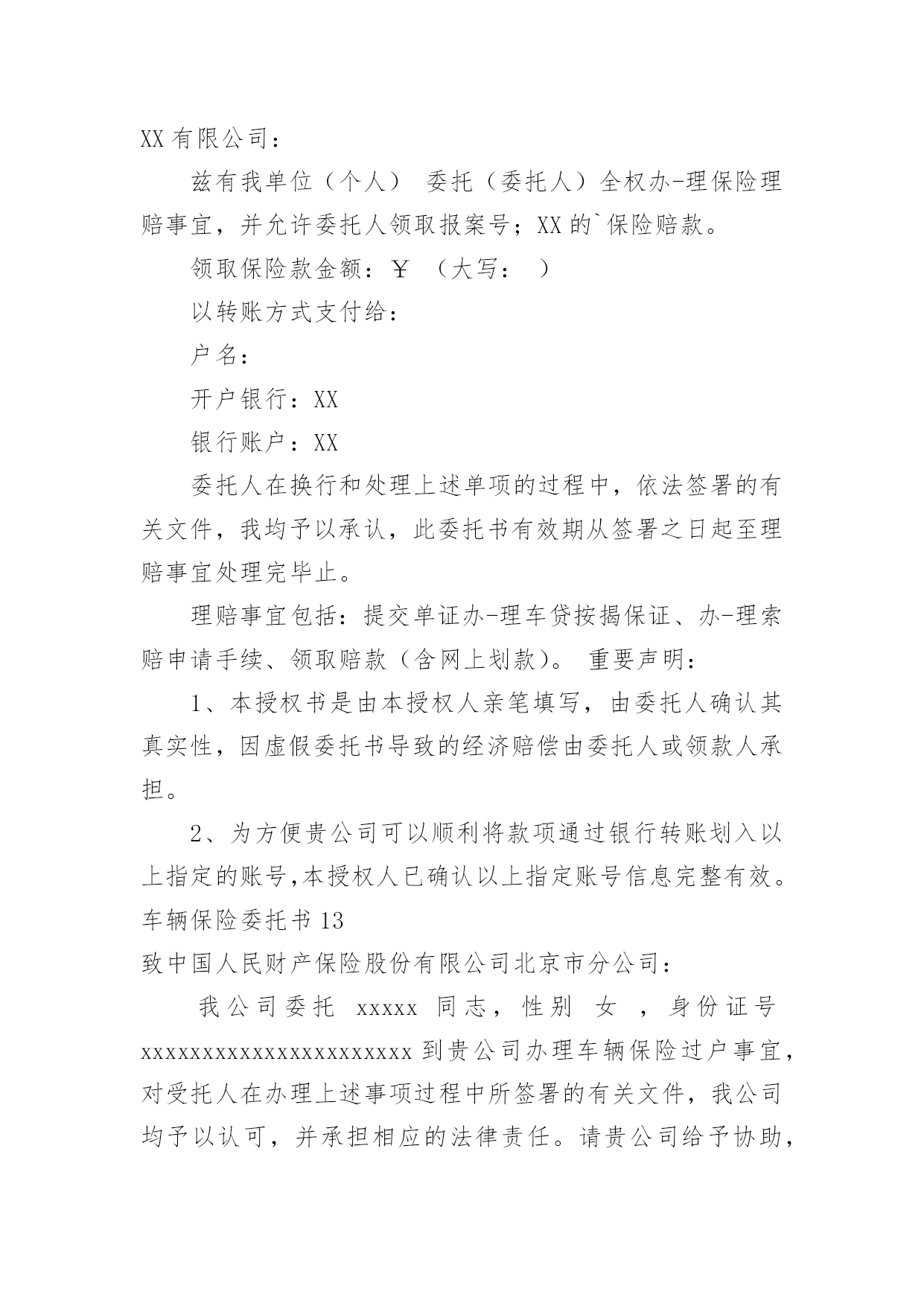 车辆保险委托书车辆保险委托书被委托人如果没有做出违背国家法律的任何权益,委托人无有权终止委托协议。在现实社会中,委托书在处理事务上起到的作用越来越大,相信很多朋友都对写委托书感到非常苦恼吧,以下是小编为大家收集的车辆保险委托书,欢迎大家借鉴与参考,希望对大家有所帮助。车辆保险委托书1致中国人民财产保险股份有限公司XX市分公司:我公司委托xxxxx同志,性别女,身份证号xxxxxxxxxxxxxxxxxxxxxx到贵公司办理车辆保险过户事宜,对受托人在办理上述事项过程中所签署的有关文件,我公司均予以认可,并承担相应的法律责任。请贵公司给予协助,谢谢!委托期限:20xx年9月25日-20xx年10月31日xxxxxxxxxxx公司20xx年9月25日车辆保险委托书2委托人:姓名__________性别___年龄____身份证编号________________受托人:姓名__________性别____年龄____身份证编号________________兹委托受托人____________为我的代理人,全权代表我办理下列事项:一、二、代理人在其权限范围内签署的`一切有关文件,我均予承认,由此在法律上产生的权利、义务均由委托人享有和承担。代理人有(或无)转委托权。委托人:(签名或盖章)年月日注:1、委托人、受托人均需提供身份证。车辆保险委托书3日期:协议相关方性别身份证号码甲方系xxx妻子系xxx父亲系xxx母亲系xxx儿子乙方系xxx车驾驶员丙方系xxx车所有人一、事故发生时间:年月日;地点:二、事故概况:年月日中午,xxx驾驶xxxx与xxxx在xxxx发生交通事故,xxx送xx医院经抢救无效死亡。三、协议条款:甲乙丙三方在自愿的基础上,依据国家相关法律、法规的规定,在xx分局交通警察支队的见证下,经协商一致,就事故赔偿事项协议如下:1、乙方和丙方一次性赔偿甲方各种人身损害赔偿项目以及财产损失项目等费用共计xx万元(小写:xx元)整,其中包括已预付人民币xx万元和剩余款项xx万元。2、甲方同意接受上述赔偿款项,认同xx分局交通警察支队所作的事故责任认定,承诺不再要求乙方、丙方任何形式的`费用和承担其他任何责任,并保证不再要求司法部门追究乙、丙方的任何责任。甲方保证配合乙、丙方向司法机关等有关部门说明情况,出具相关文件或证明。3、甲方要积极配合乙方、丙方进行事故保险理赔事宜。4、本协议签订后拾个工作日内向甲方支付赔偿金xx万元,剩余款项xx万元,待丙方与保险公司理赔工作结束后拾个工作日内全部付清。5、丙方支付上述款项时甲方应出具收据。6、甲方到场签字人(或委托人)保证有全权代理权。7、本协议一式四份,甲方和乙、丙方各执一份,xx分局交通警察支队留存一份,四份具有同等的法律效力,自双方签字(盖章)之日生效。授权人签章(公章):身份证号:日期:车辆保险委托书4(法人或其他组织当事人的委托代理人用)委托单位名称:所在地址:法定代表人或代表人姓名:*****职务:*****受委托人姓名:*****性别:**工作单位:*****物流有限公司电话:现派我公司宋玉山同志前往你处办理鲁LC****车辆违法超载处罚事项,作为我公司委托代理人。委托单位:年月日法定代表人身份证明书****是我*****物流有限公司单位法定代表人,在我*****物流有限公司单位任总经理职务。特此证明.单位公章:年月日车辆保险委托书5(法人或其他组织当事人的委托代理人用)委托单位名称:xxx所在地址:xxxxx法定代表人或代表人姓名:xxxxx职务:xxxxx受委托人姓名:xxxxx性别:xx工作单位:xxxxx物流有限公司电话:12345678910现派我公司xxx前往你处办理鲁LCxxxx车辆违法超载处罚事项,作为我公司委托代理人。委托单位:xxx20xx年x月x日车辆保险委托书6我公司车牌号为____________的车辆于_____年____月___日发生碰撞事故,现授权委托我单位________(身份证号:_________________________)代表我公司处理本次理赔手续。望贵公司协助办理!特此委托!委托人:XXX公司日期:年月日车辆保险委托书7中国人民财产保险股份有限公司公司:委托人全权委托受托人(身份证号:)持贵公司要求的必备文件,以委托人的名义前往贵公司办理(保单号)项下的(车牌号)于(出险时间)所发生保险事故的.领取赔款、退保、退税手续。特此授权。委托人签名:受托人签名:日期:年月日日期:年月日受托人通讯方式:车辆保险委托书8XXX汽车保险股份有限公司:兹有我单位(个人)xxxxxx委托(委托人)全权办理保险理赔事宜,并允许委托人领取报案号;xxxxxx的保险赔款。领取保险款金额:¥xxxxx(大写:xxxxx)以转账方式支付给:户名: