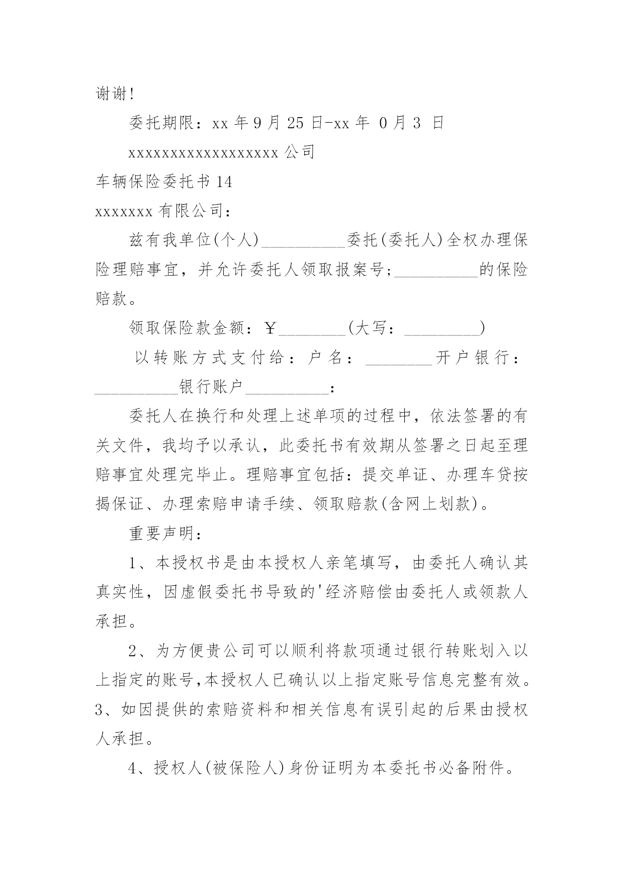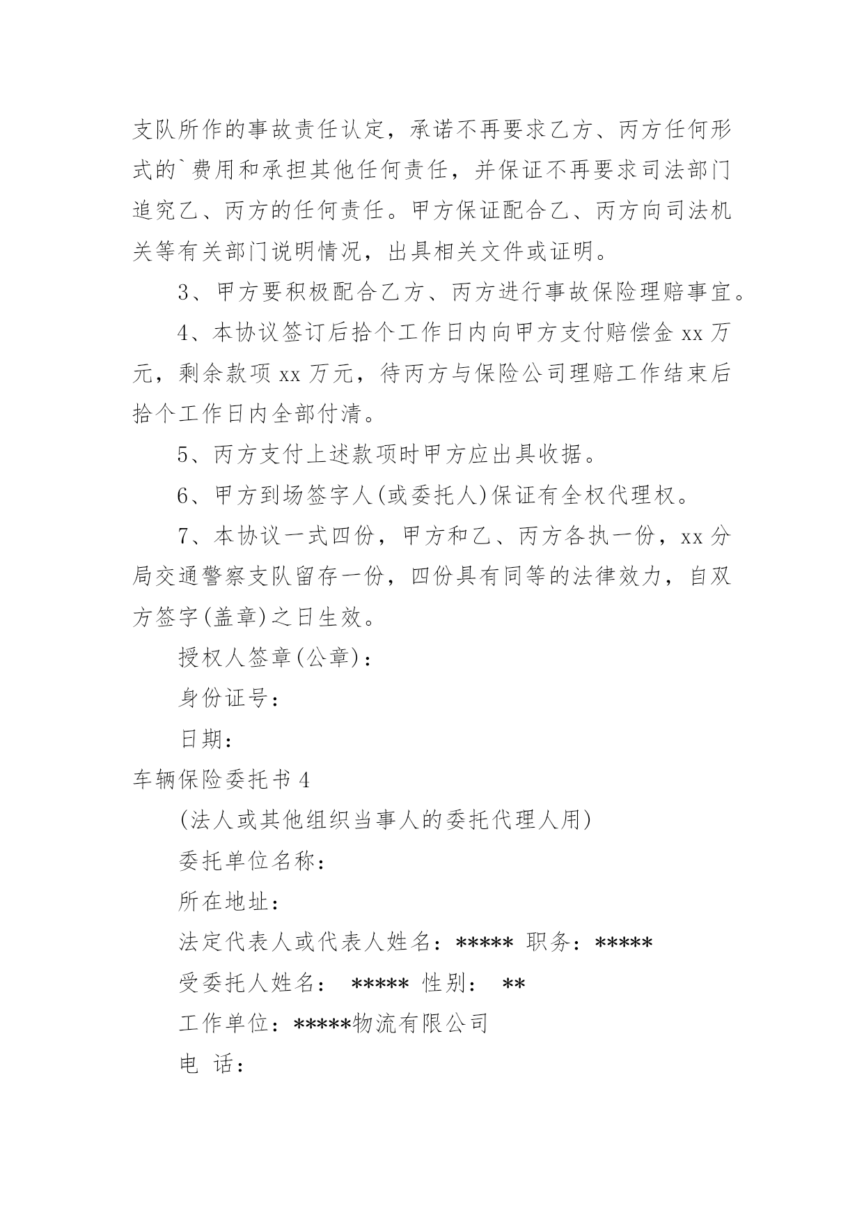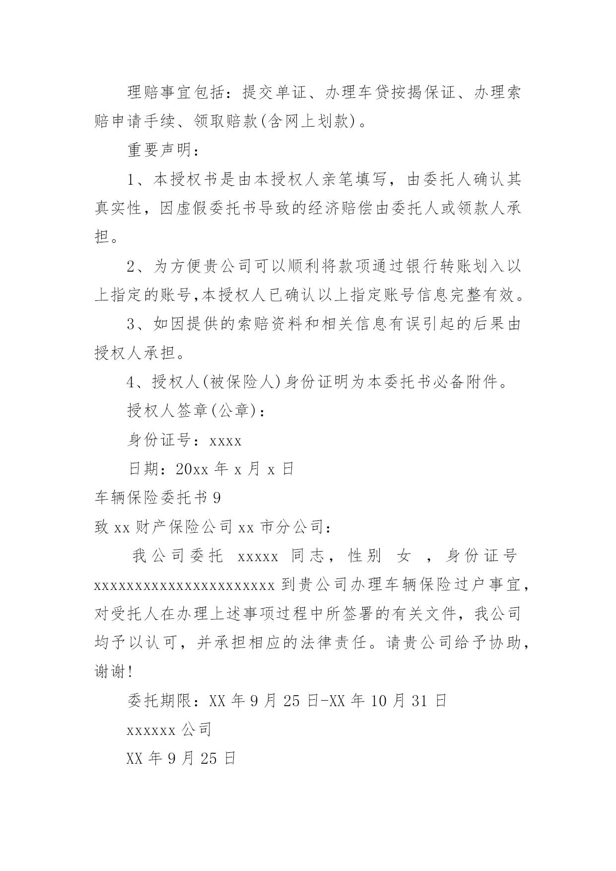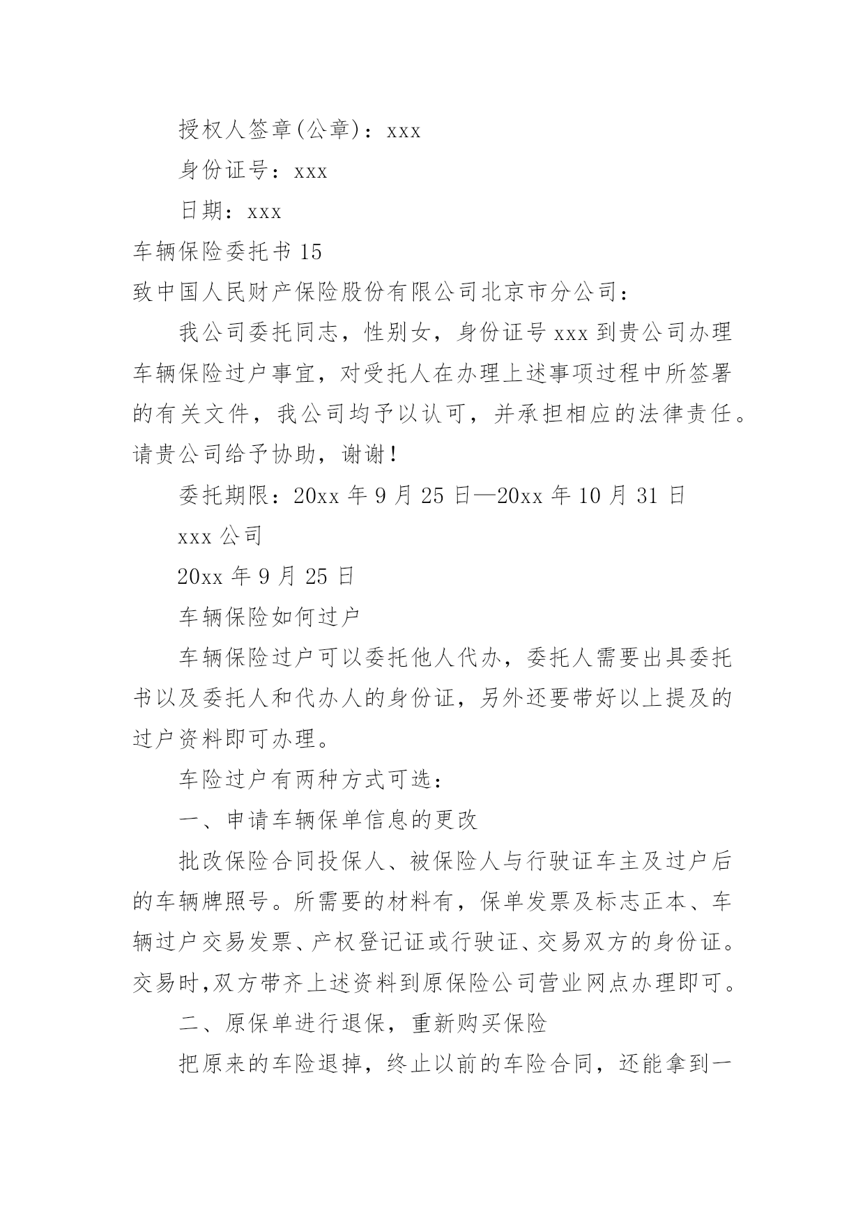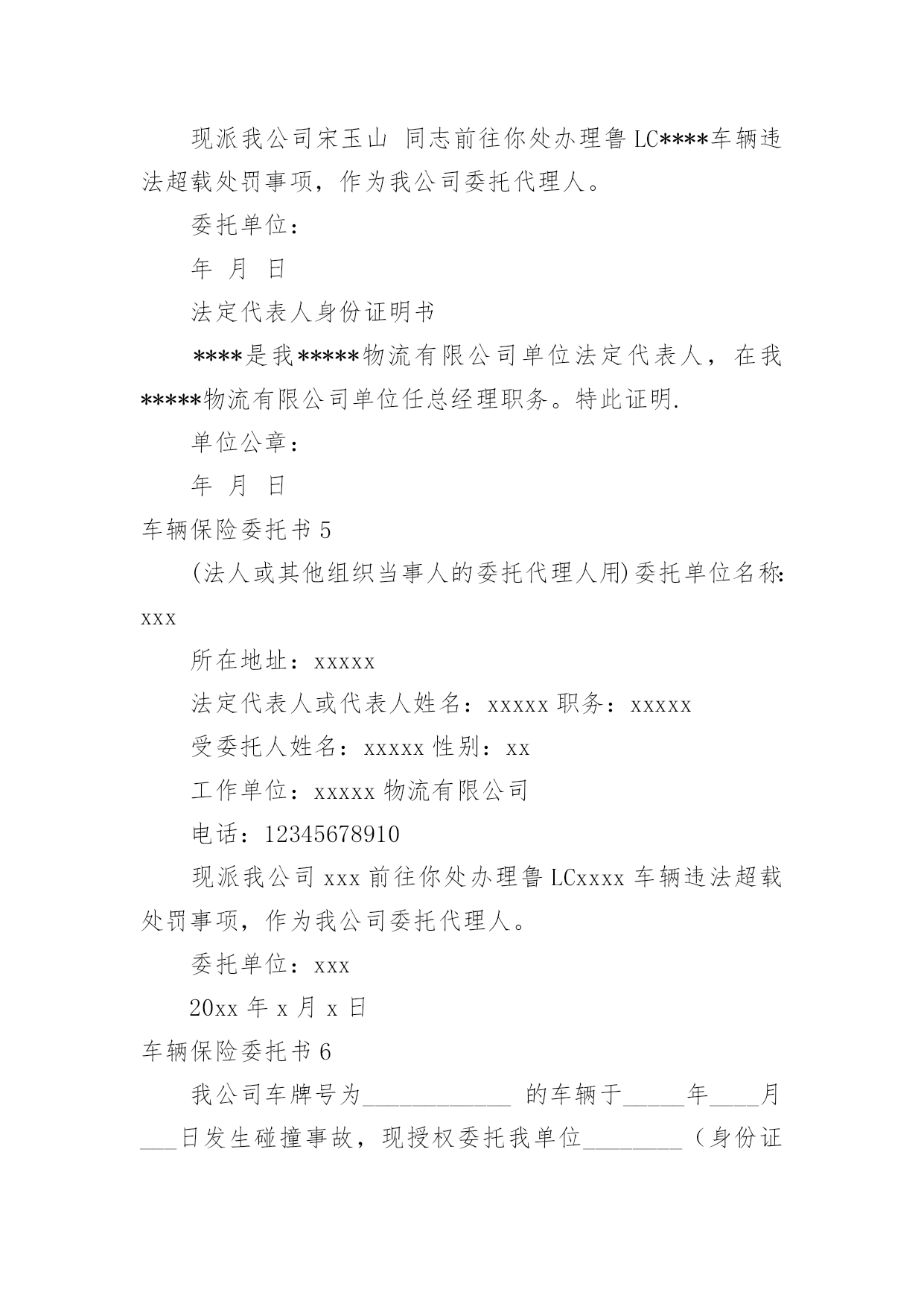 车辆保险委托书车辆保险委托书被委托人如果没有做出违背国家法律的任何权益,委托人无有权终止委托协议。在现实社会中,委托书在处理事务上起到的作用越来越大,相信很多朋友都对写委托书感到非常苦恼吧,以下是小编为大家收集的车辆保险委托书,欢迎大家借鉴与参考,希望对大家有所帮助。车辆保险委托书1致中国人民财产保险股份有限公司XX市分公司:我公司委托xxxxx同志,性别女,身份证号xxxxxxxxxxxxxxxxxxxxxx到贵公司办理车辆保险过户事宜,对受托人在办理上述事项过程中所签署的有关文件,我公司均予以认可,并承担相应的法律责任。请贵公司给予协助,谢谢!委托期限:20xx年9月25日-20xx年10月31日xxxxxxxxxxx公司20xx年9月25日车辆保险委托书2委托人:姓名__________性别___年龄____身份证编号________________受托人:姓名__________性别____年龄____身份证编号________________兹委托受托人____________为我的代理人,全权代表我办理下列事项:一、二、代理人在其权限范围内签署的`一切有关文件,我均予承认,由此在法律上产生的权利、义务均由委托人享有和承担。代理人有(或无)转委托权。委托人:(签名或盖章)年月日注:1、委托人、受托人均需提供身份证。车辆保险委托书3日期:协议相关方性别身份证号码甲方系xxx妻子系xxx父亲系xxx母亲系xxx儿子乙方系xxx车驾驶员丙方系xxx车所有人一、事故发生时间:年月日;地点:二、事故概况:年月日中午,xxx驾驶xxxx与xxxx在xxxx发生交通事故,xxx送xx医院经抢救无效死亡。三、协议条款:甲乙丙三方在自愿的基础上,依据国家相关法律、法规的规定,在xx分局交通警察支队的见证下,经协商一致,就事故赔偿事项协议如下:1、乙方和丙方一次性赔偿甲方各种人身损害赔偿项目以及财产损失项目等费用共计xx万元(小写:xx元)整,其中包括已预付人民币xx万元和剩余款项xx万元。2、甲方同意接受上述赔偿款项,认同xx分局交通警察支队所作的事故责任认定,承诺不再要求乙方、丙方任何形式的`费用和承担其他任何责任,并保证不再要求司法部门追究乙、丙方的任何责任。甲方保证配合乙、丙方向司法机关等有关部门说明情况,出具相关文件或证明。3、甲方要积极配合乙方、丙方进行事故保险理赔事宜。4、本协议签订后拾个工作日内向甲方支付赔偿金xx万元,剩余款项xx万元,待丙方与保险公司理赔工作结束后拾个工作日内全部付清。5、丙方支付上述款项时甲方应出具收据。6、甲方到场签字人(或委托人)保证有全权代理权。7、本协议一式四份,甲方和乙、丙方各执一份,xx分局交通警察支队留存一份,四份具有同等的法律效力,自双方签字(盖章)之日生效。授权人签章(公章):身份证号:日期:车辆保险委托书4(法人或其他组织当事人的委托代理人用)委托单位名称:所在地址:法定代表人或代表人姓名:*****职务:*****受委托人姓名:*****性别:**工作单位:*****物流有限公司电话:现派我公司宋玉山同志前往你处办理鲁LC****车辆违法超载处罚事项,作为我公司委托代理人。委托单位:年月日法定代表人身份证明书****是我*****物流有限公司单位法定代表人,在我*****物流有限公司单位任总经理职务。特此证明.单位公章:年月日车辆保险委托书5(法人或其他组织当事人的委托代理人用)委托单位名称:xxx所在地址:xxxxx法定代表人或代表人姓名:xxxxx职务:xxxxx受委托人姓名:xxxxx性别:xx工作单位:xxxxx物流有限公司电话:12345678910现派我公司xxx前往你处办理鲁LCxxxx车辆违法超载处罚事项,作为我公司委托代理人。委托单位:xxx20xx年x月x日车辆保险委托书6我公司车牌号为____________的车辆于_____年____月___日发生碰撞事故,现授权委托我单位________(身份证号:_________________________)代表我公司处理本次理赔手续。望贵公司协助办理!特此委托!委托人:XXX公司日期:年月日车辆保险委托书7中国人民财产保险股份有限公司公司:委托人全权委托受托人(身份证号:)持贵公司要求的必备文件,以委托人的名义前往贵公司办理(保单号)项下的(车牌号)于(出险时间)所发生保险事故的.领取赔款、退保、退税手续。特此授权。委托人签名:受托人签名:日期:年月日日期:年月日受托人通讯方式:车辆保险委托书8XXX汽车保险股份有限公司:兹有我单位(个人)xxxxxx委托(委托人)全权办理保险理赔事宜,并允许委托人领取报案号;xxxxxx的保险赔款。领取保险款金额:¥xxxxx(大写:xxxxx)以转账方式支付给:户名: