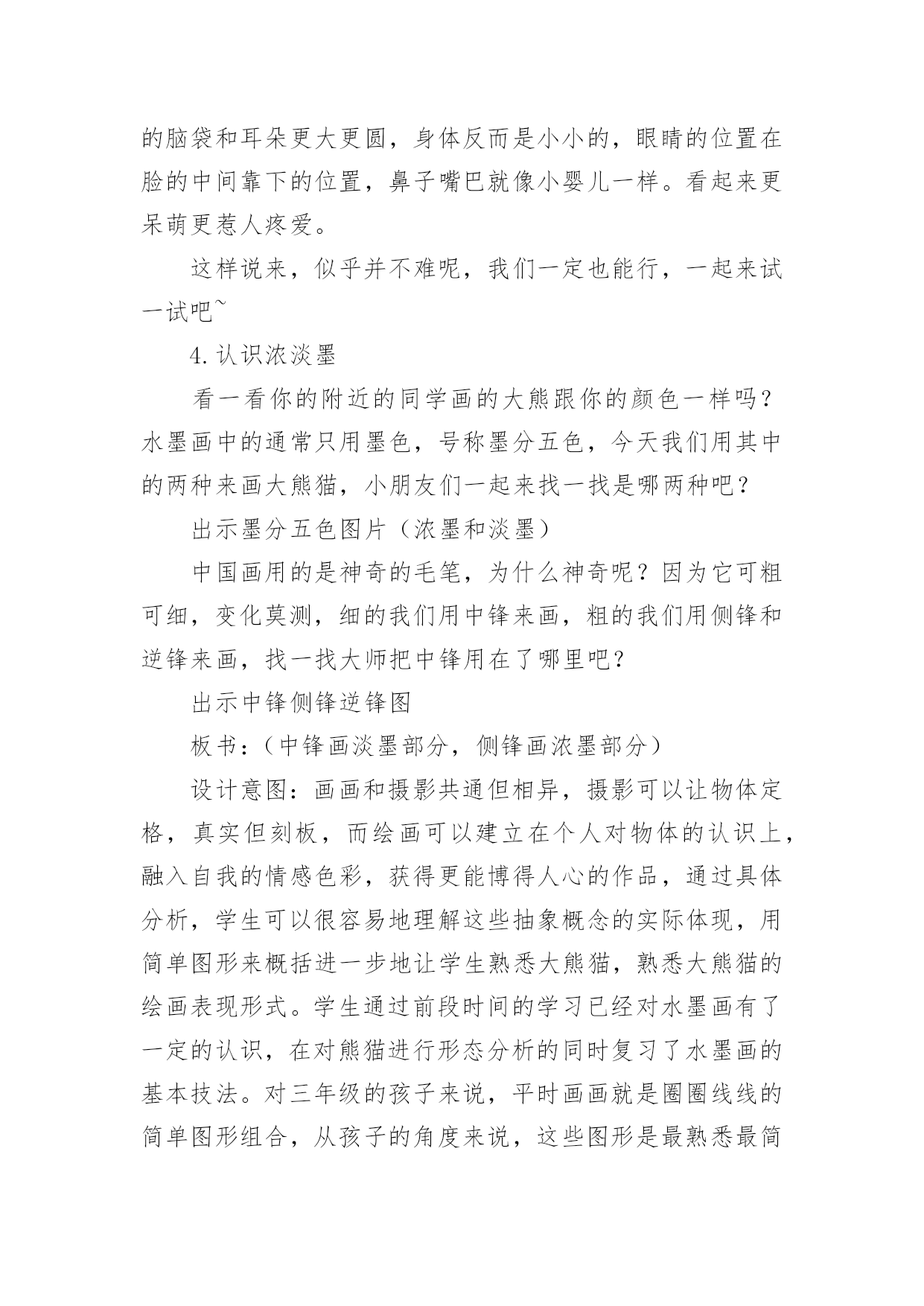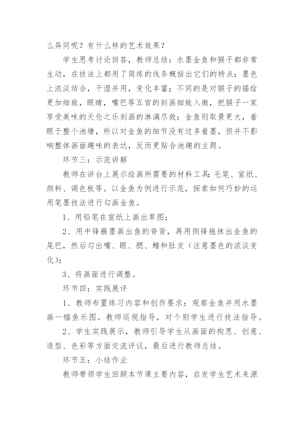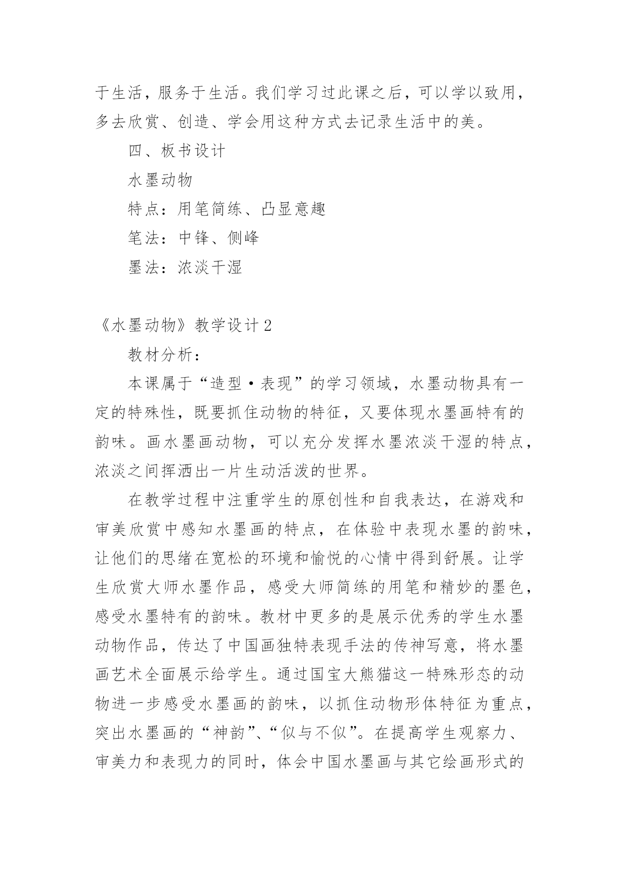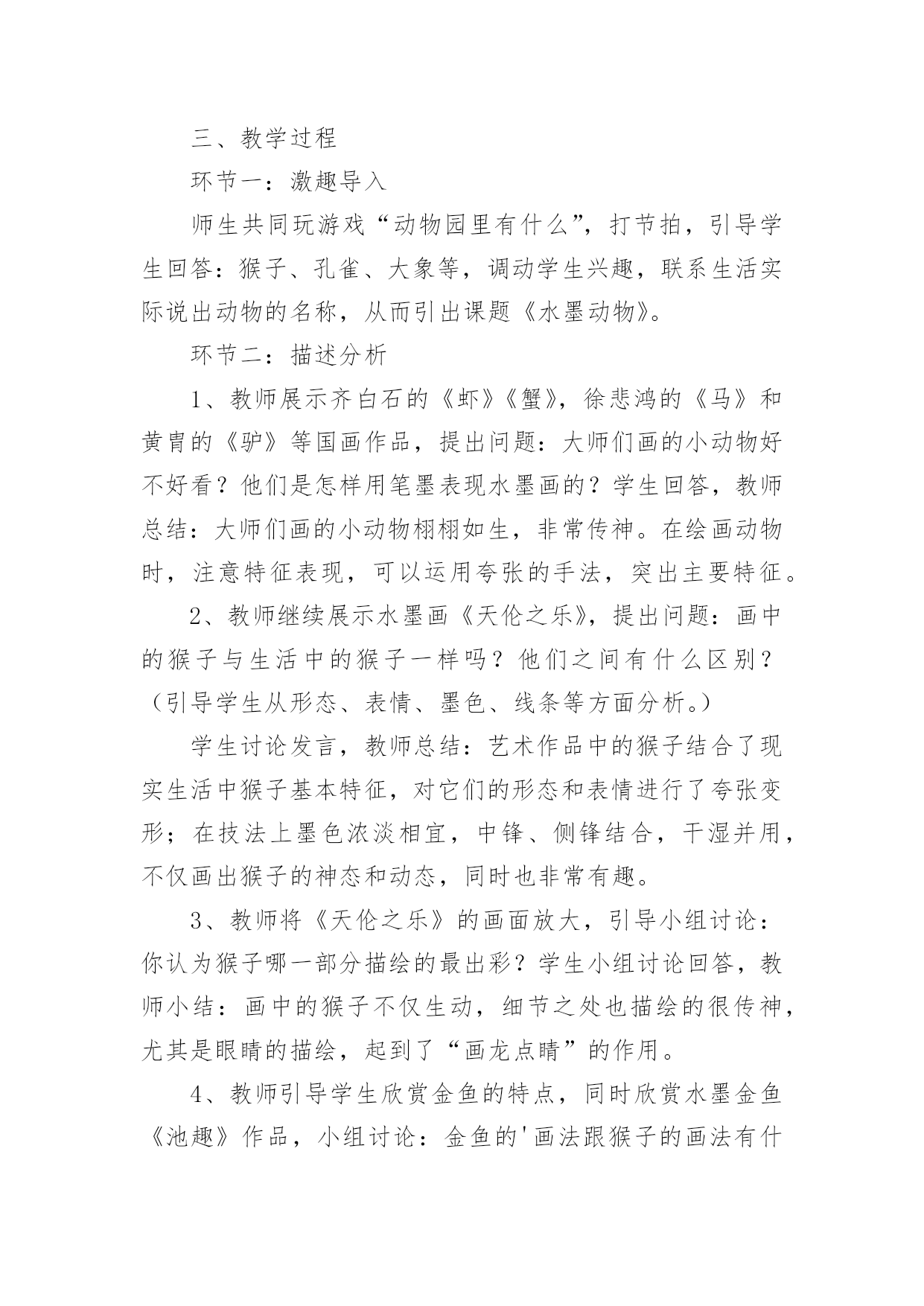 《水墨动物》教学设计作为一位杰出的老师,通常需要准备好一份教学设计,教学设计是把教学原理转化为教学材料和教学活动的计划。教学设计应该怎么写才好呢?以下是小编为大家收集的《水墨动物》教学设计,希望对大家有所帮助。《水墨动物》教学设计1一、教学目标【知识与技能】学会欣赏感受水墨画的独特表现方法,了解水墨画的用笔、用墨等技法,能够绘制一幅水墨金鱼的作品。【过程与方法】通过各种不同墨色和笔墨干湿的综合运用,体验笔墨意趣,激发对水墨画的兴趣。【情感、态度和价值观】学会用水墨艺术语言表现动物特征的同时,增强对动物的喜爱,对自然的热爱以及升华对美的认识。二、教学重难点【重点】欣赏水墨画动物,进一步感受水墨画的笔墨韵味并学会水墨画的技法。【难点】巧妙运用各种水墨画技法,表现有创意的水墨动物。三、教学过程环节一:激趣导入师生共同玩游戏“动物园里有什么”,打节拍,引导学生回答:猴子、孔雀、大象等,调动学生兴趣,联系生活实际说出动物的名称,从而引出课题《水墨动物》。环节二:描述分析1、教师展示齐白石的《虾》《蟹》,徐悲鸿的《马》和黄胄的《驴》等国画作品,提出问题:大师们画的小动物好不好看?他们是怎样用笔墨表现水墨画的?学生回答,教师总结:大师们画的小动物栩栩如生,非常传神。在绘画动物时,注意特征表现,可以运用夸张的手法,突出主要特征。2、教师继续展示水墨画《天伦之乐》,提出问题:画中的猴子与生活中的猴子一样吗?他们之间有什么区别?(引导学生从形态、表情、墨色、线条等方面分析。)学生讨论发言,教师总结:艺术作品中的猴子结合了现实生活中猴子基本特征,对它们的形态和表情进行了夸张变形;在技法上墨色浓淡相宜,中锋、侧锋结合,干湿并用,不仅画出猴子的神态和动态,同时也非常有趣。3、教师将《天伦之乐》的画面放大,引导小组讨论:你认为猴子哪一部分描绘的最出彩?学生小组讨论回答,教师小结:画中的猴子不仅生动,细节之处也描绘的很传神,尤其是眼睛的描绘,起到了“画龙点睛”的作用。4、教师引导学生欣赏金鱼的特点,同时欣赏水墨金鱼《池趣》作品,小组讨论:金鱼的'画法跟猴子的画法有什么异同呢?有什么样的艺术效果?学生思考讨论回答,教师总结:水墨金鱼和猴子都非常生动,在技法上都用了简练的线条概括出它们的特点;墨色上浓淡结合,干湿并用,变化丰富;不同的是对猴子的描绘更加细致,眼睛,嘴巴等五官的刻画细致入微,把猴子一家享受美味的天伦之乐刻画的淋漓尽致;金鱼则取景更大,着眼于整个池塘,所以对金鱼的细节没有过多着墨,但并不影响整体画面趣味的表达,反而更贴合池趣的主题。环节三:示范讲解教师在讲台上展示绘画所需要的材料工具:毛笔、宣纸、颜料、调色板等。以金鱼为例进行示范,探索如何巧妙的运用笔墨技法进行勾画金鱼。1、用铅笔在宣纸上画出草图;2、用中锋蘸墨画出鱼的脊背,再用侧锋拖抹出金鱼的尾巴,然后勾出嘴、眼、腮、鳍和肚皮(注意墨色的浓淡变化);3、将画面进行调整。环节四:实践展评1、教师布置练习内容和创作要求:观察金鱼并用水墨画一幅鱼乐图。教师巡视指导,对个别学生进行技法指导。2、学生实践展示,教师引导学生从画面的构思、创意、造型、色彩等方面交流评议,最后进行教师总结。环节五:小结作业教师带领学生回顾本节课主要内容,启发学生艺术来源于生活,服务于生活。我们学习过此课之后,可以学以致用,多去欣赏、创造、学会用这种方式去记录生活中的美。四、板书设计水墨动物特点:用笔简练、凸显意趣笔法:中锋、侧峰墨法:浓淡干湿《水墨动物》教学设计2教材分析:本课属于“造型·表现”的学习领域,水墨动物具有一定的特殊性,既要抓住动物的特征,又要体现水墨画特有的韵味。画水墨画动物,可以充分发挥水墨浓淡干湿的特点,浓淡之间挥洒出一片生动活泼的世界。在教学过程中注重学生的原创性和自我表达,在游戏和审美欣赏中感知水墨画的特点,在体验中表现水墨的韵味,让他们的思绪在宽松的环境和愉悦的心情中得到舒展。让学生欣赏大师水墨作品,感受大师简练的用笔和精妙的墨色,感受水墨特有的韵味。教材中更多的是展示优秀的学生水墨动物作品,传达了中国画独特表现手法的传神写意,将水墨画艺术全面展示给学生。通过国宝大熊猫这一特殊形态的动物进一步感受水墨画的韵味,以抓住动物形体特征为重点,突出水墨画的“神韵”、“似与不似”。在提高学生观察力、审美力和表现力的同时,体会中国水墨画与其它绘画形式的区别,培养学生学习中国水墨画的兴趣和热爱祖国民族文化的情感。学生情况:本课的教学对象是小学三年级的学生,前期都有对水墨的接触。学生从墨点、墨线、墨块到花卉、植物等,经过一系列的训练,对基本笔法和水墨运用都有一定了解。喜欢动物是孩子们的天性,用画笔来表现动物也是他们津津乐道的事情,尝试用水墨的方法来表现,更会给孩子们带来新奇的感觉。但是如何用丰富的水墨语言表现出动物