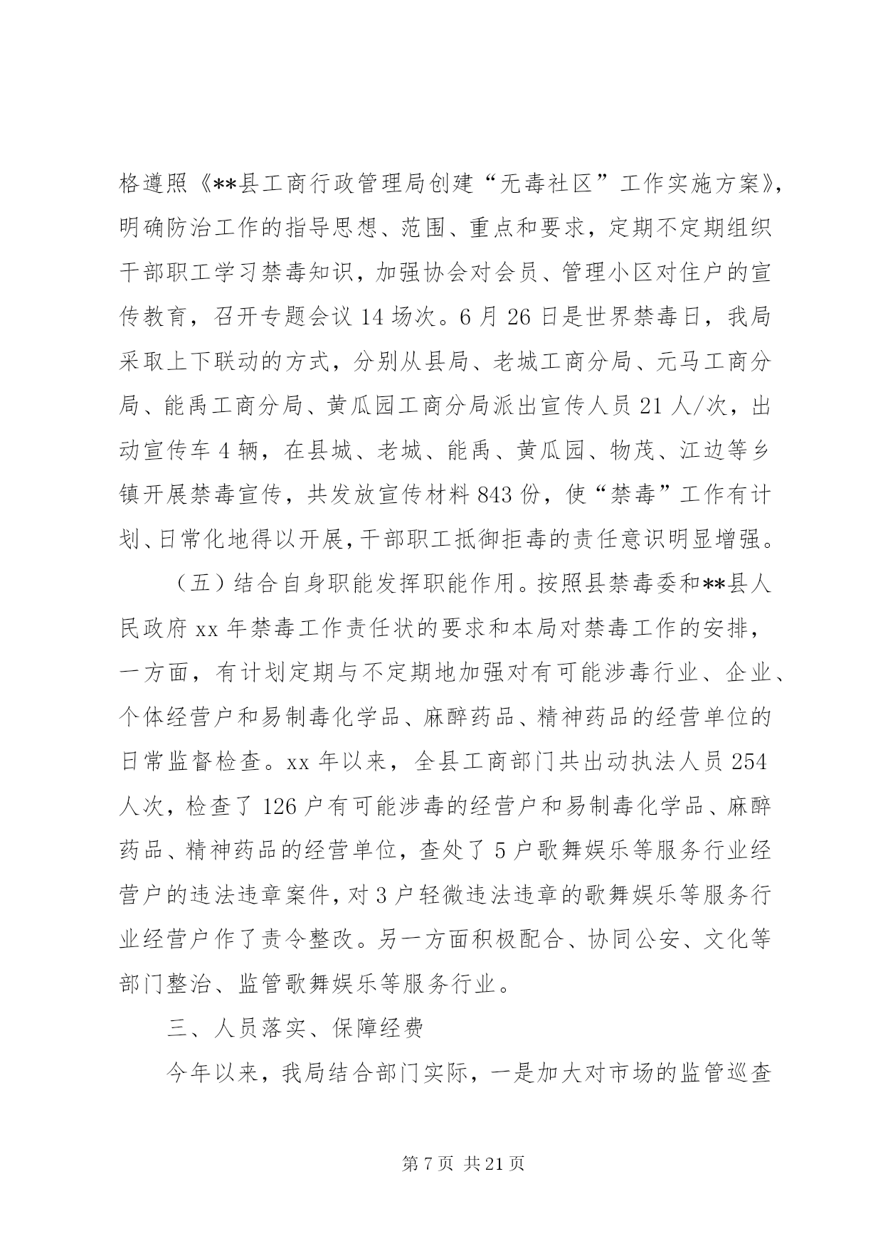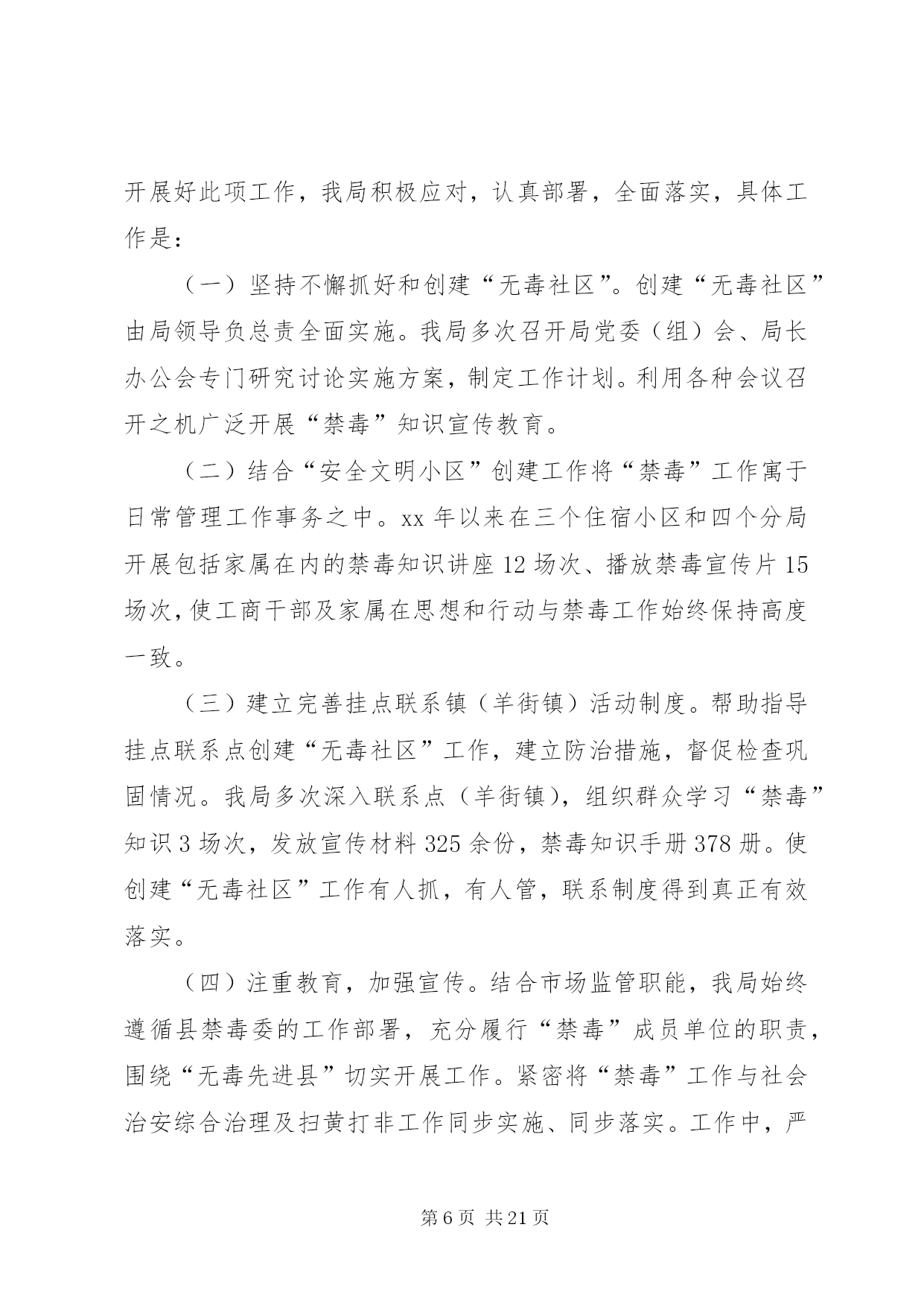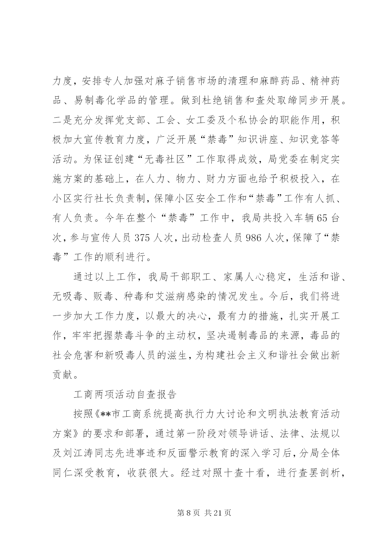 第PAGE\*Arabic\*MERGEFORMAT21页共NUMPAGES\*MERGEFORMAT21页工商自查报告4篇禁毒工作是一项长期复杂的系统工程,是关系国际民生的大事,工商行政部门在这项系统工程中责无旁贷。近几年来,我局班子充分认识到了禁毒工作重要意义,将这项工作纳入了重要议事日程,结合自身职能扎实地开展了禁毒工作。现将我局开展禁毒工作的情况向各位领导、各位委员报告如下。一、认识到位,领导落实一说禁毒,很多人认为这是公、检、法、司的事,只要自己不吸毒就行了,与工商部门没啥关系。为能从思想深处纠正这种错误认识,局长xx在局班子会上、在职工会上多次组织大家认真学习有关禁毒会议精神,深刻领会xx书记在禁毒会上的“要从加强党的执政能力建设和落实科学发展观的高度,充分认识搞好禁毒工作的重要性和紧迫性。要深刻认识坚定不移地搞好禁毒工作是汲取历史教训、防止毒品问题再度祸国殃民的正确抉择,是树立和落实科学发展观、促进经济社会全面协调可持续发展的必然要求,是对加强党的执政能力建设、提高领导水平的重大检验。”的讲话精神。教育全体干部职工要认识到“能不能打赢禁毒斗争,是对我们党执政能力的重大考验;禁毒工作能否取得成效,是衡量一个地区经济社会发展的重要标准。”反复强调本系统内干部职工不仅不能吸毒、涉毒,而且还要充分发挥职能作用,协同相关职能部门共同搞好禁毒工作。为能从组织上保障这项工作落实到实处,xx年我局就成立了禁毒工作领导小组。局长xx任组长,副局长xx、xx任副组长,企业登记科、个体科、消保科、市场科、公平交易科、经济检查支队科、队长为成员,公平交易科承担禁毒的日常事务工作和对内外的协调工作。二、措施得力,重点突出为能把禁毒工作真正落实到实处,局禁毒领导小组多次召开会议专题研究、布置我局的禁毒工作,根据禁毒工作的特点和市禁毒委员会的工作意见,我局结合工商部门的职能和我市的实际,制定出了禁毒工作方案、措施。xx年以来,我们的主要做法是:一是要依据个体、企业登记等法律、法规,严格审查歌舞娱乐等服务场所的主体资格,严把准入关,对不符合法定程序的,一律不予登记,坚决杜绝不合格的主体进入市场。二是配合有关部门加强对对麻醉药品、精神药品管理和易制毒化学品生产、经营企业的日常监管理。三是大力整顿易制毒化学品管理秩序,对经营有易制毒化学品的企业和重点监管,严防易制毒化学品流入非法渠道。四是强化市场监管,规范市场行为,对公安等部门查实参与贩毒、非法贩卖易制毒化学品、麻醉药品、精神药品的经营单位,要严肃查处,依法吊销其营业执照。五是重点治理歌舞厅、夜总会等歌舞娱乐场所吸贩“摇头丸”、“氯胺胴”等兴奋剂的问题。实行辖区责任制,要与公安、文化等部门密切配合,对辖区内的歌舞娱乐场所逐一进行检查。对为吸贩“摇头丸”等兴奋剂提供便利条件或从事买卖“摇头丸”的歌舞娱乐场所要坚决予以取缔。六是各级个、私协要加强了对个体工商户和私营企业主的教育,让他们深刻认识到毒品的危害,在思想上构筑禁毒“防火墙”,做到自己不参与吸毒,从而不经营贩卖毒品。七是发挥工商部门支持服务就业的优势,认真做好对戒毒出所人员从事个体经营、到私营企业就业的引导、扶持、服务工作。三、精心组织,重拳出击xx年以来,我局的禁毒工作在市禁毒委员会等相关部门的领导和指导下,卓有成效地开展了禁毒工作。主要成效体现在两方面,一是做好了禁毒的宣传教育工作。在系统内常抓了对干部、职工和家属的宣传、教育工作,到目前为止,在系统内无论是干部、职工,还是家属都无吸毒、涉毒的问题。在对社会的宣传方面,每年的禁毒日,从市局机关到各分局机关再到各基层工商所都要组织力量宣传禁毒,并张贴、悬挂禁毒标语。二是结合自身职能并发挥职能优势,按照市禁毒委员会每年的工作意见和本局对禁毒工作的安排,精心组织实施了本局所制定的禁毒工作方案。一方面,有计划定期与不定期地加强了对有可能涉毒行业、企业、个体经营户和易制毒化学品、麻醉药品、精神药品的经营单位的日常监督检查。从xx年以来,据不完全统计,全市工商部门共出动xx人次,检查了xx户有可能涉毒的经营户和易制毒化学品、麻醉药品、精神药品的经营单位,查处了xx件歌舞娱乐等服务行业经营户的违法违章案件,对xx户轻微违法违章的歌舞娱乐等服务行业经营户作了责令整改。另一方面积极配合、协同公安、文化等部门整治、监管歌舞娱乐等服务行业。从xx年以来,据不完全统计,全市工商部门配合、协同公安、文化等部门整治、监管歌舞娱乐等服务行业,共出动xx人次,检查了xx户有可能涉毒的经营户和易制毒化学品、麻醉药品、精神药品的经营单位。总之,我局上述的措施和一系列行动,从工商部门自身的职能来说,有力地震慑了毒犯和吸毒人员,极大地遏止了毒害在我市的漫延。然而,我局的禁毒工作距人大、政府和相关上级部门的