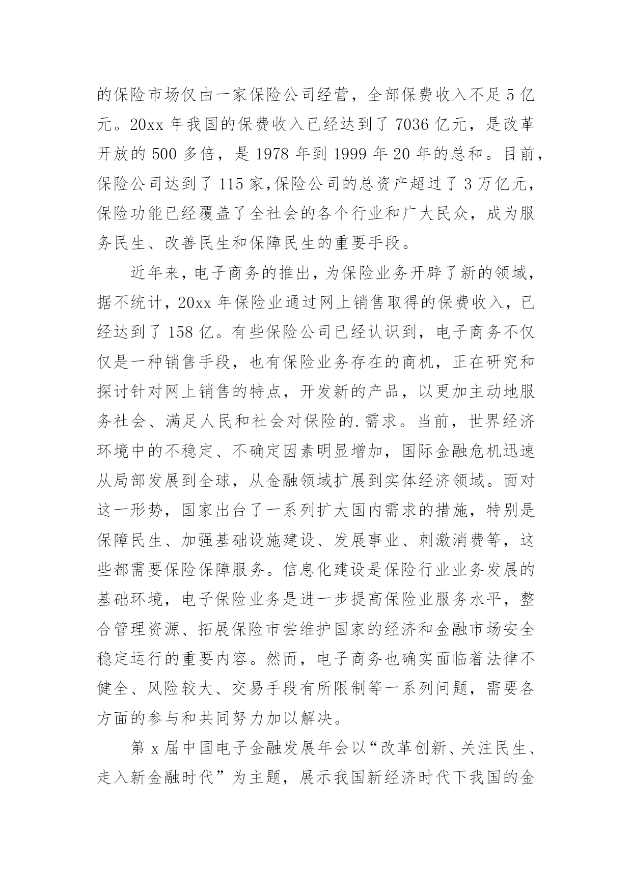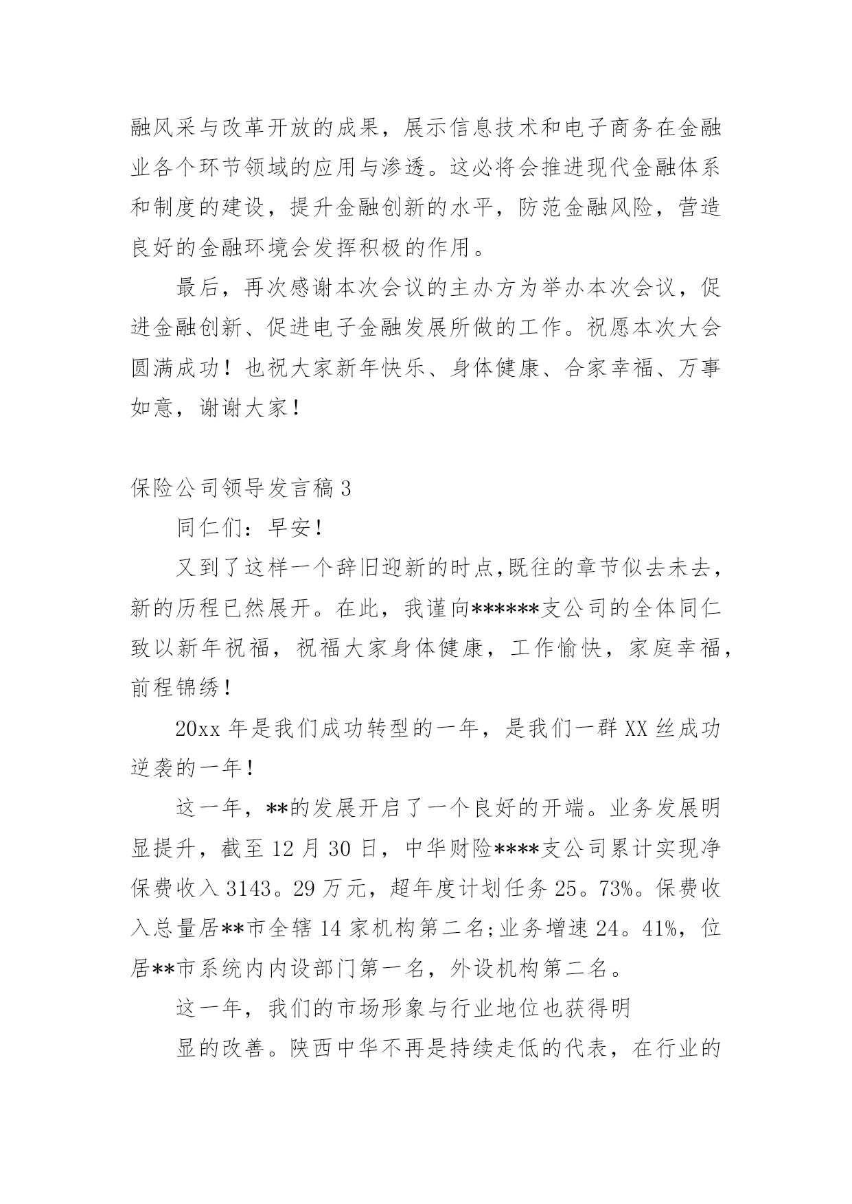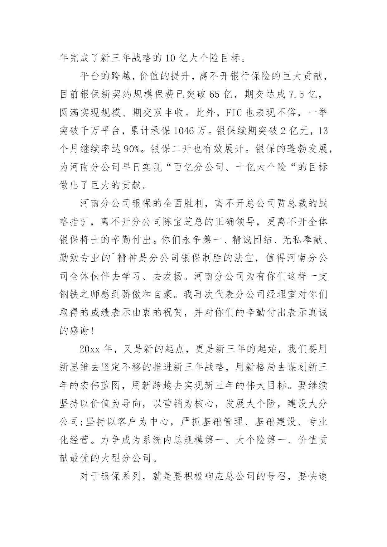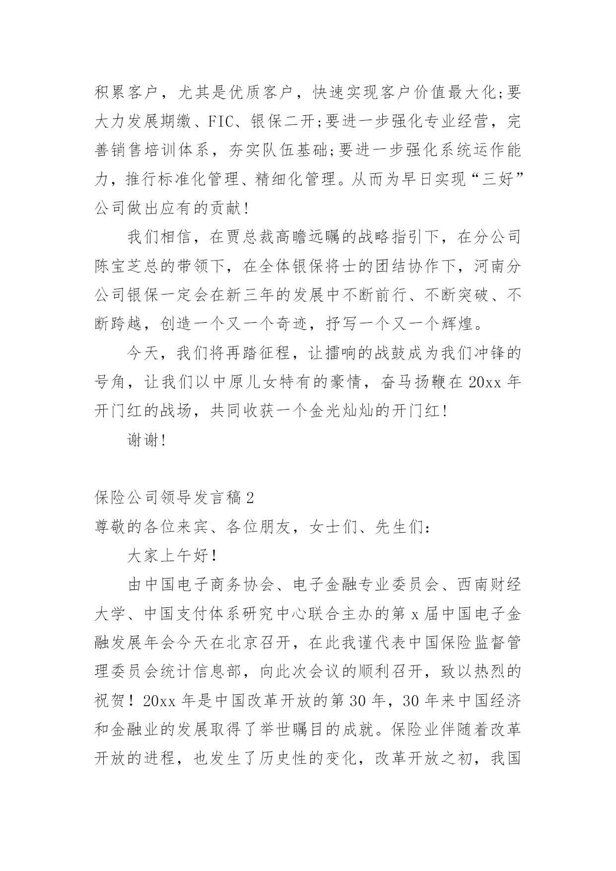 保险公司领导发言稿现如今,需要使用发言稿的事情愈发增多,发言稿的格式由称谓、开场白、主干、结尾等几部分组成。你写发言稿时总是无从下笔?下面是小编收集整理的保险公司领导发言稿,希望能够帮助到大家。保险公司领导发言稿1尊敬的贾总裁、银保系列的各位精英:大家上午好!首先,让我们以热烈的掌声欢迎今天亲临启动会现场的贾总裁一行。日月开新元,天地又一春。在这个辞旧迎新的猪年岁末,我们掀开了泰康人寿河南分公司银保历史上的新篇章,写下了河分银保发展史上最为浓重的一笔。昨天,我们成功摘下银行保险“规模、期缴”双达成的桂冠,继续领跑全系统。在此,我谨代表分公司总经理室向大家表示最热烈的祝贺和最诚挚的感谢。20xx年,我们在总公司“以价值为导向、发展大个险、建设大分公司”的战略指引下,规模、期缴齐抓共进,保费平台实现新跨越。截止12月21日,我们共实现保费收入87.7亿元,稳居系统第一,市场第二,今年有望跨越90亿新平台。同时,我们在价值的创造上稳步向前。截至12月21日,大个险累计实现保费收入11亿,全系统第一,提前两年完成了新三年战略的10亿大个险目标。平台的跨越,价值的提升,离不开银行保险的巨大贡献,目前银保新契约规模保费已突破65亿,期交达成7.5亿,圆满实现规模、期交双丰收。此外,FIC也表现不俗,一举突破千万平台,累计承保1046万。银保续期突破2亿元,13个月继续率达90%。银保二开也有效展开。银保的蓬勃发展,为河南分公司早日实现“百亿分公司、十亿大个险“的目标做出了巨大的贡献。河南分公司银保的全面胜利,离不开总公司贾总裁的战略指引,离不开分公司陈宝芝总的正确领导,更离不开全体银保将士的辛勤付出。你们永争第一、精诚团结、无私奉献、勤勉专业的`精神是分公司银保制胜的法宝,值得河南分公司全体伙伴去学习、去发扬。河南分公司为有你们这样一支钢铁之师感到骄傲和自豪。我再次代表分公司经理室对你们取得的成绩表示由衷的祝贺,并对你们的辛勤付出表示真诚的感谢!20xx年,又是新的起点,更是新三年的起始,我们要用新思维去坚定不移的推进新三年战略,用新格局去谋划新三年的宏伟蓝图,用新跨越去实现新三年的伟大目标。要继续坚持以价值为导向,以营销为核心,发展大个险,建设大分公司;坚持以客户为中心,严抓基础管理、基础建设、专业化经营。力争成为系统内总规模第一、大个险第一、价值贡献最优的大型分公司。对于银保系列,就是要积极响应总公司的号召,要快速积累客户,尤其是优质客户,快速实现客户价值最大化;要大力发展期缴、FIC、银保二开;要进一步强化专业经营,完善销售培训体系,夯实队伍基础;要进一步强化系统运作能力,推行标准化管理、精细化管理。从而为早日实现“三好”公司做出应有的贡献!我们相信,在贾总裁高瞻远瞩的战略指引下,在分公司陈宝芝总的带领下,在全体银保将士的团结协作下,河南分公司银保一定会在新三年的发展中不断前行、不断突破、不断跨越,创造一个又一个奇迹,抒写一个又一个辉煌。今天,我们将再踏征程,让擂响的战鼓成为我们冲锋的号角,让我们以中原儿女特有的豪情,奋马扬鞭在20xx年开门红的战场,共同收获一个金光灿灿的开门红!谢谢!保险公司领导发言稿2尊敬的各位来宾、各位朋友,女士们、先生们:大家上午好!由中国电子商务协会、电子金融专业委员会、西南财经大学、中国支付体系研究中心联合主办的第x届中国电子金融发展年会今天在北京召开,在此我谨代表中国保险监督管理委员会统计信息部,向此次会议的顺利召开,致以热烈的祝贺!20xx年是中国改革开放的第30年,30年来中国经济和金融业的发展取得了举世瞩目的成就。保险业伴随着改革开放的进程,也发生了历史性的变化,改革开放之初,我国的保险市场仅由一家保险公司经营,全部保费收入不足5亿元。20xx年我国的保费收入已经达到了7036亿元,是改革开放的500多倍,是1978年到1999年20年的总和。目前,保险公司达到了115家,保险公司的总资产超过了3万亿元,保险功能已经覆盖了全社会的各个行业和广大民众,成为服务民生、改善民生和保障民生的重要手段。近年来,电子商务的推出,为保险业务开辟了新的领域,据不统计,20xx年保险业通过网上销售取得的保费收入,已经达到了158亿。有些保险公司已经认识到,电子商务不仅仅是一种销售手段,也有保险业务存在的商机,正在研究和探讨针对网上销售的特点,开发新的产品,以更加主动地服务社会、满足人民和社会对保险的.需求。当前,世界经济环境中的不稳定、不确定因素明显增加,国际金融危机迅速从局部发展到全球,从金融领域扩展到实体经济领域。面对这一形势,国家出台了一系列扩大国内需求的措施,特别是保障民生、加强基础设施建设、发展事业、刺激消费等,这些都需要保险保障服务。信息化建设是保险行业业务发展的基础环境,电子保险业务是进一步提高