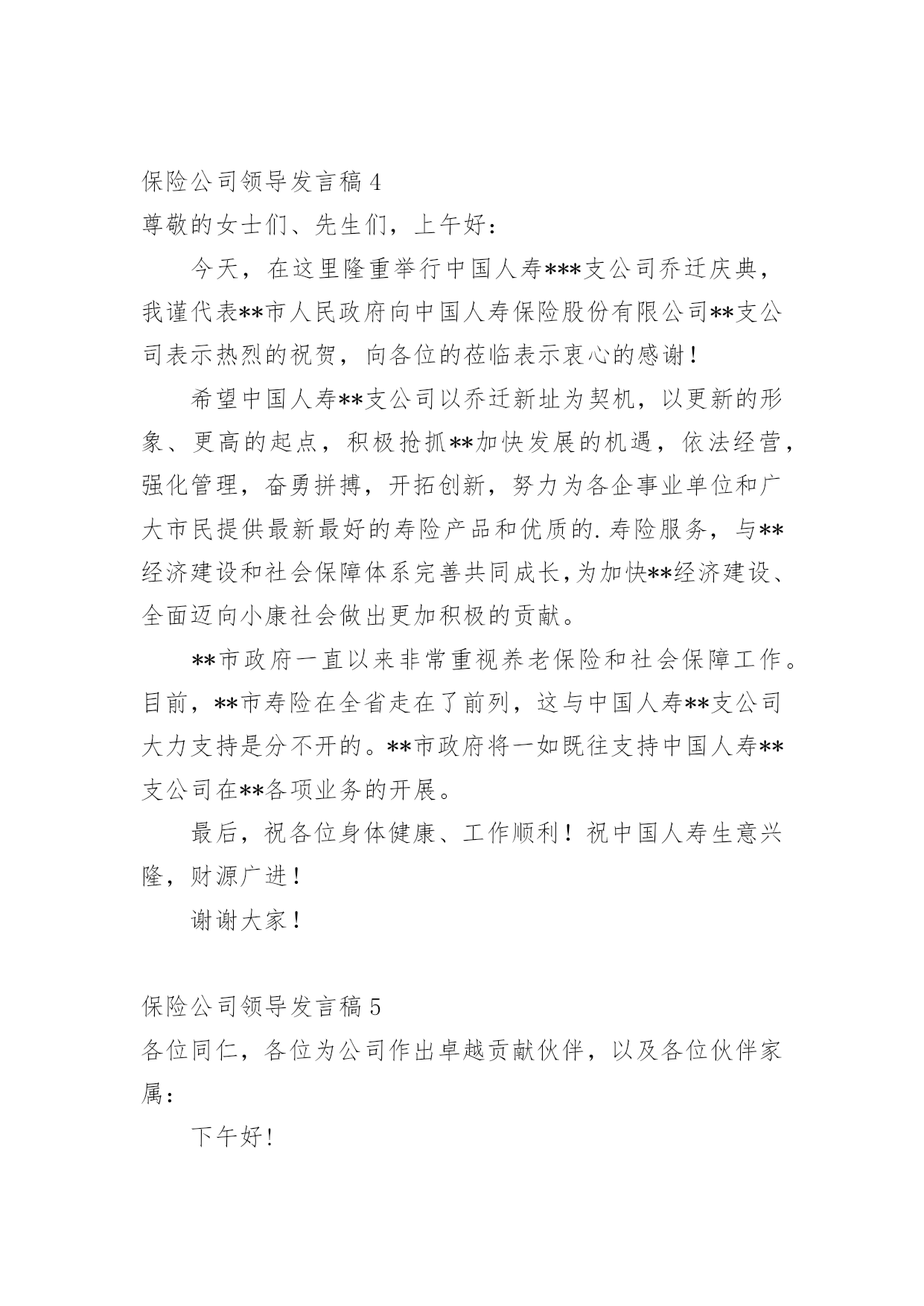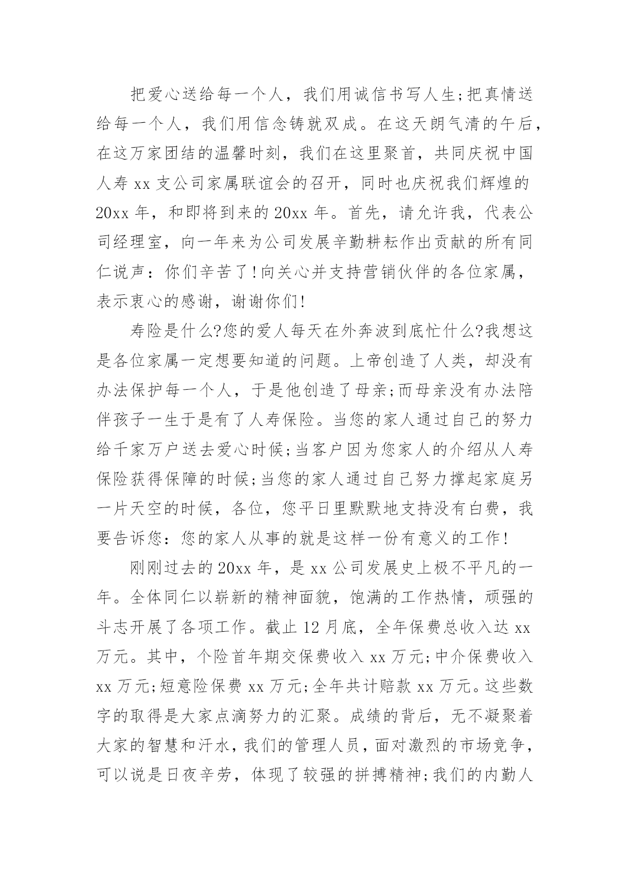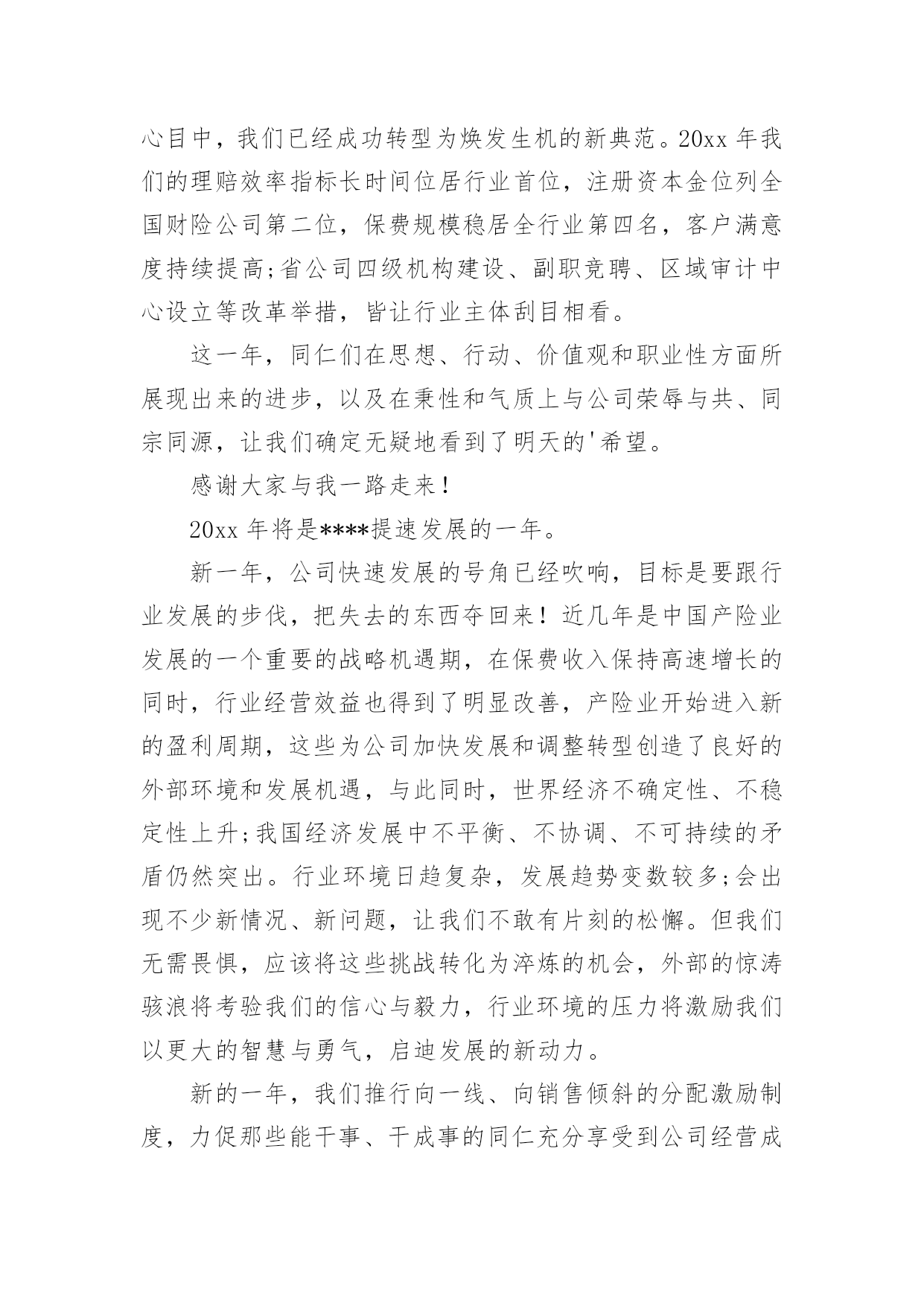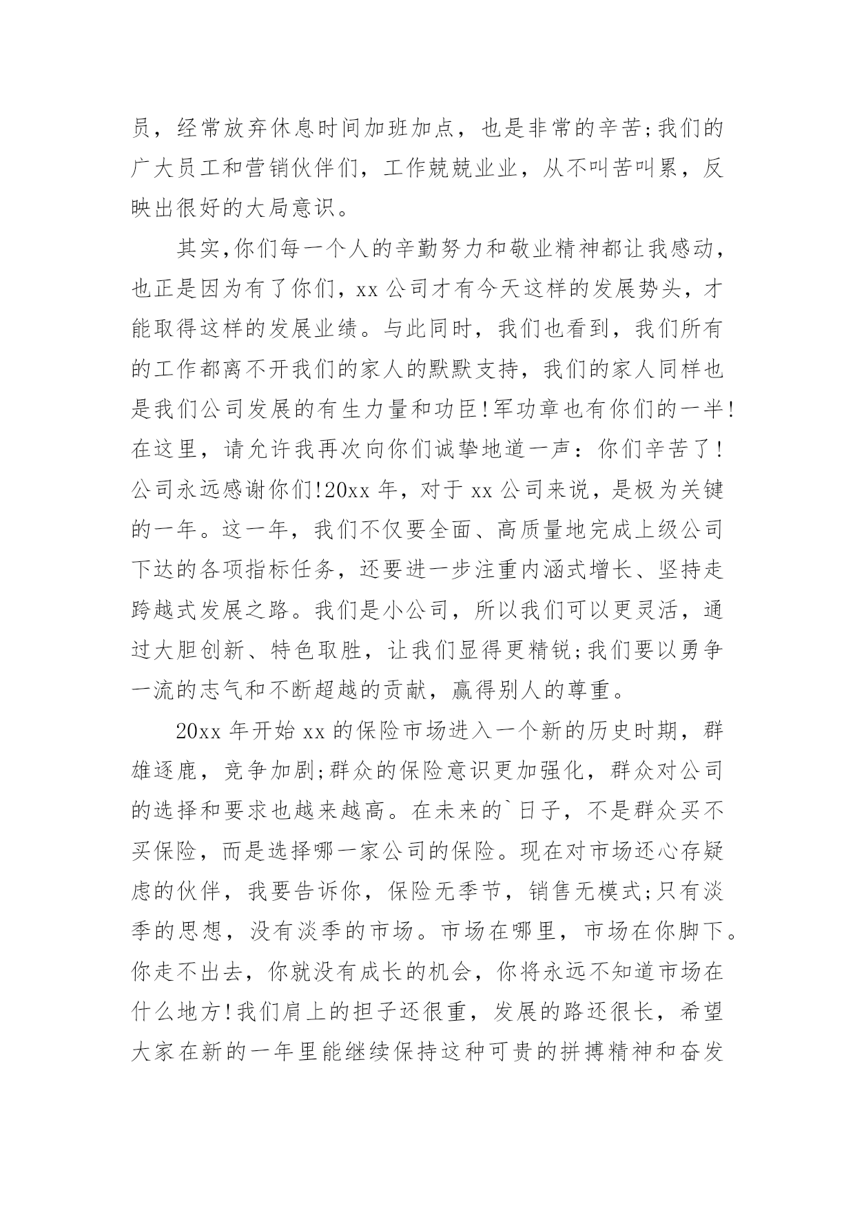 保险公司领导发言稿现如今,需要使用发言稿的事情愈发增多,发言稿的格式由称谓、开场白、主干、结尾等几部分组成。你写发言稿时总是无从下笔?下面是小编收集整理的保险公司领导发言稿,希望能够帮助到大家。保险公司领导发言稿1尊敬的贾总裁、银保系列的各位精英:大家上午好!首先,让我们以热烈的掌声欢迎今天亲临启动会现场的贾总裁一行。日月开新元,天地又一春。在这个辞旧迎新的猪年岁末,我们掀开了泰康人寿河南分公司银保历史上的新篇章,写下了河分银保发展史上最为浓重的一笔。昨天,我们成功摘下银行保险“规模、期缴”双达成的桂冠,继续领跑全系统。在此,我谨代表分公司总经理室向大家表示最热烈的祝贺和最诚挚的感谢。20xx年,我们在总公司“以价值为导向、发展大个险、建设大分公司”的战略指引下,规模、期缴齐抓共进,保费平台实现新跨越。截止12月21日,我们共实现保费收入87.7亿元,稳居系统第一,市场第二,今年有望跨越90亿新平台。同时,我们在价值的创造上稳步向前。截至12月21日,大个险累计实现保费收入11亿,全系统第一,提前两年完成了新三年战略的10亿大个险目标。平台的跨越,价值的提升,离不开银行保险的巨大贡献,目前银保新契约规模保费已突破65亿,期交达成7.5亿,圆满实现规模、期交双丰收。此外,FIC也表现不俗,一举突破千万平台,累计承保1046万。银保续期突破2亿元,13个月继续率达90%。银保二开也有效展开。银保的蓬勃发展,为河南分公司早日实现“百亿分公司、十亿大个险“的目标做出了巨大的贡献。河南分公司银保的全面胜利,离不开总公司贾总裁的战略指引,离不开分公司陈宝芝总的正确领导,更离不开全体银保将士的辛勤付出。你们永争第一、精诚团结、无私奉献、勤勉专业的`精神是分公司银保制胜的法宝,值得河南分公司全体伙伴去学习、去发扬。河南分公司为有你们这样一支钢铁之师感到骄傲和自豪。我再次代表分公司经理室对你们取得的成绩表示由衷的祝贺,并对你们的辛勤付出表示真诚的感谢!20xx年,又是新的起点,更是新三年的起始,我们要用新思维去坚定不移的推进新三年战略,用新格局去谋划新三年的宏伟蓝图,用新跨越去实现新三年的伟大目标。要继续坚持以价值为导向,以营销为核心,发展大个险,建设大分公司;坚持以客户为中心,严抓基础管理、基础建设、专业化经营。力争成为系统内总规模第一、大个险第一、价值贡献最优的大型分公司。对于银保系列,就是要积极响应总公司的号召,要快速积累客户,尤其是优质客户,快速实现客户价值最大化;要大力发展期缴、FIC、银保二开;要进一步强化专业经营,完善销售培训体系,夯实队伍基础;要进一步强化系统运作能力,推行标准化管理、精细化管理。从而为早日实现“三好”公司做出应有的贡献!我们相信,在贾总裁高瞻远瞩的战略指引下,在分公司陈宝芝总的带领下,在全体银保将士的团结协作下,河南分公司银保一定会在新三年的发展中不断前行、不断突破、不断跨越,创造一个又一个奇迹,抒写一个又一个辉煌。今天,我们将再踏征程,让擂响的战鼓成为我们冲锋的号角,让我们以中原儿女特有的豪情,奋马扬鞭在20xx年开门红的战场,共同收获一个金光灿灿的开门红!谢谢!保险公司领导发言稿2尊敬的各位来宾、各位朋友,女士们、先生们:大家上午好!由中国电子商务协会、电子金融专业委员会、西南财经大学、中国支付体系研究中心联合主办的第x届中国电子金融发展年会今天在北京召开,在此我谨代表中国保险监督管理委员会统计信息部,向此次会议的顺利召开,致以热烈的祝贺!20xx年是中国改革开放的第30年,30年来中国经济和金融业的发展取得了举世瞩目的成就。保险业伴随着改革开放的进程,也发生了历史性的变化,改革开放之初,我国的保险市场仅由一家保险公司经营,全部保费收入不足5亿元。20xx年我国的保费收入已经达到了7036亿元,是改革开放的500多倍,是1978年到1999年20年的总和。目前,保险公司达到了115家,保险公司的总资产超过了3万亿元,保险功能已经覆盖了全社会的各个行业和广大民众,成为服务民生、改善民生和保障民生的重要手段。近年来,电子商务的推出,为保险业务开辟了新的领域,据不统计,20xx年保险业通过网上销售取得的保费收入,已经达到了158亿。有些保险公司已经认识到,电子商务不仅仅是一种销售手段,也有保险业务存在的商机,正在研究和探讨针对网上销售的特点,开发新的产品,以更加主动地服务社会、满足人民和社会对保险的.需求。当前,世界经济环境中的不稳定、不确定因素明显增加,国际金融危机迅速从局部发展到全球,从金融领域扩展到实体经济领域。面对这一形势,国家出台了一系列扩大国内需求的措施,特别是保障民生、加强基础设施建设、发展事业、刺激消费等,这些都需要保险保障服务。信息化建设是保险行业业务发展的基础环境,电子保险业务是进一步提高