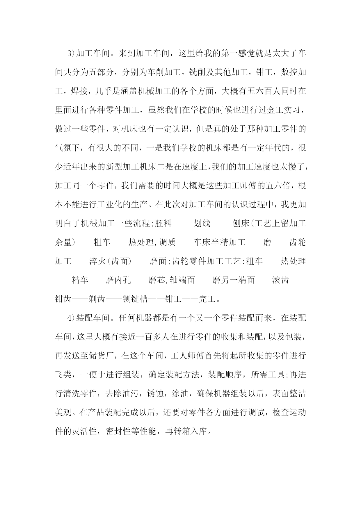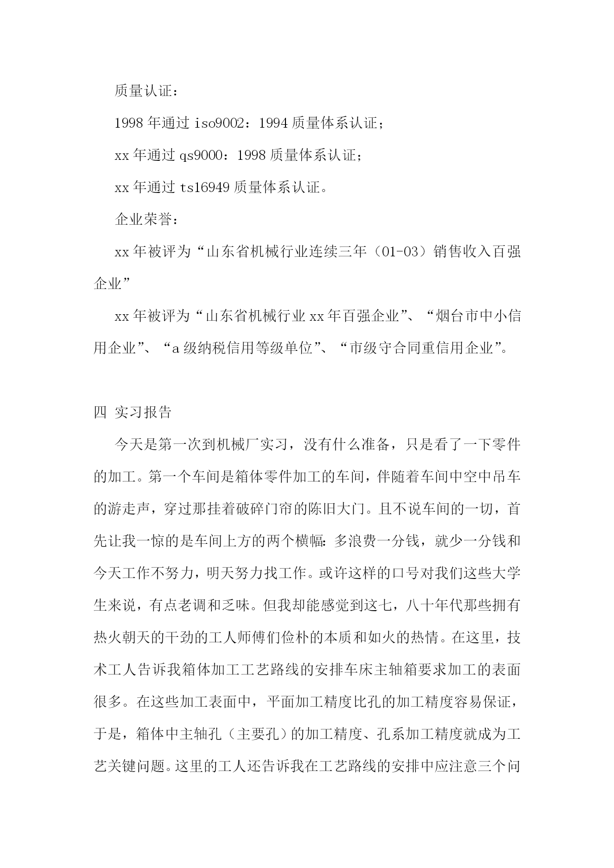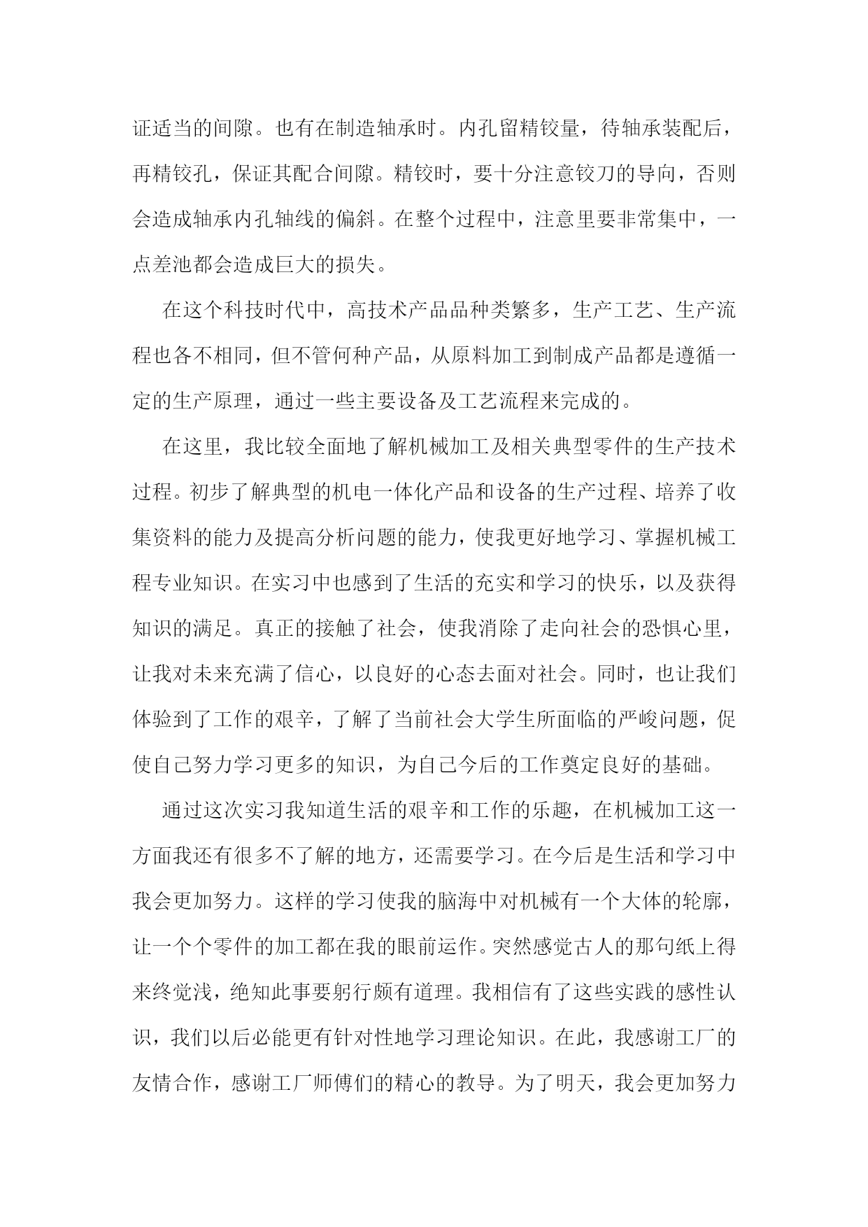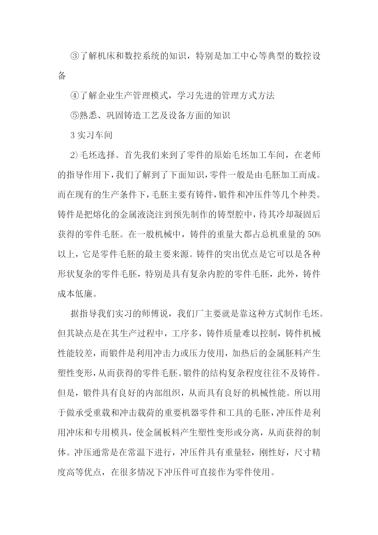机械生产实习报告范文机械生产实习报告范文2一实习目的1.通过现场参观,了解某一产品的即席制造生产过程。2.熟悉主要典型零件(机座,机体,曲轴,凸轮轴,齿轮等或减速机箱体,转动轴,齿轮等)的机械加工工艺过程,了解拟定机械加工工艺过程的一般原则及进行工艺分析的方法。3.了解典型零部件的装配工艺。4.了解一般刀、夹、量具的结构及使用方法。5.参观工厂计量室与车间检验,了解公差与测量技术在生产中的应用。6.参观工厂的先进设备及特种加工,以扩大学生的专业知识面以及对新工艺、新技术的了解。二实习内容与要求1.机械制造的生产过程:了解该厂的主要机械设备的正个生产过程情况及生产中的主要工艺文件(如机械加工过程卡片、机械加工工序卡片等)。2.典型零件工艺1)箱体零件的加工:了解某机械设备机座、机体的机械加工方法,并纪录其工艺过程。分析箱体零件加工平面与孔系的主要加工方法。2)轴类零件的加工:了解轴类及其机械加工工艺并记录其工艺过程。了解某道工序的具体加工工艺(技术要求,刀、夹、量具,切削液等)。3)齿轮加工:了解一至两种齿轮的机械加工工艺,并记录其工艺过程,分析滚齿、插齿加工的运动及特点。结合工厂的参观,简述磨齿、等的齿轮精加工方法。3.了解刀、夹、量具的结构及使用方法,常用机床型号及其特点。4.装配工艺:1)了解机械设备的结构特点及其装配工艺;2)了解机械设备装配后的最终检验项目和检验方法;3)了解主要零部件在加工车间的检验情况,论述公差与技术测量在现场应用的实例。三实习地点山东莱阳信发机械制造有限公司公司简介:山东莱阳信发机械制造有限公司地处胶东半岛腹地莱阳市区军民路中段,分别距青岛、烟台两个开放城市(机场、港口)100公里,距蓝烟铁路6公里,莱潍高速公路10公里,烟青一级公路2公里,其交通条件便利,自然条件和区位优势得天独厚,电力、水力资源丰富。公司成立于1998年,是以生产汽车发动机零件为主的民营企业,是目前国内生产规模最大的内燃机飞轮专业生产企业之一,公司厂区占地13多万平方米,注册资金1294.9万元,下设铸造厂、机械厂、动配厂、工业园区,拥有员工300多人。经营范围:机械(汽车、拖拉机、内燃机配件)制造销售、电子产品研究开发,经营本企业自产品及技术的出口业务和本企业所需的机械设备、零配件、原辅材料及技术的进口业务。批发零售:五金交电、钢材、木材、建筑材料、日用百货等。主要产品:飞轮总成系列、排气管系列、飞轮壳系列、皮带轮系列共四大系列200多个型号,年产量达百万件,其中主导产品飞轮总成系列达60万件以上。公司拥有现代化设备近400台套。铸造设备主要有:z1410造型机、z2410造型机、z148造型机、冲天炉、1.5t中频感应电炉、s136混砂机、q378抛丸清理室、空气压缩机、罗茨制风机等,年铸造吨位量2万余吨。机械加工设备主要有:数控车床及加工中心、飞轮加工生产线、管壳类加工生产设备。公司主要客户:国内客户:江铃、福田、长城、天津丰田及帕金斯、通用五菱等汽车公司;国际客户:韩国大宇、美国atp公司及pai公司、意大利fiat公司、法国defontaine公司等。质量认证:1998年通过iso9002:1994质量体系认证;xx年通过qs9000:1998质量体系认证;xx年通过ts16949质量体系认证。企业荣誉:xx年被评为“山东省机械行业连续三年(01-03)销售收入百强企业”xx年被评为“山东省机械行业xx年百强企业”、“烟台市中小信用企业”、“a级纳税信用等级单位”、“市级守合同重信用企业”。四实习报告今天是第一次到机械厂实习,没有什么准备,只是看了一下零件的加工。第一个车间是箱体零件加工的车间,伴随着车间中空中吊车的游走声,穿过那挂着破碎门帘的陈旧大门。且不说车间的一切,首先让我一惊的是车间上方的两个横幅:多浪费一分钱,就少一分钱和今天工作不努力,明天努力找工作。或许这样的口号对我们这些大学生来说,有点老调和乏味。但我却能感觉到这七,八十年代那些拥有热火朝天的干劲的工人师傅们俭朴的本质和如火的热情。在这里,技术工人告诉我箱体加工工艺路线的安排车床主轴箱要求加工的表面很多。在这些加工表面中,平面加工精度比孔的加工精度容易保证,于是,箱体中主轴孔(主要孔)的加工精度、孔系加工精度就成为工艺关键问题。这里的工人还告诉我在工艺路线的安排中应注意三个问题:1)。工件的时效处理箱体结构复杂壁厚不均匀,铸造内应力较大。由于内应力会引起变形,因此铸造后应安排人工时效处理以消除内应力减少变形。一般精度要求的箱体,可利用粗、精加工工序之间的自然停放和运输时间,得到自然时效的效果。但自然时效需要的时间较长,否则会影响箱体精度的稳定性。对于特别精