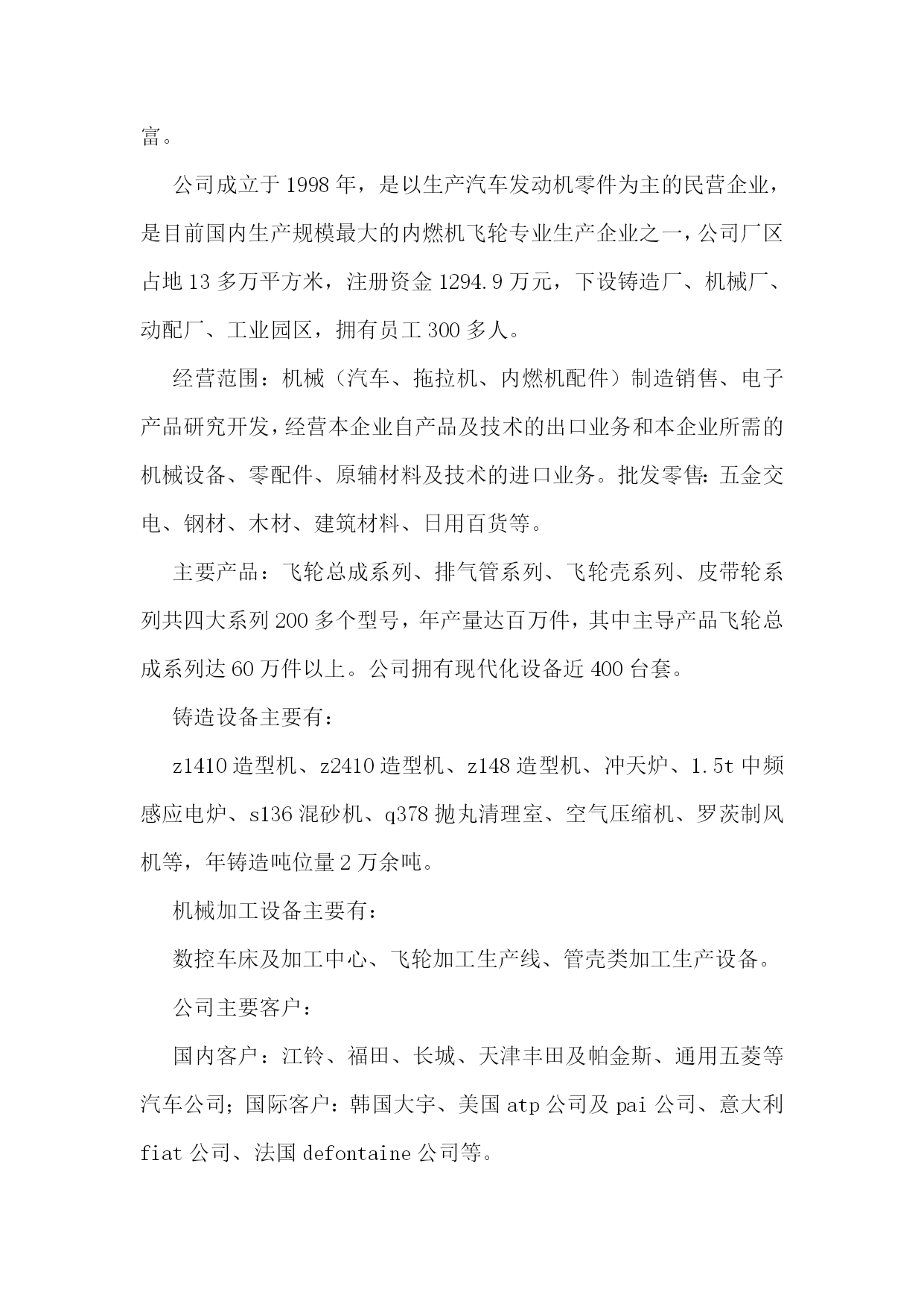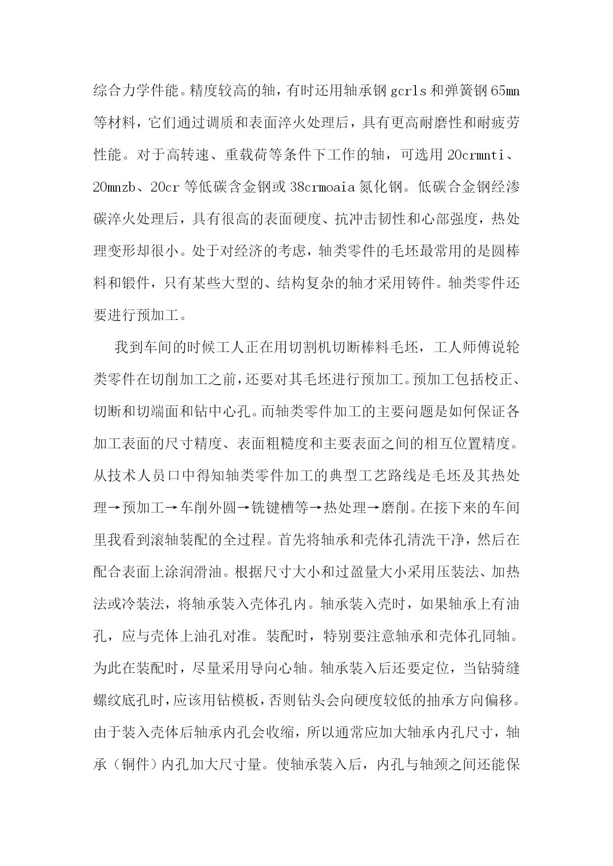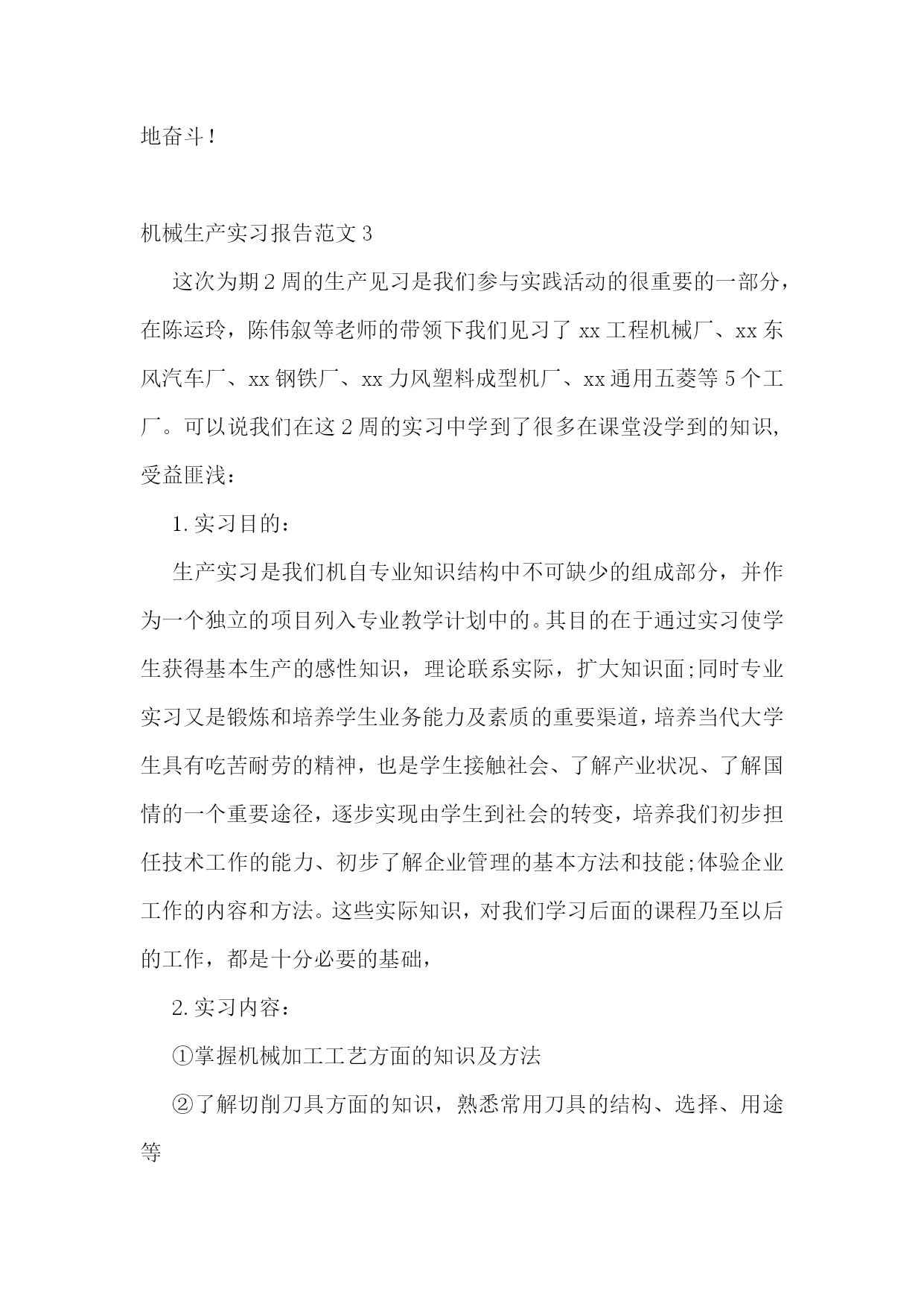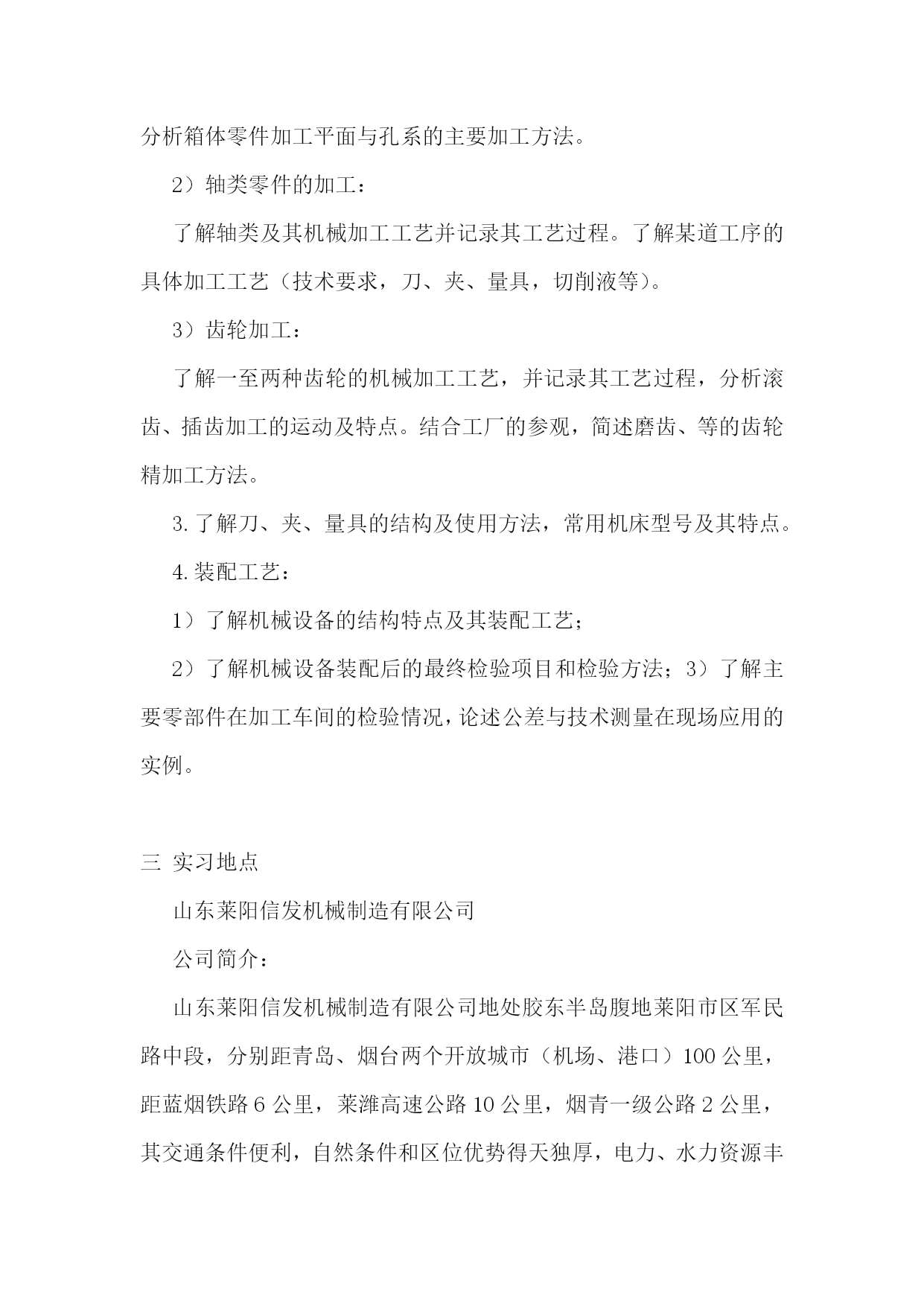 机械生产实习报告范文机械生产实习报告范文2一实习目的1.通过现场参观,了解某一产品的即席制造生产过程。2.熟悉主要典型零件(机座,机体,曲轴,凸轮轴,齿轮等或减速机箱体,转动轴,齿轮等)的机械加工工艺过程,了解拟定机械加工工艺过程的一般原则及进行工艺分析的方法。3.了解典型零部件的装配工艺。4.了解一般刀、夹、量具的结构及使用方法。5.参观工厂计量室与车间检验,了解公差与测量技术在生产中的应用。6.参观工厂的先进设备及特种加工,以扩大学生的专业知识面以及对新工艺、新技术的了解。二实习内容与要求1.机械制造的生产过程:了解该厂的主要机械设备的正个生产过程情况及生产中的主要工艺文件(如机械加工过程卡片、机械加工工序卡片等)。2.典型零件工艺1)箱体零件的加工:了解某机械设备机座、机体的机械加工方法,并纪录其工艺过程。分析箱体零件加工平面与孔系的主要加工方法。2)轴类零件的加工:了解轴类及其机械加工工艺并记录其工艺过程。了解某道工序的具体加工工艺(技术要求,刀、夹、量具,切削液等)。3)齿轮加工:了解一至两种齿轮的机械加工工艺,并记录其工艺过程,分析滚齿、插齿加工的运动及特点。结合工厂的参观,简述磨齿、等的齿轮精加工方法。3.了解刀、夹、量具的结构及使用方法,常用机床型号及其特点。4.装配工艺:1)了解机械设备的结构特点及其装配工艺;2)了解机械设备装配后的最终检验项目和检验方法;3)了解主要零部件在加工车间的检验情况,论述公差与技术测量在现场应用的实例。三实习地点山东莱阳信发机械制造有限公司公司简介:山东莱阳信发机械制造有限公司地处胶东半岛腹地莱阳市区军民路中段,分别距青岛、烟台两个开放城市(机场、港口)100公里,距蓝烟铁路6公里,莱潍高速公路10公里,烟青一级公路2公里,其交通条件便利,自然条件和区位优势得天独厚,电力、水力资源丰富。公司成立于1998年,是以生产汽车发动机零件为主的民营企业,是目前国内生产规模最大的内燃机飞轮专业生产企业之一,公司厂区占地13多万平方米,注册资金1294.9万元,下设铸造厂、机械厂、动配厂、工业园区,拥有员工300多人。经营范围:机械(汽车、拖拉机、内燃机配件)制造销售、电子产品研究开发,经营本企业自产品及技术的出口业务和本企业所需的机械设备、零配件、原辅材料及技术的进口业务。批发零售:五金交电、钢材、木材、建筑材料、日用百货等。主要产品:飞轮总成系列、排气管系列、飞轮壳系列、皮带轮系列共四大系列200多个型号,年产量达百万件,其中主导产品飞轮总成系列达60万件以上。公司拥有现代化设备近400台套。铸造设备主要有:z1410造型机、z2410造型机、z148造型机、冲天炉、1.5t中频感应电炉、s136混砂机、q378抛丸清理室、空气压缩机、罗茨制风机等,年铸造吨位量2万余吨。机械加工设备主要有:数控车床及加工中心、飞轮加工生产线、管壳类加工生产设备。公司主要客户:国内客户:江铃、福田、长城、天津丰田及帕金斯、通用五菱等汽车公司;国际客户:韩国大宇、美国atp公司及pai公司、意大利fiat公司、法国defontaine公司等。质量认证:1998年通过iso9002:1994质量体系认证;xx年通过qs9000:1998质量体系认证;xx年通过ts16949质量体系认证。企业荣誉:xx年被评为“山东省机械行业连续三年(01-03)销售收入百强企业”xx年被评为“山东省机械行业xx年百强企业”、“烟台市中小信用企业”、“a级纳税信用等级单位”、“市级守合同重信用企业”。四实习报告今天是第一次到机械厂实习,没有什么准备,只是看了一下零件的加工。第一个车间是箱体零件加工的车间,伴随着车间中空中吊车的游走声,穿过那挂着破碎门帘的陈旧大门。且不说车间的一切,首先让我一惊的是车间上方的两个横幅:多浪费一分钱,就少一分钱和今天工作不努力,明天努力找工作。或许这样的口号对我们这些大学生来说,有点老调和乏味。但我却能感觉到这七,八十年代那些拥有热火朝天的干劲的工人师傅们俭朴的本质和如火的热情。在这里,技术工人告诉我箱体加工工艺路线的安排车床主轴箱要求加工的表面很多。在这些加工表面中,平面加工精度比孔的加工精度容易保证,于是,箱体中主轴孔(主要孔)的加工精度、孔系加工精度就成为工艺关键问题。这里的工人还告诉我在工艺路线的安排中应注意三个问题:1)。工件的时效处理箱体结构复杂壁厚不均匀,铸造内应力较大。由于内应力会引起变形,因此铸造后应安排人工时效处理以消除内应力减少变形。一般精度要求的箱体,可利用粗、精加工工序之间的自然停放和运输时间,得到自然时效的效果。但自然时效需要的时间较长,否则会影响箱体精度的稳定性。对于特别精