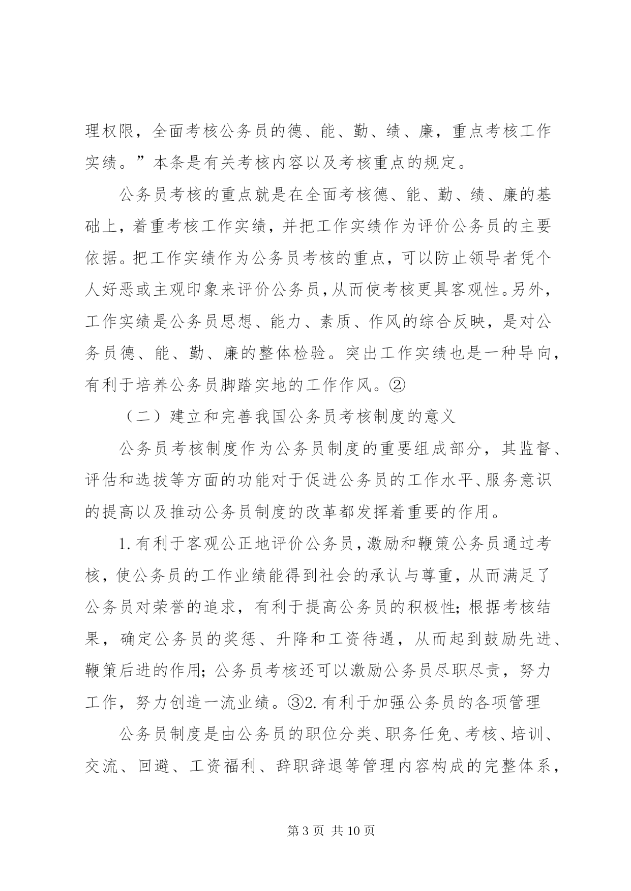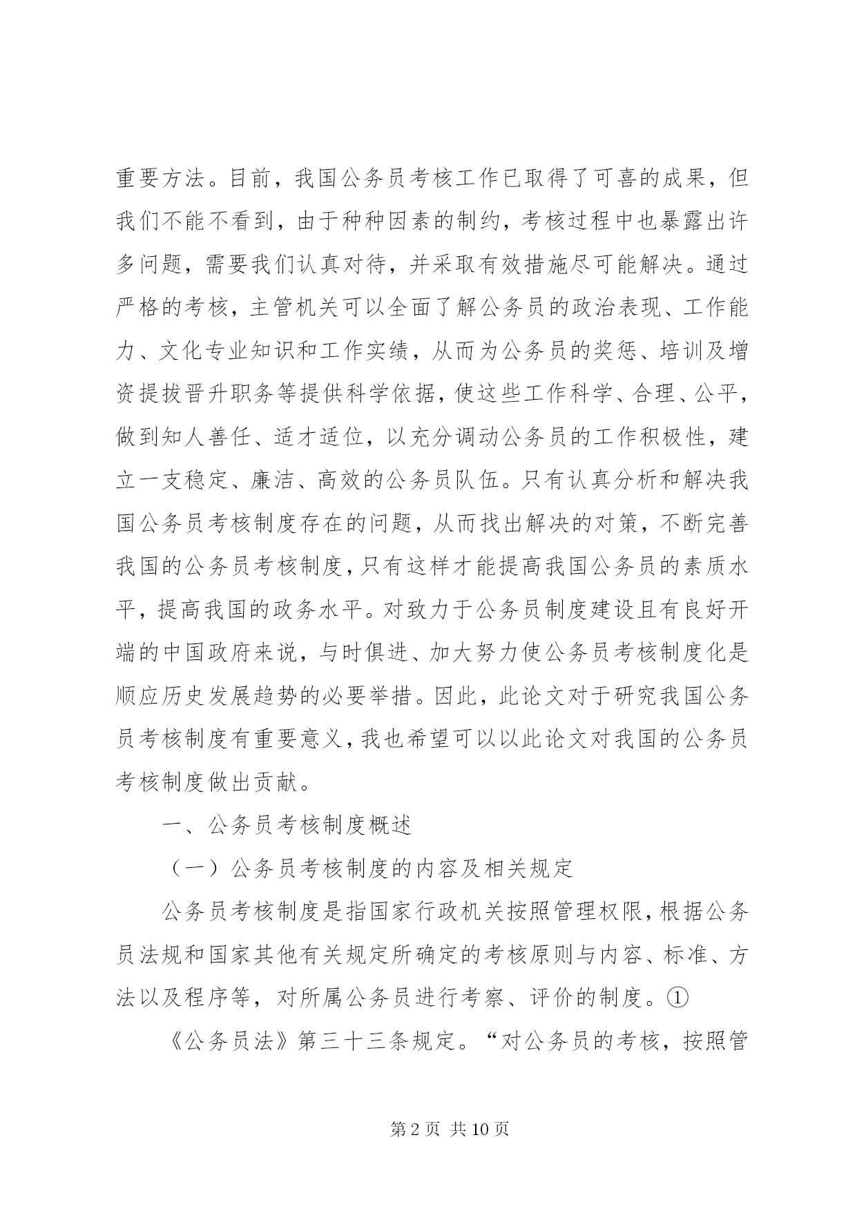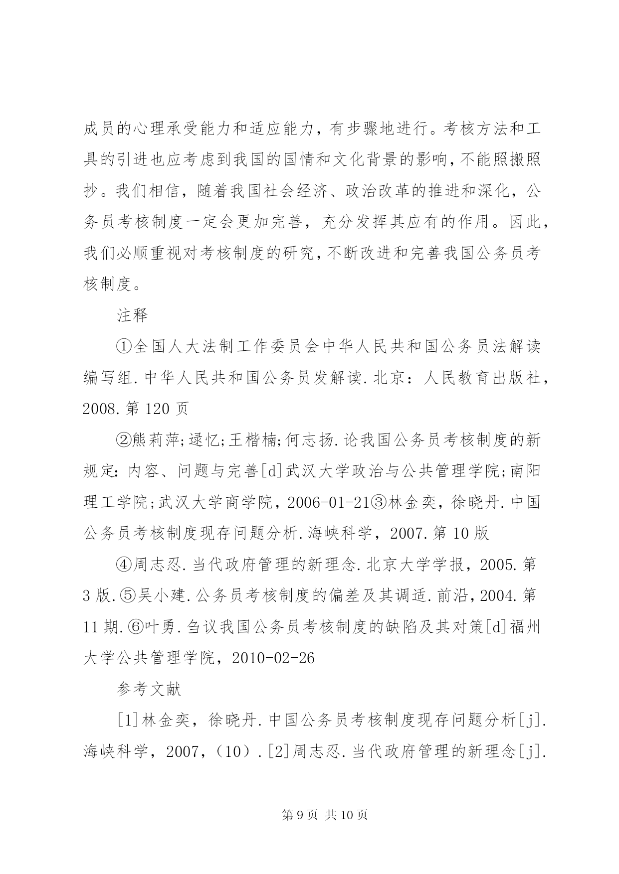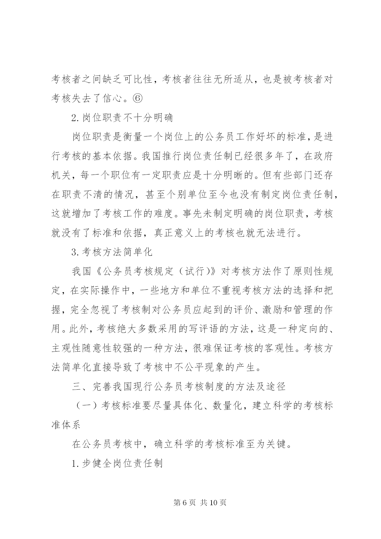 第PAGE\*Arabic\*MERGEFORMAT10页共NUMPAGES\*MERGEFORMAT10页公务员考核工作存在问题及对策我国现行公务员考核制度存在问题及对策[摘要]公务员考核制度作为公务员制度的重要组成部分,其监督、评估和选拔等方面的功能对于促进公务员的工作水平、服务意识的提高以及推动公务员制度的改革都发挥着重要的作用。自从公务员制度建立以来,我国的公务员考核制度建设有了明显进步,但还不够完善,在考核制度的设计等方面依然存在一些问题。因此,对于公务员考核制度尤其是我国公务员考核制度的考察和研究对于推动我国公务员制度的改革和政府职能的转变具有十分重要的意义。文章主要分析了当前我国公务员考核制度存在的问题,并就如何解决问题提出了自己的见解。[关键词]公务员;公务员考核制度;问题;对策引言所谓公务员考核制度是指国家行政机关按照管理权限,根据公务员法规和国家其他有关规定所确定的考核原则与内容、标准、方法以及程序等,对所属公务员进行考察、评价的制度。公务员考核是国家公务员制度的重要组成部分,是一项基础性管理工作,是激励公务员积极努力地开展工作,促进公务员队伍素质提高的重要方法。目前,我国公务员考核工作已取得了可喜的成果,但我们不能不看到,由于种种因素的制约,考核过程中也暴露出许多问题,需要我们认真对待,并采取有效措施尽可能解决。通过严格的考核,主管机关可以全面了解公务员的政治表现、工作能力、文化专业知识和工作实绩,从而为公务员的奖惩、培训及增资提拔晋升职务等提供科学依据,使这些工作科学、合理、公平,做到知人善任、适才适位,以充分调动公务员的工作积极性,建立一支稳定、廉洁、高效的公务员队伍。只有认真分析和解决我国公务员考核制度存在的问题,从而找出解决的对策,不断完善我国的公务员考核制度,只有这样才能提高我国公务员的素质水平,提高我国的政务水平。对致力于公务员制度建设且有良好开端的中国政府来说,与时俱进、加大努力使公务员考核制度化是顺应历史发展趋势的必要举措。因此,此论文对于研究我国公务员考核制度有重要意义,我也希望可以以此论文对我国的公务员考核制度做出贡献。一、公务员考核制度概述(一)公务员考核制度的内容及相关规定公务员考核制度是指国家行政机关按照管理权限,根据公务员法规和国家其他有关规定所确定的考核原则与内容、标准、方法以及程序等,对所属公务员进行考察、评价的制度。①《公务员法》第三十三条规定。“对公务员的考核,按照管理权限,全面考核公务员的德、能、勤、绩、廉,重点考核工作实绩。”本条是有关考核内容以及考核重点的规定。公务员考核的重点就是在全面考核德、能、勤、绩、廉的基础上,着重考核工作实绩,并把工作实绩作为评价公务员的主要依据。把工作实绩作为公务员考核的重点,可以防止领导者凭个人好恶或主观印象来评价公务员,从而使考核更具客观性。另外,工作实绩是公务员思想、能力、素质、作风的综合反映,是对公务员德、能、勤、廉的整体检验。突出工作实绩也是一种导向,有利于培养公务员脚踏实地的工作作风。②(二)建立和完善我国公务员考核制度的意义公务员考核制度作为公务员制度的重要组成部分,其监督、评估和选拔等方面的功能对于促进公务员的工作水平、服务意识的提高以及推动公务员制度的改革都发挥着重要的作用。1.有利于客观公正地评价公务员,激励和鞭策公务员通过考核,使公务员的工作业绩能得到社会的承认与尊重,从而满足了公务员对荣誉的追求,有利于提高公务员的积极性;根据考核结果,确定公务员的奖惩、升降和工资待遇,从而起到鼓励先进、鞭策后进的作用;公务员考核还可以激励公务员尽职尽责,努力工作,努力创造一流业绩。③2.有利于加强公务员的各项管理公务员制度是由公务员的职位分类、职务任免、考核、培训、交流、回避、工资福利、辞职辞退等管理内容构成的完整体系,考核是其中一项重要内容,如果没有考核或考核不公正,就失去衡量公务员的客观依据,公务员管理的其他环节也难以实现公正性与科学化。因此,考核是公务员管理的基础。④3.有利于提高政府工作绩效对我国政府来说,如何依法行政,如何提高行政效率,是一个迫切需要解决的问题,而这个问题的解决,有赖于政府公务员能力、素质的提高和服务、敬业精神的增强。改革公务员考核制度,对公务员实行绩效考核为主要内容的考核办法,一是作为政府行为约束、要求公务员;二是使公务员自觉地按照机关管理效率不断提高,促进政府朝着守法、高效、廉洁的方向不断努力。二、公务员考核制度存在的问题及原因(一)我国公务员考核制度存在的问题我国公务员考核制度自建立开始取得了一些可喜的进步,但是我们必须认清他仍然存在一些亟待解决的问题。1.公务员考核标准不明确,科学化、实践化程度低。我国公务员考核标准以公务员的职位职责和所承担的工作任务为基础依据。但目前