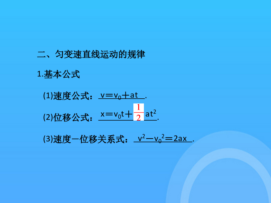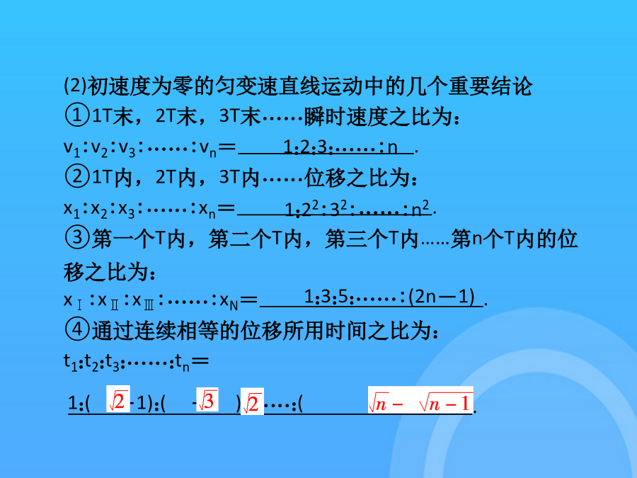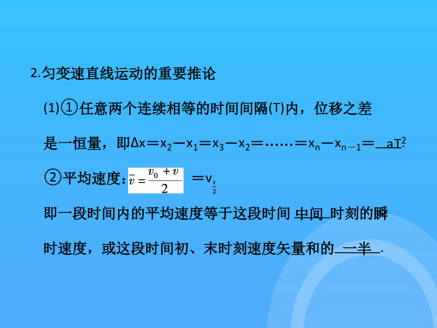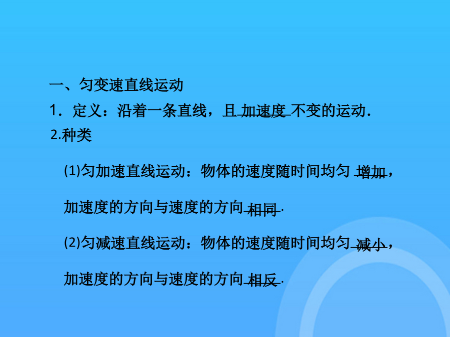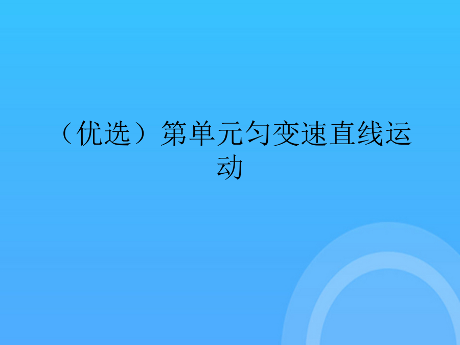 匀变速直线运动(优选)第单元匀变速直线运动2.种类(1)匀加速直线运动:物体的速度随时间均匀,加速度的方向与速度的方向.(2)匀减速直线运动:物体的速度随时间均匀,加速度的方向与速度的方向.二、匀变速直线运动的规律1.基本公式(1)速度公式:.(2)位移公式:.(3)速度—位移关系式:.2.匀变速直线运动的重要推论(1)①任意两个连续相等的时间间隔(T)内,位移之差是一恒量,即Δx=x2-x1=x3-x2=……=xn-xn-1=.②平均速度:=v即一段时间内的平均速度等于这段时间时刻的瞬时速度,或这段时间初、末时刻速度矢量和的.(2)初速度为零的匀变速直线运动中的几个重要结论①1T末,2T末,3T末……瞬时速度之比为:v1∶v2∶v3∶……∶vn=.②1T内,2T内,3T内……位移之比为:x1∶x2∶x3∶……∶xn=.③第一个T内,第二个T内,第三个T内……第n个T内的位移之比为:xⅠ∶xⅡ∶xⅢ∶……∶xN=.④通过连续相等的位移所用时间之比为:t1∶t2∶t3∶……∶tn=.三、自由落体和竖直上抛的运动规律1.自由落体运动规律(1)速度公式:v=(2)位移公式:h=(3)速度—位移关系式:v2=2.竖直上抛运动规律(1)速度公式:v=(2)位移公式:h=(3)速度—位移关系式:=-2gh(4)上升的最大高度H=(5)上升到最大高度用时:t=(1)物体上升到最高点时速度虽为零,但并不处于平衡状态.(2)由于竖直上抛运动的上升和下降阶段加速度相同,故可对全程直接应用匀变速直线运动的基本公式.1.对基本公式的理解应用(1)正负号的规定匀变速直线运动的基本公式均是矢量式,应用时要注意各物理量的符号,一般情况下,我们规定初速度的方向为正方向,与初速度同向的物理量取正值,反向的物理量取负值,当v0=0时,一般以a的方向为正.(2)匀变速直线运动如果物体先做匀减速直线运动,减速为零后又反向做匀加速直线运动,且全程加速度不变,对这种情况可以直接应用匀变速直线运动公式.(3)刹车问题对匀减速直线运动,要注意减速为零后停止,加速度变为零的实际情况,如刹车问题,应首先判断给定时间内车是否已停止运动.(4)逆向法物体由某一速度匀减速到零的运动可以视为反向的初速度为零的匀加速直线运动.2.对推论Δx=aT2的拓展(1)公式的适用条件:①匀变速直线运动;②Δx为连续相等的时间间隔T内的位移差.(2)进一步的推论:xm-xn=(m-n)aT2要注意此式的适用条件及m、n、T的含义.(3)此公式常用来研究打点计时器纸带上的加速度.公式v=v0+at虽然可由a=变形后得到,但二者含义不同:(1)a=是加速度的定义式,适用于所有变速运动(包括非匀变速直线运动和曲线运动).(2)v=v0+at是匀变速直线运动的速度公式,仅适用于匀变速直线运动.(2008·全国卷Ⅰ)已知O、A、B、C为同一直线上的四点,AB间的距离为l1,BC间的距离为l2,一物体自O点由静止出发,沿此直线做匀加速运动,依次经过A、B、C三点,已知物体通过AB段与BC段所用的时间相等.求O与A的距离.本题考查了学生运用匀速直线运动规律解决实际问题的能力,可以先设出时间、加速度等参数,直接应用位移公式、位移—速度关系式列方程组求解,也可以用比值法结合速度—位移关系式进行求解.[听课记录]设物体的加速度为a,到达A点的速度为v0,通过AB段和BC点所用的时间为t,则有l1=v0t+at2①l1+l2=2v0t+a(2t)2②联立①②式得l2-l1=at2③3l1-l2=2v0t④设O与A的距离为l,则有l=⑤联立③④⑤式得l=.[名师归纳](1)解决运动学问题时要善于根据题意画出运动示意图,这样可以使复杂的运动变得直观,更利于情景的分析.(2)应用匀变速运动的有关公式时,要注意各公式的适用条件,合理地选择公式会给解题带来方便.1.竖直上抛运动的特点(1)对称性如图1-2-1所示,一物体以初速度v0竖直上抛,A、B为途中的任意两点,C为最高点,则:①时间对称性物体上升过程中从A→C所用时间tAC和下降过程中从C→A所用时间tCA相等,同理tAB=tBA.②速度对称性物体上升过程经过A点的速度与下降过程经过A点的速度大小相等.③能量对称性物体从A→B和从B→A重力势能变化量的大小相等,均等于mghAB.(2)多解性当物体经过抛出点上方某个位置时,可能处于上升阶段,也可能处于下降阶段,造成双解.在解决问题时要注意这个特点.2.解答竖直上抛运动问题的两种方法(1)全程法:规定好正方向后,直接应用匀变速直线运动的几个矢量式.(2)分阶段法