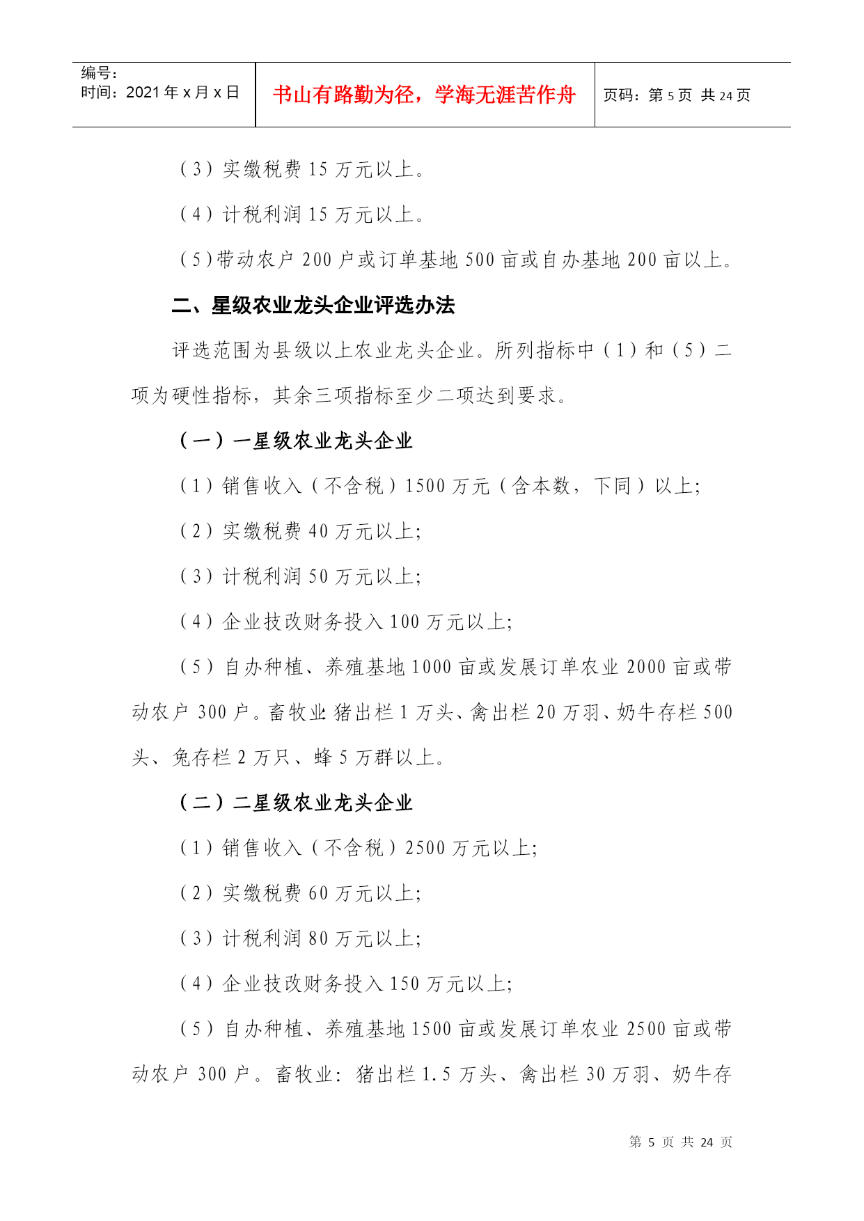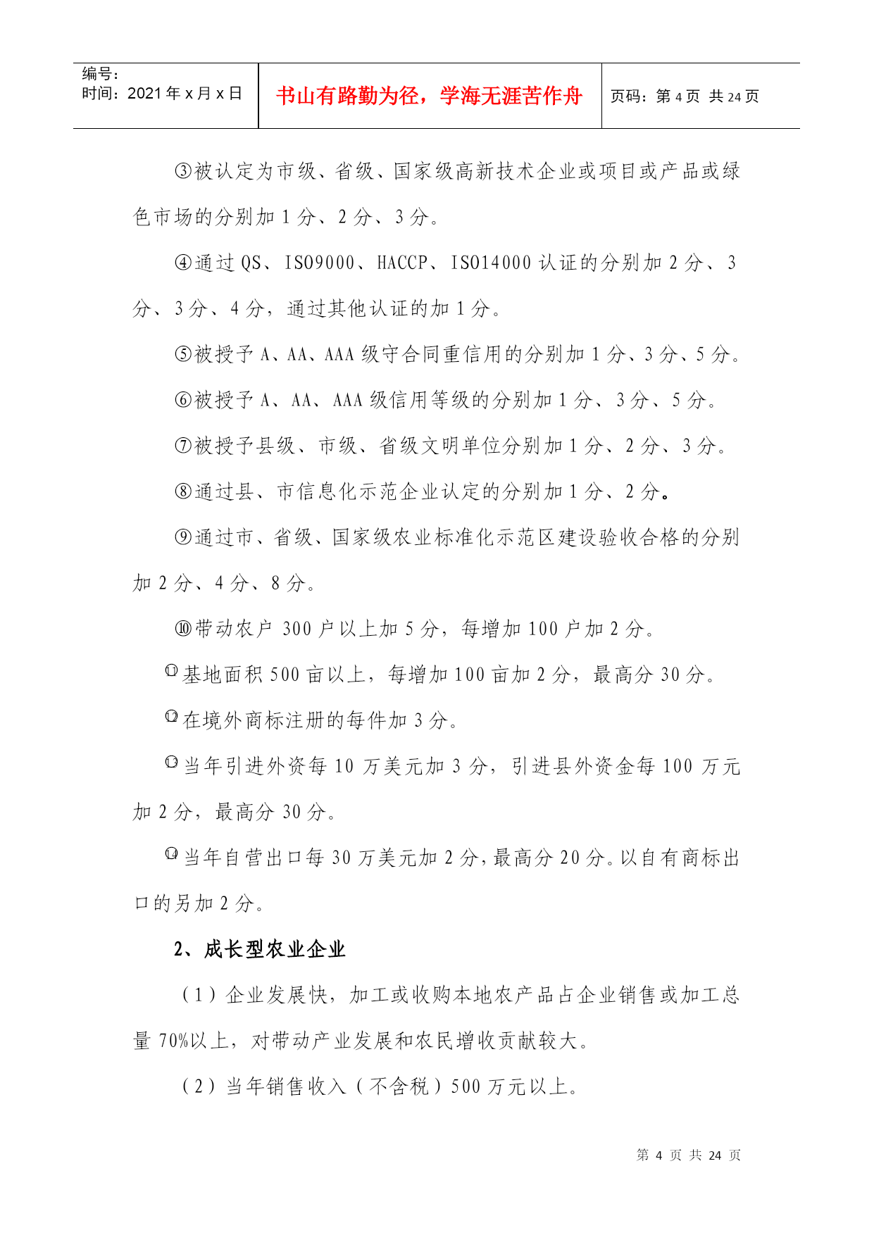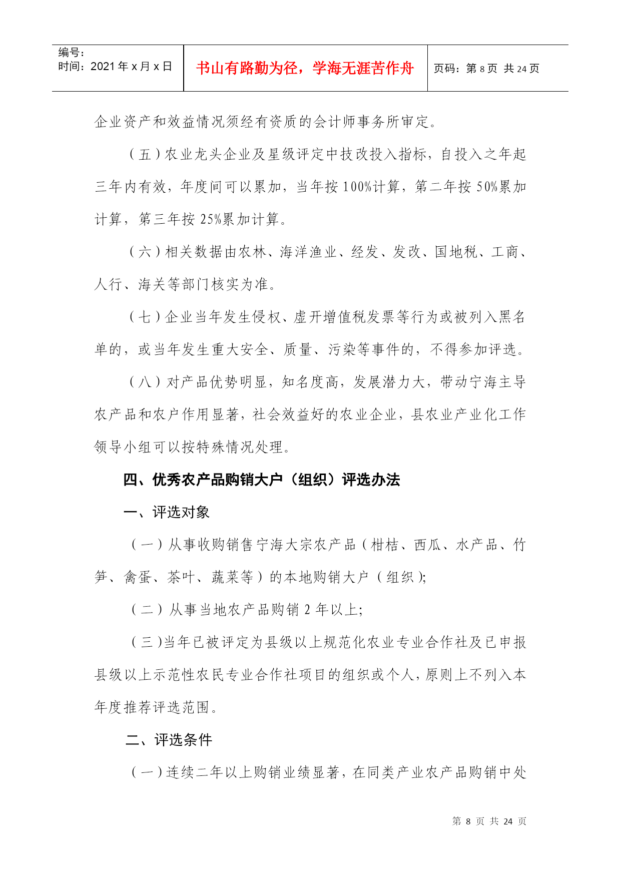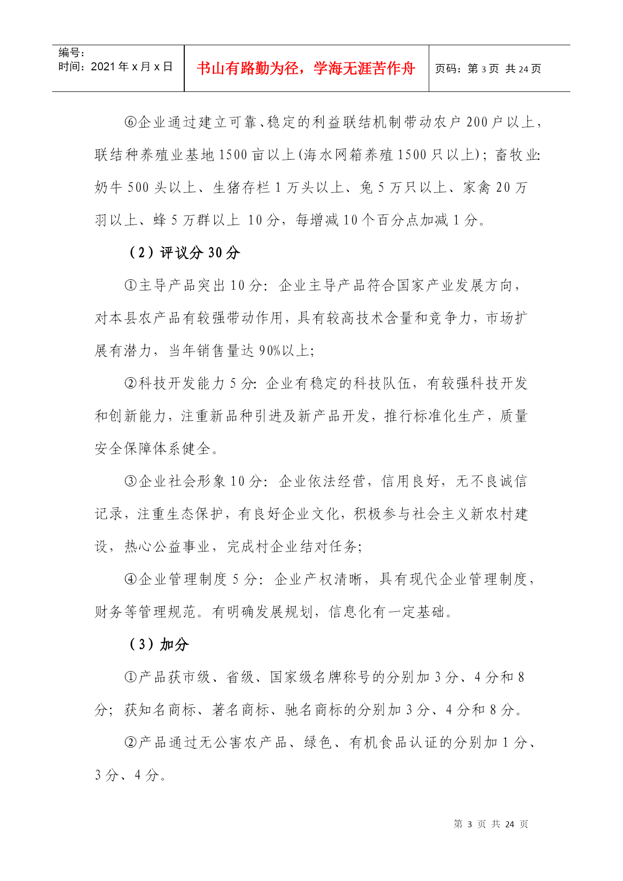 编号:时间:2021年x月x日书山有路勤为径,学海无涯苦作舟页码:第PAGE24页共NUMPAGES24页第PAGE\*MERGEFORMAT24页共NUMPAGES\*MERGEFORMAT24页宁海县农业龙头企业星级企业成长型农业企业和优秀农产品购销大户(组织)评选办法(试行)宁农产办〔2008〕4号根据中共宁海县委、宁海县人民政府《关于加快农业产业化发展的若干意见》(宁党发[2008]13号)文件精神,参照宁波市农业龙头企业管理办法,对县级农业龙头企业、星级企业、成长型农业企业和优秀农产品购销大户(组织)的申报评选办法作了适当调整。同时,按企业经营情况划分确定加工(基地)型、市场流通型和成长型等三大类型,并提出相应条件,修订后的申报评选办法如下:一、县级农业龙头企业和成长型农业企业评选办法(一)基本条件1、企业类型。依法设立具有独立法人资格的农产品生产、加工企业及农产品专业批发市场,包括国有、集体、个体私营、中外合资、中外合作、外商独资等企业。2、企业效益。总资产报酬率高于0.5%,资产负债率小于65%,主营产品产销率达到90%以上。3、企业信用。依法经营,遵守市场经济规范,银行信用等级A级以上(含A级,无贷款企业除外)。4、企业竞争能力。加工型企业在同行业中的产品质量、产品科技含量、新产品开发能力居领先水平,主营产品符合国家产业政策、环保政策和质量管理标准体系。流通型企业的市场占地、设施、资产、交易规模以及带动农户能力与本县主导产业关联度大,带动示范、集散辐射作用明显。5、成长型农业企业。目前企业规模虽达不到县级农业龙头企业要求,但所开发和生产的产品属创新技术产品或主营产品优势明显、市场潜力大的苗子型企业,或符合我县特色优势农产品区域布局,属行业龙头的企业。(二)评选条件评选标准:实行综合得分评选制度,综合得分由基本分、评议分及加分组成。每年拟评选县级农业龙头企业25家、流通型农业龙头企业5家、成长型农业企业5家。1、县级农业龙头企业(加工型、流通型企业)(1)基本分70分①销售收入(不含税)1000万元(含本数,下同)20分,每增减50万元加减1分;②实缴税费30万元10分,每增减3万元加减1分;③计税利润35万元5分,每增减5万元加减1分;④企业技改财务投入100万元5分,每增减10万元加减1分(技改投入三年内累计计算);⑤企业从事农产品加工过程中,通过订立合同、利润返还、入股分红等方式采购当地原料应占原料收购总量70%以上20分,每增减5个百分点加减1分;⑥企业通过建立可靠、稳定的利益联结机制带动农户200户以上,联结种养殖业基地1500亩以上(海水网箱养殖1500只以上);畜牧业:奶牛500头以上、生猪存栏1万头以上、兔5万只以上、家禽20万羽以上、蜂5万群以上10分,每增减10个百分点加减1分。(2)评议分30分①主导产品突出10分:企业主导产品符合国家产业发展方向,对本县农产品有较强带动作用,具有较高技术含量和竞争力,市场扩展有潜力,当年销售量达90%以上;②科技开发能力5分:企业有稳定的科技队伍,有较强科技开发和创新能力,注重新品种引进及新产品开发,推行标准化生产,质量安全保障体系健全。③企业社会形象10分:企业依法经营,信用良好,无不良诚信记录,注重生态保护,有良好企业文化,积极参与社会主义新农村建设,热心公益事业,完成村企业结对任务;④企业管理制度5分:企业产权清晰,具有现代企业管理制度,财务等管理规范。有明确发展规划,信息化有一定基础。(3)加分①产品获市级、省级、国家级名牌称号的分别加3分、4分和8分;获知名商标、著名商标、驰名商标的分别加3分、4分和8分。②产品通过无公害农产品、绿色、有机食品认证的分别加1分、3分、4分。③被认定为市级、省级、国家级高新技术企业或项目或产品或绿色市场的分别加1分、2分、3分。④通过QS、ISO9000、HACCP、ISO14000认证的分别加2分、3分、3分、4分,通过其他认证的加1分。⑤被授予A、AA、AAA级守合同重信用的分别加1分、3分、5分。⑥被授予A、AA、AAA级信用等级的分别加1分、3分、5分。⑦被授予县级、市级、省级文明单位分别加1分、2分、3分。⑧通过县、市信息化示范企业认定的分别加1分、2分。⑨通过市、省级、国家级农业标准化示范区建设验收合格的分别加2分、4分、8分。⑩带动农户300户以上加5分,每增加100户加2分。eq\o\ac(○,11)基地面积500亩以上,每增加100亩加2分,最高分30分。eq\o\ac(○,12)在境外商标注册的每件加3分。eq\o\ac(○,13)当年引进外资每10万