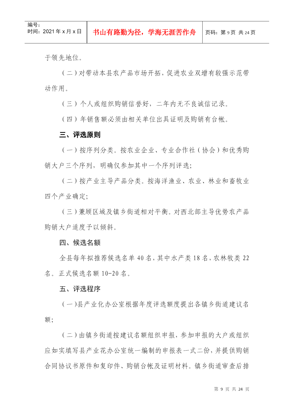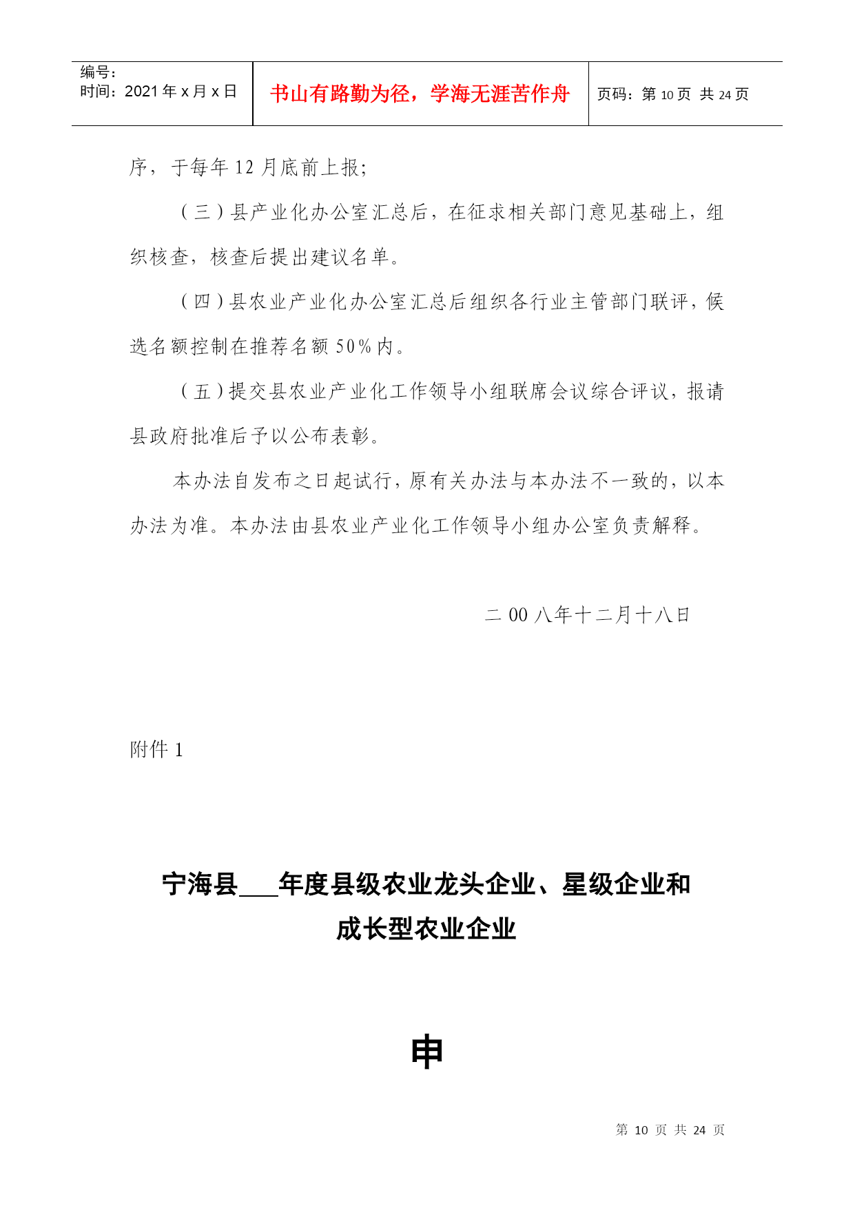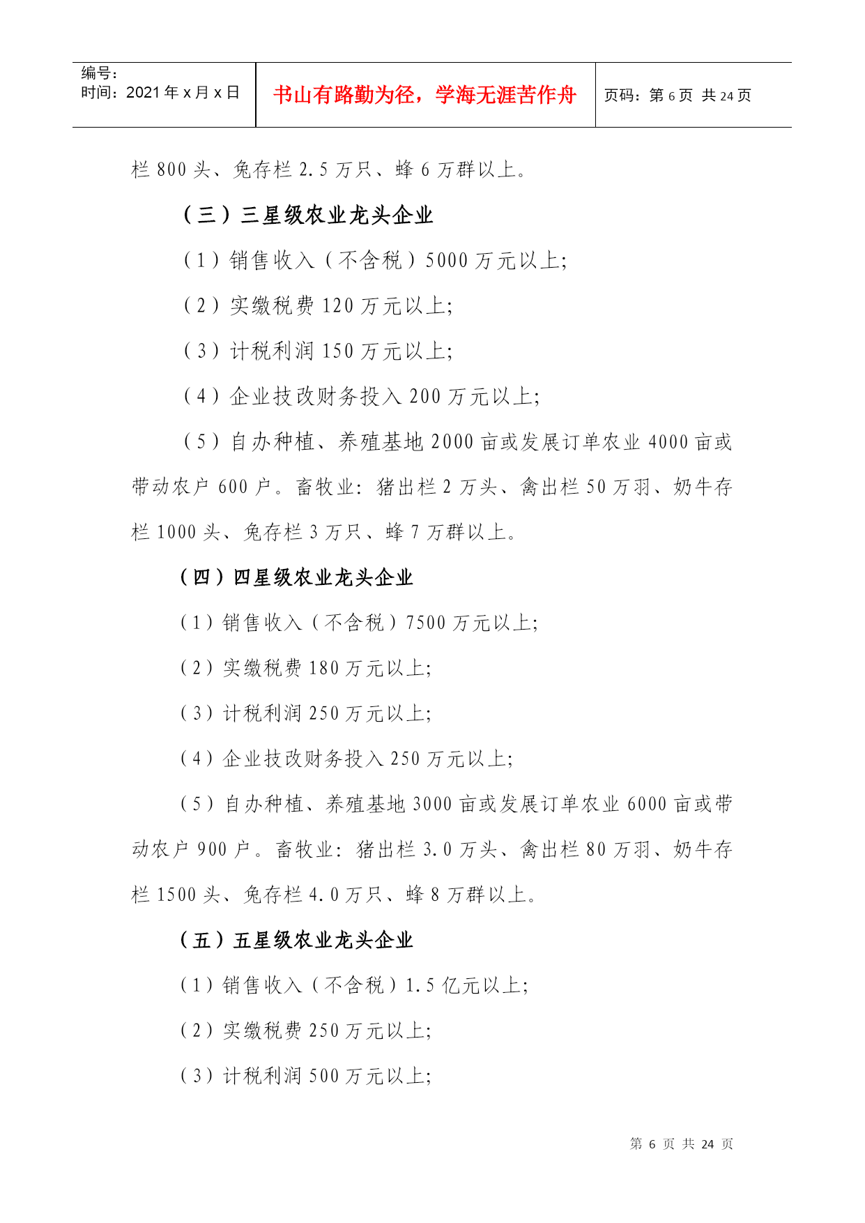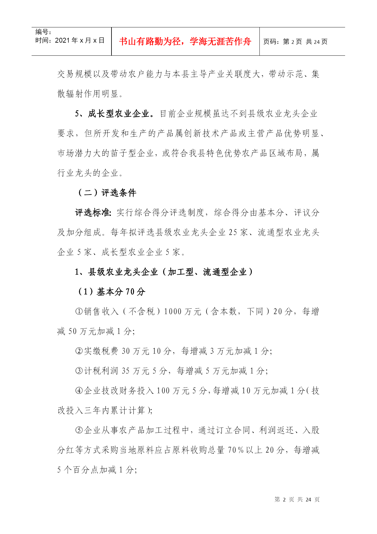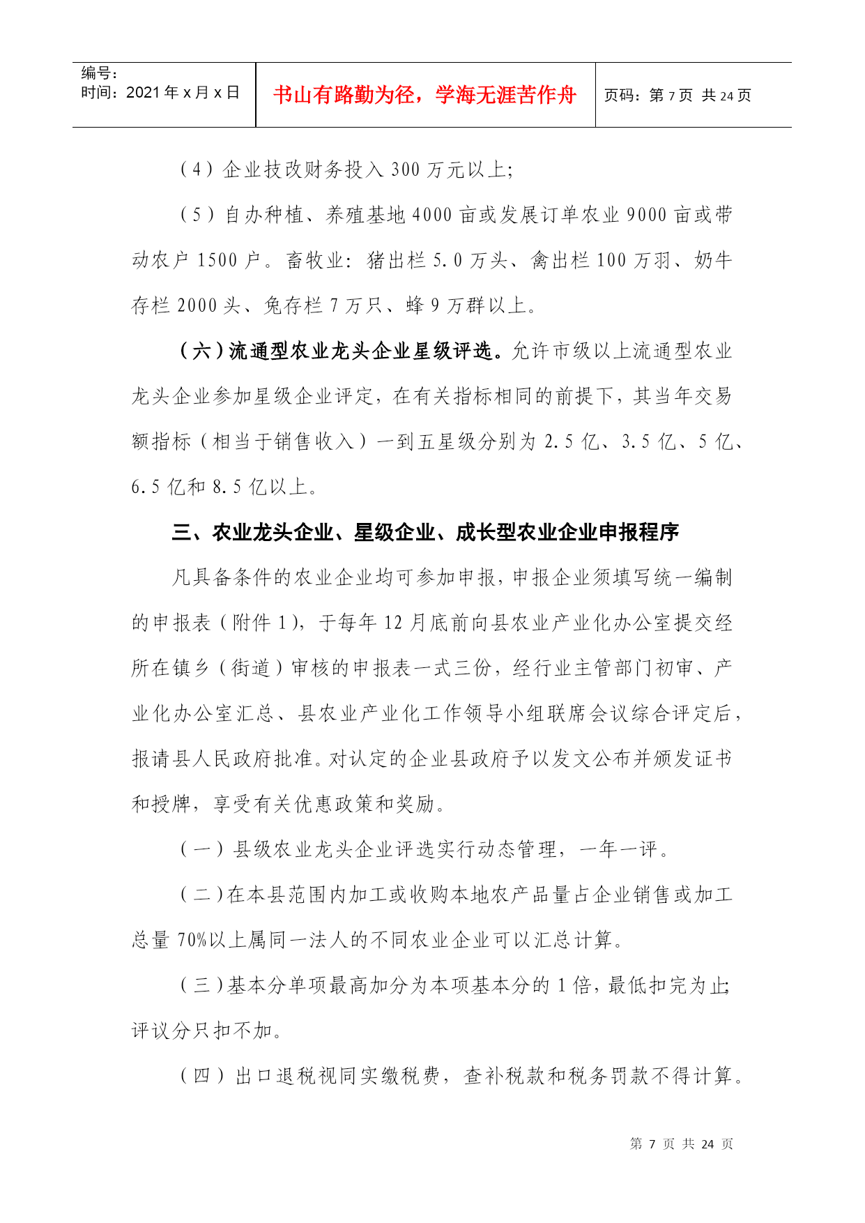 编号:时间:2021年x月x日书山有路勤为径,学海无涯苦作舟页码:第PAGE24页共NUMPAGES24页第PAGE\*MERGEFORMAT24页共NUMPAGES\*MERGEFORMAT24页宁海县农业龙头企业星级企业成长型农业企业和优秀农产品购销大户(组织)评选办法(试行)宁农产办〔2008〕4号根据中共宁海县委、宁海县人民政府《关于加快农业产业化发展的若干意见》(宁党发[2008]13号)文件精神,参照宁波市农业龙头企业管理办法,对县级农业龙头企业、星级企业、成长型农业企业和优秀农产品购销大户(组织)的申报评选办法作了适当调整。同时,按企业经营情况划分确定加工(基地)型、市场流通型和成长型等三大类型,并提出相应条件,修订后的申报评选办法如下:一、县级农业龙头企业和成长型农业企业评选办法(一)基本条件1、企业类型。依法设立具有独立法人资格的农产品生产、加工企业及农产品专业批发市场,包括国有、集体、个体私营、中外合资、中外合作、外商独资等企业。2、企业效益。总资产报酬率高于0.5%,资产负债率小于65%,主营产品产销率达到90%以上。3、企业信用。依法经营,遵守市场经济规范,银行信用等级A级以上(含A级,无贷款企业除外)。4、企业竞争能力。加工型企业在同行业中的产品质量、产品科技含量、新产品开发能力居领先水平,主营产品符合国家产业政策、环保政策和质量管理标准体系。流通型企业的市场占地、设施、资产、交易规模以及带动农户能力与本县主导产业关联度大,带动示范、集散辐射作用明显。5、成长型农业企业。目前企业规模虽达不到县级农业龙头企业要求,但所开发和生产的产品属创新技术产品或主营产品优势明显、市场潜力大的苗子型企业,或符合我县特色优势农产品区域布局,属行业龙头的企业。(二)评选条件评选标准:实行综合得分评选制度,综合得分由基本分、评议分及加分组成。每年拟评选县级农业龙头企业25家、流通型农业龙头企业5家、成长型农业企业5家。1、县级农业龙头企业(加工型、流通型企业)(1)基本分70分①销售收入(不含税)1000万元(含本数,下同)20分,每增减50万元加减1分;②实缴税费30万元10分,每增减3万元加减1分;③计税利润35万元5分,每增减5万元加减1分;④企业技改财务投入100万元5分,每增减10万元加减1分(技改投入三年内累计计算);⑤企业从事农产品加工过程中,通过订立合同、利润返还、入股分红等方式采购当地原料应占原料收购总量70%以上20分,每增减5个百分点加减1分;⑥企业通过建立可靠、稳定的利益联结机制带动农户200户以上,联结种养殖业基地1500亩以上(海水网箱养殖1500只以上);畜牧业:奶牛500头以上、生猪存栏1万头以上、兔5万只以上、家禽20万羽以上、蜂5万群以上10分,每增减10个百分点加减1分。(2)评议分30分①主导产品突出10分:企业主导产品符合国家产业发展方向,对本县农产品有较强带动作用,具有较高技术含量和竞争力,市场扩展有潜力,当年销售量达90%以上;②科技开发能力5分:企业有稳定的科技队伍,有较强科技开发和创新能力,注重新品种引进及新产品开发,推行标准化生产,质量安全保障体系健全。③企业社会形象10分:企业依法经营,信用良好,无不良诚信记录,注重生态保护,有良好企业文化,积极参与社会主义新农村建设,热心公益事业,完成村企业结对任务;④企业管理制度5分:企业产权清晰,具有现代企业管理制度,财务等管理规范。有明确发展规划,信息化有一定基础。(3)加分①产品获市级、省级、国家级名牌称号的分别加3分、4分和8分;获知名商标、著名商标、驰名商标的分别加3分、4分和8分。②产品通过无公害农产品、绿色、有机食品认证的分别加1分、3分、4分。③被认定为市级、省级、国家级高新技术企业或项目或产品或绿色市场的分别加1分、2分、3分。④通过QS、ISO9000、HACCP、ISO14000认证的分别加2分、3分、3分、4分,通过其他认证的加1分。⑤被授予A、AA、AAA级守合同重信用的分别加1分、3分、5分。⑥被授予A、AA、AAA级信用等级的分别加1分、3分、5分。⑦被授予县级、市级、省级文明单位分别加1分、2分、3分。⑧通过县、市信息化示范企业认定的分别加1分、2分。⑨通过市、省级、国家级农业标准化示范区建设验收合格的分别加2分、4分、8分。⑩带动农户300户以上加5分,每增加100户加2分。eq\o\ac(○,11)基地面积500亩以上,每增加100亩加2分,最高分30分。eq\o\ac(○,12)在境外商标注册的每件加3分。eq\o\ac(○,13)当年引进外资每10万