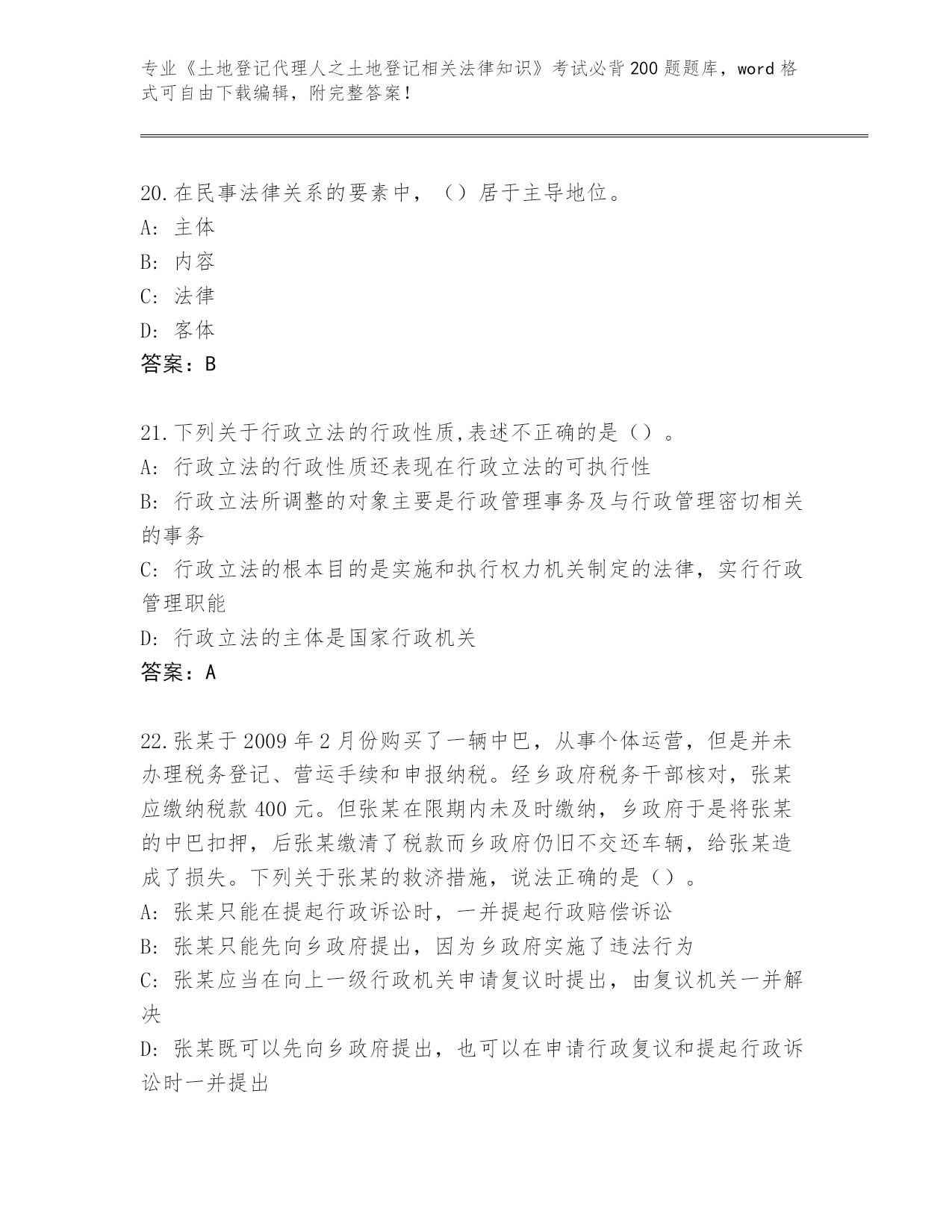 2024黑龙江省泰来县《土地登记代理人之土地登记相关法律知识》资格考试必刷200题真题(网校专用)