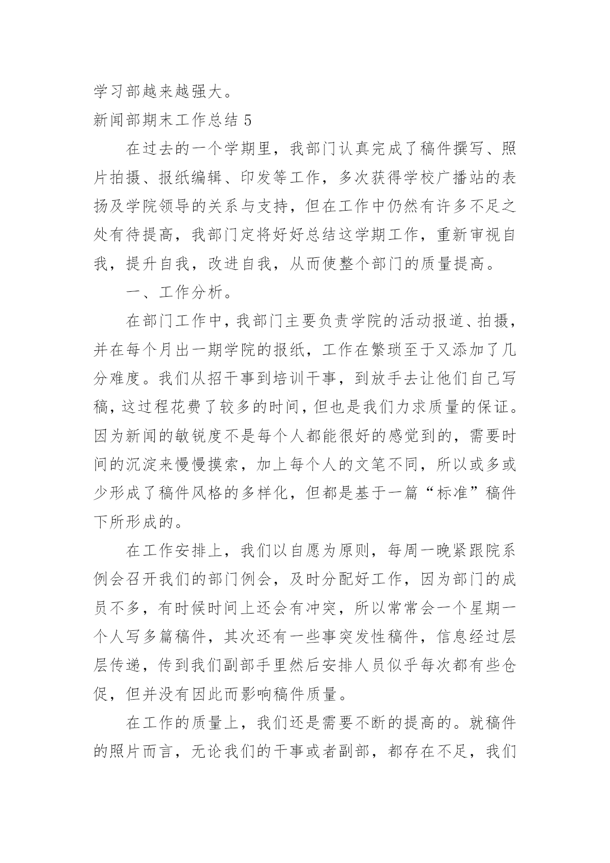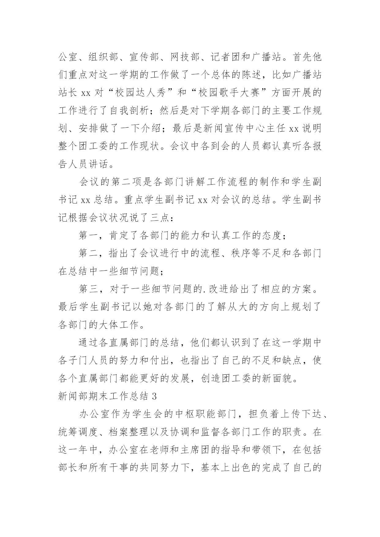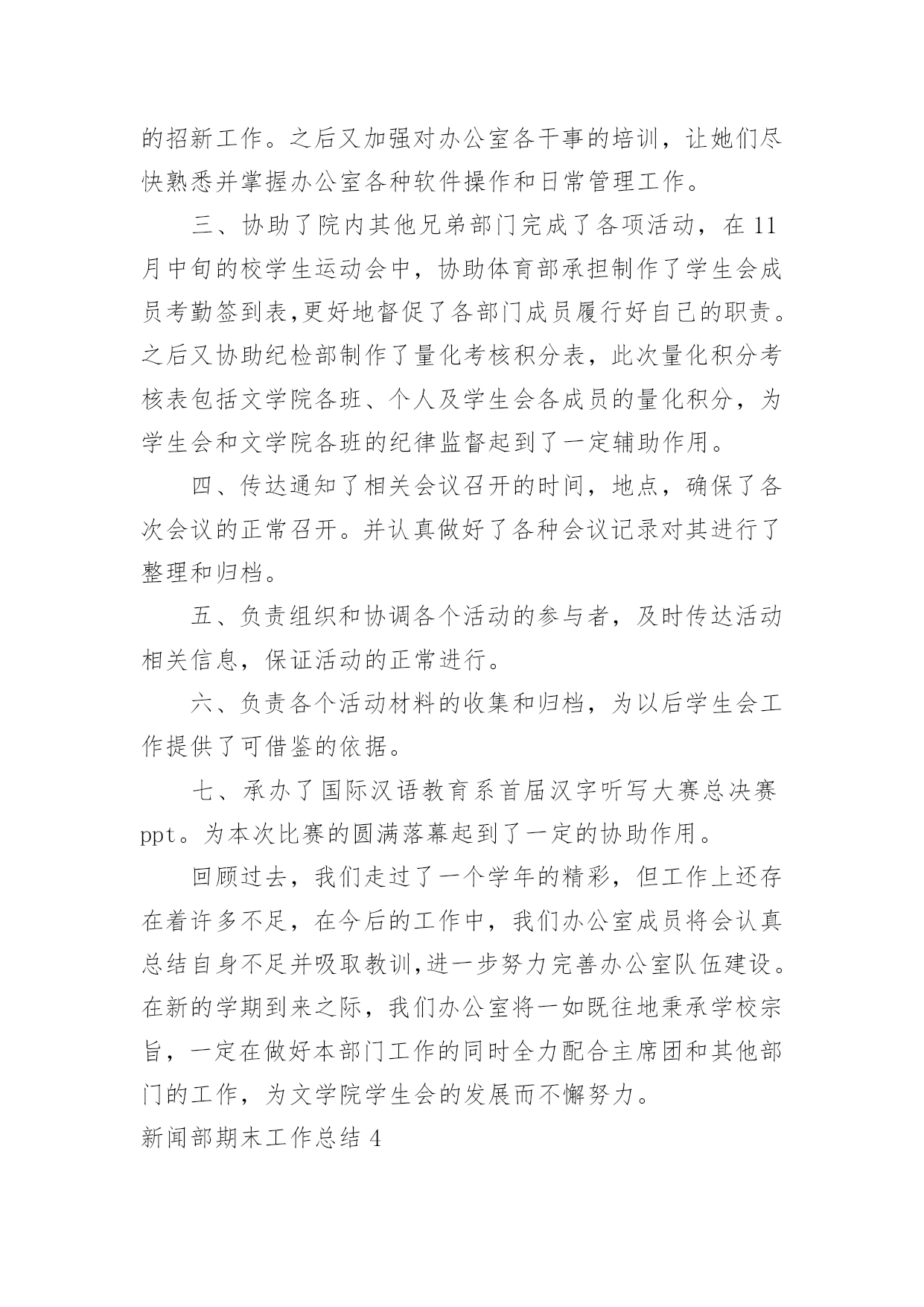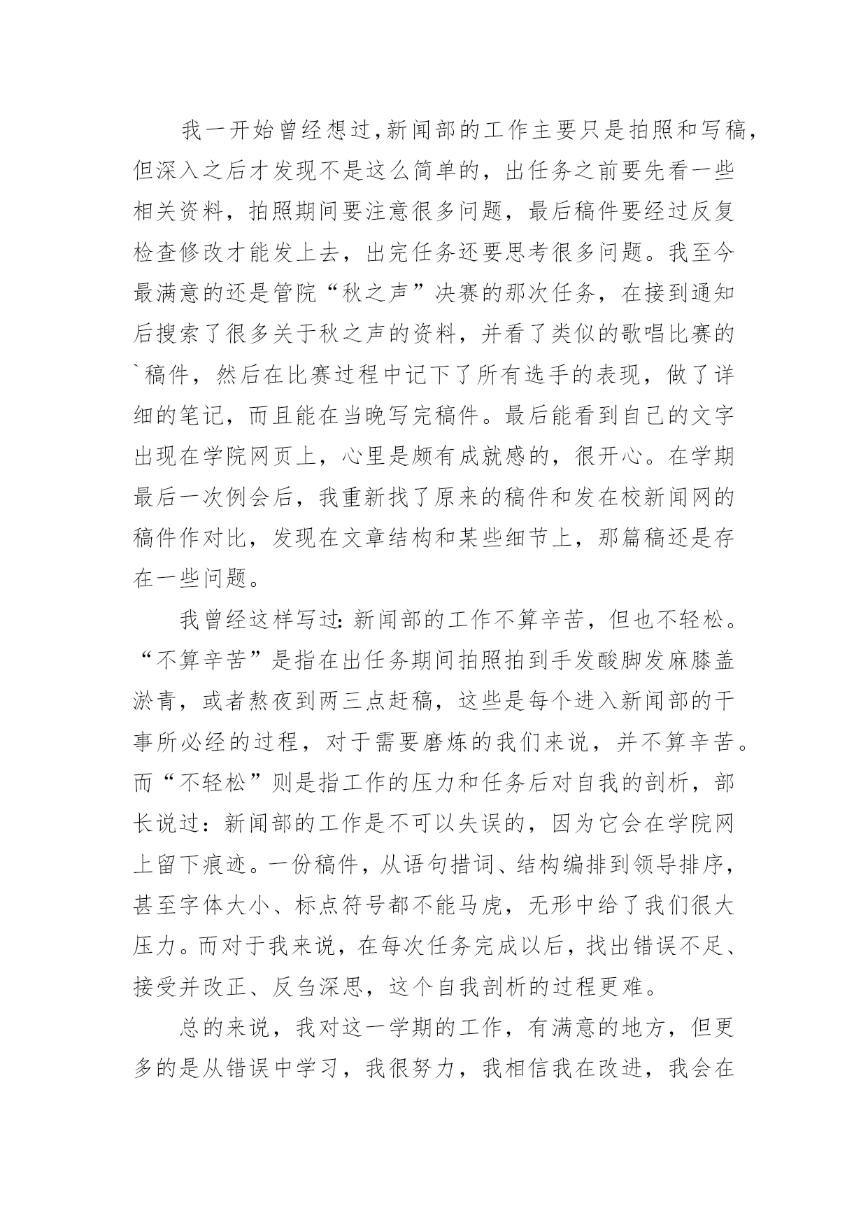 新闻部期末工作总结新闻部期末工作总结7篇总结是对某一特定时间段内的学习和工作生活等表现情况加以回顾和分析的一种书面材料,它可以有效锻炼我们的语言组织能力,让我们来为自己写一份总结吧。我们该怎么去写总结呢?以下是小编精心整理的新闻部期末工作总结,欢迎大家分享。新闻部期末工作总结1一、工作篇回顾这一学期的工作,感触良多。从最开始的非正式任务:为“秋之声”初赛拍照,举着单反相机拍了两三个小时,回来检查的时候却很失望,狭窄的教室、单一的角度,这批相片没有太多可取的地方,但是第一次的任务却让我很清楚地意识到,在新闻部工作,这些失望是应该承受的,但要尽力去避免。每次出完任务回来,在完成撰稿或挑相片的工作后,总会想很多,对自己在这次任务中的表现作评价,每次都会有不同的错误出现,尽量从中挑出不足,然后把它记起来以免下次再犯同样的错。部长曾经说过,新闻部工作的时候常常是单打独斗的,所以有更多的时间去反思,从此我记得“慎独反思”这个词,在每次例会后看着记下的笔记,再对照稿件的错误,总能从中找到以前没注意过的问题。我一开始曾经想过,新闻部的工作主要只是拍照和写稿,但深入之后才发现不是这么简单的,出任务之前要先看一些相关资料,拍照期间要注意很多问题,最后稿件要经过反复检查修改才能发上去,出完任务还要思考很多问题。我至今最满意的还是管院“秋之声”决赛的那次任务,在接到通知后搜索了很多关于秋之声的资料,并看了类似的歌唱比赛的`稿件,然后在比赛过程中记下了所有选手的表现,做了详细的笔记,而且能在当晚写完稿件。最后能看到自己的文字出现在学院网页上,心里是颇有成就感的,很开心。在学期最后一次例会后,我重新找了原来的稿件和发在校新闻网的稿件作对比,发现在文章结构和某些细节上,那篇稿还是存在一些问题。我曾经这样写过:新闻部的工作不算辛苦,但也不轻松。“不算辛苦”是指在出任务期间拍照拍到手发酸脚发麻膝盖淤青,或者熬夜到两三点赶稿,这些是每个进入新闻部的干事所必经的过程,对于需要磨炼的我们来说,并不算辛苦。而“不轻松”则是指工作的压力和任务后对自我的剖析,部长说过:新闻部的工作是不可以失误的,因为它会在学院网上留下痕迹。一份稿件,从语句措词、结构编排到领导排序,甚至字体大小、标点符号都不能马虎,无形中给了我们很大压力。而对于我来说,在每次任务完成以后,找出错误不足、接受并改正、反刍深思,这个自我剖析的过程更难。总的来说,我对这一学期的工作,有满意的地方,但更多的是从错误中学习,我很努力,我相信我在改进,我会在下个学期中学到更多,进步更快。二、心路历程篇还没进入团学之前,对它充满期待和憧憬,希望在这里可以找到另外一片属于我的天地,会有一个属于我的舞台。从一面时的自信,二面时的忐忑,到考察期的淡定,一路走来,在不同阶段总有不同的心情起伏。团学大会上让我记住了两个词:服务和奉献。主席说的那句“选择了职位就选择了责任”在管理团学流传已久,这句话给我很深的印象,以前想过团学干事是很光彩的工作,其实我们都是为管院学子服务的一小部分人而已,无所谓光不光彩的。在实际工作中也能深深体会到这点,作为工作人员,特别是作为一个在旁观察的工作人员,可以看到很多幕后的东西:一个部门甚至整个团学,可以为了一个大型活动全体出动,可以废寝忘食地工作,可以在背后默默地付出毫无怨言。因此,作为一个记者,唯有通过手中的笔如实地记录下来,才不会辜负他们的辛勤努力。我从来没有后悔进入新闻部,也没有抱怨过,因为一直以来我都是一个坚持的人,但是总有一个时期是很迷茫的,很惶恐未来的路该怎么走,我看到有同事因为太累一度想要放弃,看到以前的老部们写下自己的心情和对新闻部的感觉,“留在新闻部,你会收获很多。”他们总是这样说,到底会收获什么呢?我一直想不通,或者说我一直说不出,但是和部长谈过以后,我想,的确是有收获的,只是我还不能够把它完整地表达出来而已。三、收获篇在新闻部的短短几个月,我能够知道的,收获了友情、一些知识经验、一些做人的道理。在考察期开始工作,我很快融入其中。正如尧敏所言:我们的感情是建立在一次一次的任务上的。新闻部不像其它部门,很少会有整个部门一起出动的情况,但是新闻部是个温馨的小窝,我们一起为同事庆生,唱生日歌,一起挑相片赶稿,一起策划活动,一起开无伤大雅的玩笑。我们16个人,各有各的个性,却可以组成这样和谐的新闻部。在每两周一次的例会中,在与师兄师姐的谈话中,不经意间,会懂得很多为人处世的道理。而他们的身体力行,会不知不觉地影响到我的思想,再经过自我的思考,能够从中获得难得的经验和知识,更重要的是,而在出任务的过程中,有时可能从中感悟到什么,从而有所思考。总之,在团学新闻部的这一学期,我很坚持,而且我会一直坚持下去,我相信我的努力,希望能在下个学期有更好的工作表现。新闻部期末工作总结2为了更好的开展