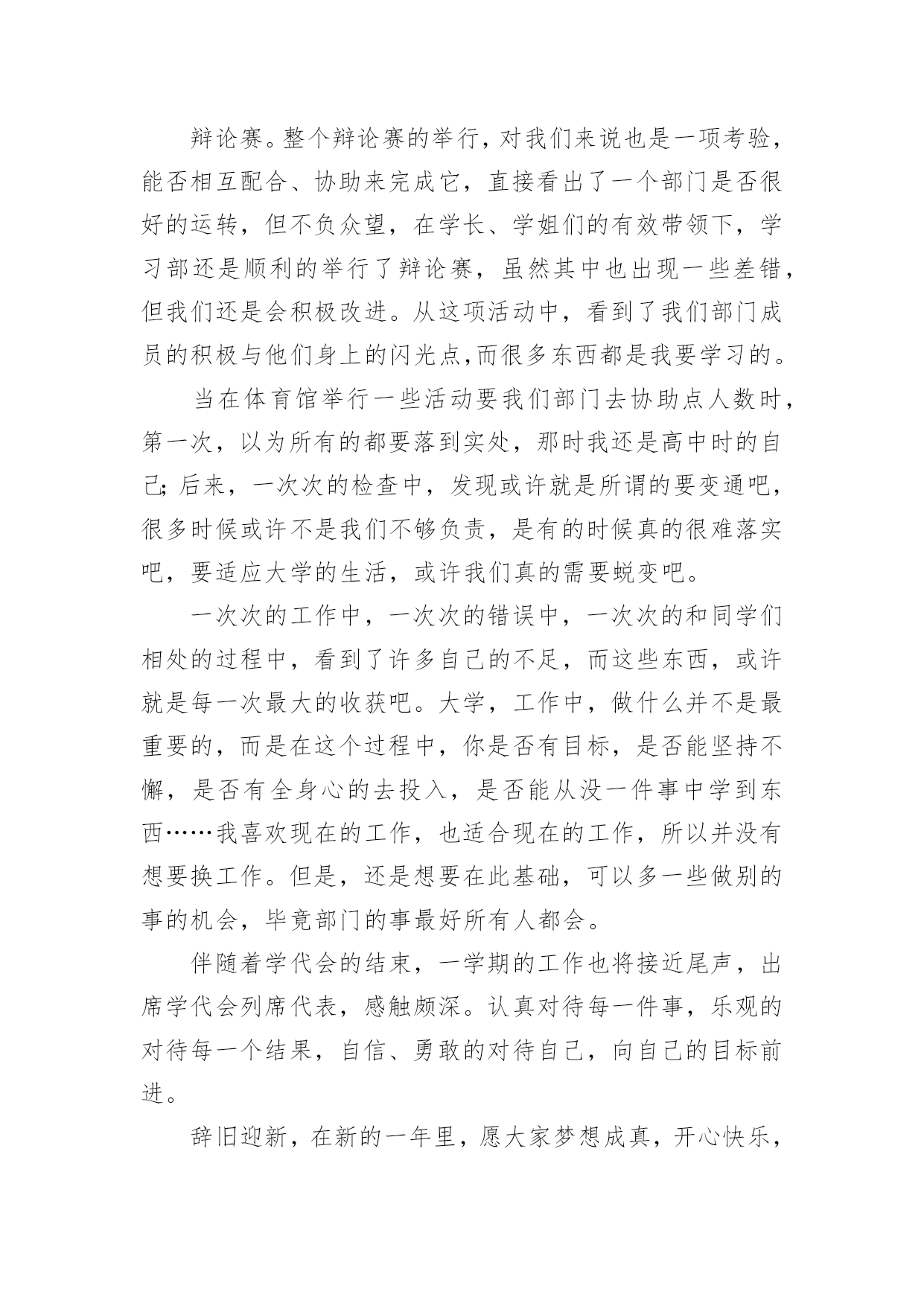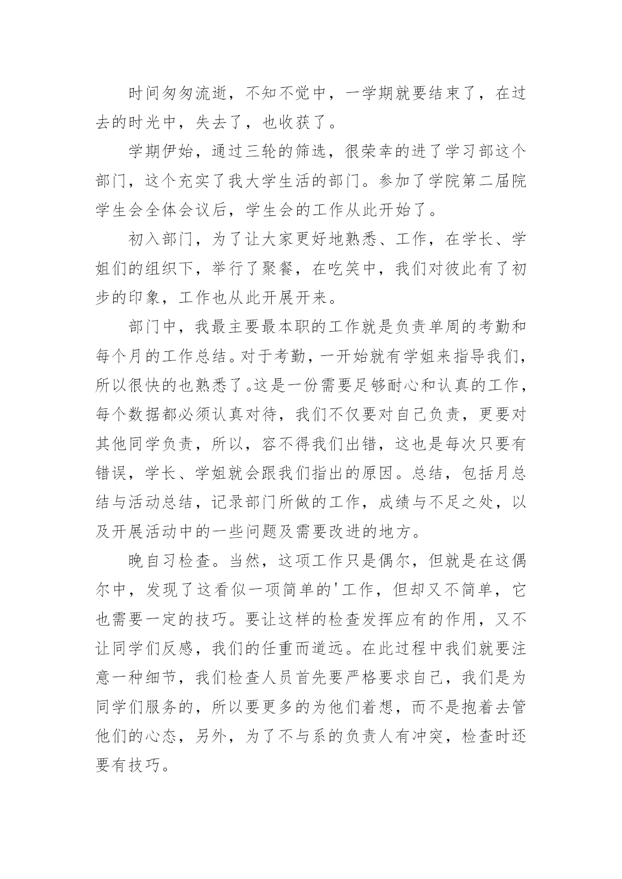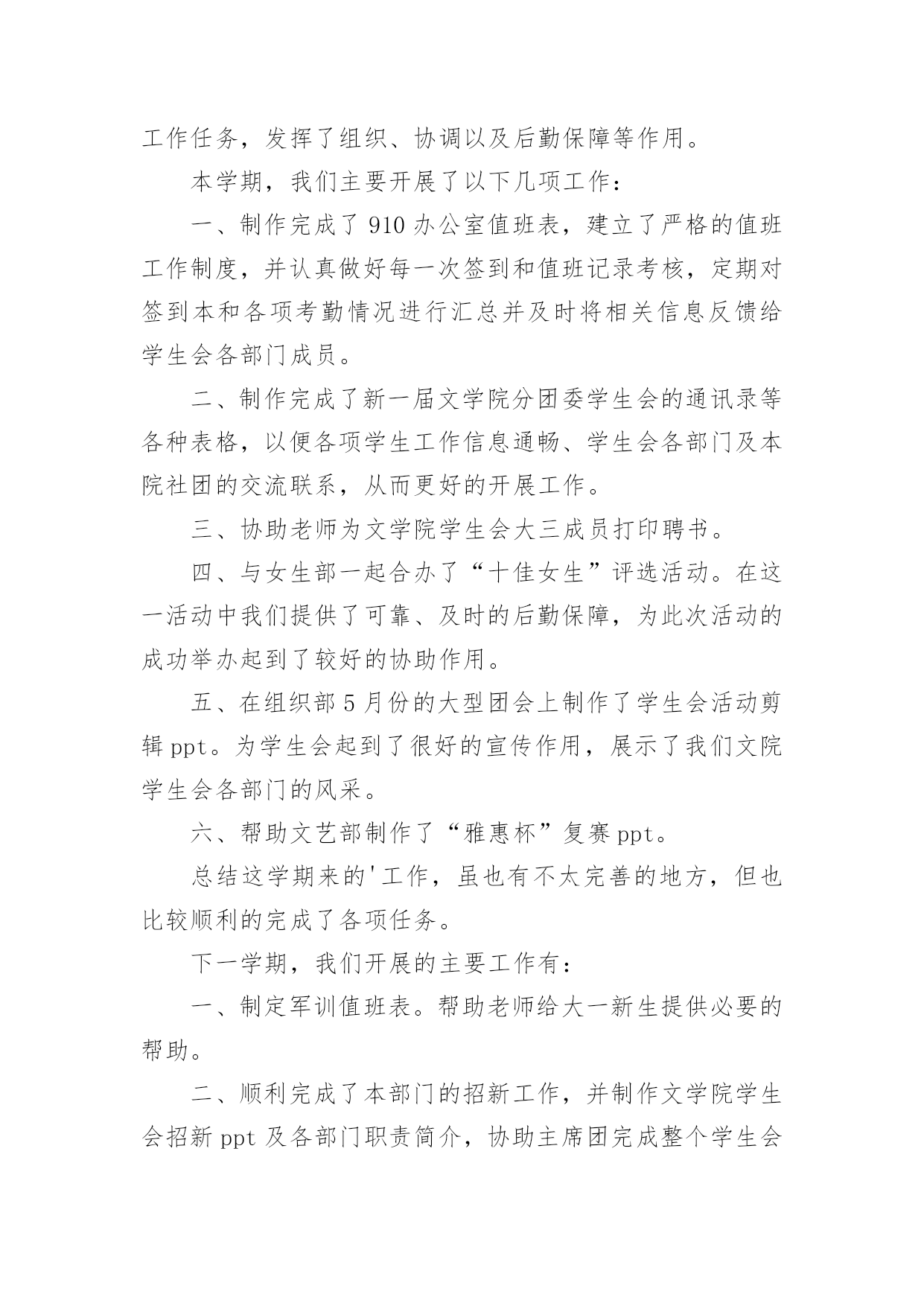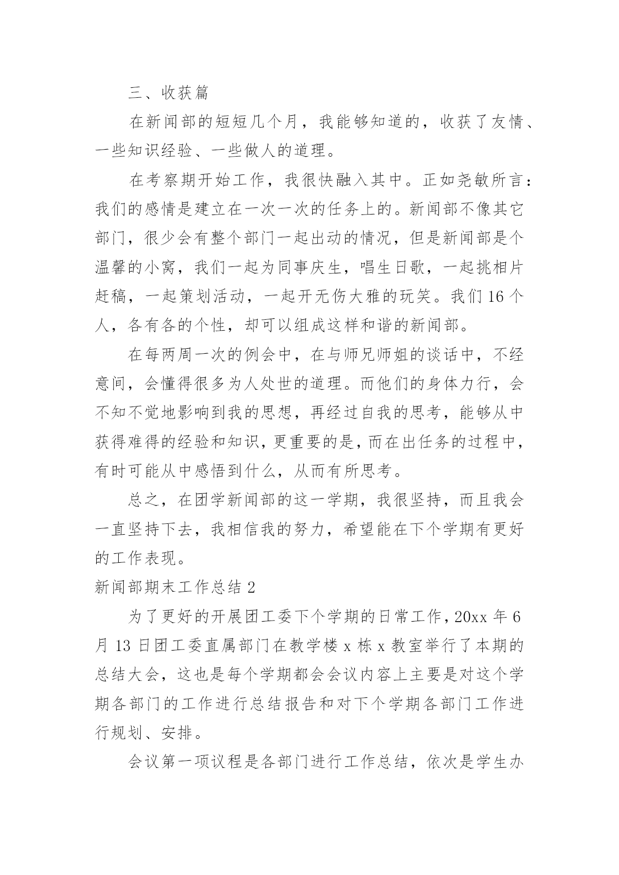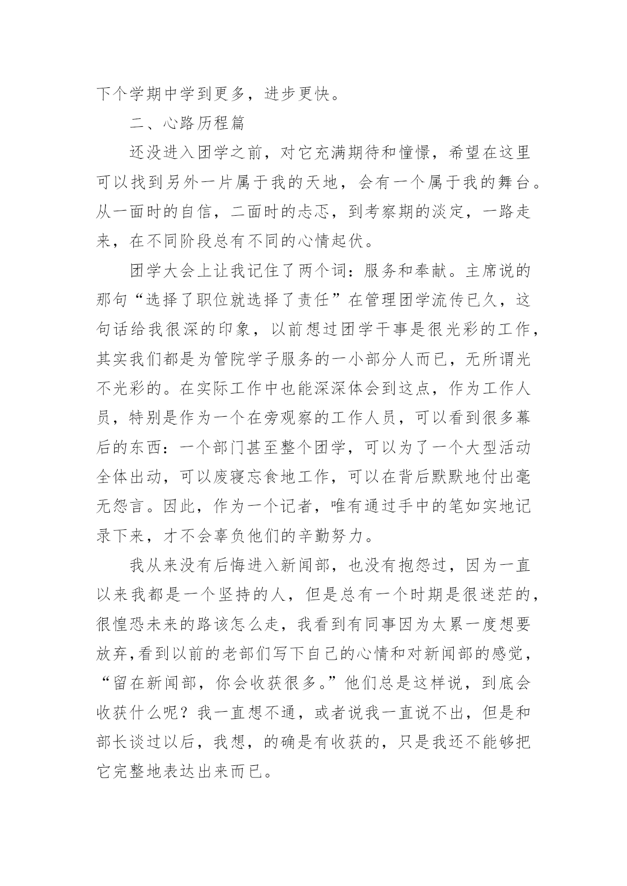 新闻部期末工作总结新闻部期末工作总结7篇总结是对某一特定时间段内的学习和工作生活等表现情况加以回顾和分析的一种书面材料,它可以有效锻炼我们的语言组织能力,让我们来为自己写一份总结吧。我们该怎么去写总结呢?以下是小编精心整理的新闻部期末工作总结,欢迎大家分享。新闻部期末工作总结1一、工作篇回顾这一学期的工作,感触良多。从最开始的非正式任务:为“秋之声”初赛拍照,举着单反相机拍了两三个小时,回来检查的时候却很失望,狭窄的教室、单一的角度,这批相片没有太多可取的地方,但是第一次的任务却让我很清楚地意识到,在新闻部工作,这些失望是应该承受的,但要尽力去避免。每次出完任务回来,在完成撰稿或挑相片的工作后,总会想很多,对自己在这次任务中的表现作评价,每次都会有不同的错误出现,尽量从中挑出不足,然后把它记起来以免下次再犯同样的错。部长曾经说过,新闻部工作的时候常常是单打独斗的,所以有更多的时间去反思,从此我记得“慎独反思”这个词,在每次例会后看着记下的笔记,再对照稿件的错误,总能从中找到以前没注意过的问题。我一开始曾经想过,新闻部的工作主要只是拍照和写稿,但深入之后才发现不是这么简单的,出任务之前要先看一些相关资料,拍照期间要注意很多问题,最后稿件要经过反复检查修改才能发上去,出完任务还要思考很多问题。我至今最满意的还是管院“秋之声”决赛的那次任务,在接到通知后搜索了很多关于秋之声的资料,并看了类似的歌唱比赛的`稿件,然后在比赛过程中记下了所有选手的表现,做了详细的笔记,而且能在当晚写完稿件。最后能看到自己的文字出现在学院网页上,心里是颇有成就感的,很开心。在学期最后一次例会后,我重新找了原来的稿件和发在校新闻网的稿件作对比,发现在文章结构和某些细节上,那篇稿还是存在一些问题。我曾经这样写过:新闻部的工作不算辛苦,但也不轻松。“不算辛苦”是指在出任务期间拍照拍到手发酸脚发麻膝盖淤青,或者熬夜到两三点赶稿,这些是每个进入新闻部的干事所必经的过程,对于需要磨炼的我们来说,并不算辛苦。而“不轻松”则是指工作的压力和任务后对自我的剖析,部长说过:新闻部的工作是不可以失误的,因为它会在学院网上留下痕迹。一份稿件,从语句措词、结构编排到领导排序,甚至字体大小、标点符号都不能马虎,无形中给了我们很大压力。而对于我来说,在每次任务完成以后,找出错误不足、接受并改正、反刍深思,这个自我剖析的过程更难。总的来说,我对这一学期的工作,有满意的地方,但更多的是从错误中学习,我很努力,我相信我在改进,我会在下个学期中学到更多,进步更快。二、心路历程篇还没进入团学之前,对它充满期待和憧憬,希望在这里可以找到另外一片属于我的天地,会有一个属于我的舞台。从一面时的自信,二面时的忐忑,到考察期的淡定,一路走来,在不同阶段总有不同的心情起伏。团学大会上让我记住了两个词:服务和奉献。主席说的那句“选择了职位就选择了责任”在管理团学流传已久,这句话给我很深的印象,以前想过团学干事是很光彩的工作,其实我们都是为管院学子服务的一小部分人而已,无所谓光不光彩的。在实际工作中也能深深体会到这点,作为工作人员,特别是作为一个在旁观察的工作人员,可以看到很多幕后的东西:一个部门甚至整个团学,可以为了一个大型活动全体出动,可以废寝忘食地工作,可以在背后默默地付出毫无怨言。因此,作为一个记者,唯有通过手中的笔如实地记录下来,才不会辜负他们的辛勤努力。我从来没有后悔进入新闻部,也没有抱怨过,因为一直以来我都是一个坚持的人,但是总有一个时期是很迷茫的,很惶恐未来的路该怎么走,我看到有同事因为太累一度想要放弃,看到以前的老部们写下自己的心情和对新闻部的感觉,“留在新闻部,你会收获很多。”他们总是这样说,到底会收获什么呢?我一直想不通,或者说我一直说不出,但是和部长谈过以后,我想,的确是有收获的,只是我还不能够把它完整地表达出来而已。三、收获篇在新闻部的短短几个月,我能够知道的,收获了友情、一些知识经验、一些做人的道理。在考察期开始工作,我很快融入其中。正如尧敏所言:我们的感情是建立在一次一次的任务上的。新闻部不像其它部门,很少会有整个部门一起出动的情况,但是新闻部是个温馨的小窝,我们一起为同事庆生,唱生日歌,一起挑相片赶稿,一起策划活动,一起开无伤大雅的玩笑。我们16个人,各有各的个性,却可以组成这样和谐的新闻部。在每两周一次的例会中,在与师兄师姐的谈话中,不经意间,会懂得很多为人处世的道理。而他们的身体力行,会不知不觉地影响到我的思想,再经过自我的思考,能够从中获得难得的经验和知识,更重要的是,而在出任务的过程中,有时可能从中感悟到什么,从而有所思考。总之,在团学新闻部的这一学期,我很坚持,而且我会一直坚持下去,我相信我的努力,希望能在下个学期有更好的工作表现。新闻部期末工作总结2为了更好的开展