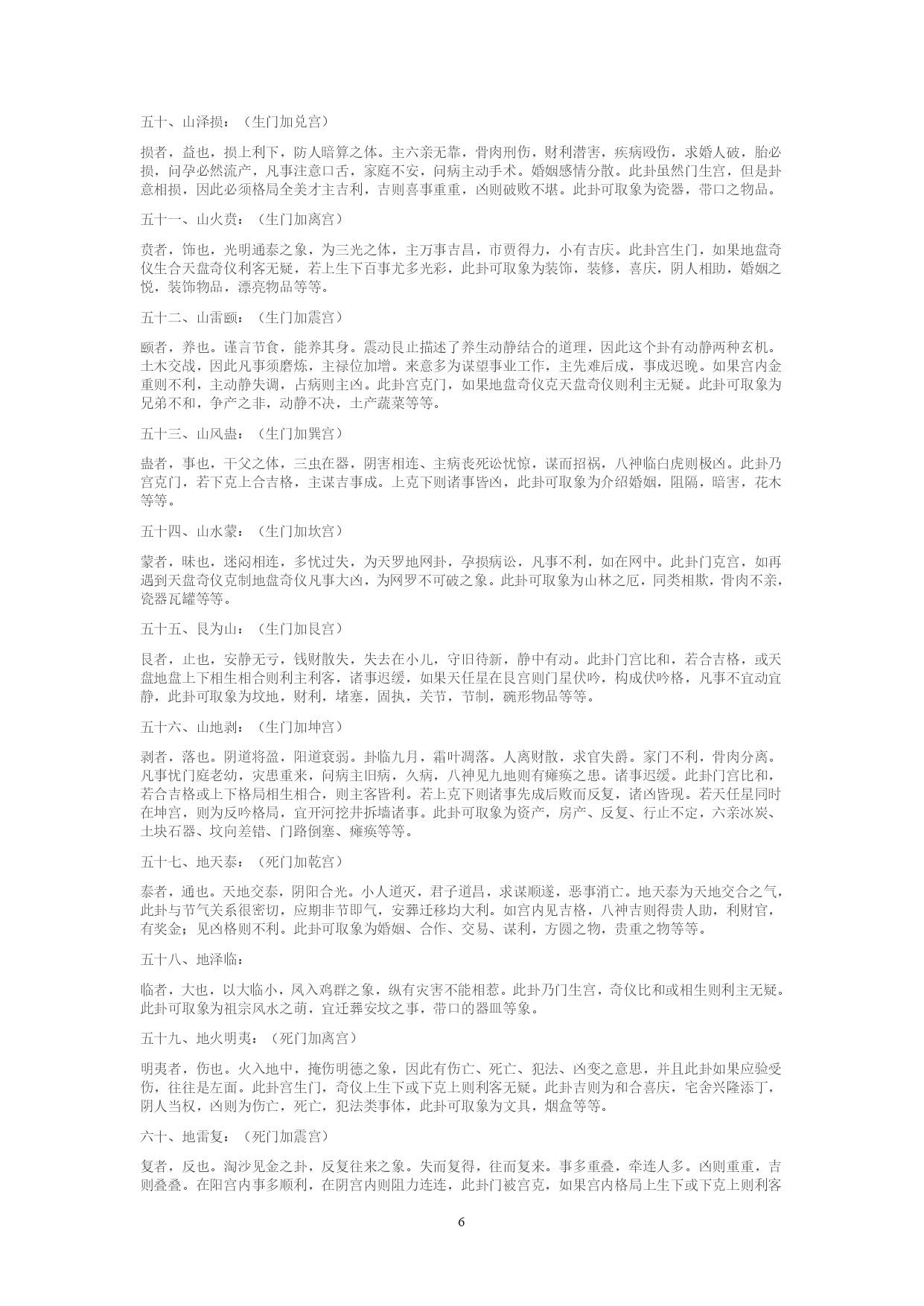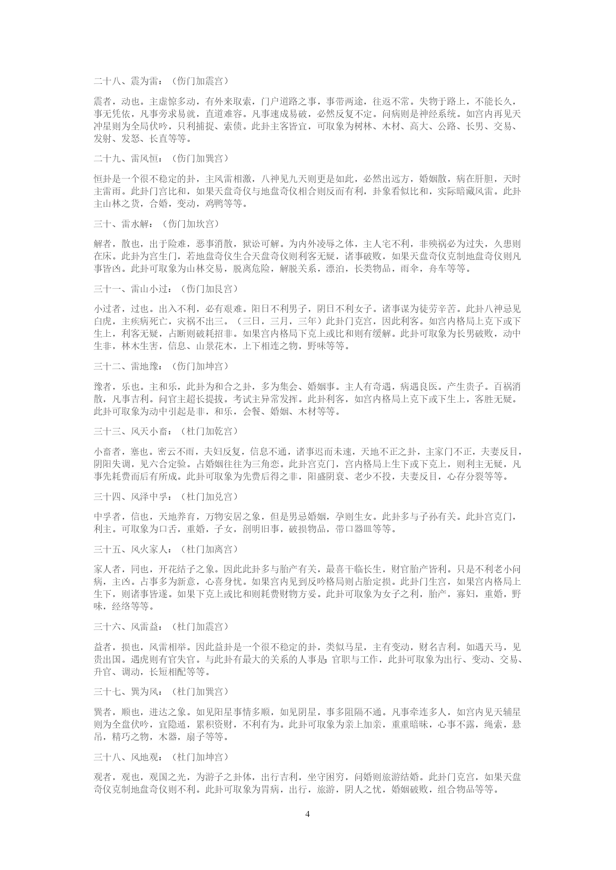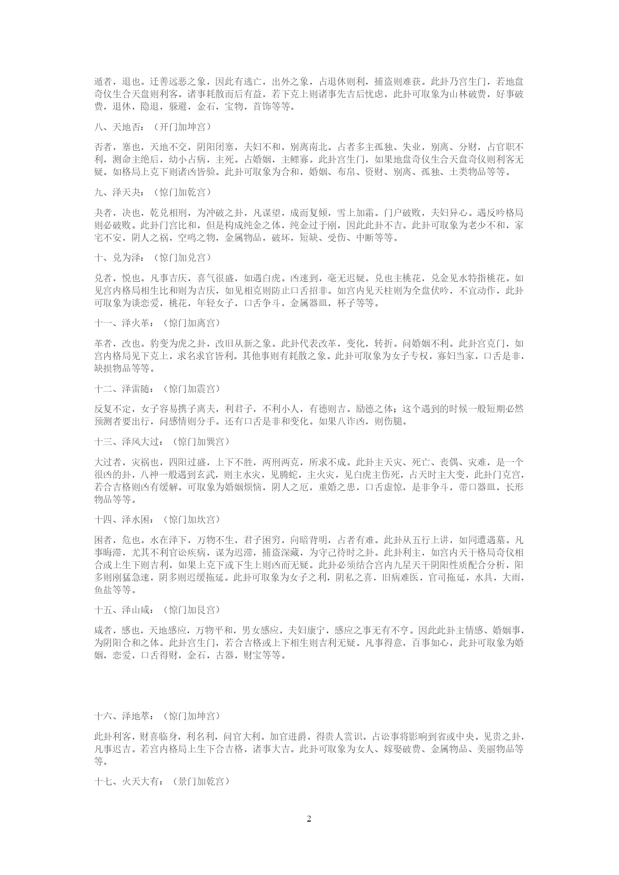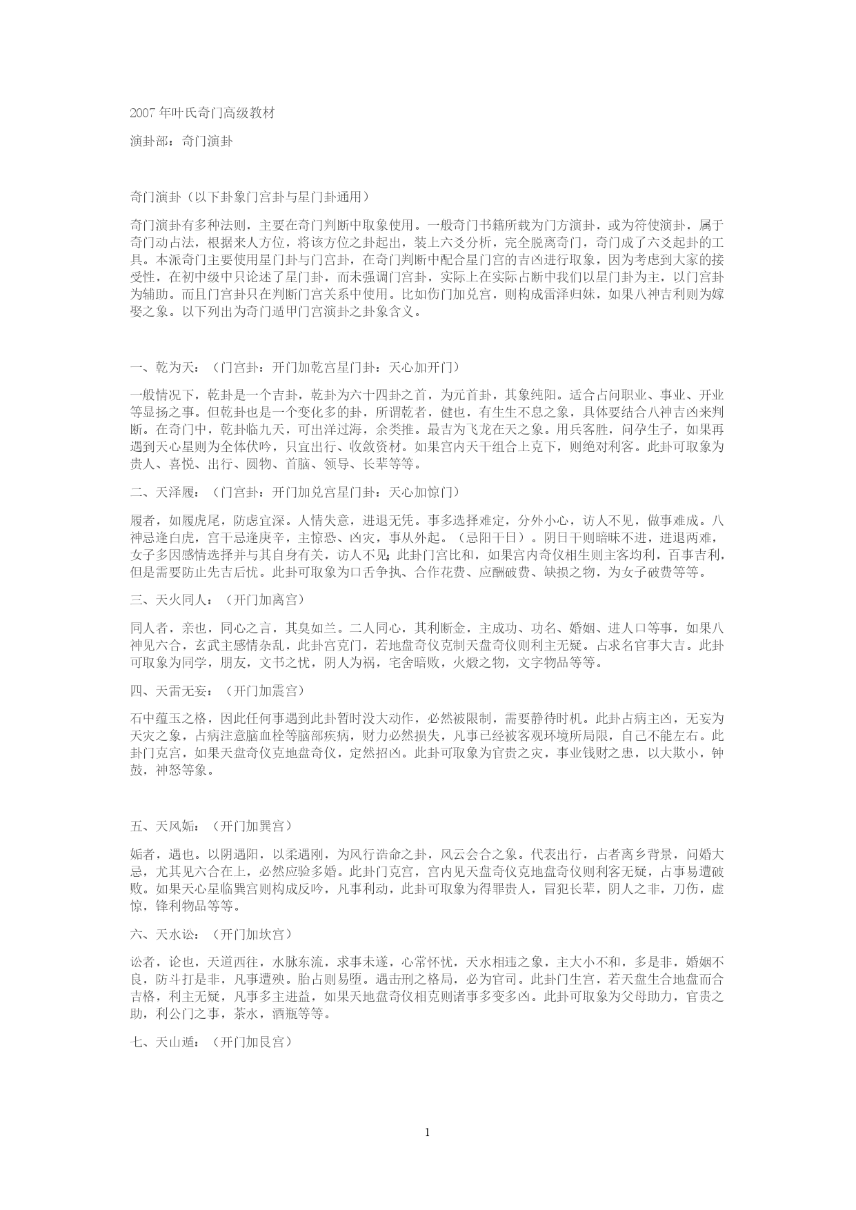 PAGEPAGE1062007年叶氏奇门高级教材演卦部:奇门演卦奇门演卦(以下卦象门宫卦与星门卦通用)奇门演卦有多种法则,主要在奇门判断中取象使用。一般奇门书籍所载为门方演卦,或为符使演卦,属于奇门动占法,根据来人方位,将该方位之卦起出,装上六爻分析,完全脱离奇门,奇门成了六爻起卦的工具。本派奇门主要使用星门卦与门宫卦,在奇门判断中配合星门宫的吉凶进行取象,因为考虑到大家的接受性,在初中级中只论述了星门卦,而未强调门宫卦,实际上在实际占断中我们以星门卦为主,以门宫卦为辅助。而且门宫卦只在判断门宫关系中使用。比如伤门加兑宫,则构成雷泽归妹,如果八神吉利则为嫁娶之象。以下列出为奇门遁甲门宫演卦之卦象含义。一、乾为天:(门宫卦:开门加乾宫星门卦:天心加开门)一般情况下,乾卦是一个吉卦,乾卦为六十四卦之首,为元首卦,其象纯阳。适合占问职业、事业、开业等显扬之事。但乾卦也是一个变化多的卦,所谓乾者,健也,有生生不息之象,具体要结合八神吉凶来判断。在奇门中,乾卦临九天,可出洋过海,余类推。最吉为飞龙在天之象。用兵客胜,问孕生子,如果再遇到天心星则为全体伏吟,只宜出行、收敛资材。如果宫内天干组合上克下,则绝对利客。此卦可取象为贵人、喜悦、出行、圆物、首脑、领导、长辈等等。二、天泽履:(门宫卦:开门加兑宫星门卦:天心加惊门)履者,如履虎尾,防虑宜深。人情失意,进退无凭。事多选择难定,分外小心,访人不见,做事难成。八神忌逢白虎,宫干忌逢庚辛,主惊恐、凶灾,事从外起。(忌阳干日)。阴日干则暗昧不进,进退两难,女子多因感情选择并与其自身有关,访人不见;此卦门宫比和,如果宫内奇仪相生则主客均利,百事吉利,但是需要防止先吉后忧。此卦可取象为口舌争执、合作花费、应酬破费、缺损之物,为女子破费等等。三、天火同人:(开门加离宫)同人者,亲也,同心之言,其臭如兰。二人同心,其利断金,主成功、功名、婚姻、进人口等事,如果八神见六合,玄武主感情杂乱,此卦宫克门,若地盘奇仪克制天盘奇仪则利主无疑。占求名官事大吉。此卦可取象为同学,朋友,文书之忧,阴人为祸,宅舍暗败,火煅之物,文字物品等等。四、天雷无妄:(开门加震宫)石中蕴玉之格,因此任何事遇到此卦暂时没大动作,必然被限制,需要静待时机。此卦占病主凶,无妄为天灾之象,占病注意脑血栓等脑部疾病,财力必然损失,凡事已经被客观环境所局限,自己不能左右。此卦门克宫,如果天盘奇仪克地盘奇仪,定然招凶。此卦可取象为官贵之灾,事业钱财之患,以大欺小,钟鼓,神怒等象。五、天风姤:(开门加巽宫)姤者,遇也。以阴遇阳,以柔遇刚,为风行诰命之卦,风云会合之象。代表出行,占者离乡背景,问婚大忌,尤其见六合在上,必然应验多婚。此卦门克宫,宫内见天盘奇仪克地盘奇仪则利客无疑,占事易遭破败。如果天心星临巽宫则构成反吟,凡事利动,此卦可取象为得罪贵人,冒犯长辈,阴人之非,刀伤,虚惊,锋利物品等等。六、天水讼:(开门加坎宫)讼者,论也,天道西往,水脉东流,求事未遂,心常怀忧,天水相违之象,主大小不和,多是非,婚姻不良,防斗打是非,凡事遭殃。胎占则易堕。遇击刑之格局,必为官司。此卦门生宫,若天盘生合地盘而合吉格,利主无疑,凡事多主进益,如果天地盘奇仪相克则诸事多变多凶。此卦可取象为父母助力,官贵之助,利公门之事,茶水,酒瓶等等。七、天山遁:(开门加艮宫)遁者,退也。迁善远恶之象,因此有逃亡,出外之象,占退休则利,捕盗则难获。此卦乃宫生门,若地盘奇仪生合天盘则利客。诸事耗散而后有益,若下克上则诸事先吉后忧虑,此卦可取象为山林破费,好事破费,退休,隐退,躲避,金石,宝物,首饰等等。八、天地否:(开门加坤宫)否者,塞也,天地不交,阴阳闭塞,夫妇不和,别离南北。占者多主孤独、失业,别离、分财,占官职不利,测命主绝后,幼小占病,主死。占婚姻,主鳏寡。此卦宫生门,如果地盘奇仪生合天盘奇仪则利客无疑。如格局上克下则诸凶皆验。此卦可取象为合和,婚姻、布帛、资财、别离、孤独、土类物品等等。九、泽天夬:(惊门加乾宫)夬者,决也,乾兑相刑,为冲破之卦,凡谋望,成而复倾,雪上加霜。门户破败,夫妇异心。遇反吟格局则必破败。此卦门宫比和,但是构成纯金之体,纯金过于刚,因此此卦不吉。此卦可取象为老少不和,家宅不安,阴人之祸,空鸣之物,金属物品,破坏,短缺、受伤、中断等等。十、兑为泽:(惊门加兑宫)兑者,悦也。凡事吉庆,喜气很盛,如遇白虎。凶速到,毫无迟疑。兑也主桃花,兑金见水特指桃花。如见宫内格局相生比和则为吉庆,如见相克则防止口舌招非。如宫内见天柱则为全盘伏吟,不宜动作,此卦可取象为谈恋爱,桃花,年轻女子,口舌争斗,金属器皿,杯子等等。十一、泽火革:(惊门加离宫)革者,改也。豹变为虎之卦,改旧从新之象。此