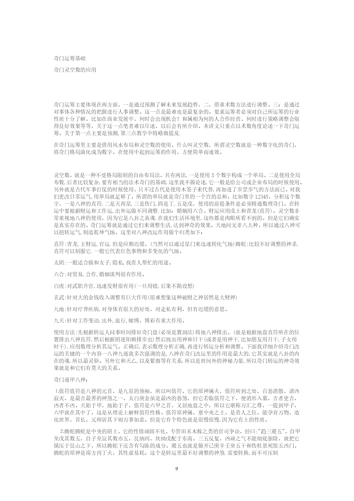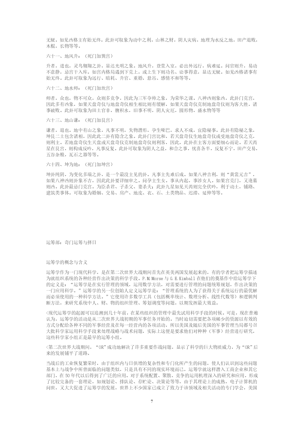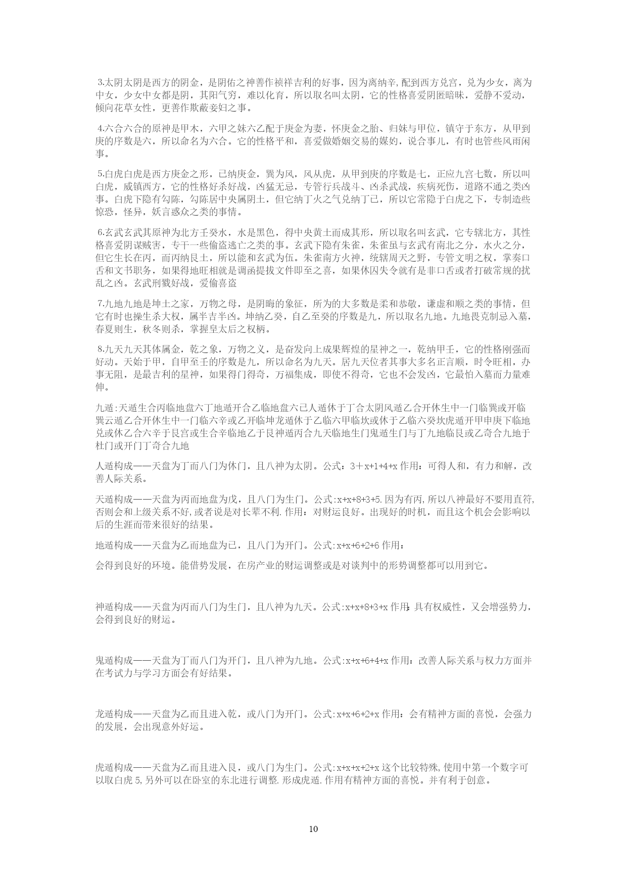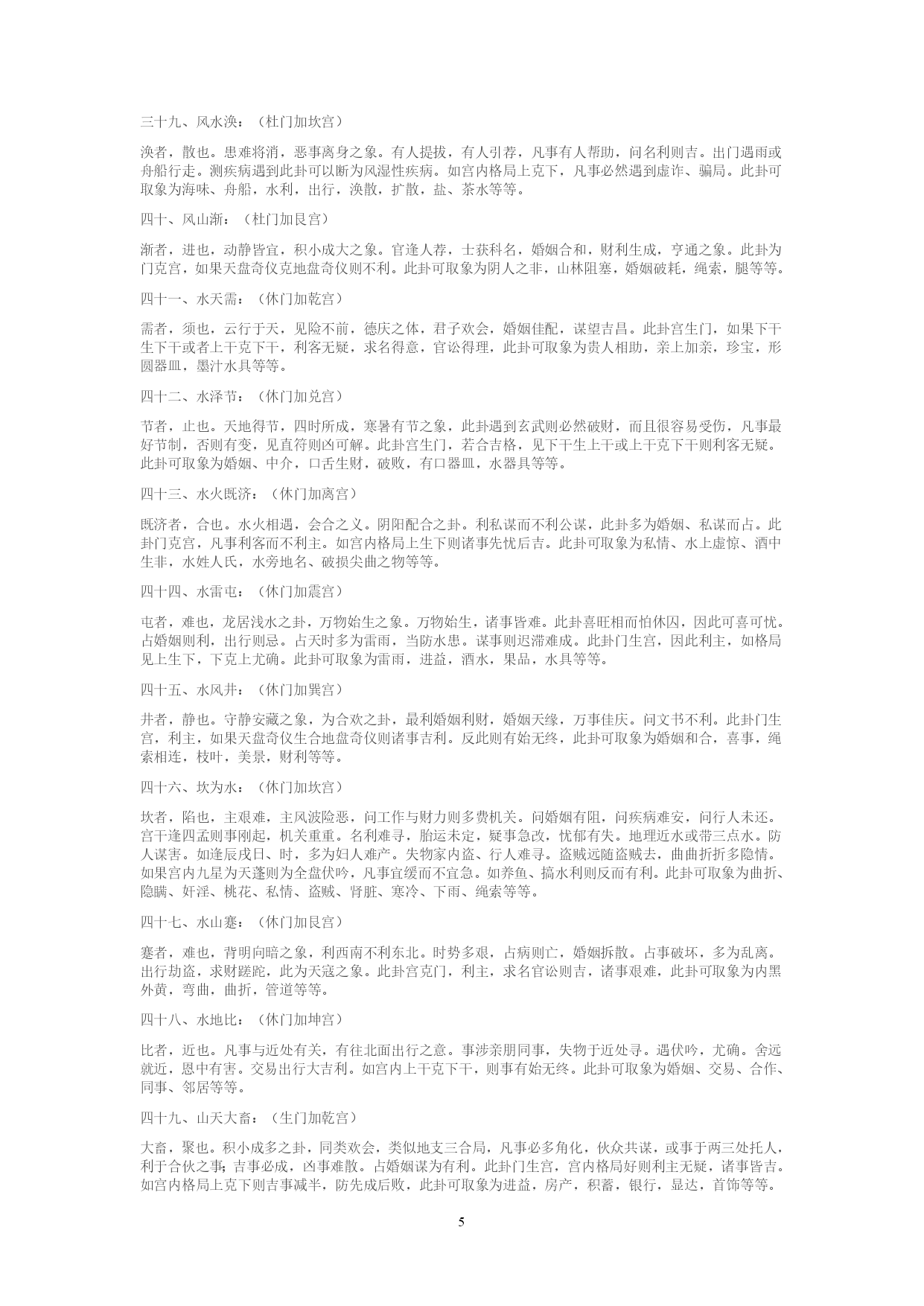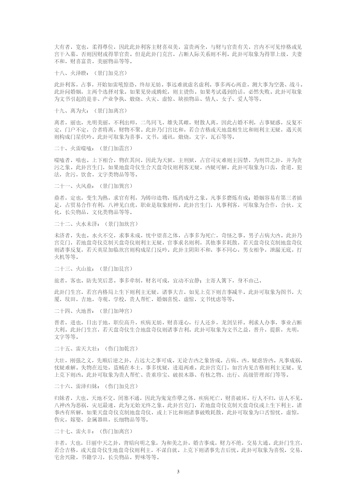PAGEPAGE1062007年叶氏奇门高级教材演卦部:奇门演卦奇门演卦(以下卦象门宫卦与星门卦通用)奇门演卦有多种法则,主要在奇门判断中取象使用。一般奇门书籍所载为门方演卦,或为符使演卦,属于奇门动占法,根据来人方位,将该方位之卦起出,装上六爻分析,完全脱离奇门,奇门成了六爻起卦的工具。本派奇门主要使用星门卦与门宫卦,在奇门判断中配合星门宫的吉凶进行取象,因为考虑到大家的接受性,在初中级中只论述了星门卦,而未强调门宫卦,实际上在实际占断中我们以星门卦为主,以门宫卦为辅助。而且门宫卦只在判断门宫关系中使用。比如伤门加兑宫,则构成雷泽归妹,如果八神吉利则为嫁娶之象。以下列出为奇门遁甲门宫演卦之卦象含义。一、乾为天:(门宫卦:开门加乾宫星门卦:天心加开门)一般情况下,乾卦是一个吉卦,乾卦为六十四卦之首,为元首卦,其象纯阳。适合占问职业、事业、开业等显扬之事。但乾卦也是一个变化多的卦,所谓乾者,健也,有生生不息之象,具体要结合八神吉凶来判断。在奇门中,乾卦临九天,可出洋过海,余类推。最吉为飞龙在天之象。用兵客胜,问孕生子,如果再遇到天心星则为全体伏吟,只宜出行、收敛资材。如果宫内天干组合上克下,则绝对利客。此卦可取象为贵人、喜悦、出行、圆物、首脑、领导、长辈等等。二、天泽履:(门宫卦:开门加兑宫星门卦:天心加惊门)履者,如履虎尾,防虑宜深。人情失意,进退无凭。事多选择难定,分外小心,访人不见,做事难成。八神忌逢白虎,宫干忌逢庚辛,主惊恐、凶灾,事从外起。(忌阳干日)。阴日干则暗昧不进,进退两难,女子多因感情选择并与其自身有关,访人不见;此卦门宫比和,如果宫内奇仪相生则主客均利,百事吉利,但是需要防止先吉后忧。此卦可取象为口舌争执、合作花费、应酬破费、缺损之物,为女子破费等等。三、天火同人:(开门加离宫)同人者,亲也,同心之言,其臭如兰。二人同心,其利断金,主成功、功名、婚姻、进人口等事,如果八神见六合,玄武主感情杂乱,此卦宫克门,若地盘奇仪克制天盘奇仪则利主无疑。占求名官事大吉。此卦可取象为同学,朋友,文书之忧,阴人为祸,宅舍暗败,火煅之物,文字物品等等。四、天雷无妄:(开门加震宫)石中蕴玉之格,因此任何事遇到此卦暂时没大动作,必然被限制,需要静待时机。此卦占病主凶,无妄为天灾之象,占病注意脑血栓等脑部疾病,财力必然损失,凡事已经被客观环境所局限,自己不能左右。此卦门克宫,如果天盘奇仪克地盘奇仪,定然招凶。此卦可取象为官贵之灾,事业钱财之患,以大欺小,钟鼓,神怒等象。五、天风姤:(开门加巽宫)姤者,遇也。以阴遇阳,以柔遇刚,为风行诰命之卦,风云会合之象。代表出行,占者离乡背景,问婚大忌,尤其见六合在上,必然应验多婚。此卦门克宫,宫内见天盘奇仪克地盘奇仪则利客无疑,占事易遭破败。如果天心星临巽宫则构成反吟,凡事利动,此卦可取象为得罪贵人,冒犯长辈,阴人之非,刀伤,虚惊,锋利物品等等。六、天水讼:(开门加坎宫)讼者,论也,天道西往,水脉东流,求事未遂,心常怀忧,天水相违之象,主大小不和,多是非,婚姻不良,防斗打是非,凡事遭殃。胎占则易堕。遇击刑之格局,必为官司。此卦门生宫,若天盘生合地盘而合吉格,利主无疑,凡事多主进益,如果天地盘奇仪相克则诸事多变多凶。此卦可取象为父母助力,官贵之助,利公门之事,茶水,酒瓶等等。七、天山遁:(开门加艮宫)遁者,退也。迁善远恶之象,因此有逃亡,出外之象,占退休则利,捕盗则难获。此卦乃宫生门,若地盘奇仪生合天盘则利客。诸事耗散而后有益,若下克上则诸事先吉后忧虑,此卦可取象为山林破费,好事破费,退休,隐退,躲避,金石,宝物,首饰等等。八、天地否:(开门加坤宫)否者,塞也,天地不交,阴阳闭塞,夫妇不和,别离南北。占者多主孤独、失业,别离、分财,占官职不利,测命主绝后,幼小占病,主死。占婚姻,主鳏寡。此卦宫生门,如果地盘奇仪生合天盘奇仪则利客无疑。如格局上克下则诸凶皆验。此卦可取象为合和,婚姻、布帛、资财、别离、孤独、土类物品等等。九、泽天夬:(惊门加乾宫)夬者,决也,乾兑相刑,为冲破之卦,凡谋望,成而复倾,雪上加霜。门户破败,夫妇异心。遇反吟格局则必破败。此卦门宫比和,但是构成纯金之体,纯金过于刚,因此此卦不吉。此卦可取象为老少不和,家宅不安,阴人之祸,空鸣之物,金属物品,破坏,短缺、受伤、中断等等。十、兑为泽:(惊门加兑宫)兑者,悦也。凡事吉庆,喜气很盛,如遇白虎。凶速到,毫无迟疑。兑也主桃花,兑金见水特指桃花。如见宫内格局相生比和则为吉庆,如见相克则防止口舌招非。如宫内见天柱则为全盘伏吟,不宜动作,此卦可取象为谈恋爱,桃花,年轻女子,口舌争斗,金属器皿,杯子等等。十一、泽火革:(惊门加离宫)革者,改也。豹变为虎之卦,改旧从新之象。此