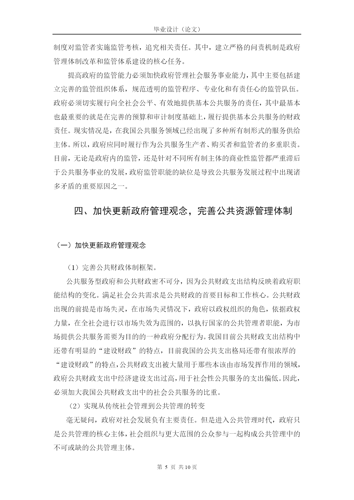 PAGExx大学毕业论文(设计)中文题目试论现代公共服务监督体系的完善学生姓名专业层次年级学号指导教师职称学习中心成绩20年月日毕业设计(论文)摘要在市场经济的条件下,政府在公共服务(PublicServices)供给方面发挥着直接提供、资金供给和监管三种作用。目前我国公共服务实现了供给主体多元化,但存在覆盖领域窄、财政供养不规范、绩效管理不严格、过度市场化又缺乏严格的监管等问题。深化事业单位改革、改善公共服务必须要完善政府管理体制,通过必要的财政支持提供全覆盖的基本公共服务,同时应加强绩效评估、强化政府监管,以保证公共服务全覆盖、高效率和高质量。按照以人为本、经济社会协调发展的要求,以强化政府公共服务职责、增加政府投入、创新服务模式和提高服务效率为手段,健全面向基层、覆盖城乡、功能完善、分布合理的社会公共服务体系。政府在构建社会主义和谐社会中的公共服务职能,应当包括通过立法和制定相应的政策促进全社会参与社会发展,避免由于发展中不公平和不公正引发的社会问题和社会冲突,为社会健康和公平发展配置必要的社会资源支撑,提供基本的公共服务。未来一个时期,要加强和完善政府在构建社会主义和谐社会中的公共服务职能,必须在理念、体制与机制三个方面对政府公共服务的内容进行全面规划。关键词:公共服务,政府监管,政府内部监管目录前言……………………………………………………………………………………1一、公共服务与公共服务监管………………………………………………………2(一)公共服务与政府责任………………………………………………………2(二)公共服务监督………………………………………………………………3二、我国公共服务现状及存在的问题………………………………………………3(一)公共服务总体水平偏低……………………………………………………3(二)公共服务发展不平均………………………………………………………3(三)公共服务体系和机制不健全………………………………………………3三、我国公共服务监督…………………………………………………………4(一)公共服务监管存在问题……………………………………………………4(二)政府需强化监管职能………………………………………………………4(三)政府监管应遵从基本原则…………………………………………………5四、加快更新政府管理观念,完善公共资源管理体………………………………5(一)加快更新政府管理观念…………………………………………………6(二)完善公共资源管理体制……………………………………………………6(三)健全公共服务的决策机制和公共政策评估机……………………………8参考文献……………………………………………………………………………9致谢…………………………………………………………………………………10第PAGE10页前言十六届四中全会中明确的提出:“推动政府依法行政,加快转变职能,深化行政体制改革,真正实现政企分开、政资分开、政事分开,主要运用经济和法律手段管理经济活动,集中精力抓好经济调节、市场监管、社会管理和公共服务”。如何利用多种资源、通过多种形式有效地提供公共服务,如何在引入竞争机制的同时建立有效的管理制度以保证公共服务提供的公平性、质量和效率,这是党和政府在执政理念、制度建设和行政能力上面临的多重挑战。为落实科学发展观、实现经济社会的协调发展及建立和谐社会,必须加强政府的公共服务职能。一、公共服务与公共服务监管(一)公共服务与政府责任公共服务,是指我国由事业单位提供的科技、教育、文化、医疗卫生、体育等具有准公共物品或半公共物品特征的社会服务事业。要强调的是,现代国家的一个基本特征就是政府向全民提供基础教育、公共卫生、基本医疗保障服务等基本公共服务的财政责任。与现代财政制度相伴而生的就是有效的公共审计制度,保证政府开支的公平性和有效性。(二)公共服务监管在过去二十多年,发达市场经济国家兴起了新公共管理运动,其主要内容之一就是在传统的、政府主导的公共服务领域引入市场机制,即分离政府作为公共服务购买者和供给者的职能,引入其它非营利机构和营利性机构,通过一种竞争性的机制实现资源的有效配置和改进公共服务的质量。一些发展中国家和经济转轨国家也在不同程度上实施公共服务的市场化取向的改革。建立完善的监管体系、加强政府监管职能是改革的重要内容之一。广义上的监管是指监管者“运用公共权力制定和实施规则和标准”,以干预各种行为主体的经济和社会活动,包括产品和服务的价格、质量、进入和退出等经济性内容以及安全、健康、卫生、环境保护等社会性内容。相对于传统行政管理系统的层级制结构和命令与控制