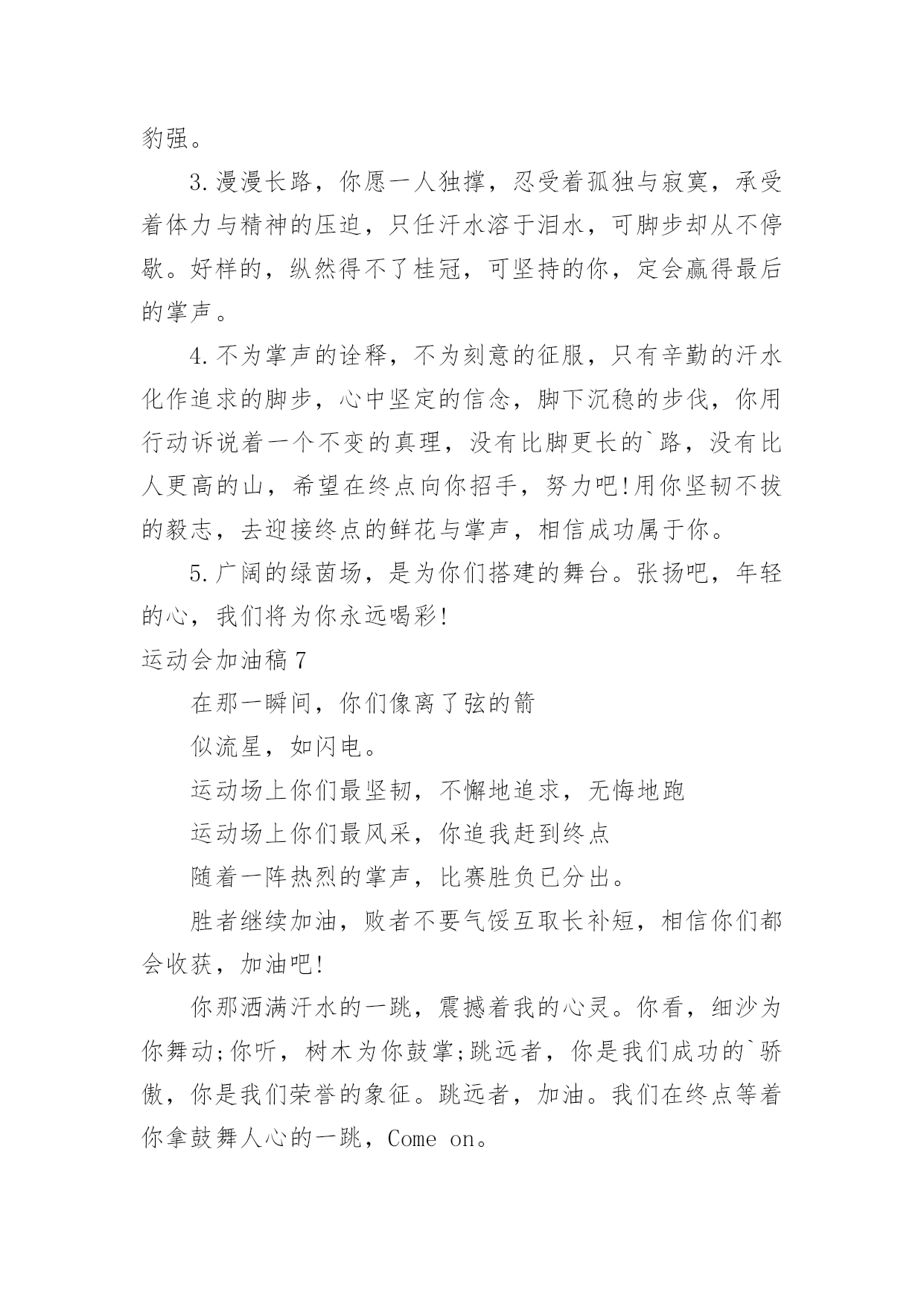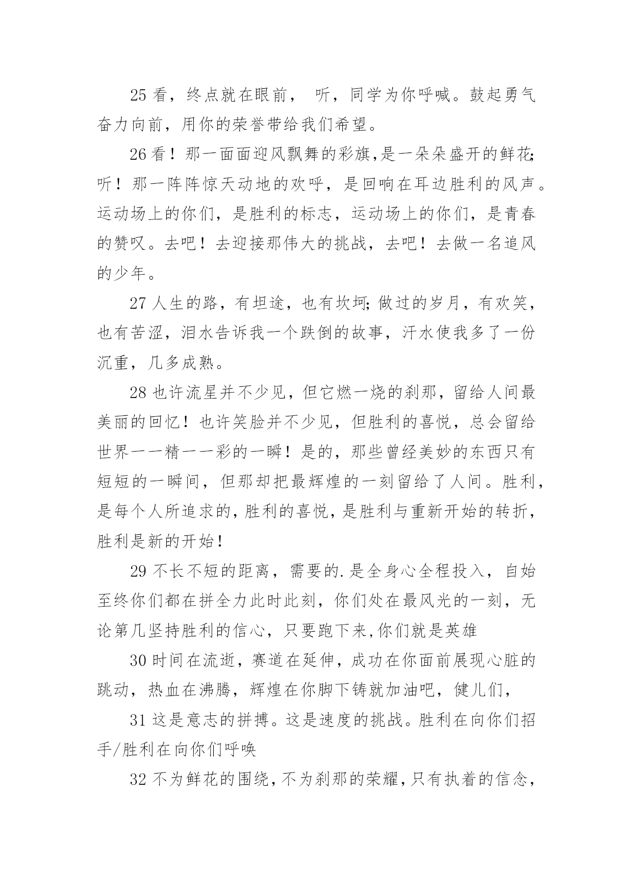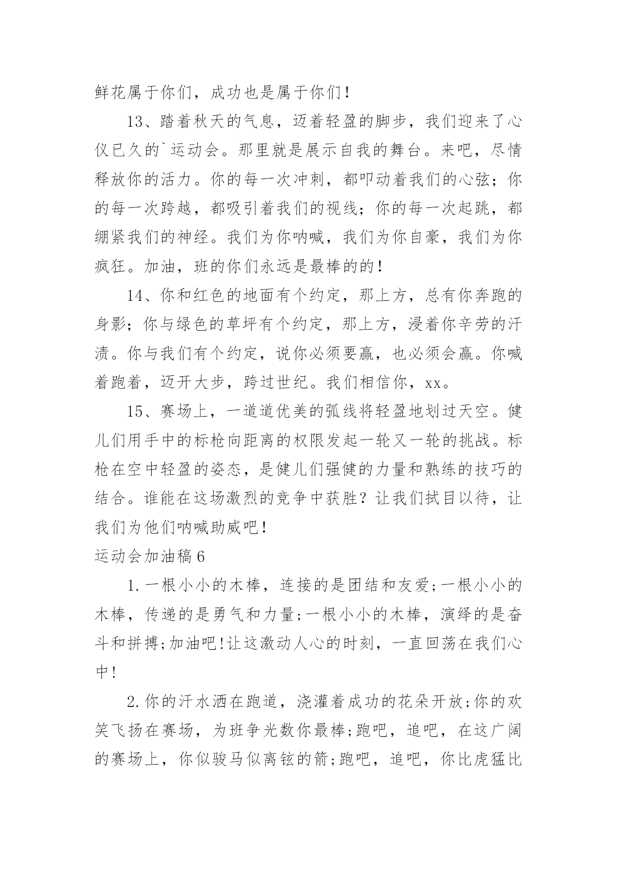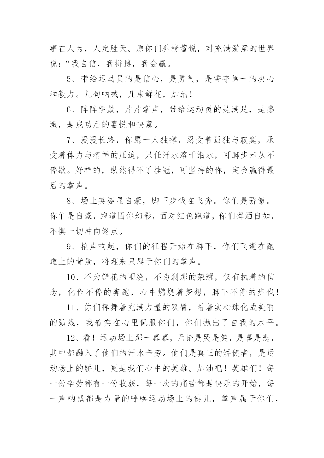 运动会加油稿运动会加油稿在生活中,接触并使用加油稿的人越来越多,加油稿是一种对他人有正向激励作用的文稿。如何写一份恰当的加油稿呢?以下是小编精心整理的运动会加油稿,希望对大家有所帮助。运动会加油稿1人生的路有坦途也有坎坷;走过的岁月有欢笑也有苦涩。泪水告诉我一个跌倒的故事。汗水使我多了一份沉重几多成熟。理想毕竟不一样于现实,失败是生活的一部分谁也无法选取无法拒绝。人生要自我去拼搏去奋斗,在风雨中百屈不挠、勇往直前,在自我的每个驿站都留下一段无悔的回忆。流泪不是失落徘徊不是迷惑,成功属于那些战胜失败坚持不懈勇于追求梦想的'人。白色的跑道是你运动的轨迹台上的呐喊是对你拼搏的肯定。这是耐力与意志的检验超载自我挑战自我是你的目标,当你体验过从他人身边攸勿而过时你将再次获得新的感悟,那是自我人生价值的体现更是为班级争夺荣誉的自豪拼搏吧!努力吧!运动健儿们胜利就在眼前是男儿我们不言放下。运动会加油稿225看,终点就在眼前,听,同学为你呼喊。鼓起勇气奋力向前,用你的荣誉带给我们希望。26看!那一面面迎风飘舞的彩旗,是一朵朵盛开的鲜花;听!那一阵阵惊天动地的欢呼,是回响在耳边胜利的风声。运动场上的你们,是胜利的标志,运动场上的你们,是青春的赞叹。去吧!去迎接那伟大的挑战,去吧!去做一名追风的少年。27人生的路,有坦途,也有坎坷;做过的岁月,有欢笑,也有苦涩,泪水告诉我一个跌倒的故事,汗水使我多了一份沉重,几多成熟。28也许流星并不少见,但它燃一烧的刹那,留给人间最美丽的回忆!也许笑脸并不少见,但胜利的喜悦,总会留给世界一一精一一彩的一瞬!是的,那些曾经美妙的东西只有短短的一瞬间,但那却把最辉煌的一刻留给了人间。胜利,是每个人所追求的,胜利的喜悦,是胜利与重新开始的转折,胜利是新的开始!29不长不短的距离,需要的.是全身心全程投入,自始至终你们都在拼全力此时此刻,你们处在最风光的一刻,无论第几坚持胜利的信心,只要跑下来,你们就是英雄30时间在流逝,赛道在延伸,成功在你面前展现心脏的跳动,热血在沸腾,辉煌在你脚下铸就加油吧,健儿们,31这是意志的拼搏。这是速度的挑战。胜利在向你们招手/胜利在向你们呼唤32不为鲜花的围绕,不为刹那的荣耀,只有执着的信念,化作不停的奔跑,心中燃一烧着梦想,脚下不停的步伐,33运动场上有你们的飒爽英姿,运动场上有你们拼搏的身影,面对漫漫的征程,你没有畏惧和退缩,任汗水打湿脊背,任疲惫爬满全身,依然分离追赶,只有一个目标,只有一个信念,为班级赢得荣誉,拼搏吧,我为你们呐喊,加油,34场上英姿显自豪,脚下步伐在飞奔。你们是骄傲。你们是自豪,跑道因你幻彩,面对红色跑道,你们挥洒自如,不惧一切冲向重点,35面对艰苦的征程,你们毫不畏惧,接力棒在你们手中传递着集体的力量,听,我们在为你呐喊,你们诠释着奥运的一一精一一神,你们是我们心中的骄傲,深深的呼吸,等待你的是艰难的800米。相信胜利会属于你们,但在这征一途上,需要你勇敢的心去面对。我们在为你加油,你是否听到了我们发自内心的呐喊,困难和胜利都在向你招手,去呀,不要犹豫,快去击败困难,快去夺取胜利,相信你会送给我们一个汗水浸一湿的微笑36你用行动述说着过城的重要,没有无尽的终点,没有无法攀登的险峰,希望载着终点在向你微笑,拼搏吧!经历是一种一一精一一彩,迸发你全部的能量,成功是你汗水的写照。运动会加油稿3蔚蓝的天空下,有你矫健的身影,热闹的操场上,有你坚定的步伐,美丽的鲜花后,有你辛勤的'汗水,我们的喝彩中,有你的自豪与骄傲!体育健儿们,我们知道你们的辛勤,我们了解你们的辛苦。加油吧!不论你是成功还是失败,我们都是你们坚强的后盾。胜也爱你,败也爱你,我们永远支持你,你们永远是“最特别的运动会加油稿4就让这灼目的骄阳,在你自信满满的.目光下黯然失,就让这绚烂的繁花,在你矫健挺拔的身姿前兀自凋零,就让这激情呐喊,为你添一分风雨无惧的豪迈,就让这连绵欢唱,为你奏一曲凯旋之歌,向前冲刺吧!勇敢的运动员们!运动会加油稿51、漫漫长路,你愿一人独撑,忍受着孤独与寂寞,承受着体力与精神的压迫,只任汗水溶于泪水,可脚步却从不停歇。好样的,纵然得不了桂冠,可坚持的你,定会赢得最终的掌声。2、年轻的我们自信飞扬,青春的气息如同初升的朝阳,蓬勃的力量如同阳光的挥洒。此时此刻,跑道便是我们精彩的舞台,声声加油便是我们的奖项!论何成功,谈何荣辱,心中的信念仅有一个:拼搏!萧瑟的秋风,挡不住你们破竹的锐气。3、踏上跑道,是一种选择。离开起点,是一种勇气。驰骋赛场,是一种胜利。运动健将们,用你的实力,用你的精神,去开拓出,一片属于你的长跑天地!一百米是个风狂的世界!4、亲爱的班健儿们,你们要充满自信。比赛中没有挡风的墙,没有遮风的伞,也没有撑船的帆,更没有拉船的纤。事在人为,人定胜天。原你们养精蓄锐,对